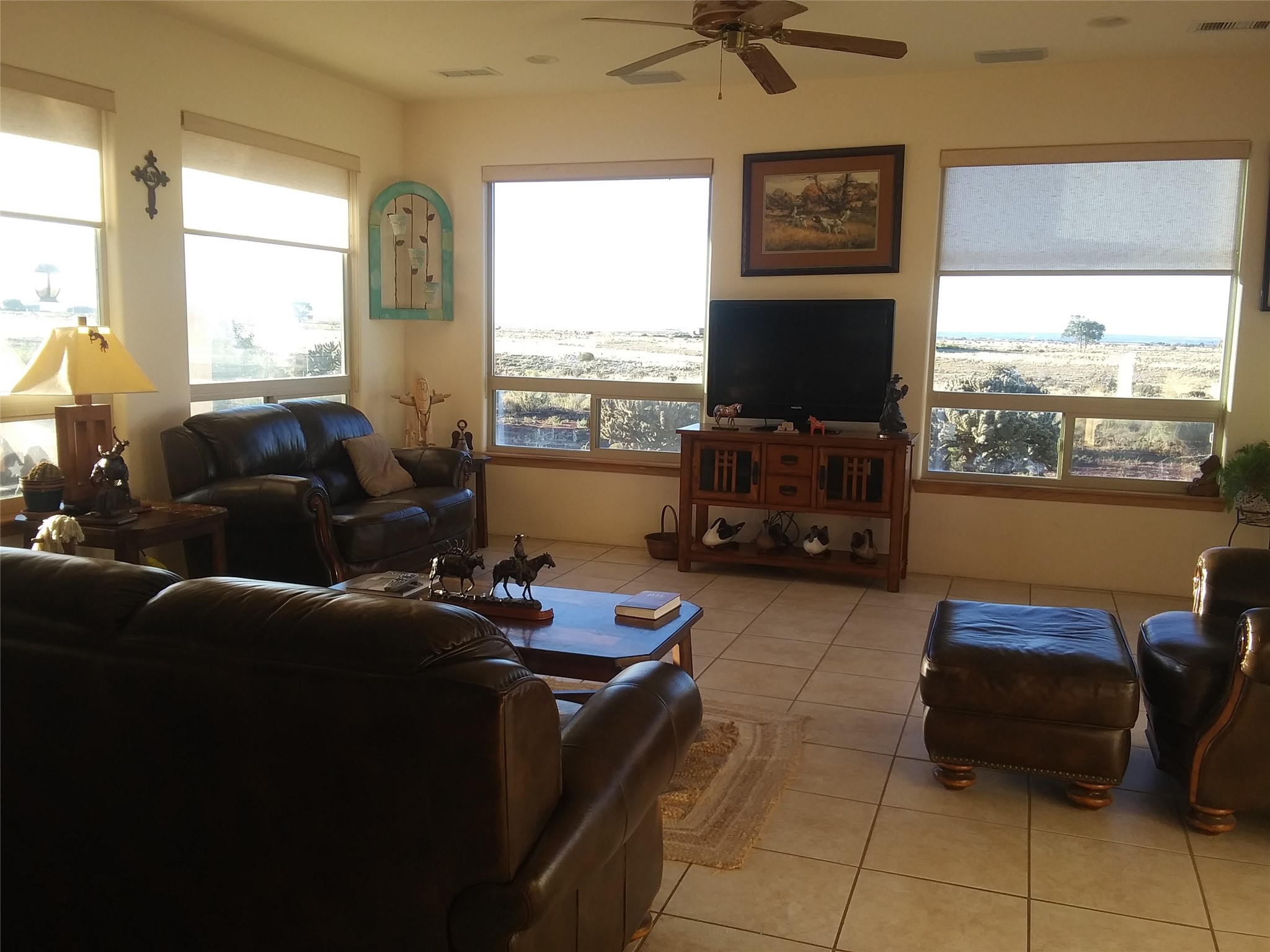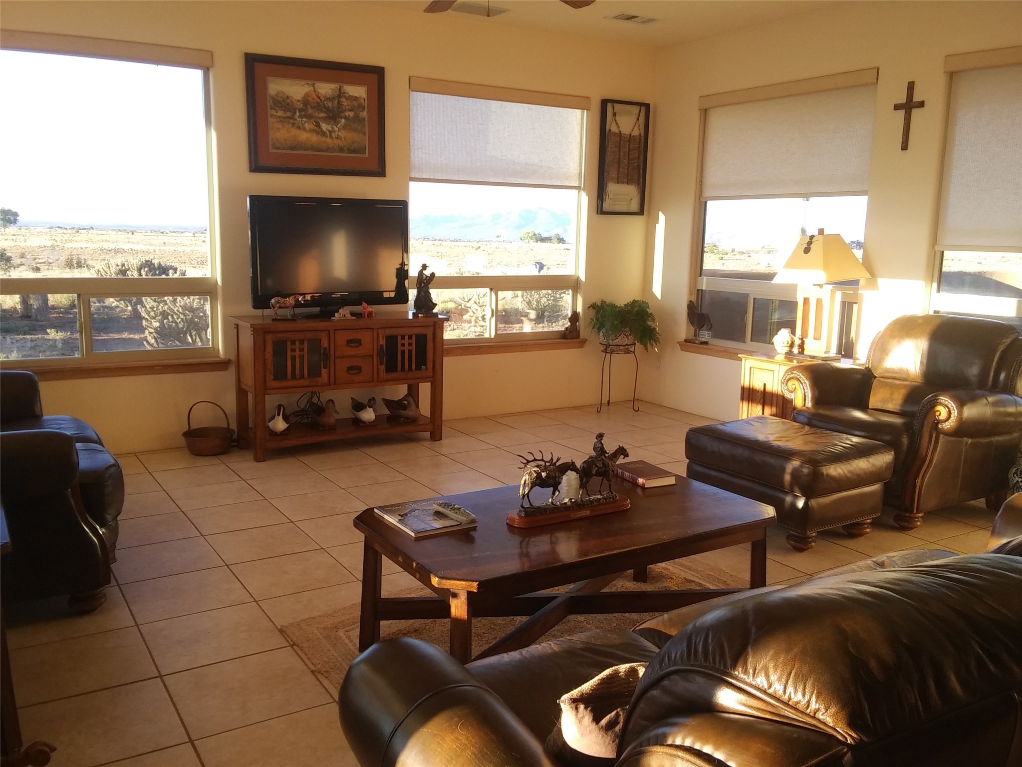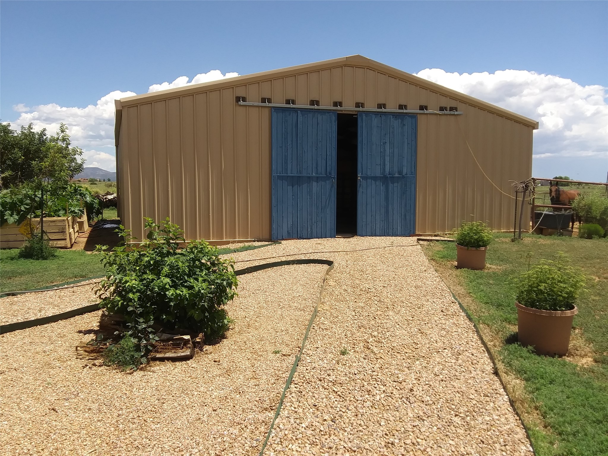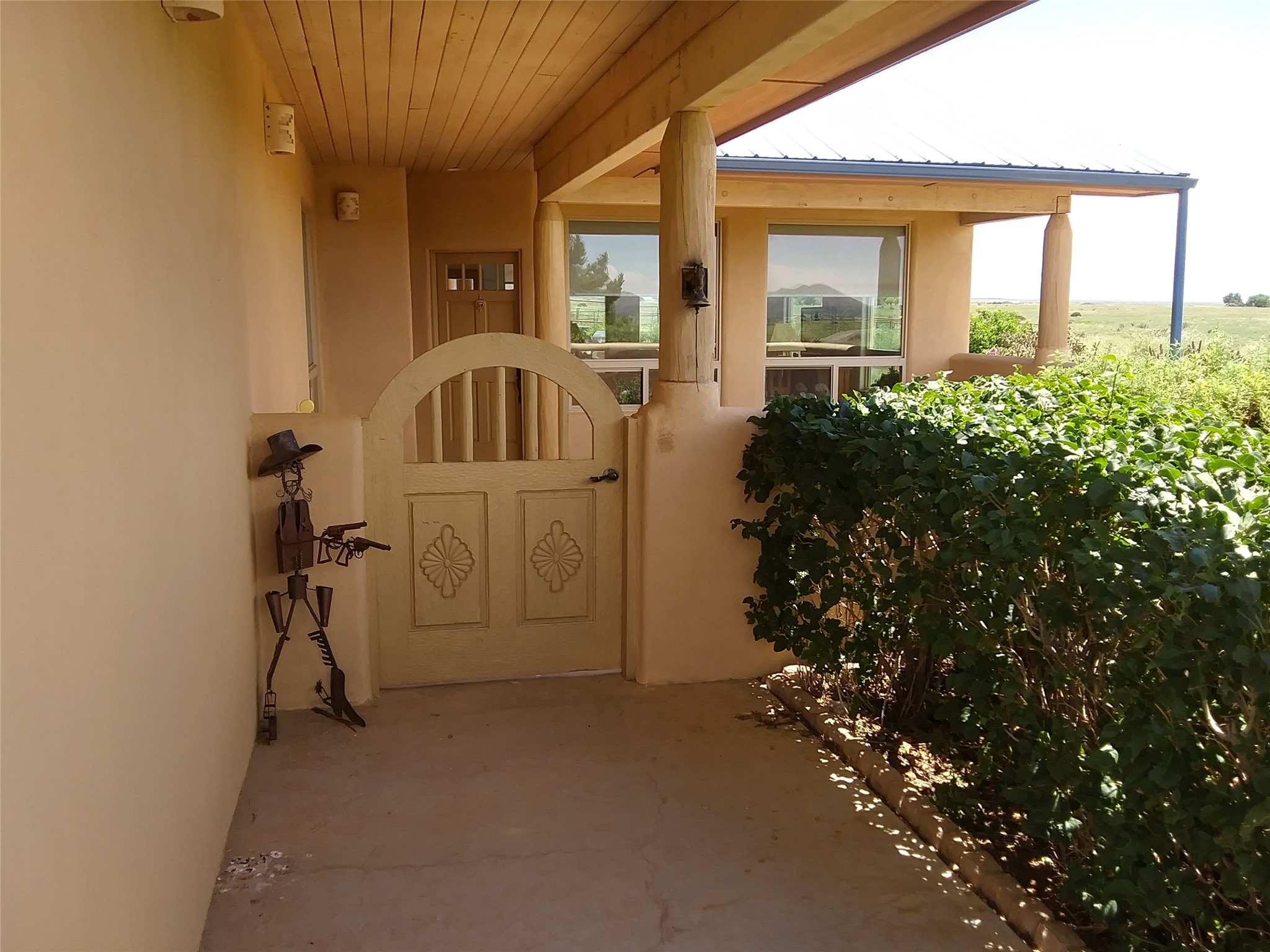 Set on over 15.8 acres in Rancho San Marcos, this Northern New Mexican-style home offers wide-open space, big views, and true equestrian functionality approximately 30 minutes from the Santa Fe Plaza. The 3-bedroom, 2-bath layout includes a flexible bonus room ideal for an office, studio, or additional living space, with an open-concept kitchen, dining, and living area designed to take in the surrounding high desert landscape. Large windows frame mountain and sunset views, while the covered patio provides a quiet place to enjoy the natural setting and expansive skies. The primary suite features a walk-in closet and a spacious bath with a soaking tub. For horse enthusiasts, the property is well-equipped with a 3-stall steel barn, tack and hay storage, workshop space, and a large corral. Direct access to community riding trails, along with a 50-acre horse park, round pen, and arena, adds to the appeal. Additional features include a 2-car garage with overhead storage, private well, septic, and a durable metal roof. Located within a gated community known for its privacy and scenic surroundings. Property is being offered in as-is condition and presents an opportunity for a buyer to update and personalize while capturing the value of the land, setting, and equestrian infrastructure. Property is sold in "As-Is" condition.