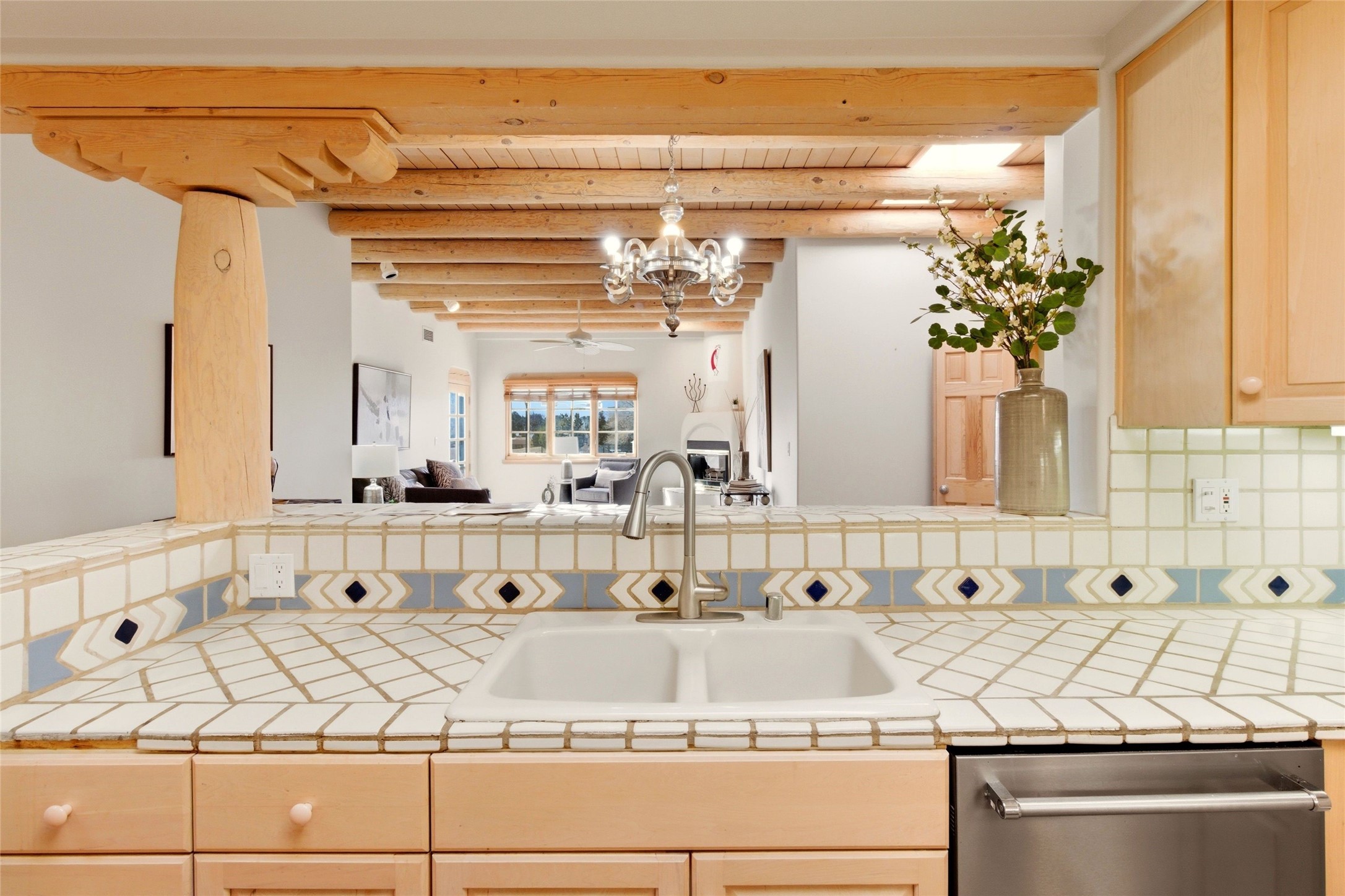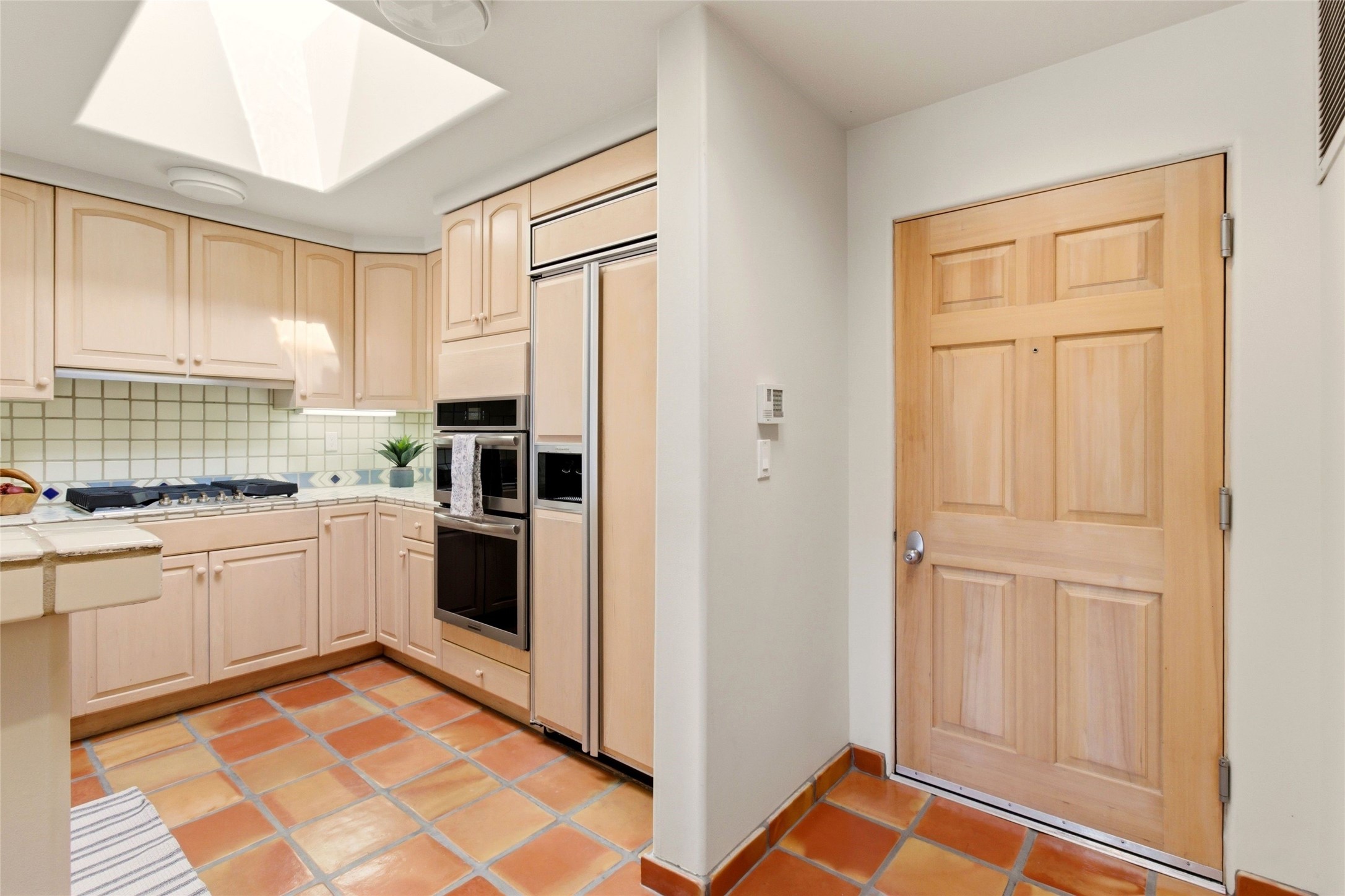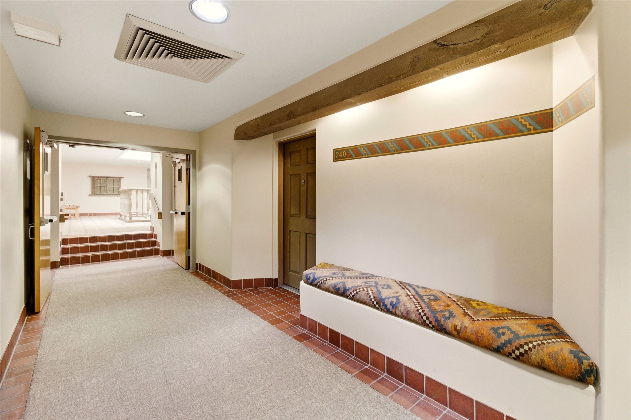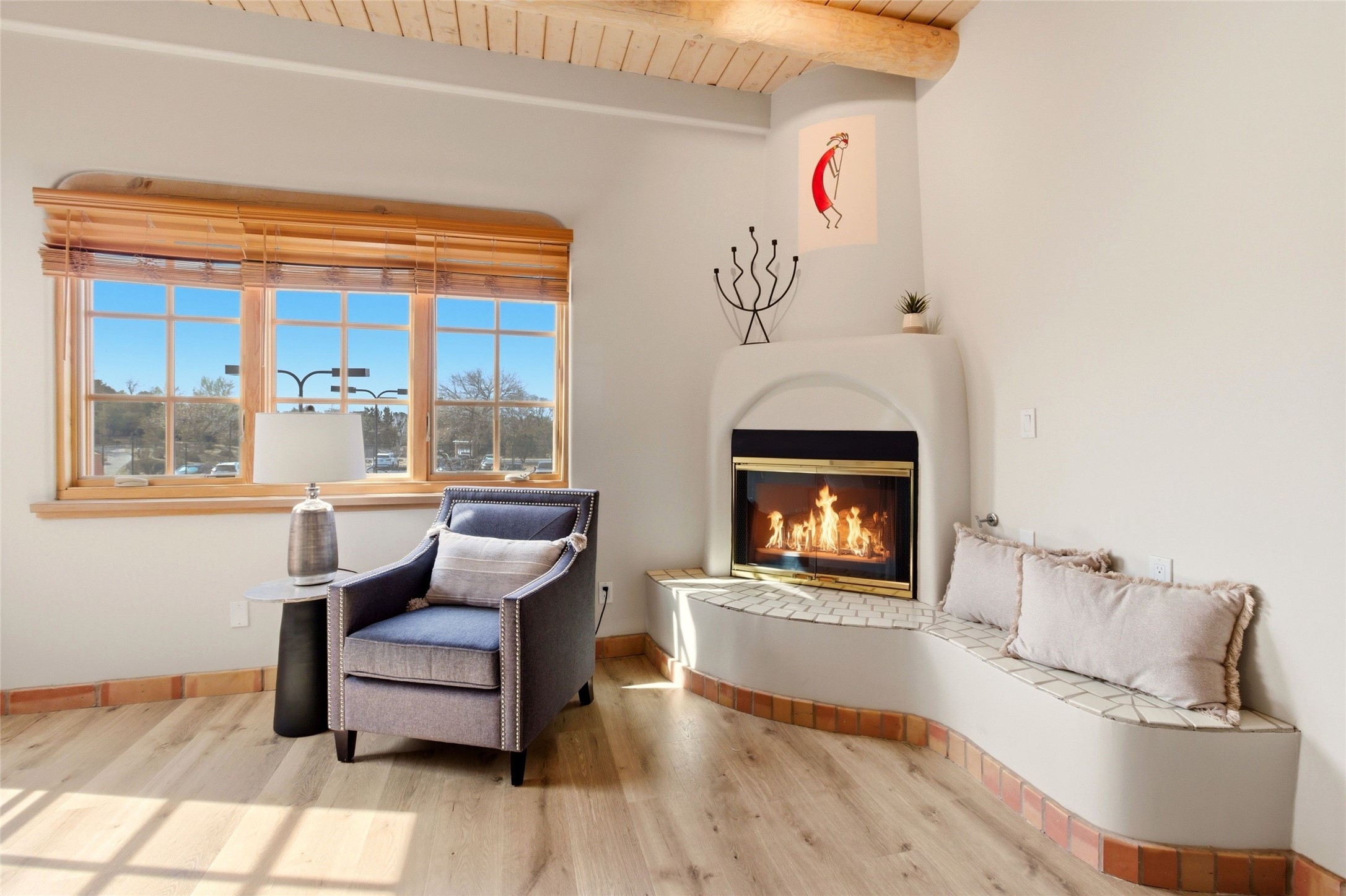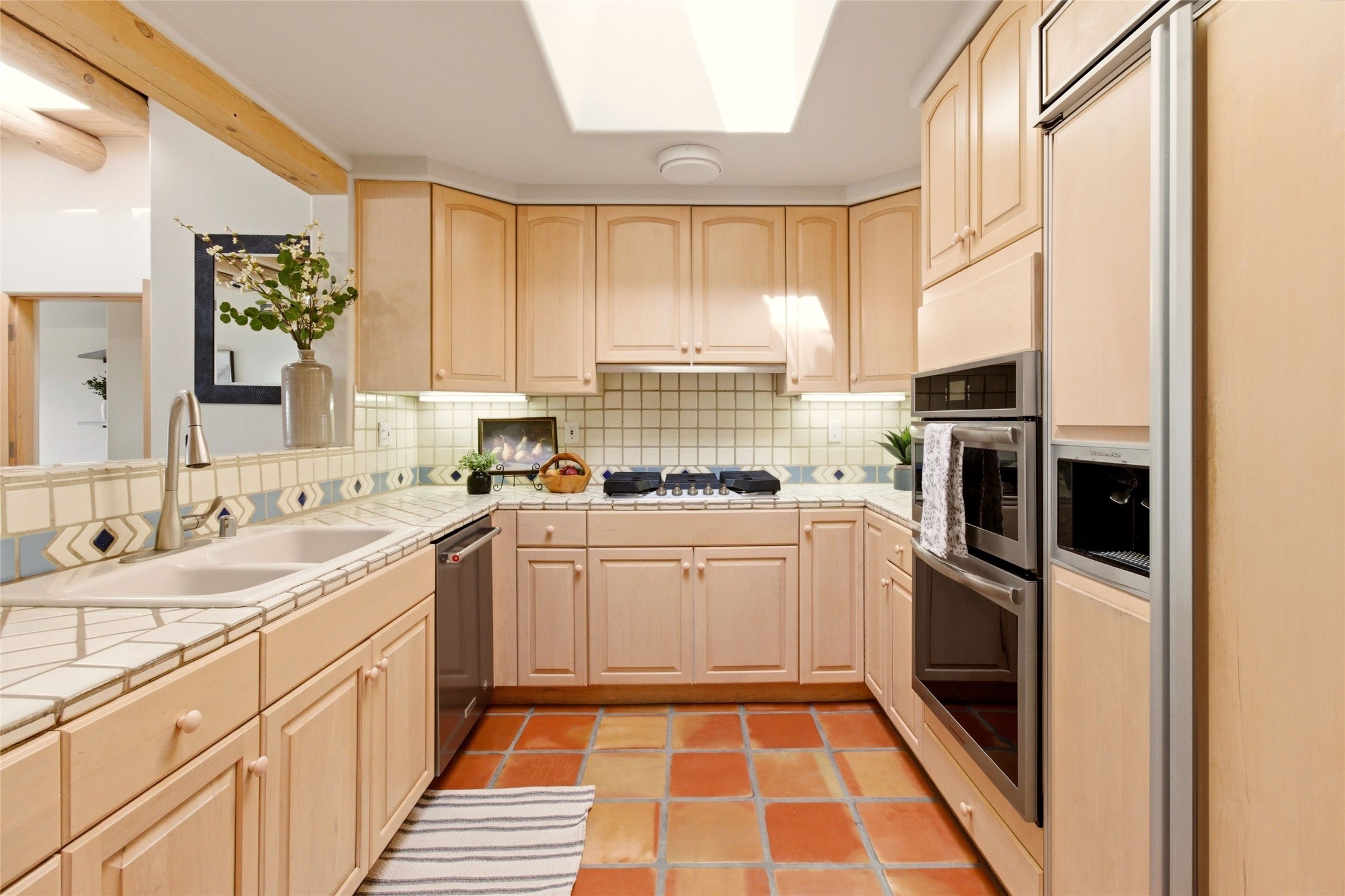 Private Retreat in Amenity-Rich Quail Run Community. Located within a sought-after community, this lovely reimagined unit offers the perfect blend of comfort and resort-style living. Set on 103 gated acres just minutes from Santa Fe's historic Plaza, Quail Run is home to 265 privately owned residences and boasts world-class amenities with 24 hour security. Enjoy an active and social lifestyle with access to a 9-hole PGA-rated golf course, tennis and pickleball courts, a state-of-the-art fitness center, indoor heated lap pool, hydrotherapy pool, clubhouse dining, and a vibrant calendar of community events. Inside, natural light pours in through skylights, while exposed ceiling beams and a gas fireplace add warmth and charm to the living area. Enjoy new wood floors in the living room, and Saltillo tiles in the kitchen. Cozy up by the kiva gas fireplace in the living room and step onto your private balcony overlooking the tennis courts--a perfect spot for morning coffee or evening relaxation. The kitchen features decorative tile accents, a new built in gas range, new built-in microwave, and ample cabinetry. The home has a thoughtfully designed floor plan providing excellent separation of space, with the primary suite and guest bedroom situated on opposite sides of the home. The spacious primary suite offers a peaceful retreat with its own private balcony. Enjoy extra security and quiet in an upper floor unit with no one above you, and located near the elevator. A dedicated under ground garage parking space, also near the elevator, makes living in this Quail Run property convenient. Experience low-maintenance living in a premier Santa Fe community where every day feels like a getaway.