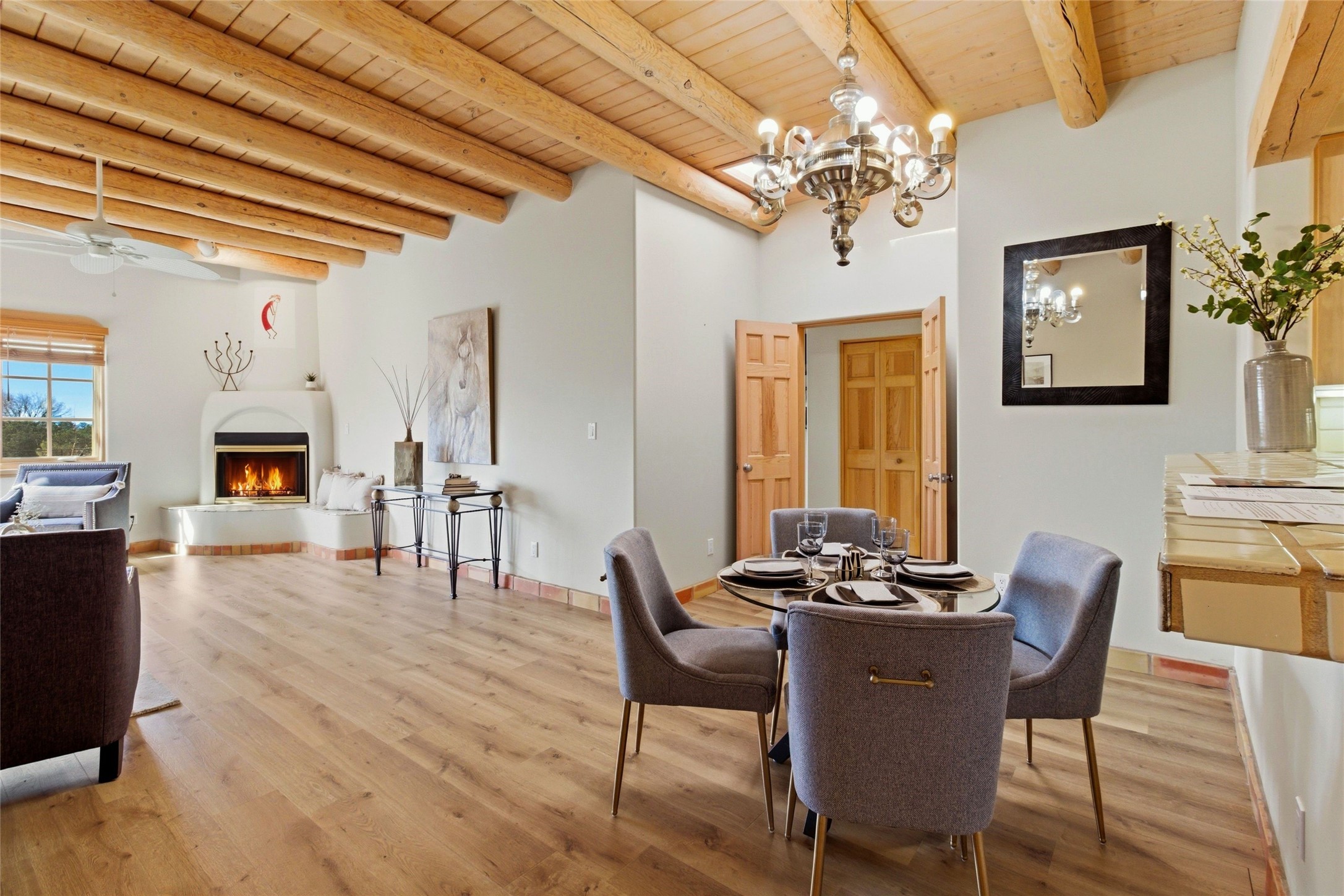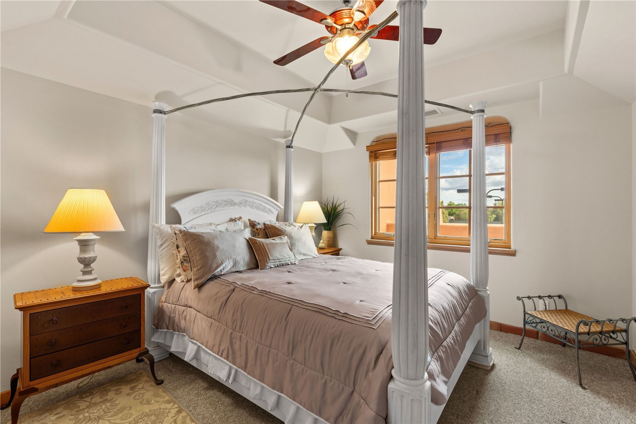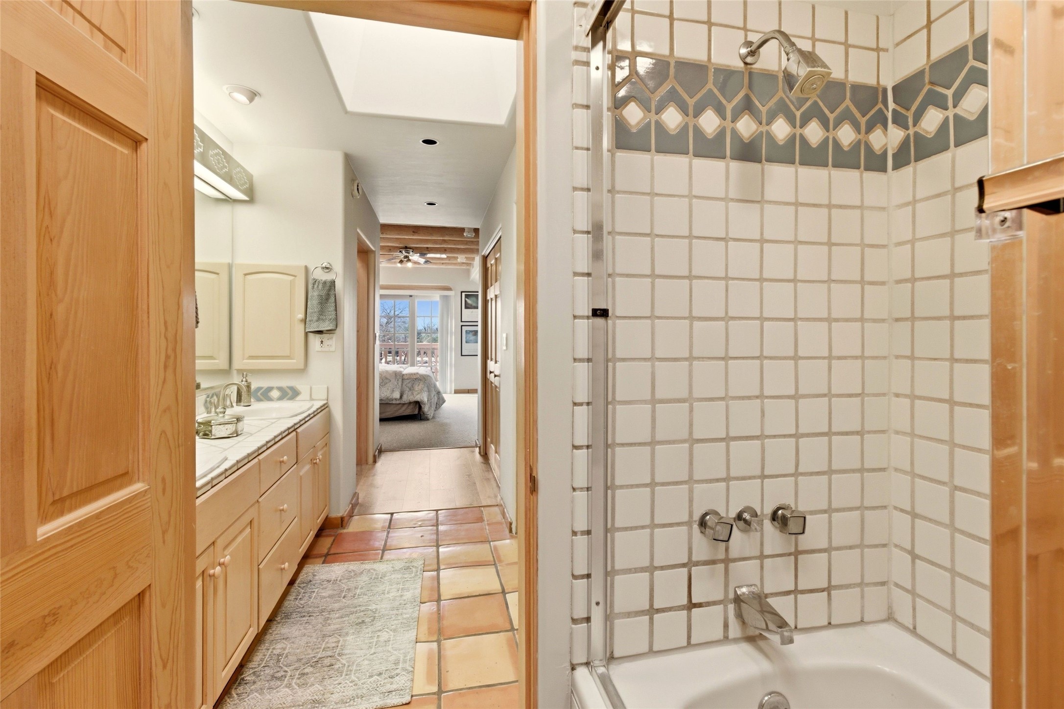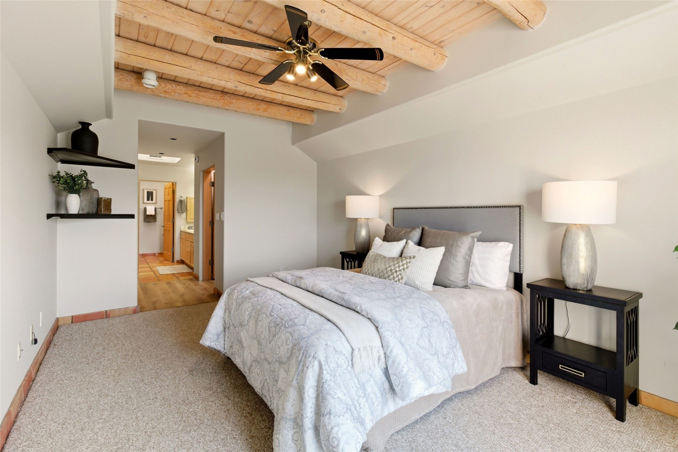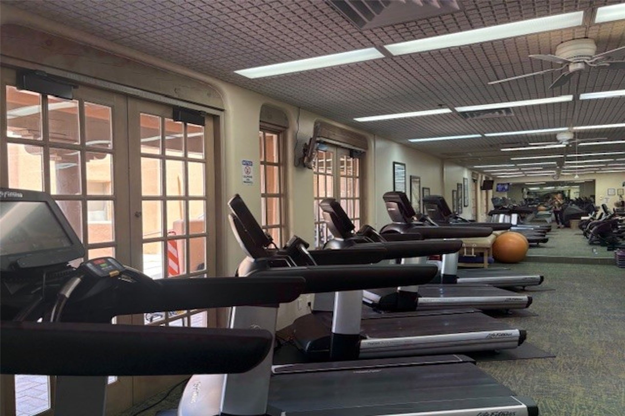 Private Retreat in Amenity-Rich Quail Run Community. Located within a sought-after community, this lovely reimagined unit offers the perfect blend of comfort and resort-style living. Set on 103 gated acres just minutes from Santa Fe's historic Plaza, Quail Run is home to 265 privately owned residences and boasts world-class amenities with 24 hour security. Enjoy an active and social lifestyle with access to a 9-hole PGA-rated golf course, tennis and pickleball courts, a state-of-the-art fitness center, indoor heated lap pool, hydrotherapy pool, clubhouse dining, and a vibrant calendar of community events. Inside, natural light pours in through skylights, while exposed ceiling beams and a gas fireplace add warmth and charm to the living area. Enjoy new wood floors in the living room, and Saltillo tiles in the kitchen. Cozy up by the kiva gas fireplace in the living room and step onto your private balcony overlooking the tennis courts--a perfect spot for morning coffee or evening relaxation. The kitchen features decorative tile accents, a new built in gas range, new built-in microwave, and ample cabinetry. The home has a thoughtfully designed floor plan providing excellent separation of space, with the primary suite and guest bedroom situated on opposite sides of the home. The spacious primary suite offers a peaceful retreat with its own private balcony. Enjoy extra security and quiet in an upper floor unit with no one above you, and located near the elevator. A dedicated under ground garage parking space, also near the elevator, makes living in this Quail Run property convenient. Experience low-maintenance living in a premier Santa Fe community where every day feels like a getaway.
