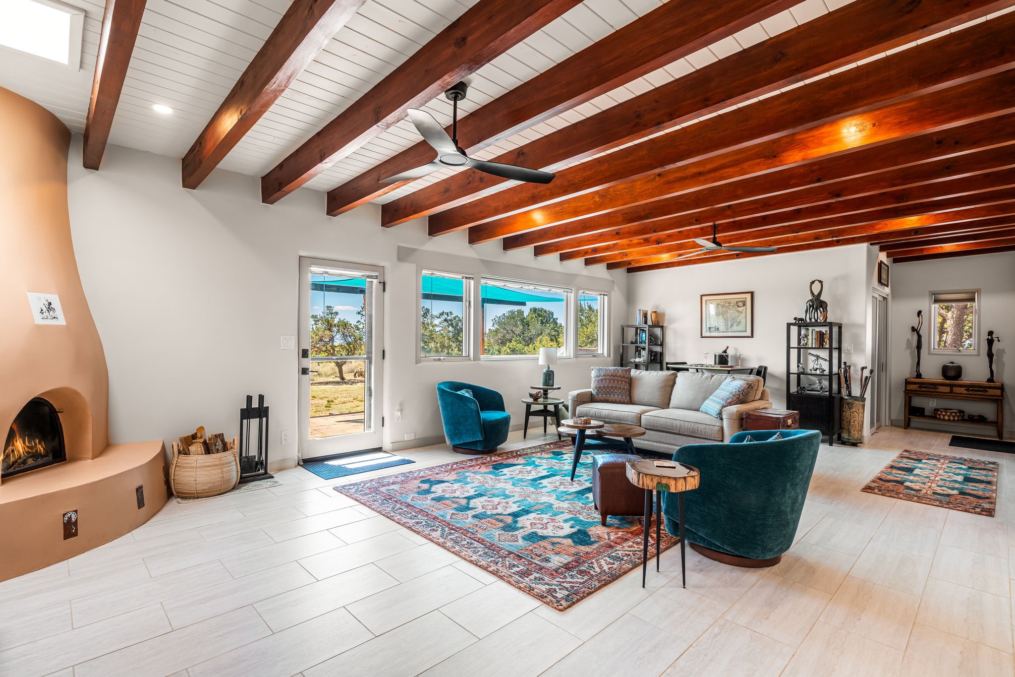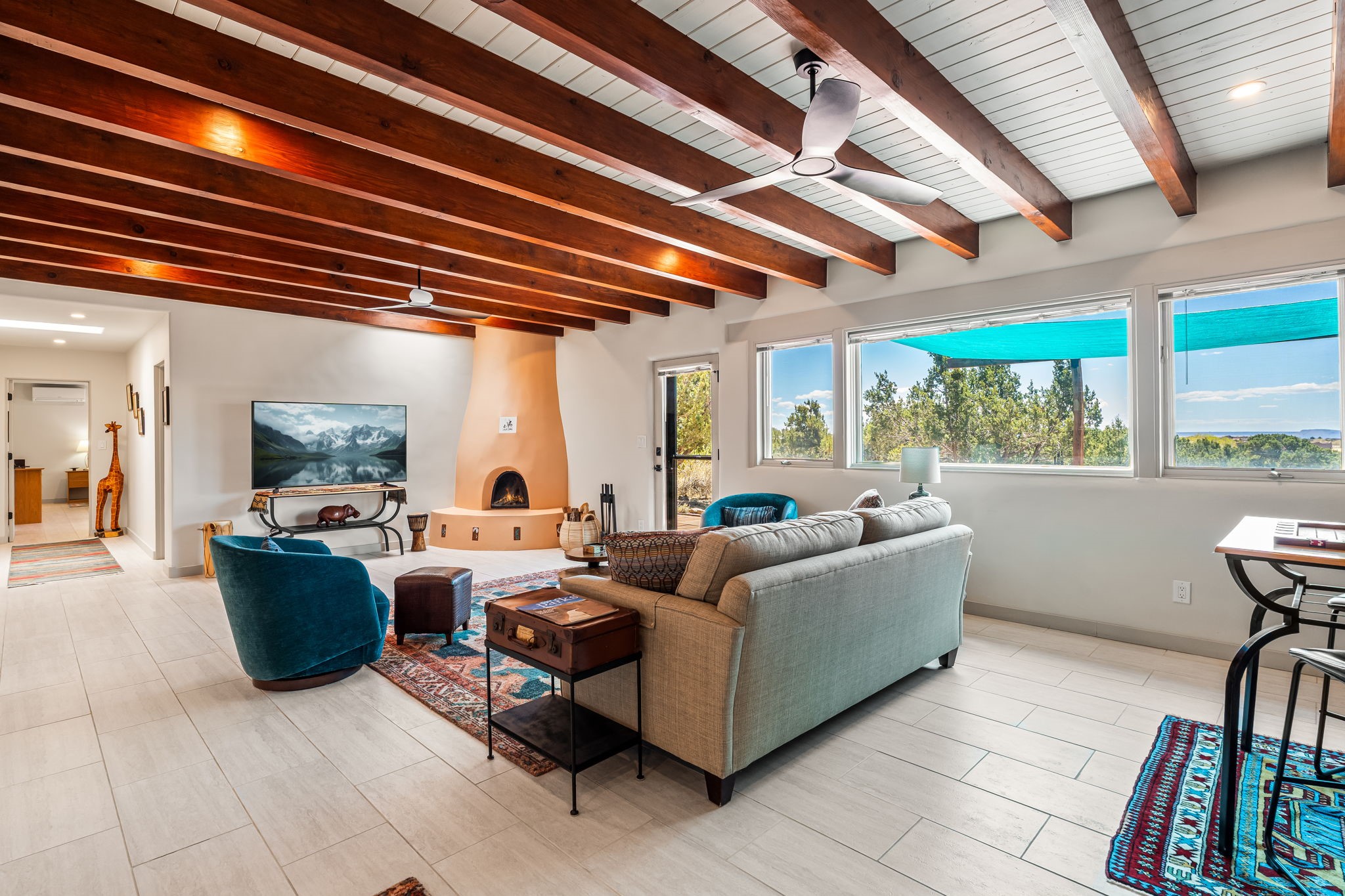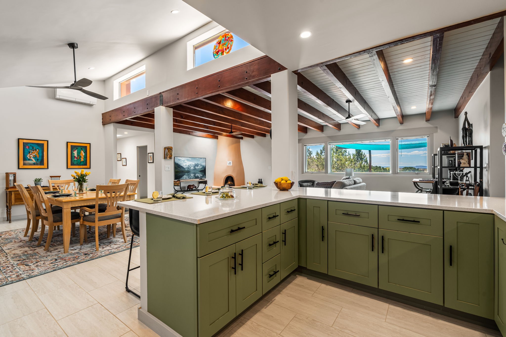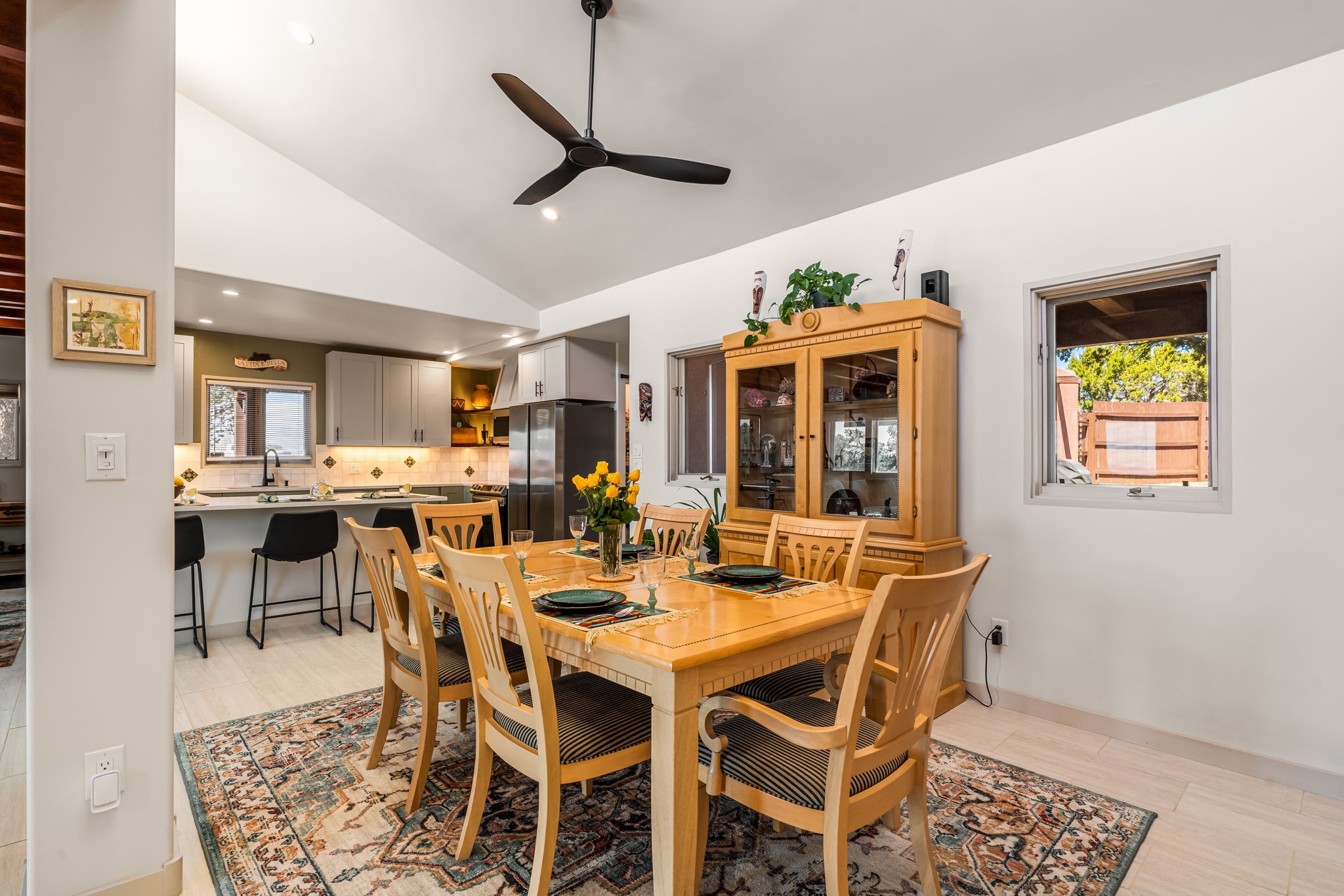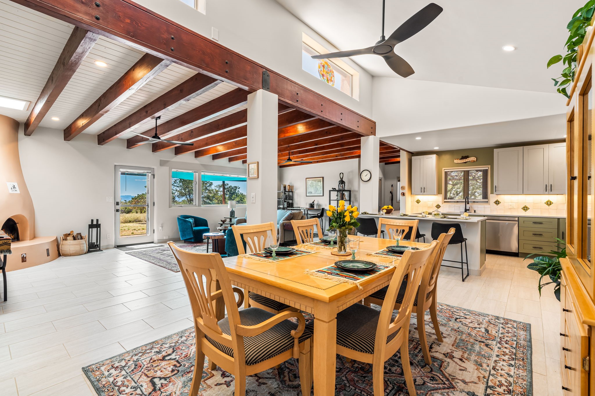 One of the most impressive remodels in Eldorado, this immaculate single-level home offers a light-filled, open floor plan with 3 bedrooms and 3 bathrooms, thoughtfully designed for both comfort and style. Beautiful 12" x 24" porcelain tile floors run throughout creating a clean, modern look. The chef's kitchen is the heart of the home, featuring quartz countertops, stainless steel appliances, a large pantry, and under-cabinet lighting, all opening seamlessly to the dining and living areas for effortless entertaining. The spacious living room is anchored by a classic kiva fireplace, adding warmth and character. The generous primary suite provides a relaxing retreat with a spa-like bath and soaking tub, while the third bedroom includes a built-in Murphy bed, offering flexibility for guests or a home office. Four mini-split systems ensure efficient heating and cooling year-round. Outdoor living is just as inviting, with multiple areas for entertaining, a fully fenced backyard, extensive drip irrigation, and French drains designed to direct water away from the home. Additional upgrades include a finished two-car garage with a workbench and storage, a tankless water heater, whole-house water filtration, and a silicone roof coating with two years remaining on the warranty. The home also includes a radon mitigation system and has been pre-inspected, with the report available upon request. A complete list of upgrades and available furnishings in supplements. Seller may require up to a 30-day leaseback.
