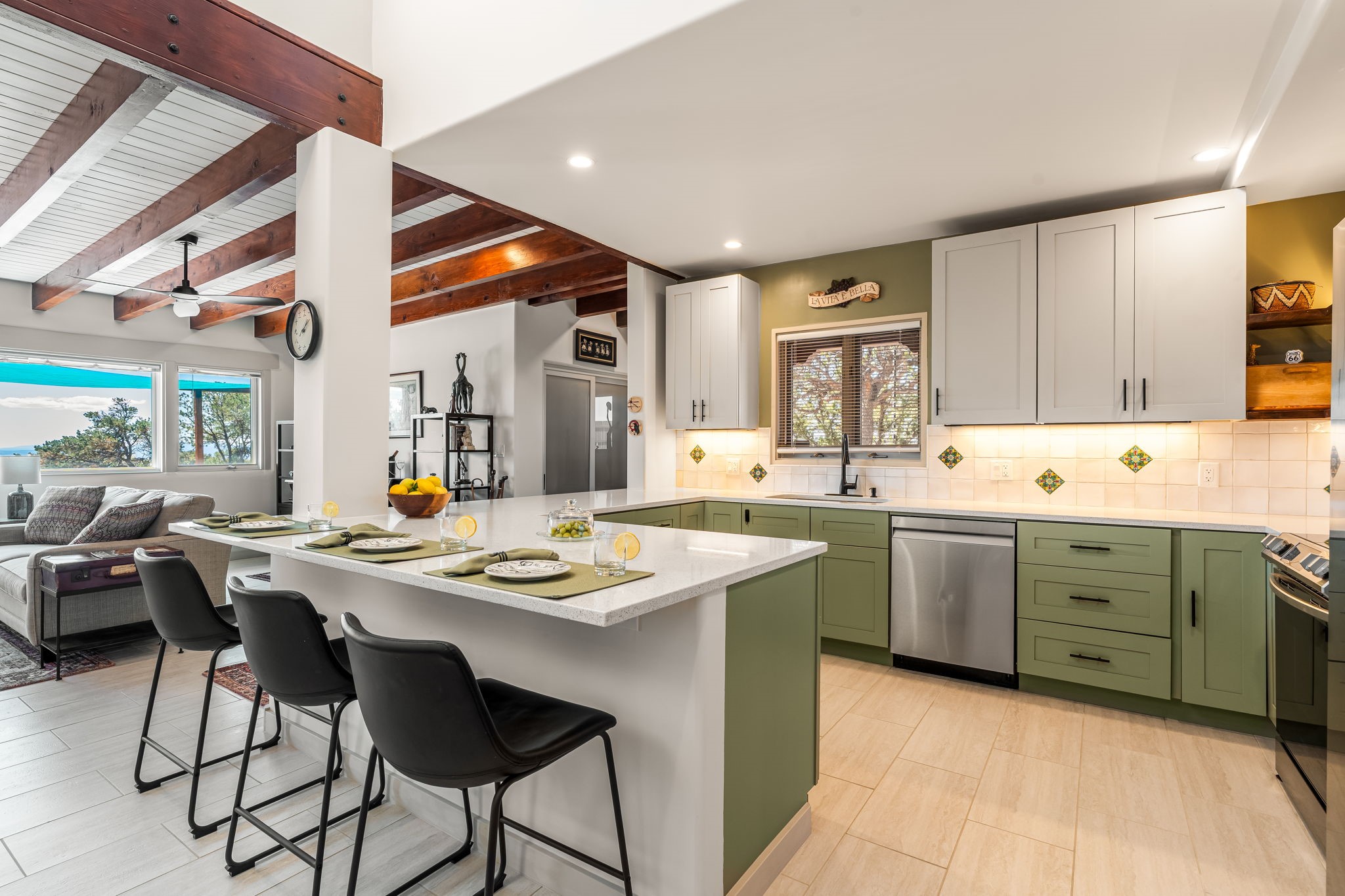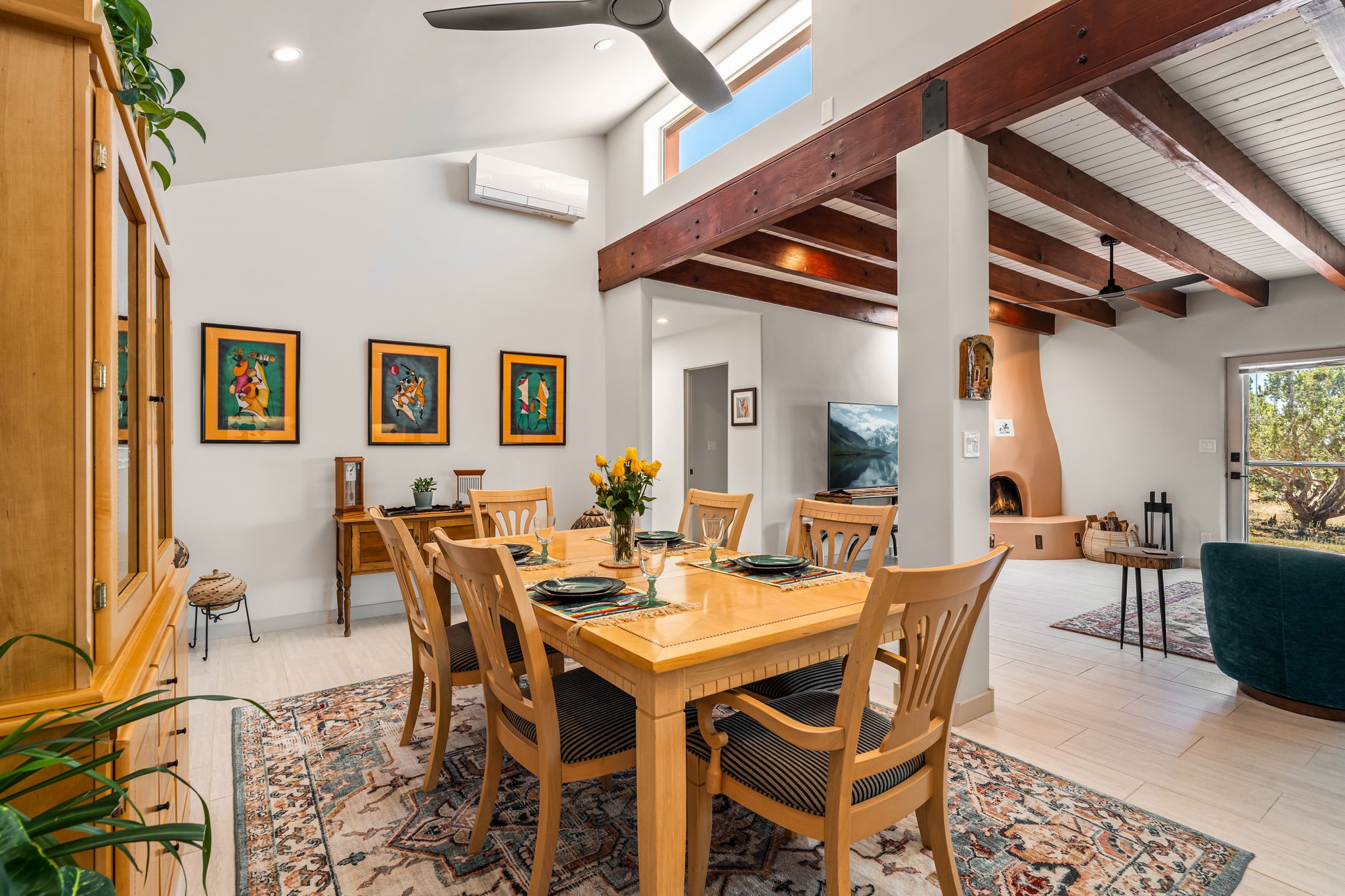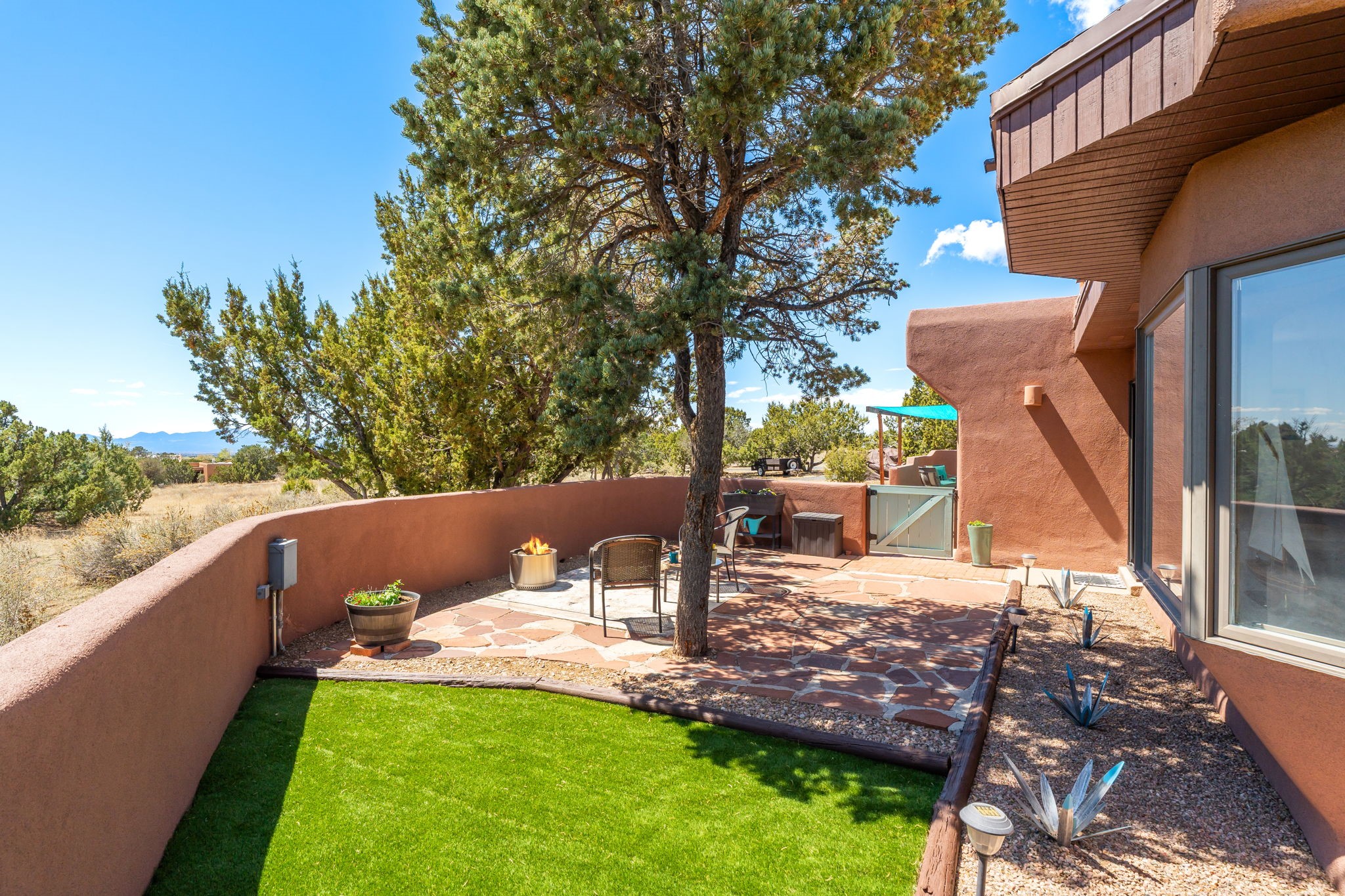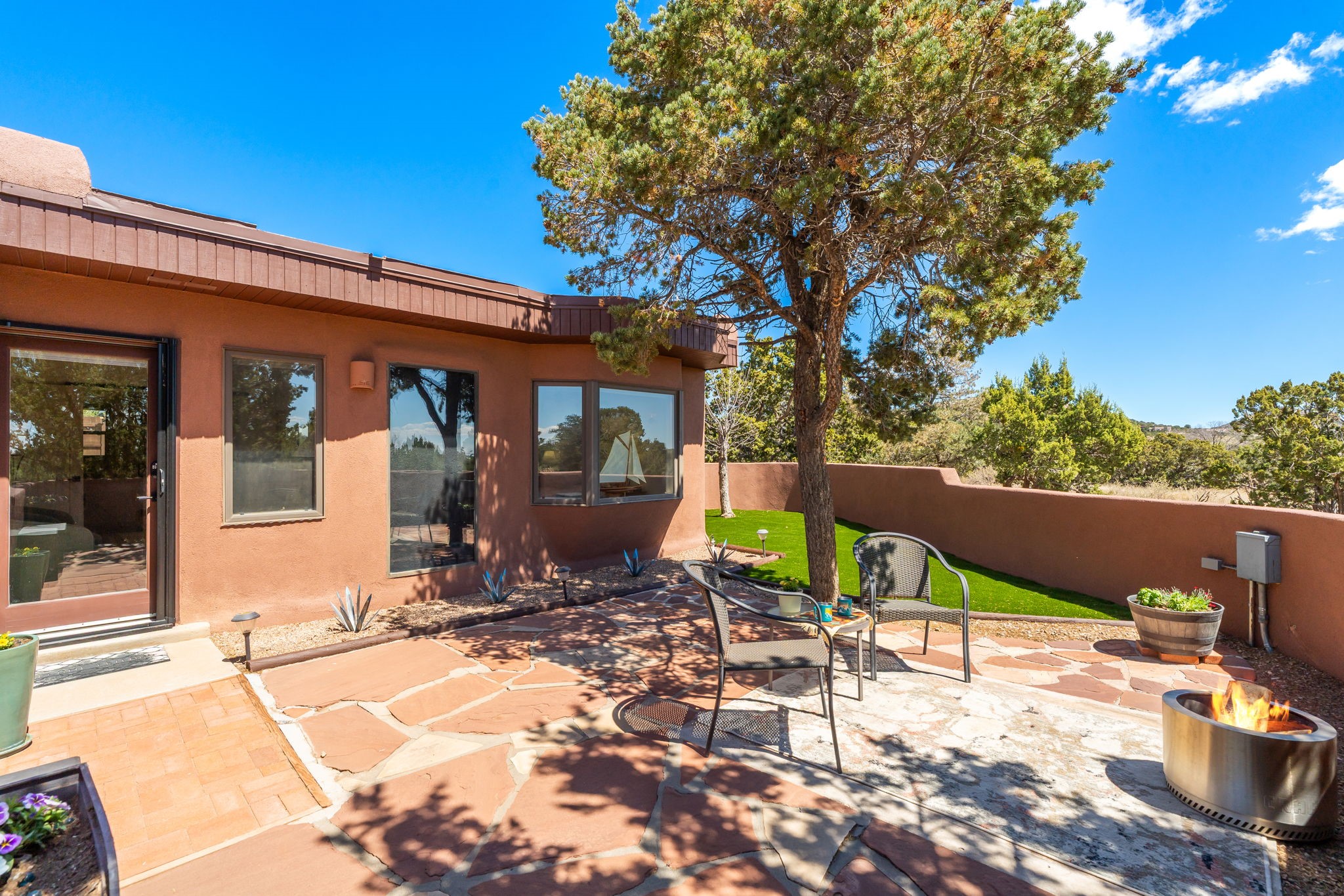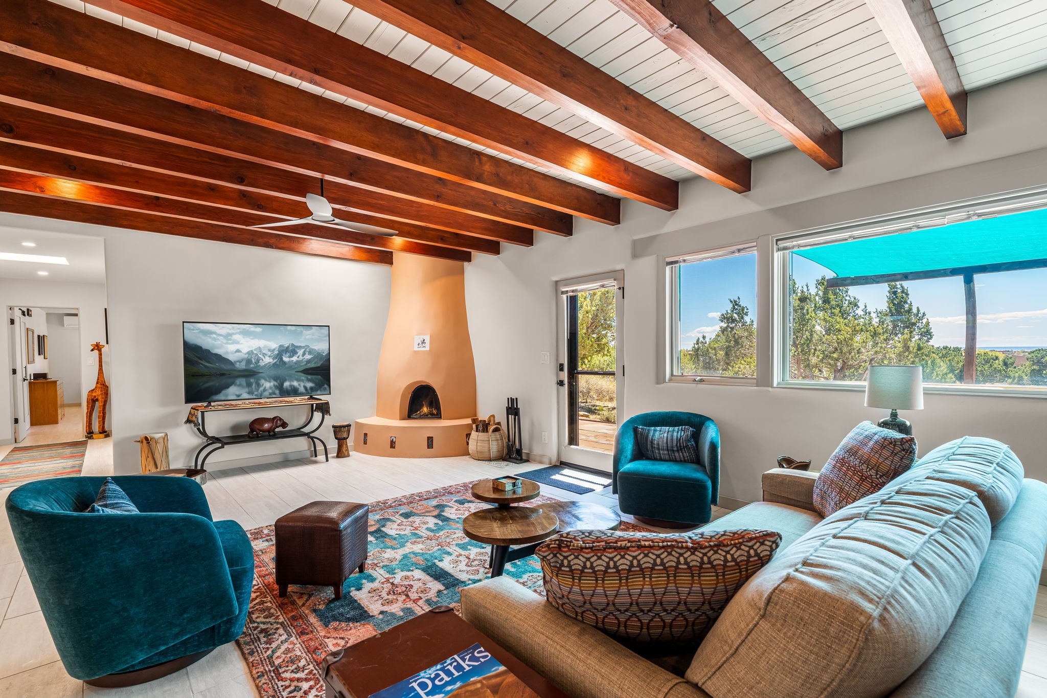 One of the most impressive remodels in Eldorado, this immaculate single-level home offers a light-filled, open floor plan with 3 bedrooms and 3 bathrooms, thoughtfully designed for both comfort and style. Beautiful 12" x 24" porcelain tile floors run throughout creating a clean, modern look. The chef's kitchen is the heart of the home, featuring quartz countertops, stainless steel appliances, a large pantry, and under-cabinet lighting, all opening seamlessly to the dining and living areas for effortless entertaining. The spacious living room is anchored by a classic kiva fireplace, adding warmth and character. The generous primary suite provides a relaxing retreat with a spa-like bath and soaking tub, while the third bedroom includes a built-in Murphy bed, offering flexibility for guests or a home office. Four mini-split systems ensure efficient heating and cooling year-round. Outdoor living is just as inviting, with multiple areas for entertaining, a fully fenced backyard, extensive drip irrigation, and French drains designed to direct water away from the home. Additional upgrades include a finished two-car garage with a workbench and storage, a tankless water heater, whole-house water filtration, and a silicone roof coating with two years remaining on the warranty. The home also includes a radon mitigation system and has been pre-inspected, with the report available upon request. A complete list of upgrades and available furnishings in supplements. Seller may require up to a 30-day leaseback.