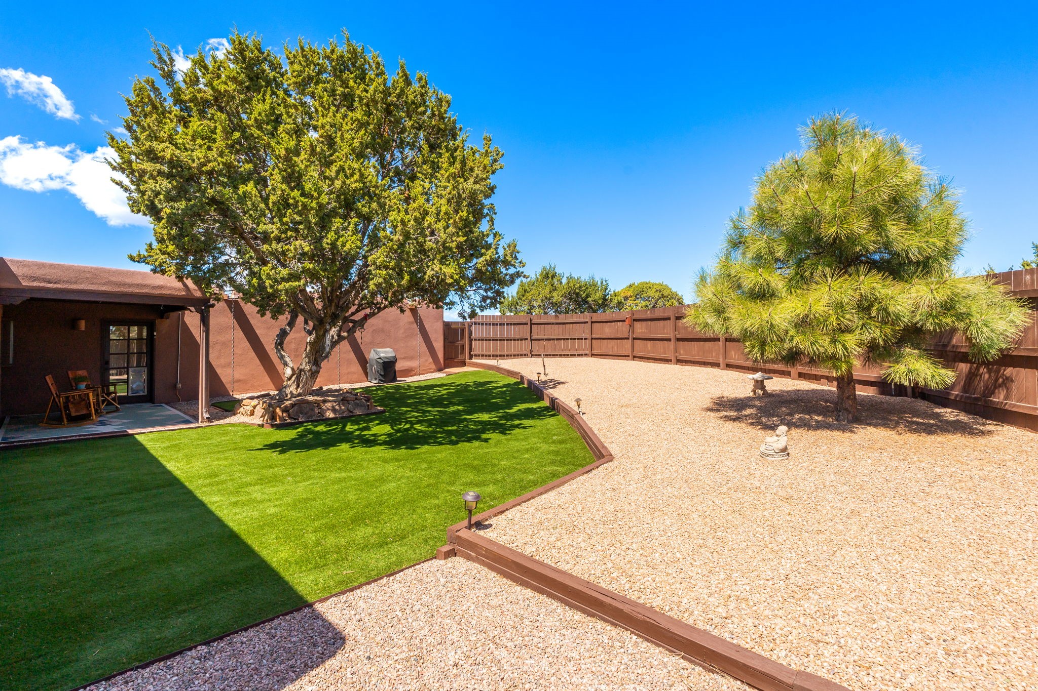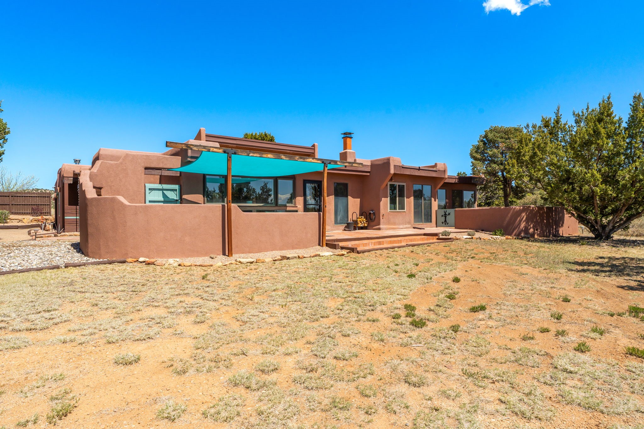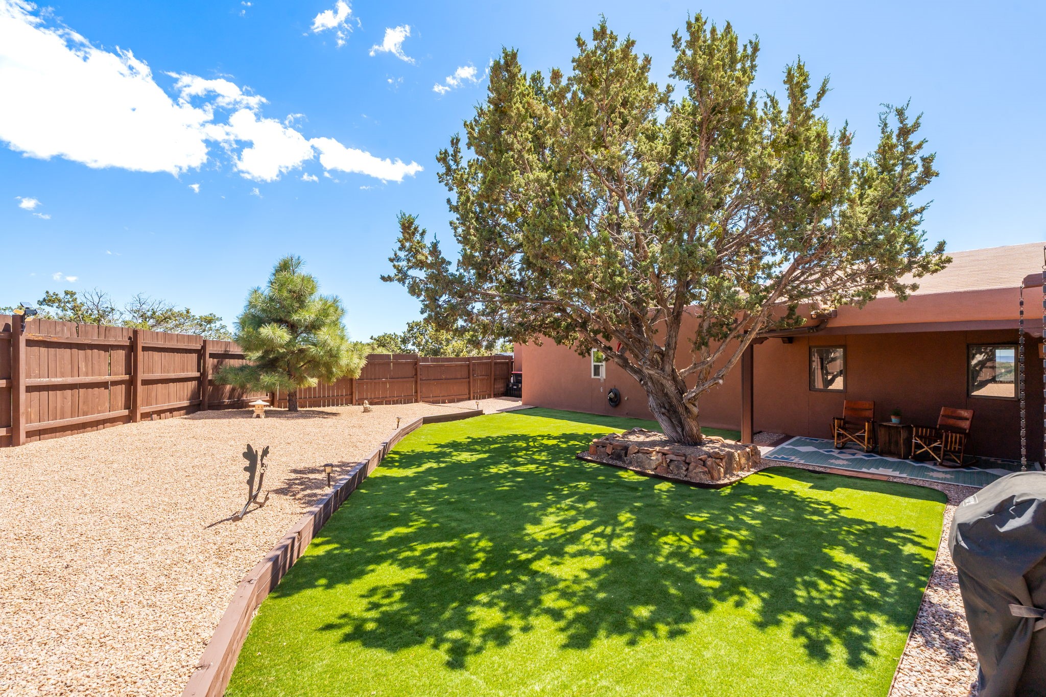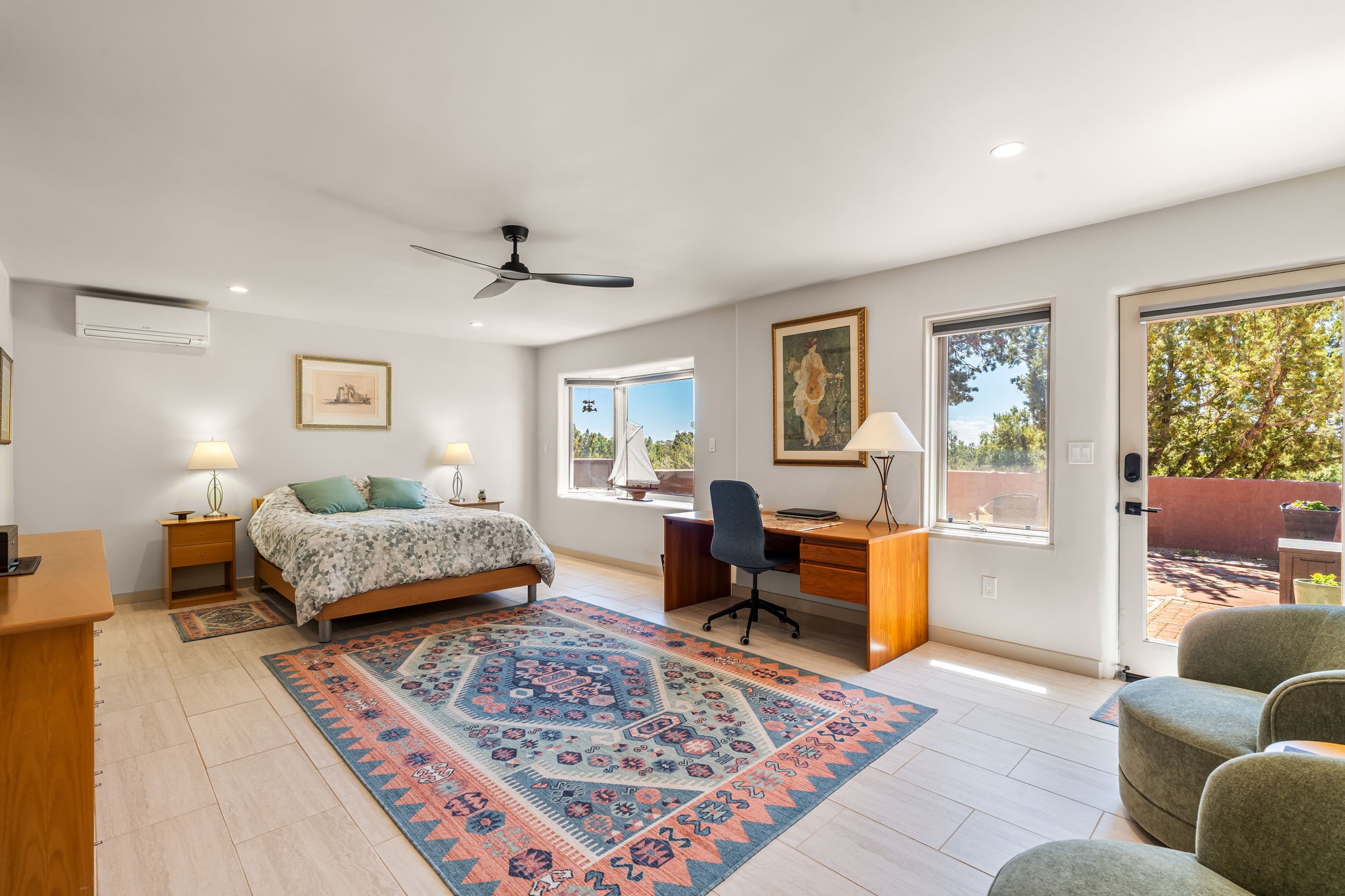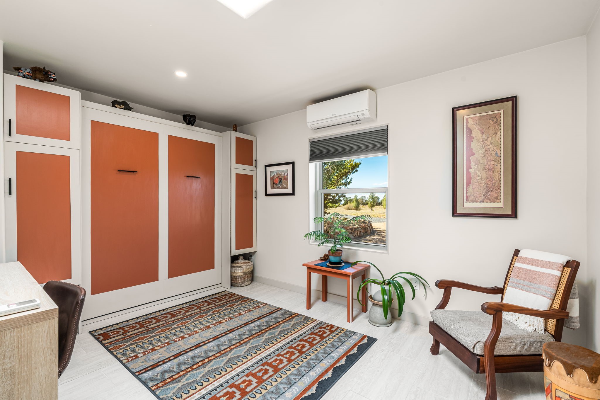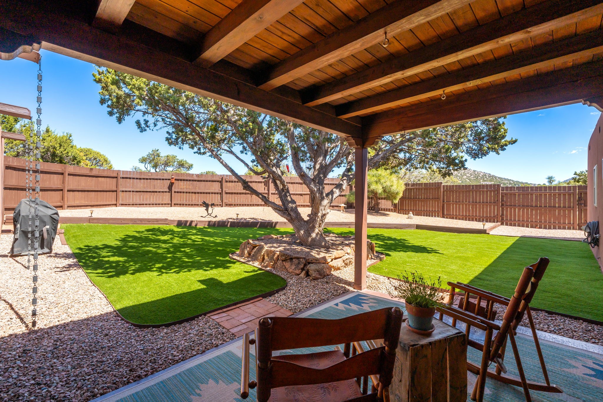 One of the most impressive remodels in Eldorado, this immaculate single-level home offers a light-filled, open floor plan with 3 bedrooms and 3 bathrooms, thoughtfully designed for both comfort and style. Beautiful 12" x 24" porcelain tile floors run throughout creating a clean, modern look. The chef's kitchen is the heart of the home, featuring quartz countertops, stainless steel appliances, a large pantry, and under-cabinet lighting, all opening seamlessly to the dining and living areas for effortless entertaining. The spacious living room is anchored by a classic kiva fireplace, adding warmth and character. The generous primary suite provides a relaxing retreat with a spa-like bath and soaking tub, while the third bedroom includes a built-in Murphy bed, offering flexibility for guests or a home office. Four mini-split systems ensure efficient heating and cooling year-round. Outdoor living is just as inviting, with multiple areas for entertaining, a fully fenced backyard, extensive drip irrigation, and French drains designed to direct water away from the home. Additional upgrades include a finished two-car garage with a workbench and storage, a tankless water heater, whole-house water filtration, and a silicone roof coating with two years remaining on the warranty. The home also includes a radon mitigation system and has been pre-inspected, with the report available upon request. A complete list of upgrades and available furnishings in supplements. Seller may require up to a 30-day leaseback.