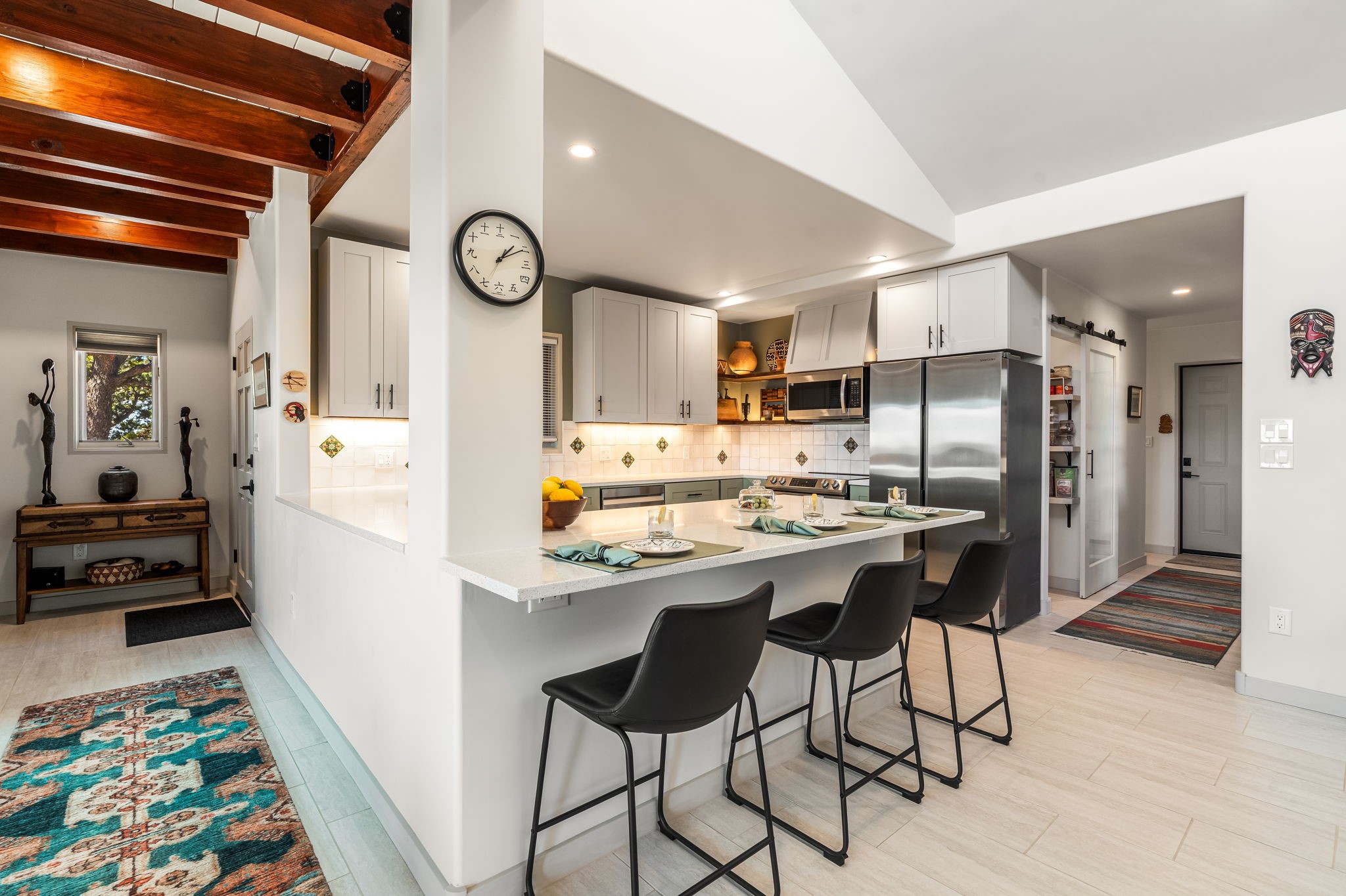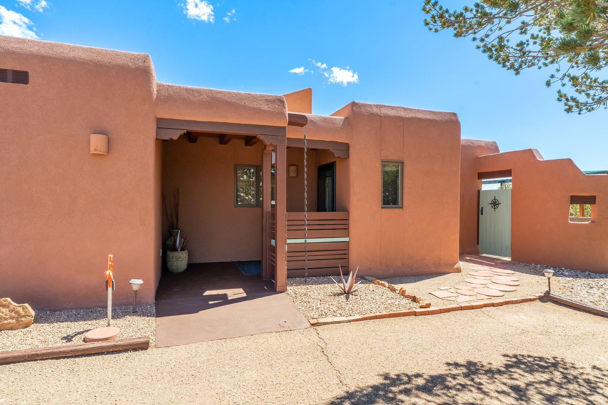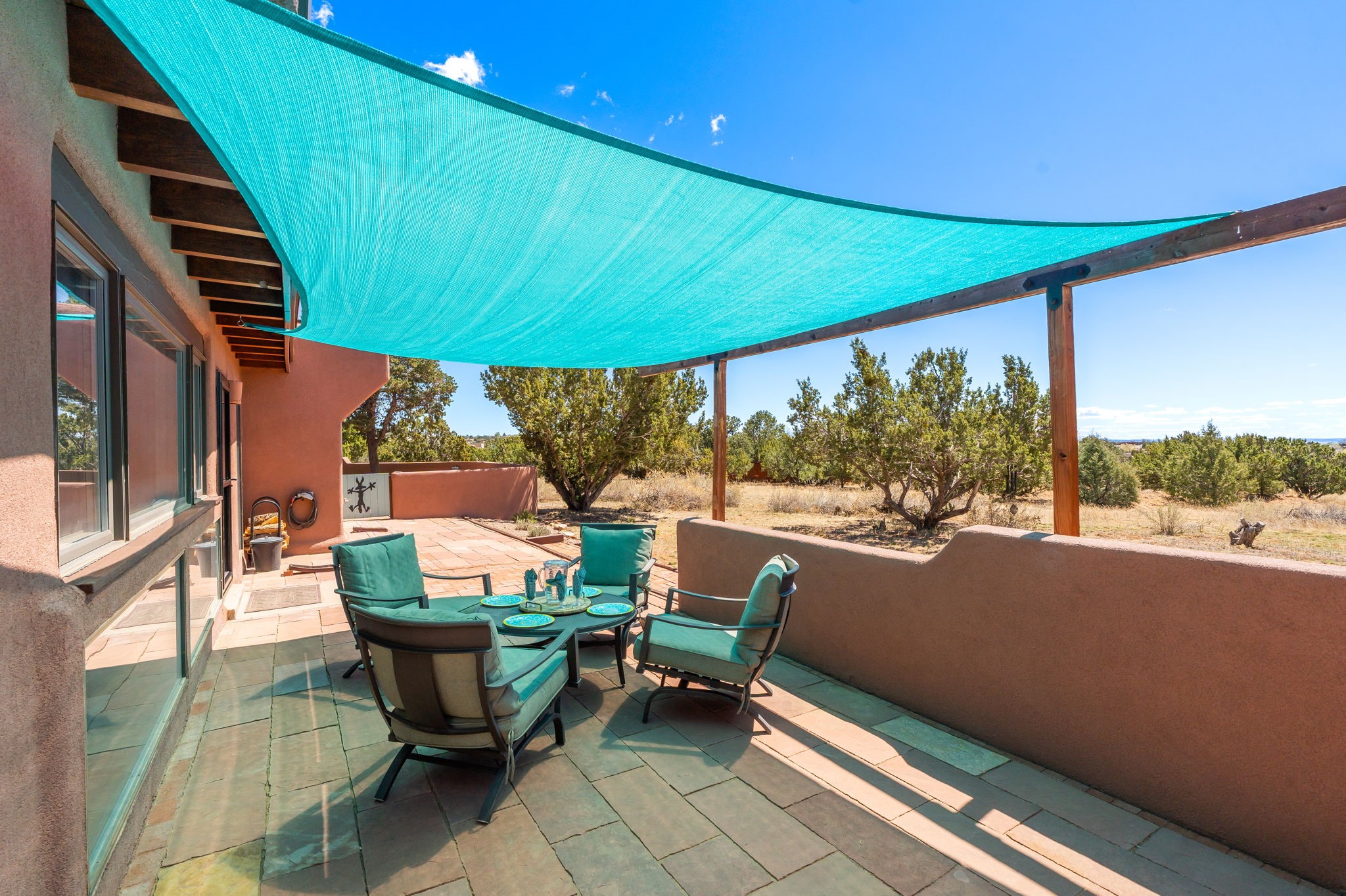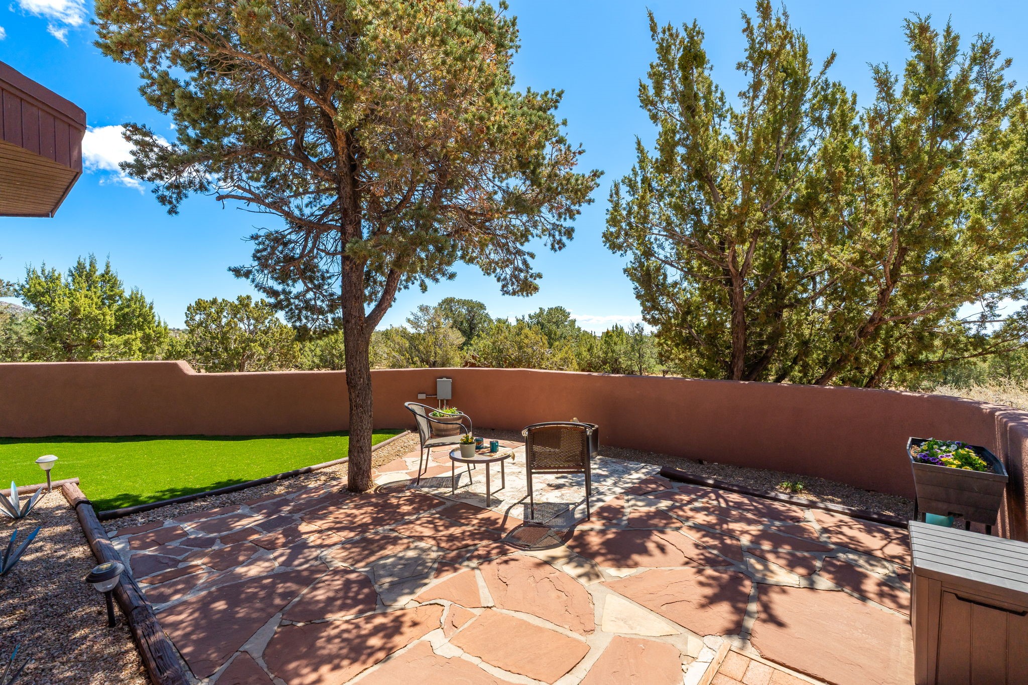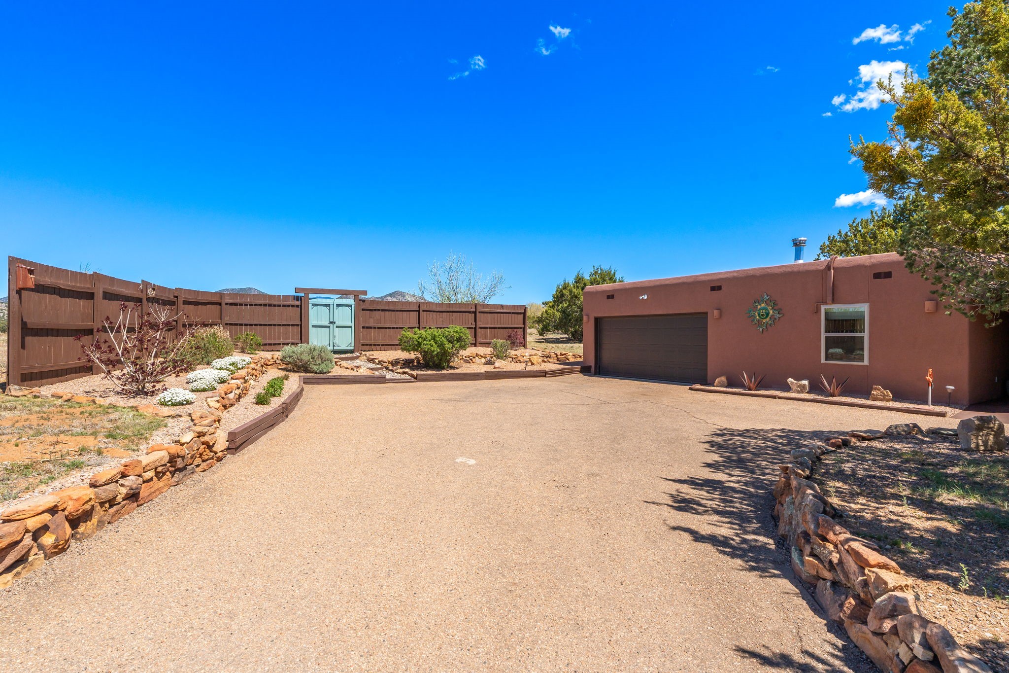 One of the most impressive remodels in Eldorado, this immaculate single-level home offers a light-filled, open floor plan with 3 bedrooms and 3 bathrooms, thoughtfully designed for both comfort and style. Beautiful 12" x 24" porcelain tile floors run throughout creating a clean, modern look. The chef's kitchen is the heart of the home, featuring quartz countertops, stainless steel appliances, a large pantry, and under-cabinet lighting, all opening seamlessly to the dining and living areas for effortless entertaining. The spacious living room is anchored by a classic kiva fireplace, adding warmth and character. The generous primary suite provides a relaxing retreat with a spa-like bath and soaking tub, while the third bedroom includes a built-in Murphy bed, offering flexibility for guests or a home office. Four mini-split systems ensure efficient heating and cooling year-round. Outdoor living is just as inviting, with multiple areas for entertaining, a fully fenced backyard, extensive drip irrigation, and French drains designed to direct water away from the home. Additional upgrades include a finished two-car garage with a workbench and storage, a tankless water heater, whole-house water filtration, and a silicone roof coating with two years remaining on the warranty. The home also includes a radon mitigation system and has been pre-inspected, with the report available upon request. A complete list of upgrades and available furnishings in supplements. Seller may require up to a 30-day leaseback.