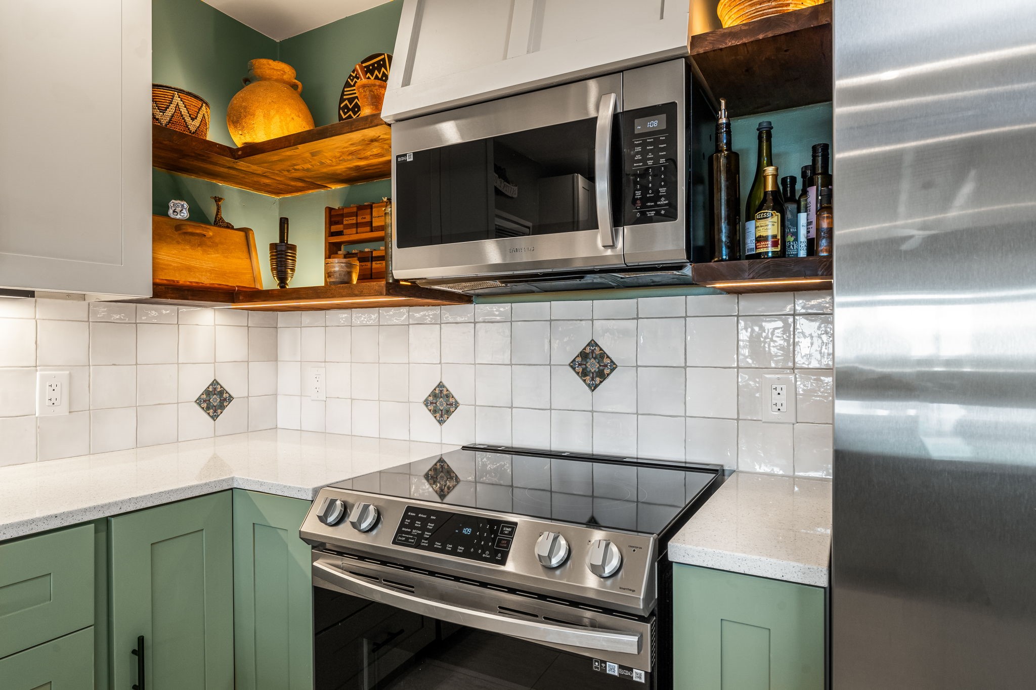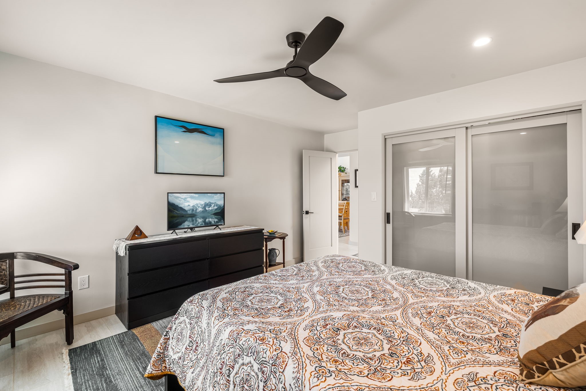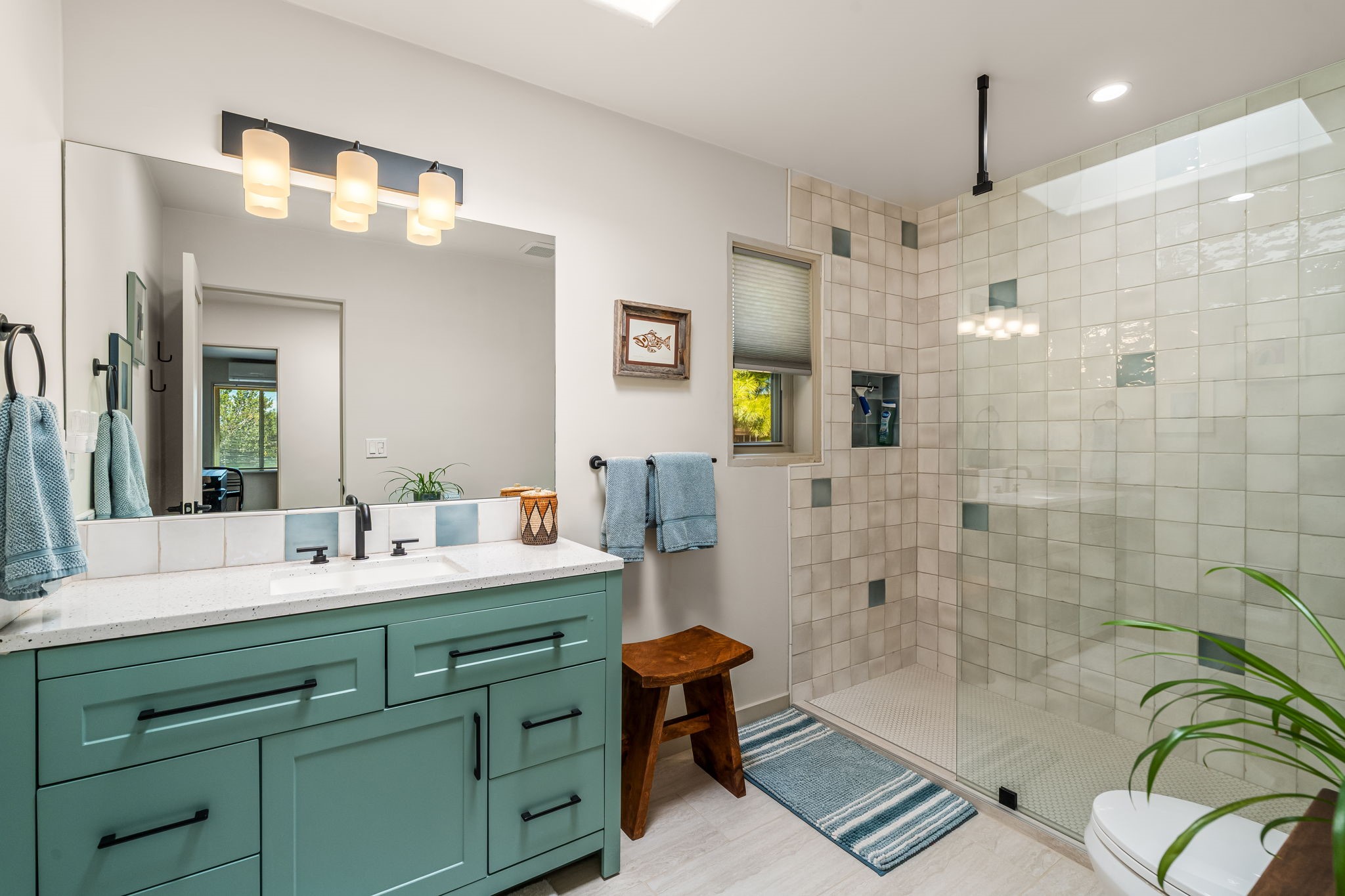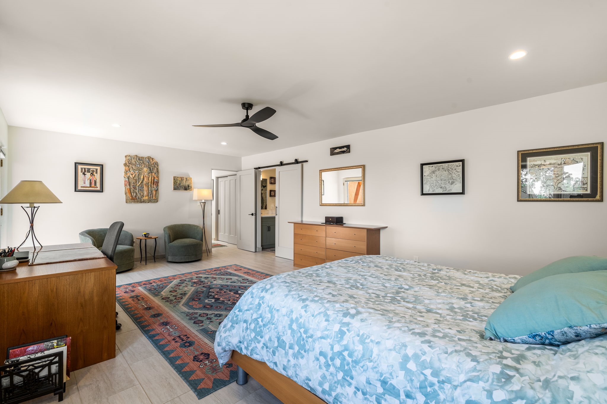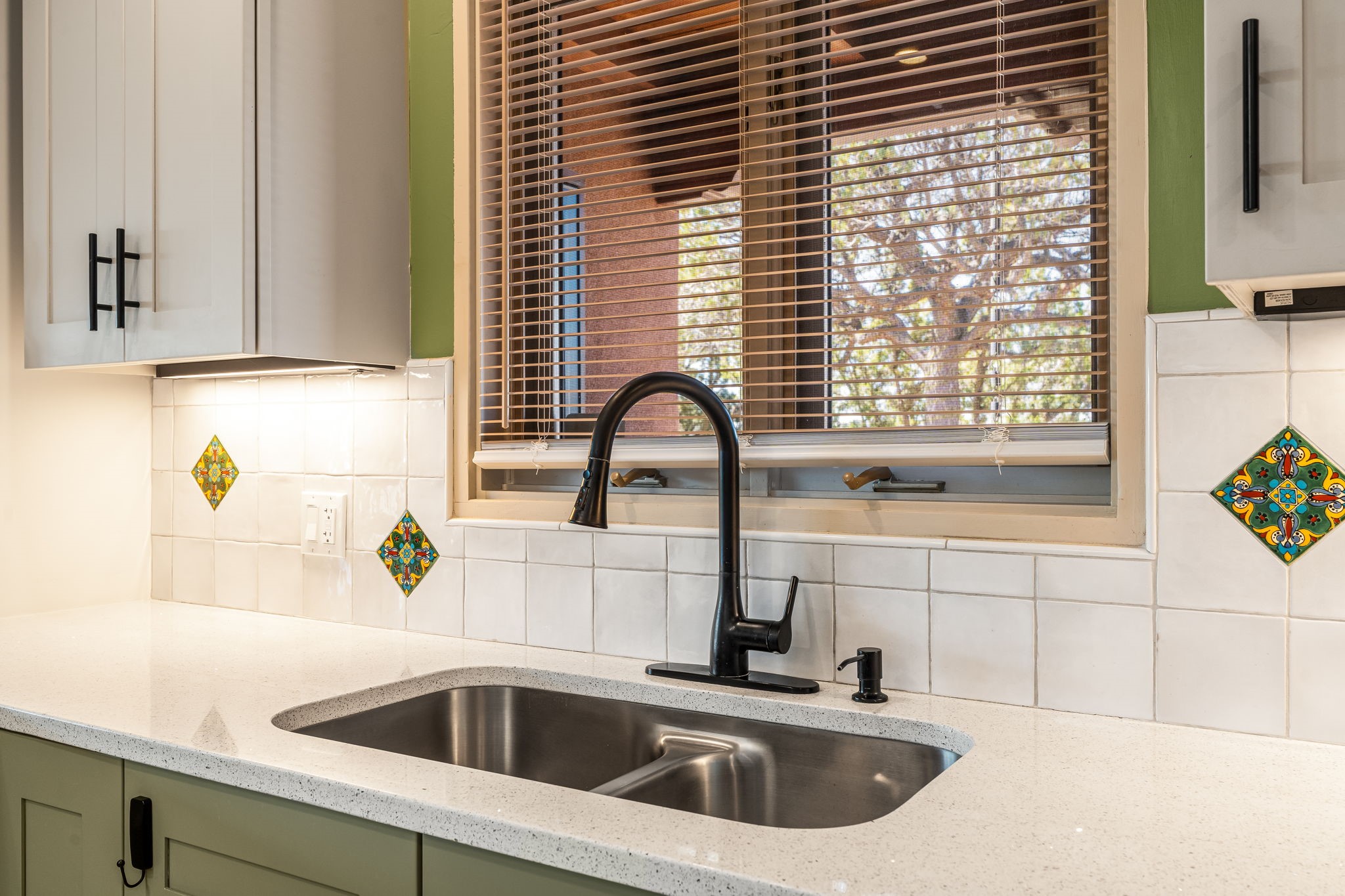 One of the most impressive remodels in Eldorado, this immaculate single-level home offers a light-filled, open floor plan with 3 bedrooms and 3 bathrooms, thoughtfully designed for both comfort and style. Beautiful 12" x 24" porcelain tile floors run throughout creating a clean, modern look. The chef's kitchen is the heart of the home, featuring quartz countertops, stainless steel appliances, a large pantry, and under-cabinet lighting, all opening seamlessly to the dining and living areas for effortless entertaining. The spacious living room is anchored by a classic kiva fireplace, adding warmth and character. The generous primary suite provides a relaxing retreat with a spa-like bath and soaking tub, while the third bedroom includes a built-in Murphy bed, offering flexibility for guests or a home office. Four mini-split systems ensure efficient heating and cooling year-round. Outdoor living is just as inviting, with multiple areas for entertaining, a fully fenced backyard, extensive drip irrigation, and French drains designed to direct water away from the home. Additional upgrades include a finished two-car garage with a workbench and storage, a tankless water heater, whole-house water filtration, and a silicone roof coating with two years remaining on the warranty. The home also includes a radon mitigation system and has been pre-inspected, with the report available upon request. A complete list of upgrades and available furnishings in supplements. Seller may require up to a 30-day leaseback.