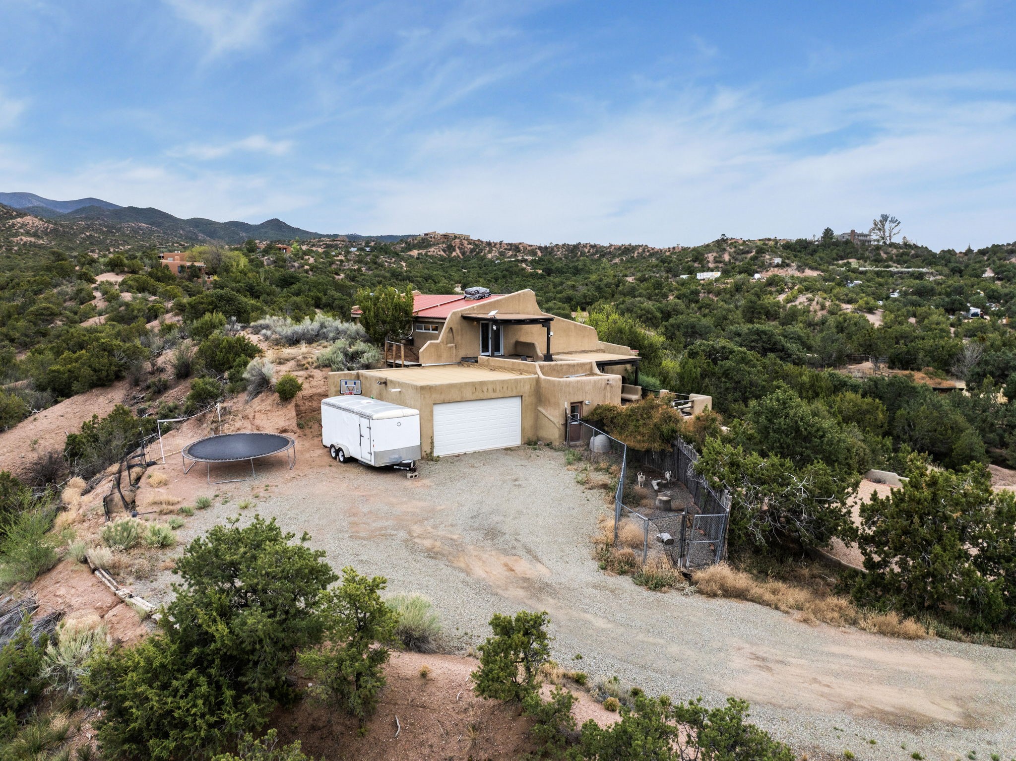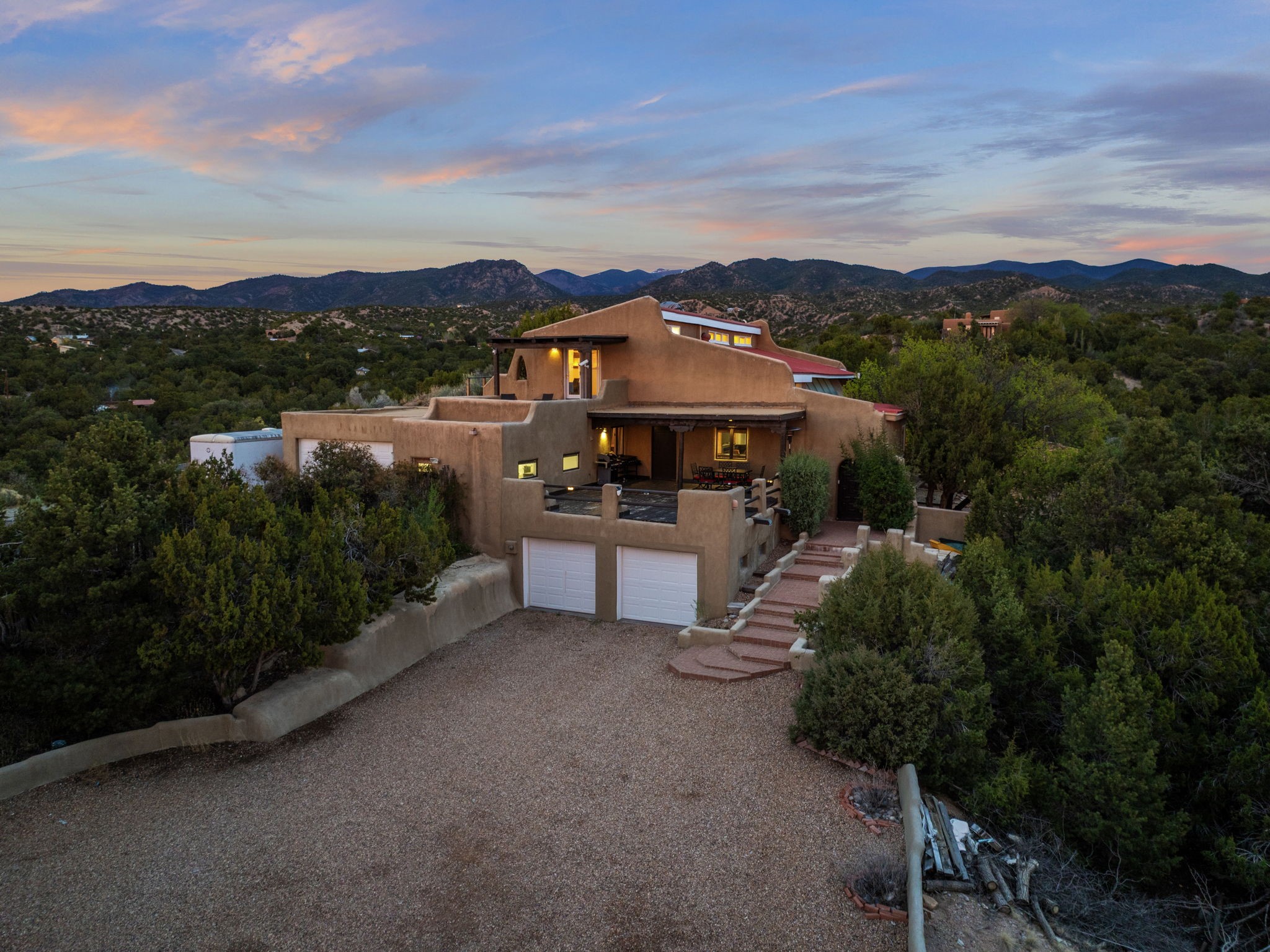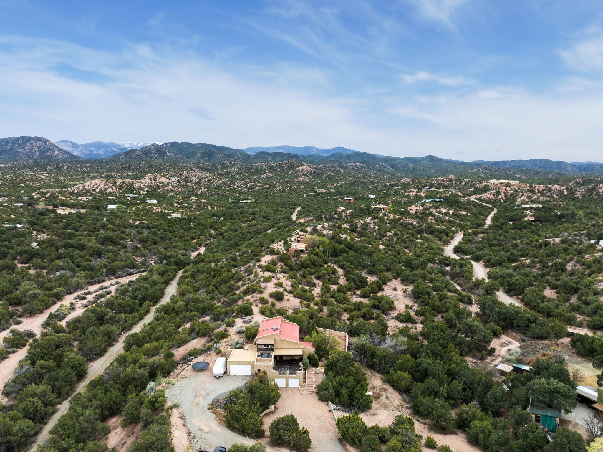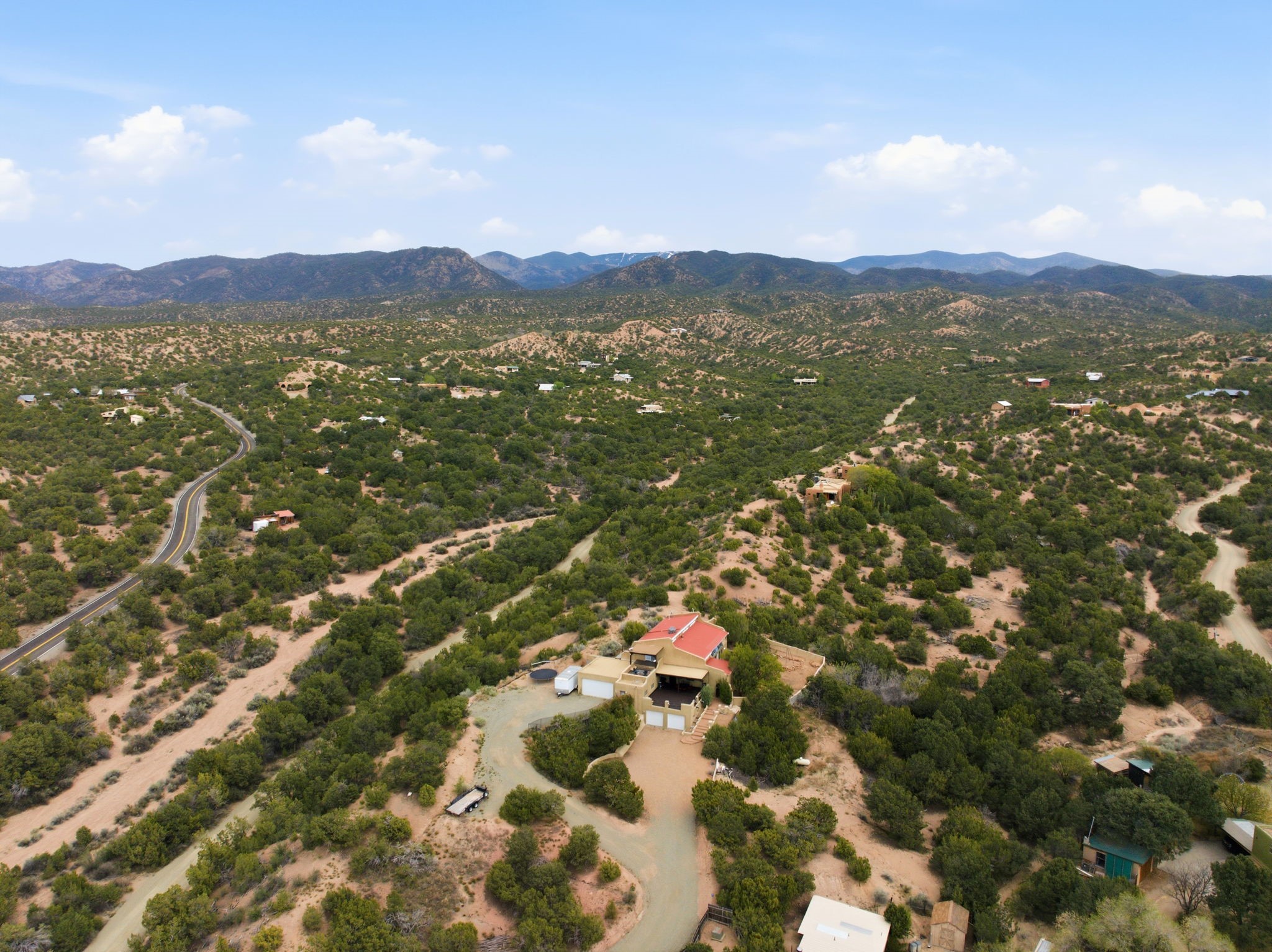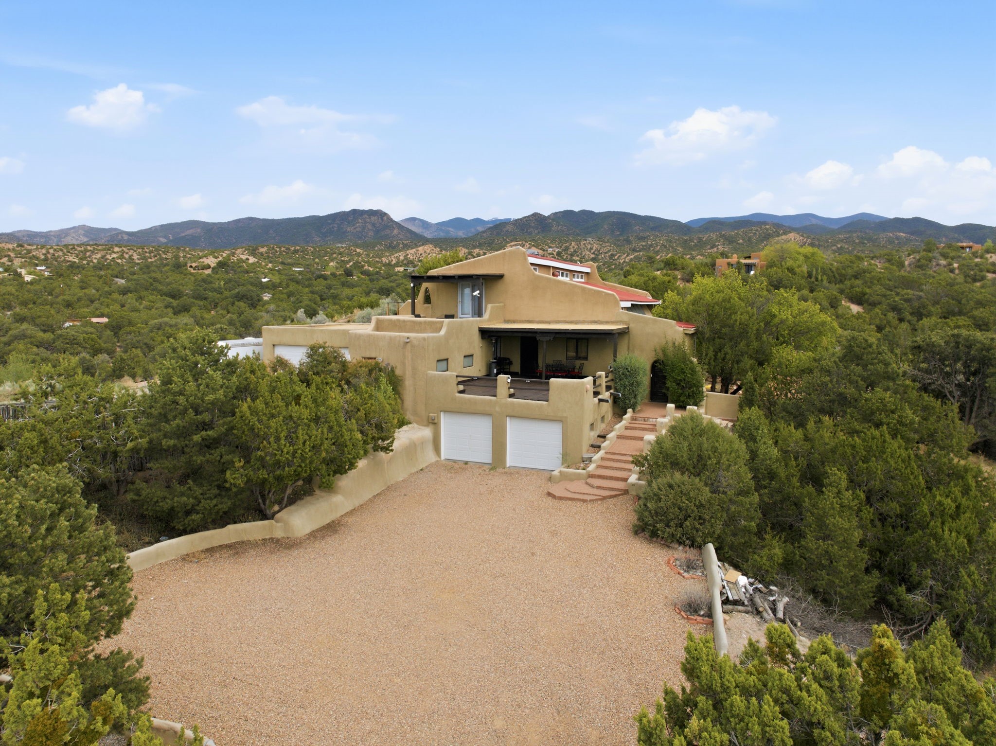 Discover the sanctuary of this picturesque home located in the hills of Tesuque. Offering breathtaking views of the Sangre de Cristo and Jemez mountain ranges, along with the lush Pojoaque Valley. This passive solar estate features, high ceilings and large windows that flood the interior with natural light, while the 3 kiva fireplaces enhance the tranquil ambiance. Set on 2.5 acres, the property includes 3 bedrooms, 3 bathrooms and 2, two-car garages, offering ample space for four vehicles and additional storage. Only 17 minutes to the plaza and 34 minutes to Los Alamos. This home is centrally located for convenience.