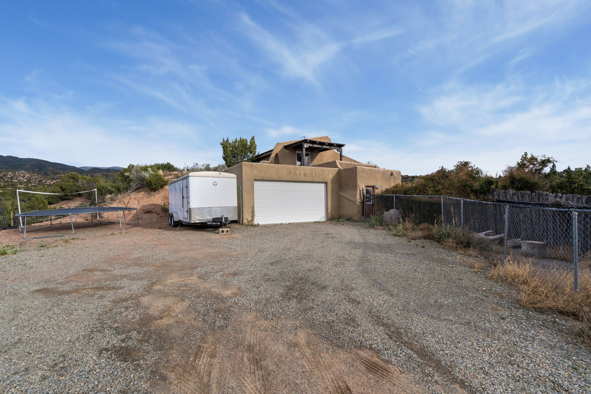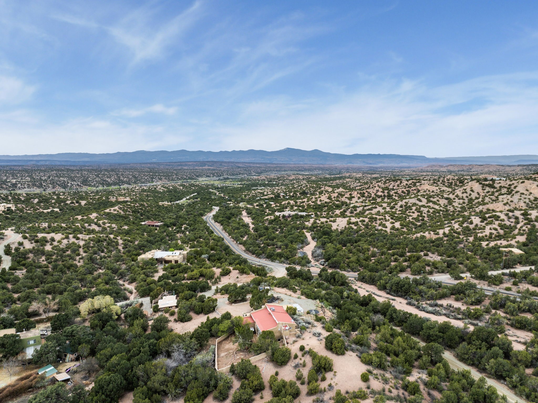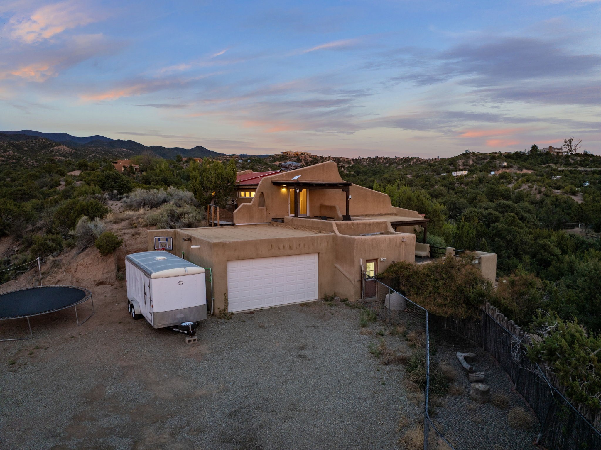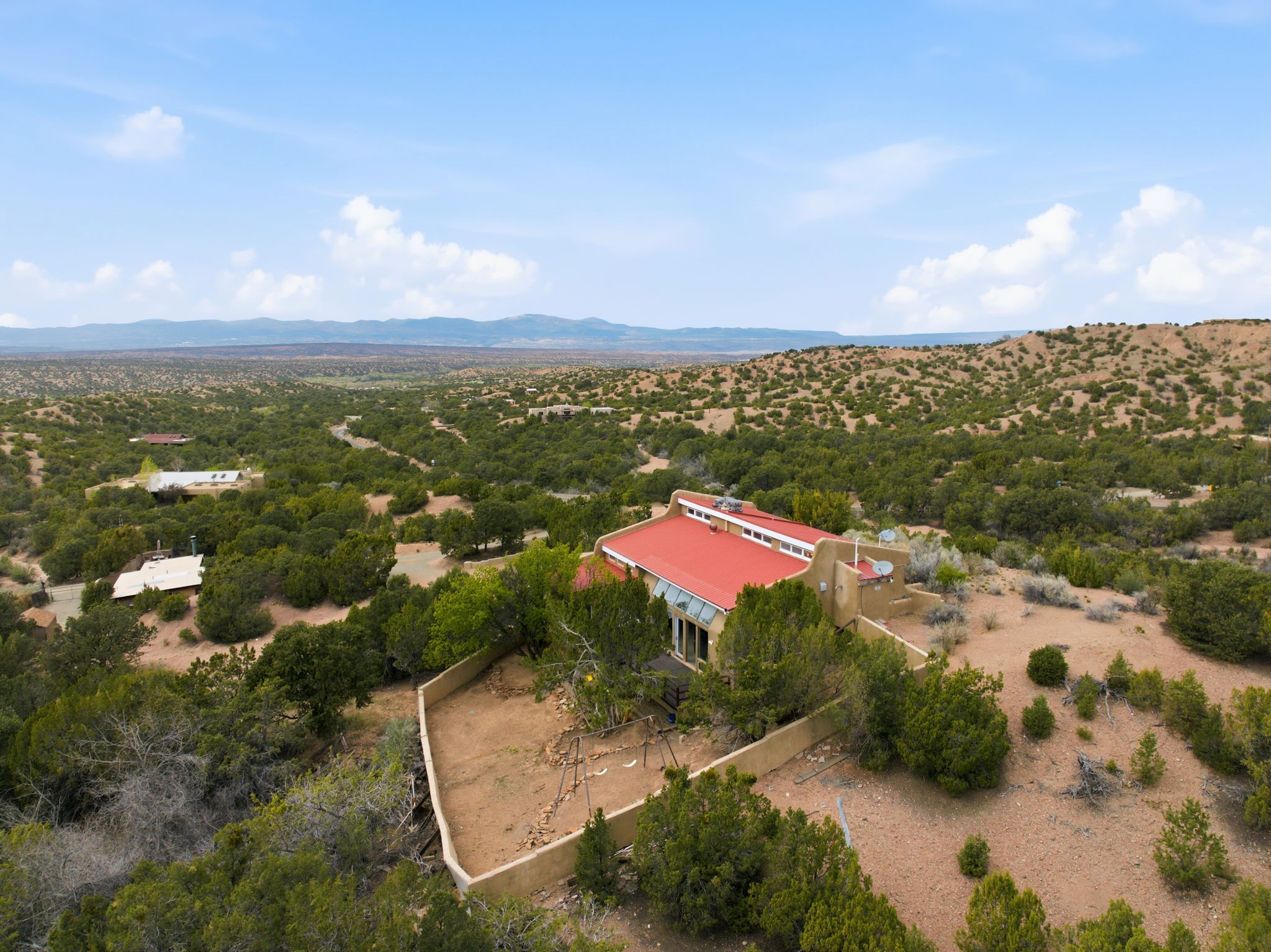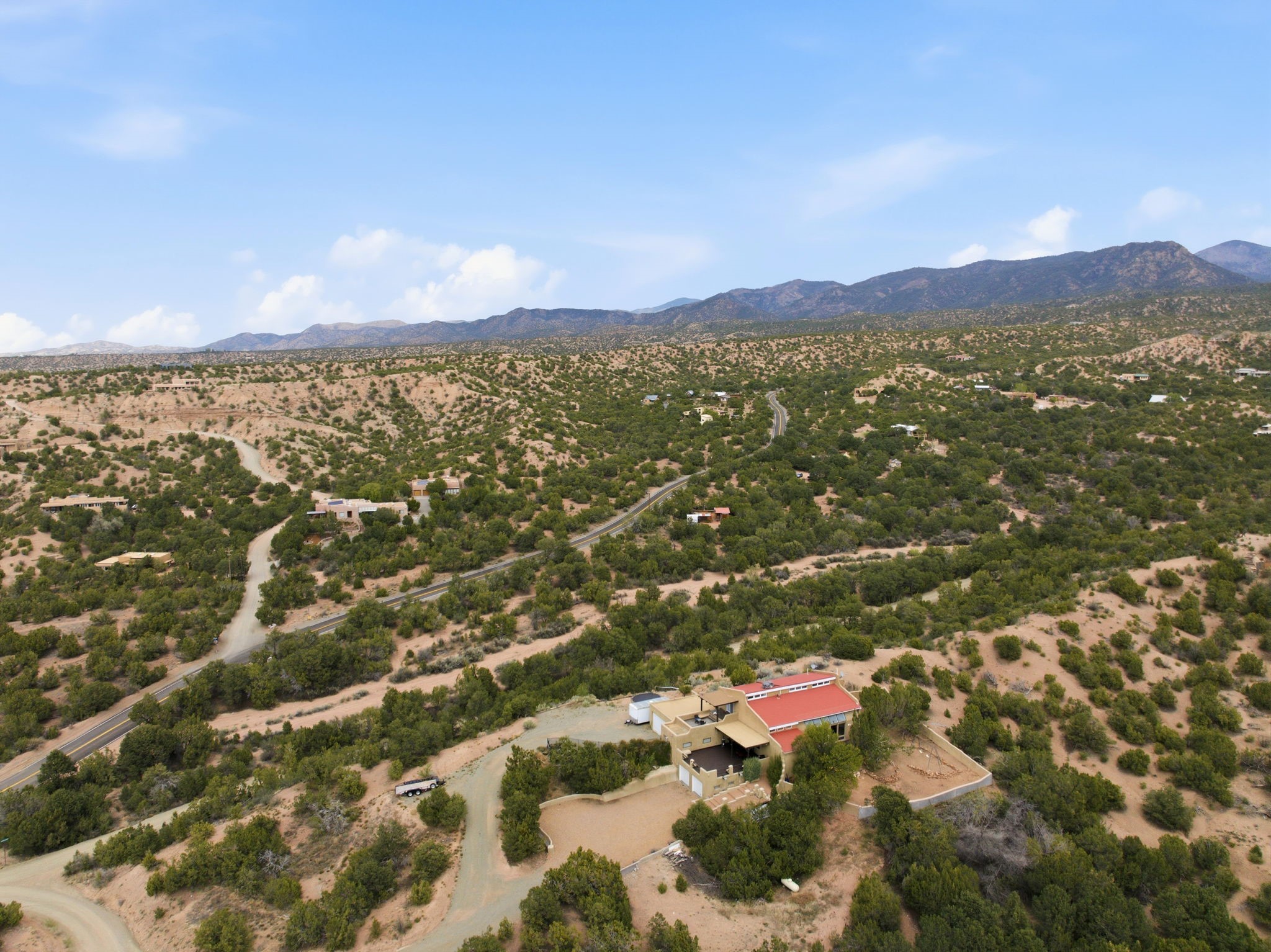 Discover the sanctuary of this picturesque home located in the hills of Tesuque. Offering breathtaking views of the Sangre de Cristo and Jemez mountain ranges, along with the lush Pojoaque Valley. This passive solar estate features, high ceilings and large windows that flood the interior with natural light, while the 3 kiva fireplaces enhance the tranquil ambiance. Set on 2.5 acres, the property includes 3 bedrooms, 3 bathrooms and 2, two-car garages, offering ample space for four vehicles and additional storage. Only 17 minutes to the plaza and 34 minutes to Los Alamos. This home is centrally located for convenience.