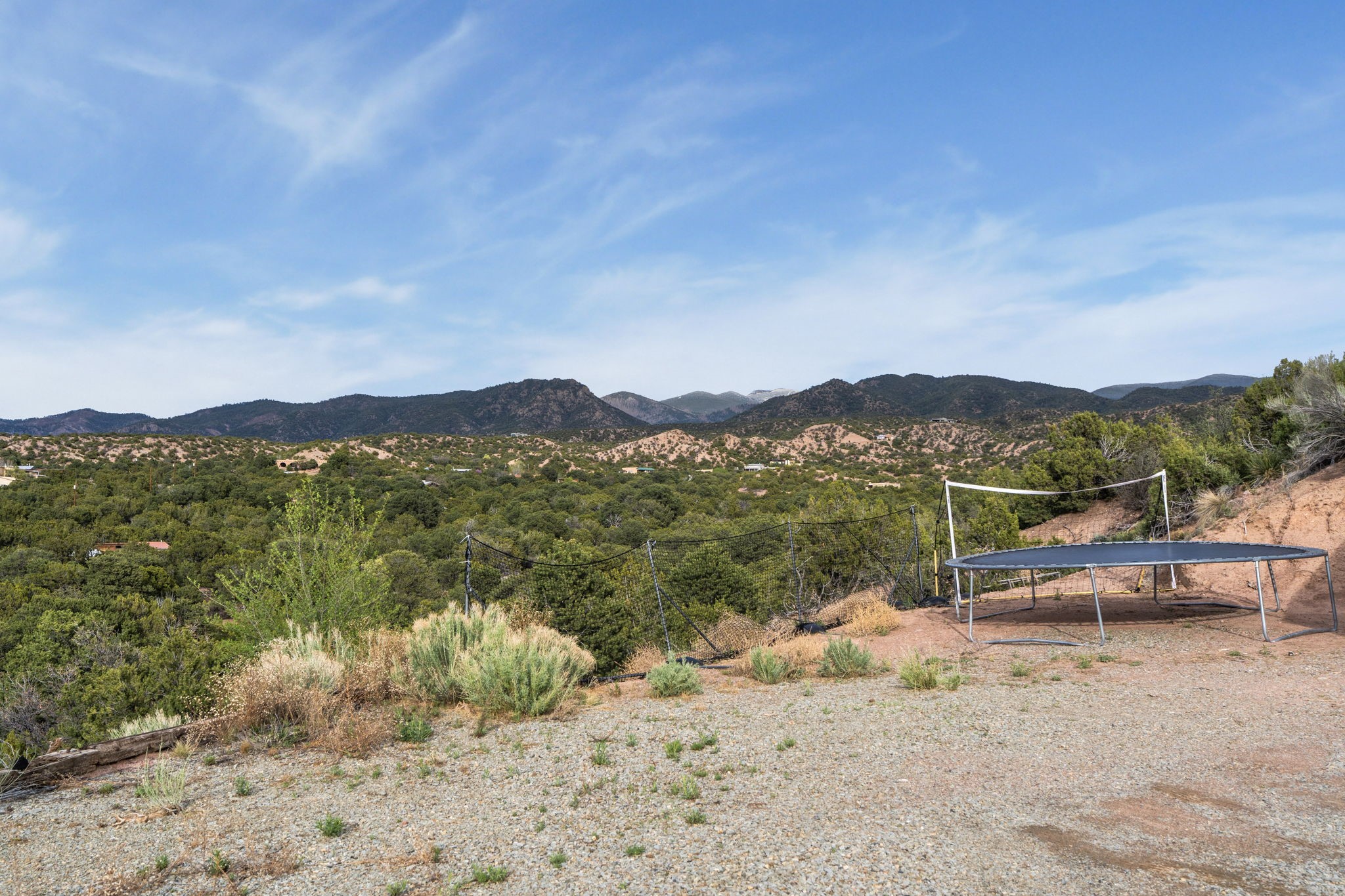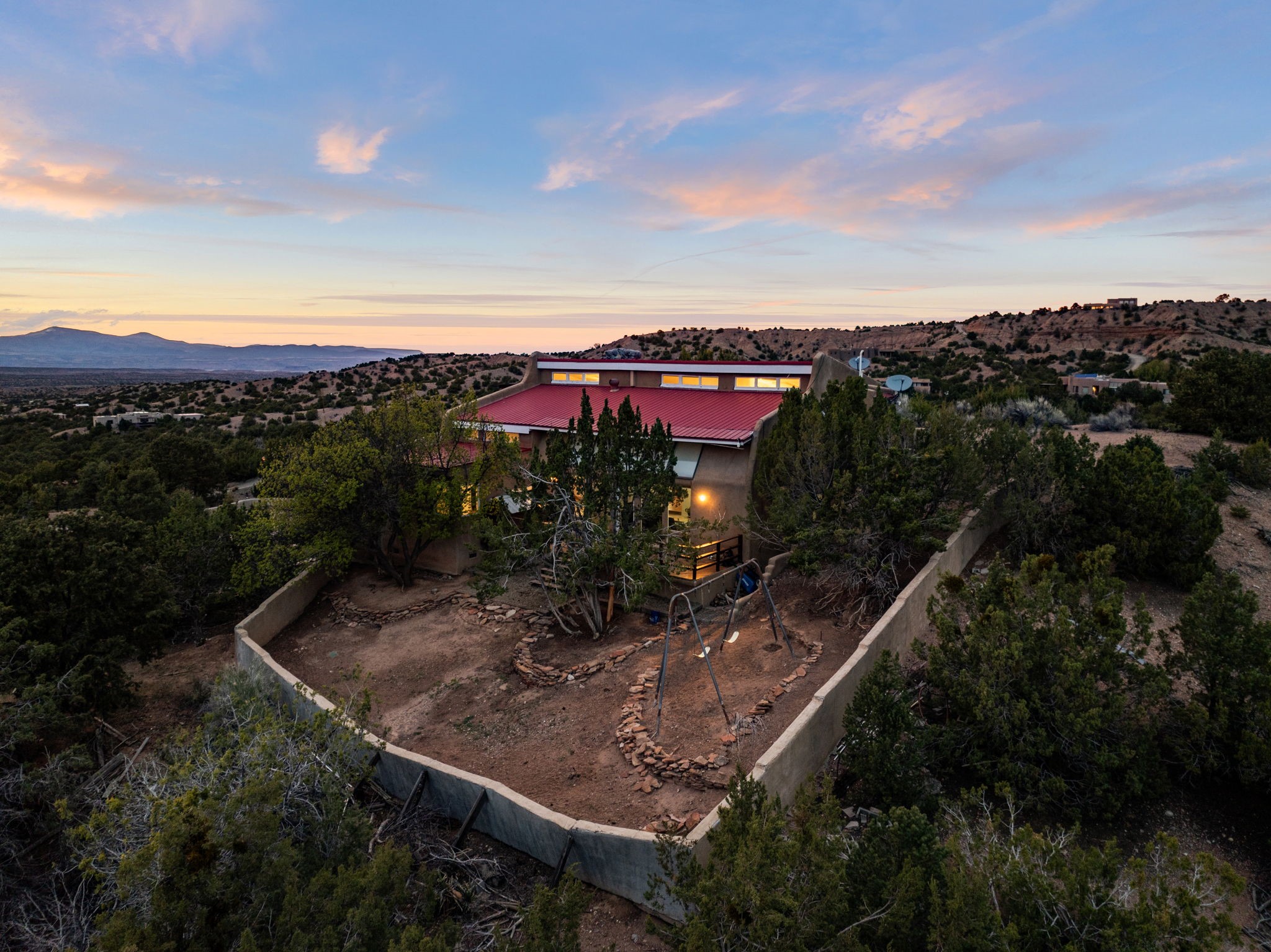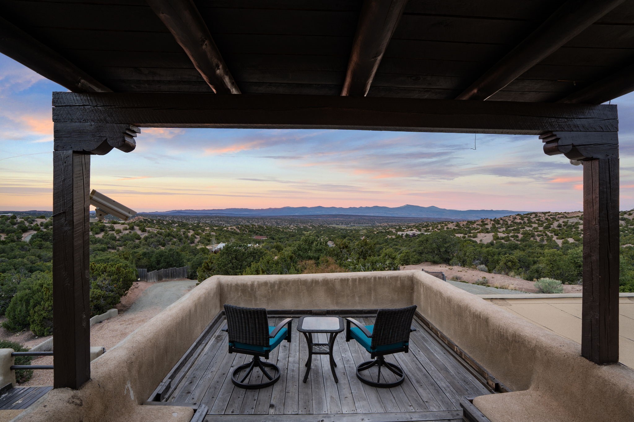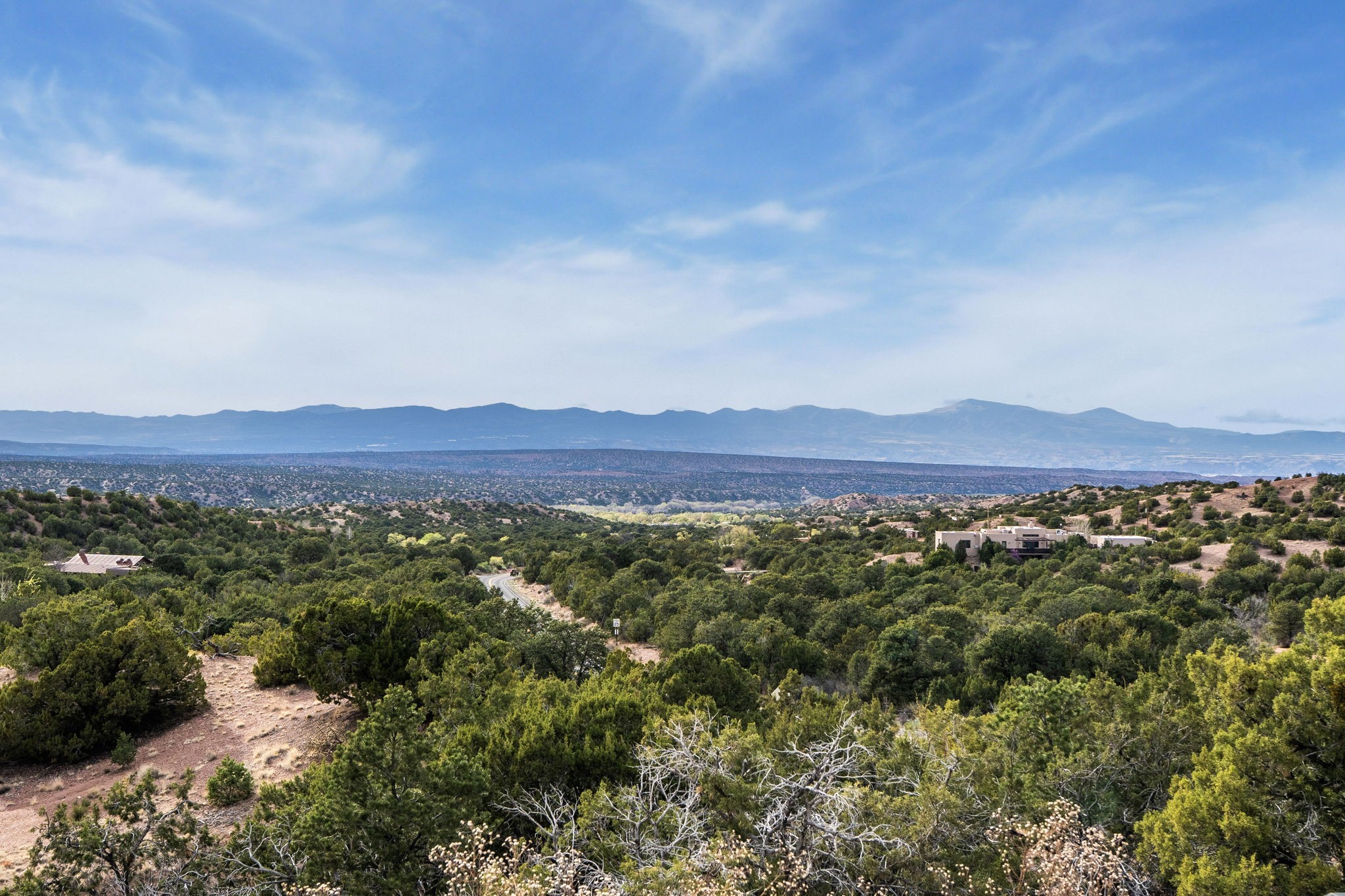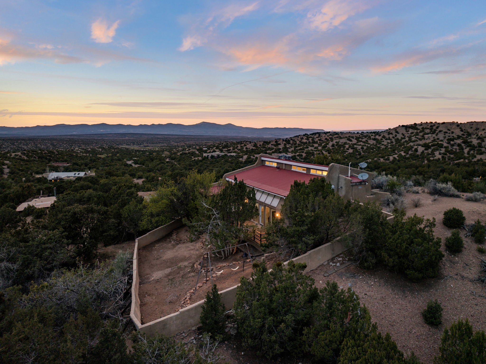Discover the sanctuary of this picturesque home located in the hills of Tesuque. Offering breathtaking views of the Sangre de Cristo and Jemez mountain ranges, along with the lush Pojoaque Valley. This passive solar estate features, high ceilings and large windows that flood the interior with natural light, while the 3 kiva fireplaces enhance the tranquil ambiance. Set on 2.5 acres, the property includes 3 bedrooms, 3 bathrooms and 2, two-car garages, offering ample space for four vehicles and additional storage. Only 17 minutes to the plaza and 34 minutes to Los Alamos. This home is centrally located for convenience.