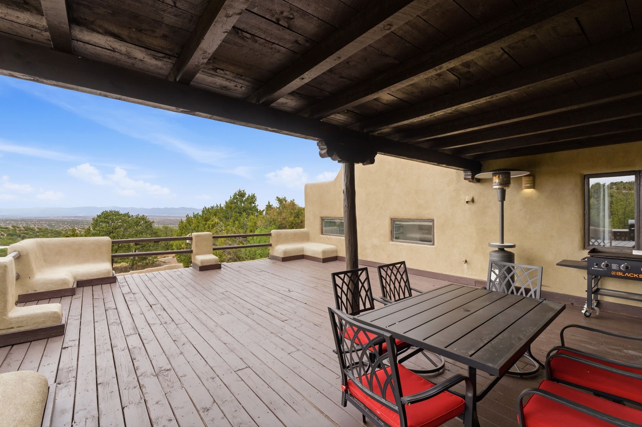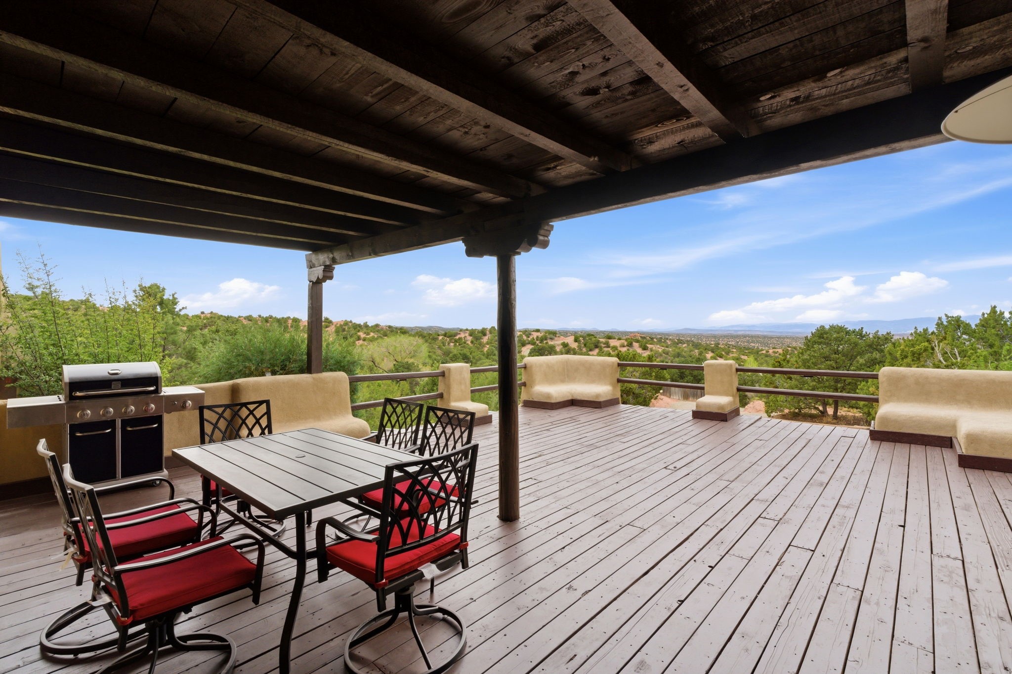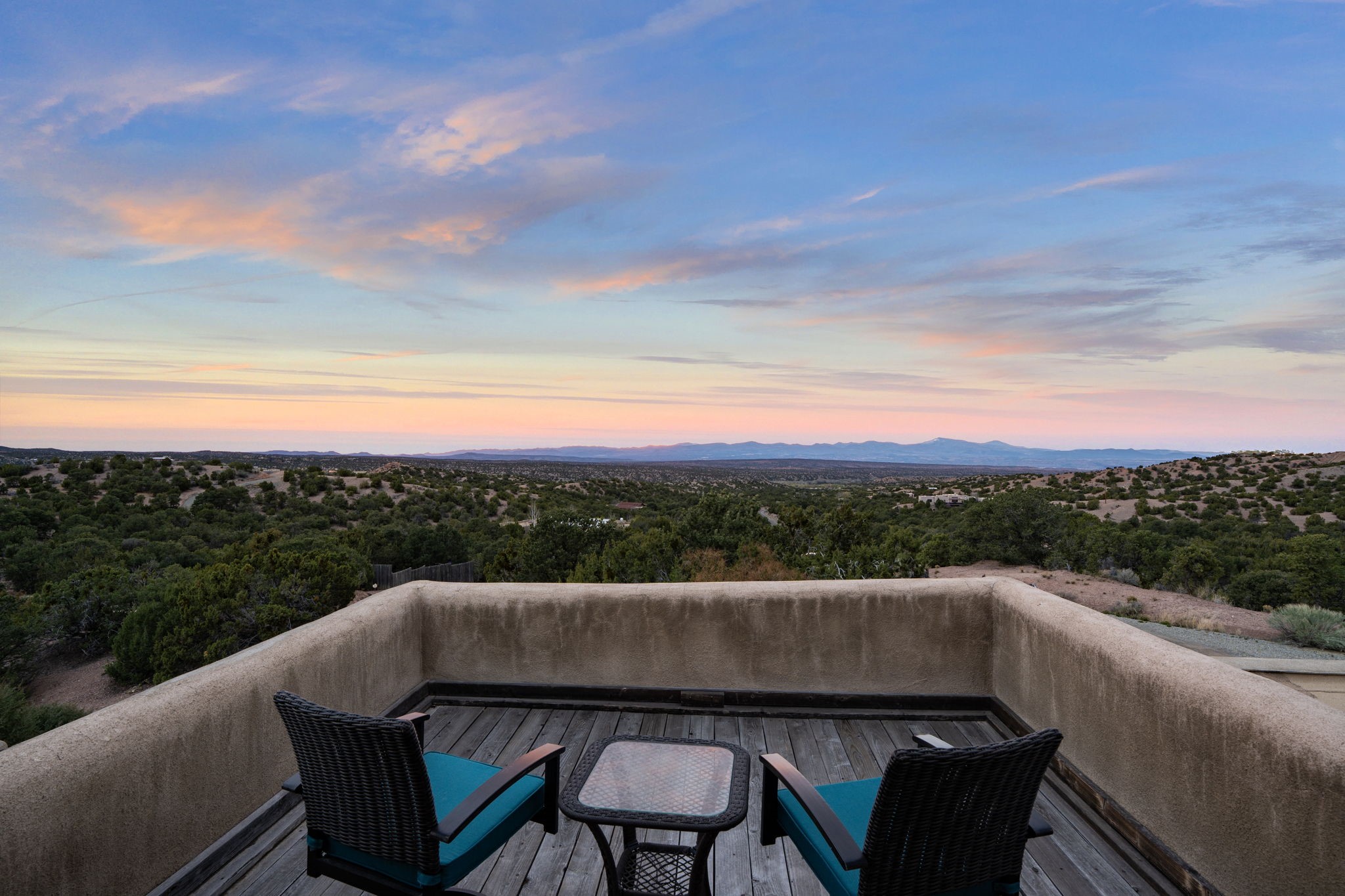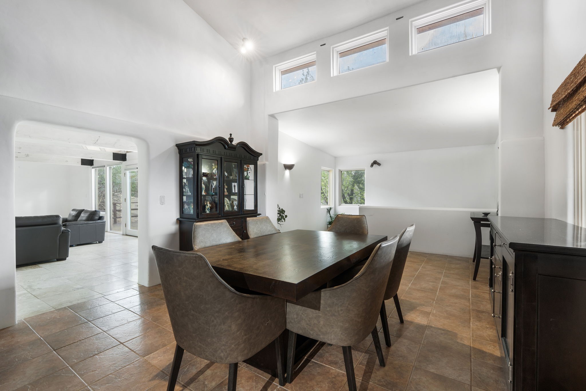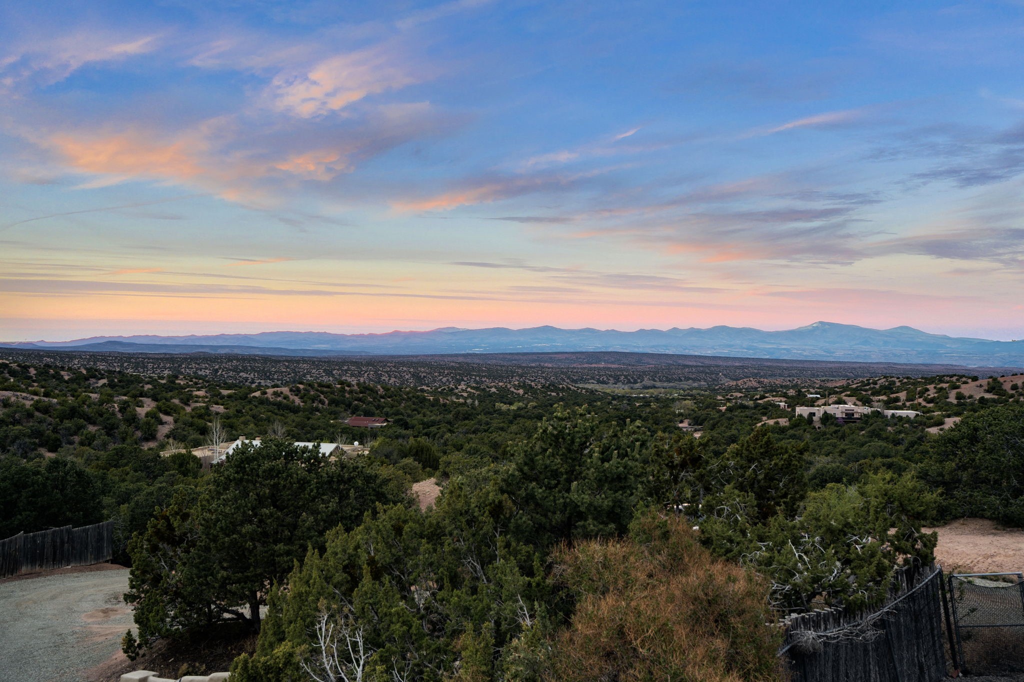 Discover the sanctuary of this picturesque home located in the hills of Tesuque. Offering breathtaking views of the Sangre de Cristo and Jemez mountain ranges, along with the lush Pojoaque Valley. This passive solar estate features, high ceilings and large windows that flood the interior with natural light, while the 3 kiva fireplaces enhance the tranquil ambiance. Set on 2.5 acres, the property includes 3 bedrooms, 3 bathrooms and 2, two-car garages, offering ample space for four vehicles and additional storage. Only 17 minutes to the plaza and 34 minutes to Los Alamos. This home is centrally located for convenience.