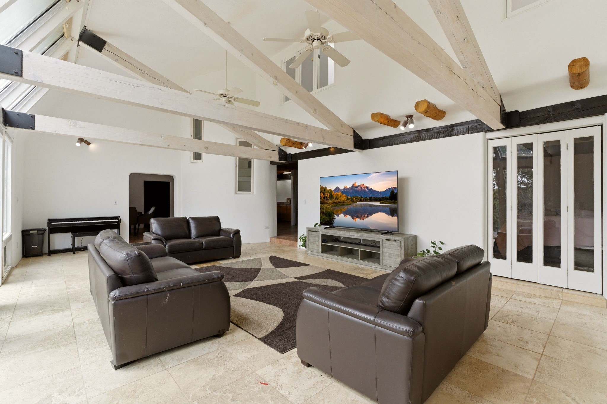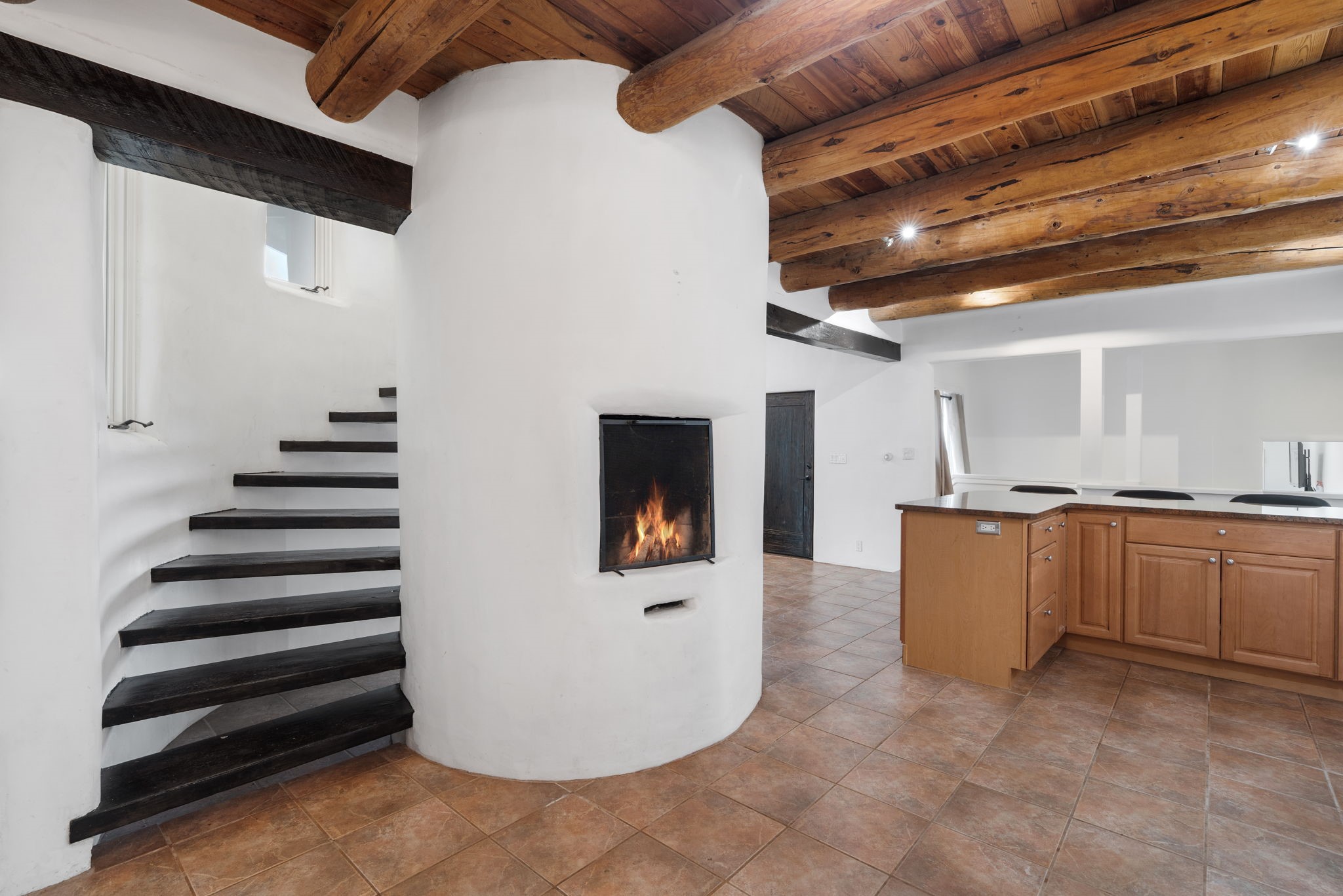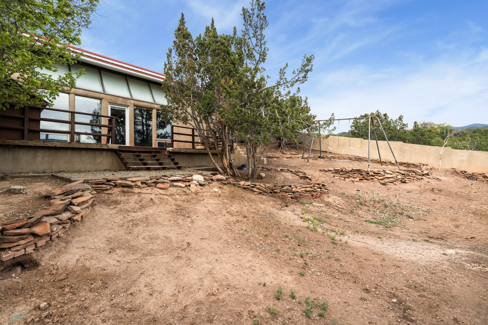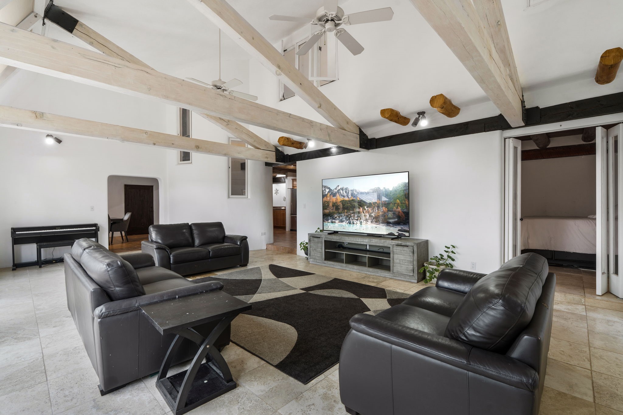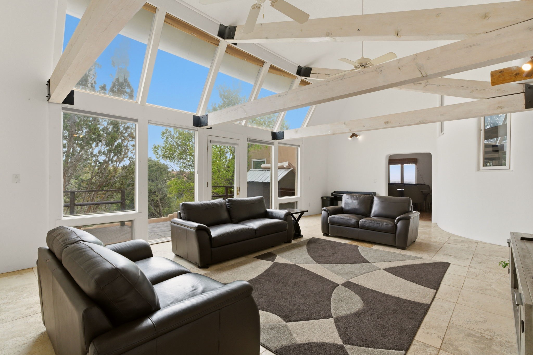 Discover the sanctuary of this picturesque home located in the hills of Tesuque. Offering breathtaking views of the Sangre de Cristo and Jemez mountain ranges, along with the lush Pojoaque Valley. This passive solar estate features, high ceilings and large windows that flood the interior with natural light, while the 3 kiva fireplaces enhance the tranquil ambiance. Set on 2.5 acres, the property includes 3 bedrooms, 3 bathrooms and 2, two-car garages, offering ample space for four vehicles and additional storage. Only 17 minutes to the plaza and 34 minutes to Los Alamos. This home is centrally located for convenience.