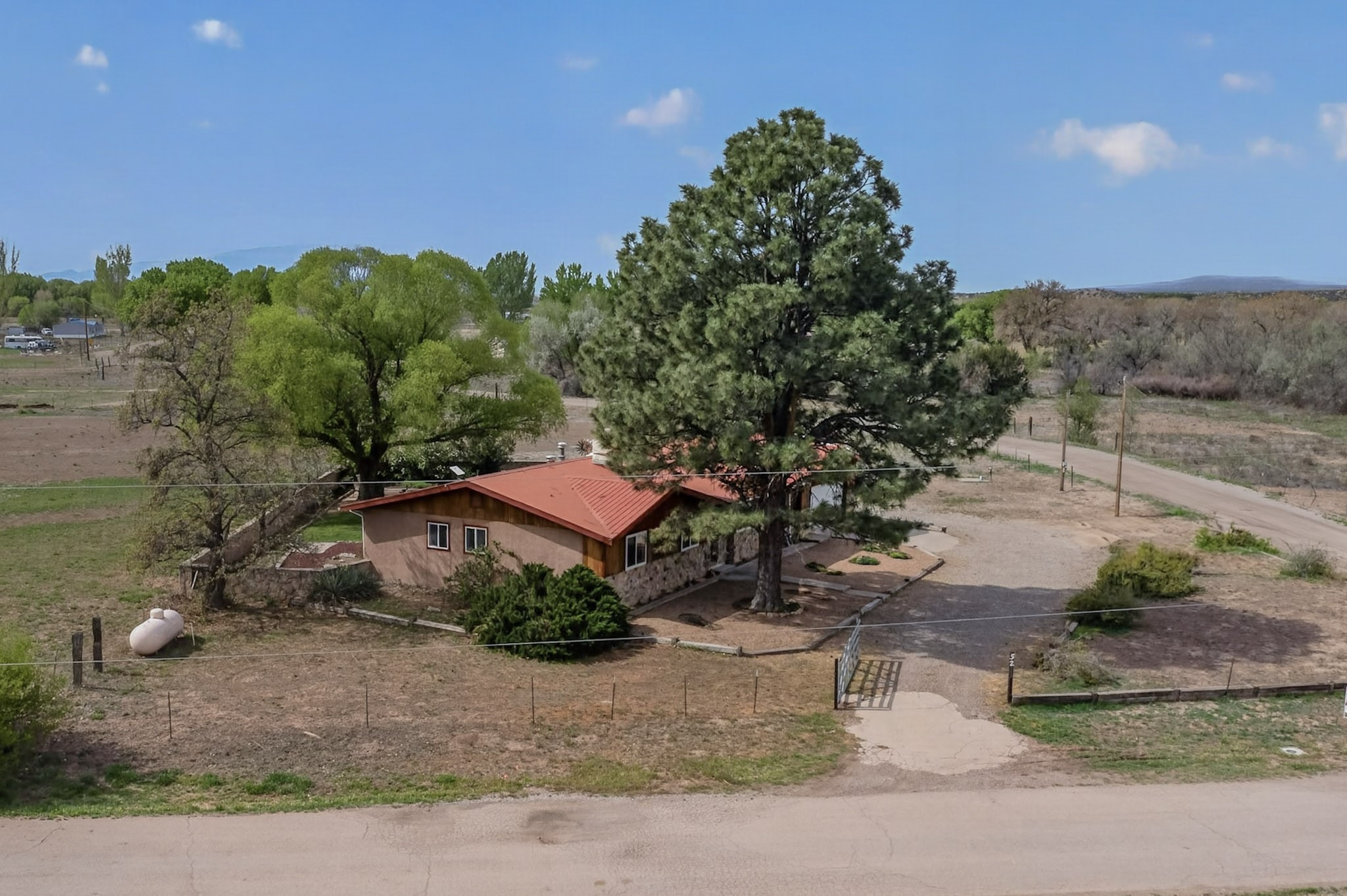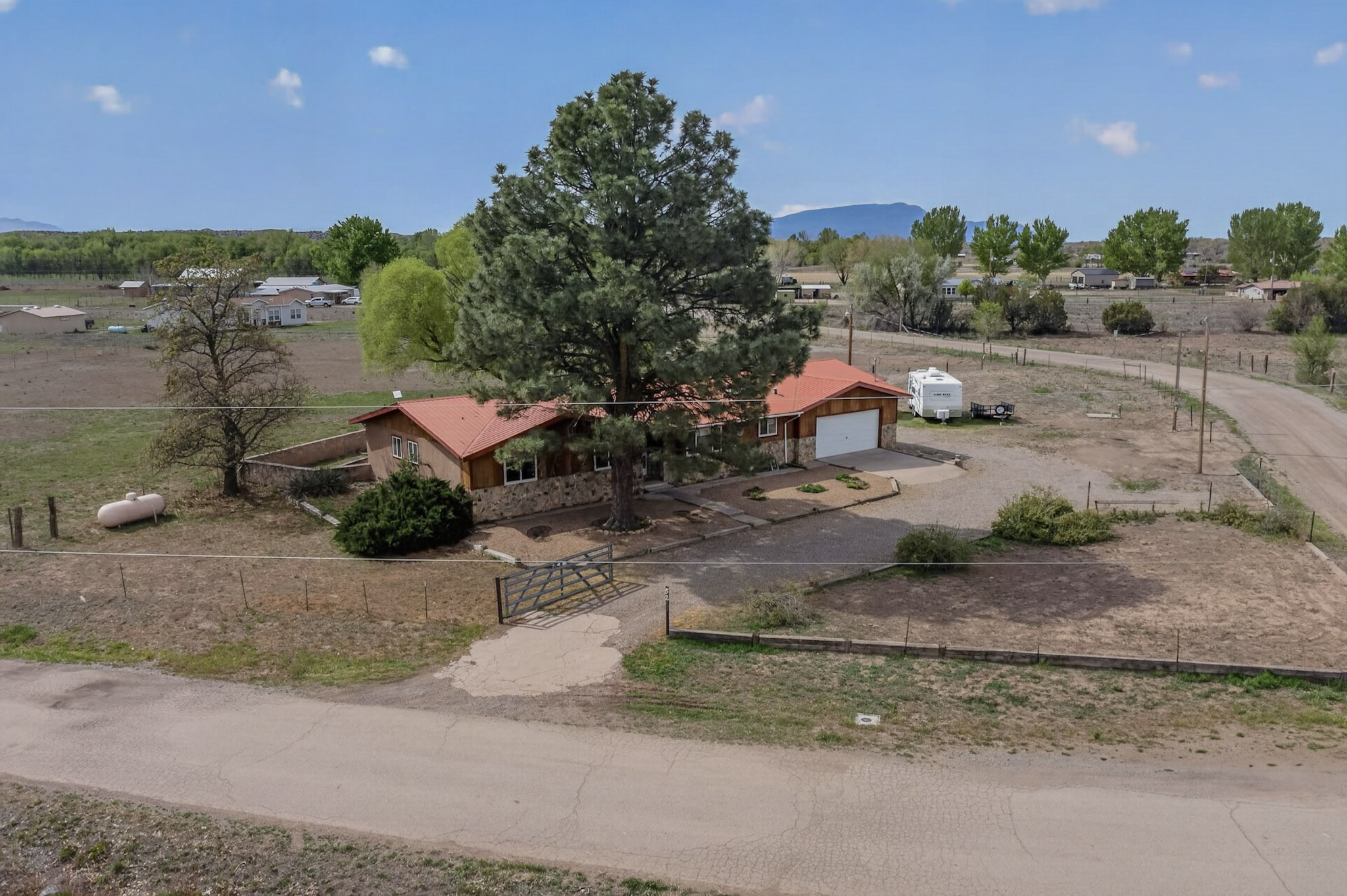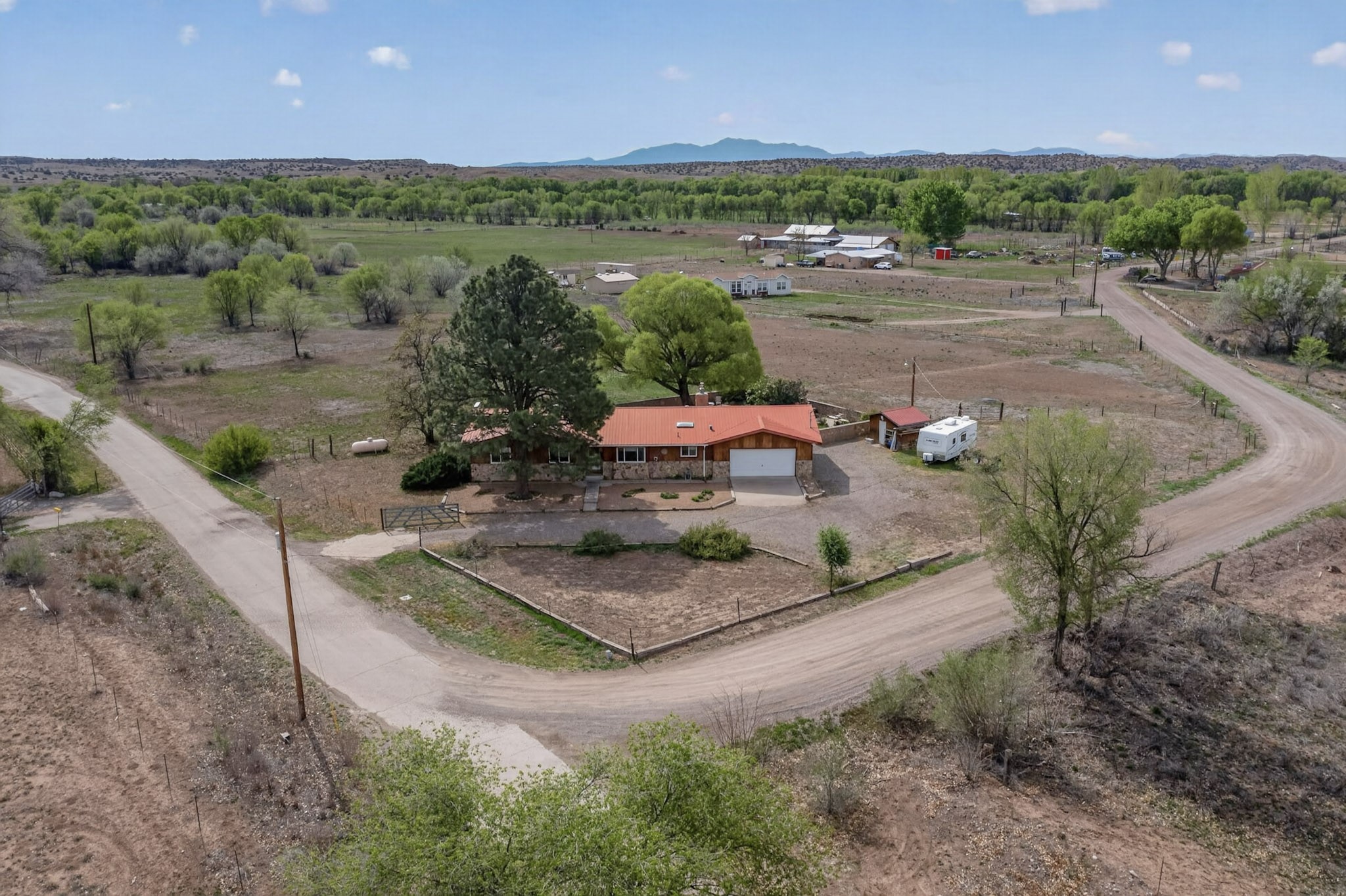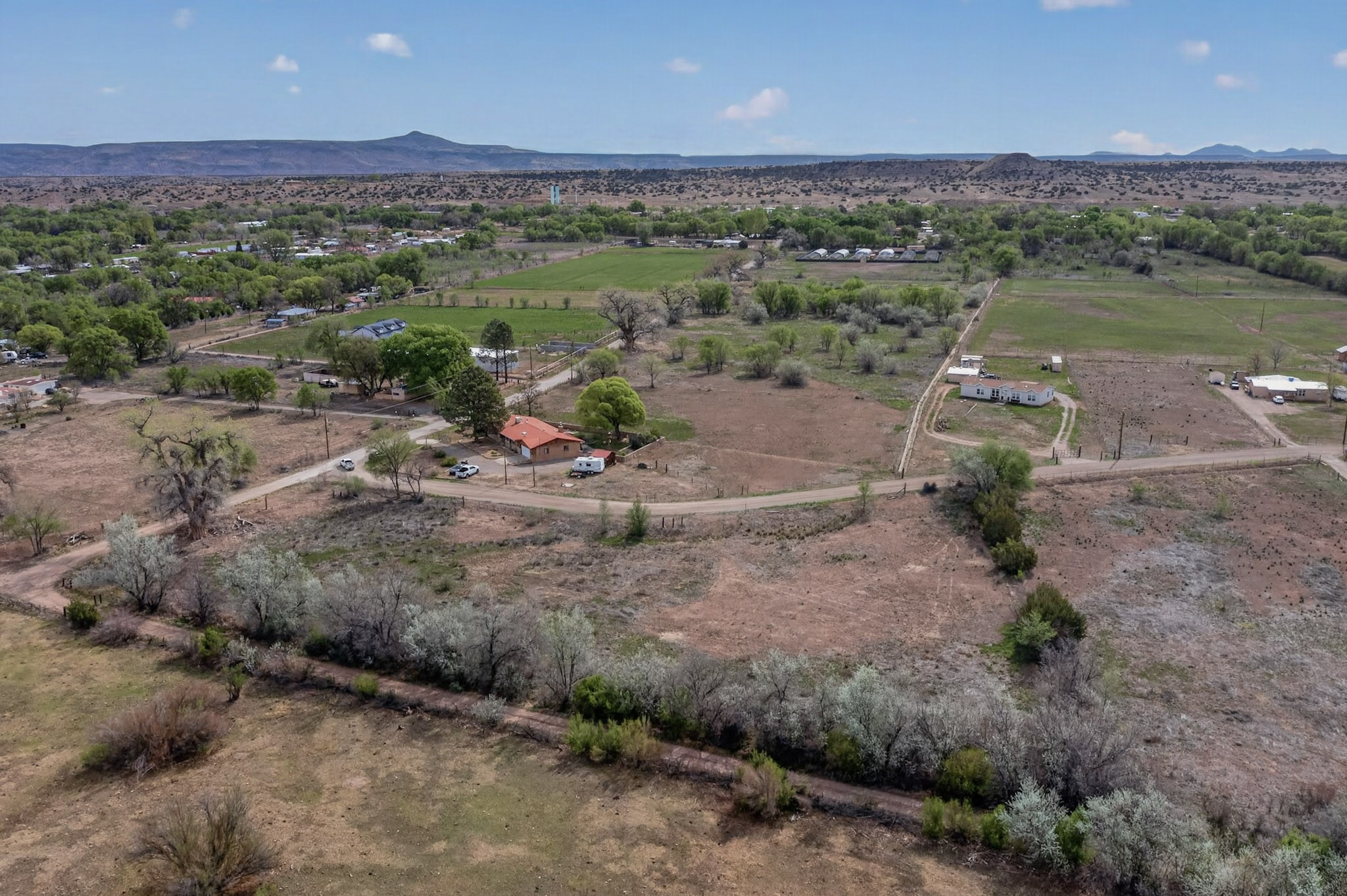 Don't miss this incredible opportunity to own a spacious move in ready home, featuring pre-1907 water rights, conveyed with the property! (.96 acre w/2.868 diversion) Situated on 2 parcels for a total of 2.3 acres, this charming residence offers updated gorgeous wood laminate flooring in the main living areas and beautifully updated baths. The resurfaced kitchen cabinets add a fresh touch, while the fully landscaped back courtyard provides an inviting space to relax or entertain. Enjoy large bedrooms and a generous backyard patio with durable epoxy coating, perfect for outdoor gatherings. The oversized 2-car garage offers ample storage. Beautiful views, and walking distance to the Bosque! This property blends comfort, functionality, and timeless value - Just 15 quick minutes to the interstate! Great location if working in Santa Fe OR ABQ!