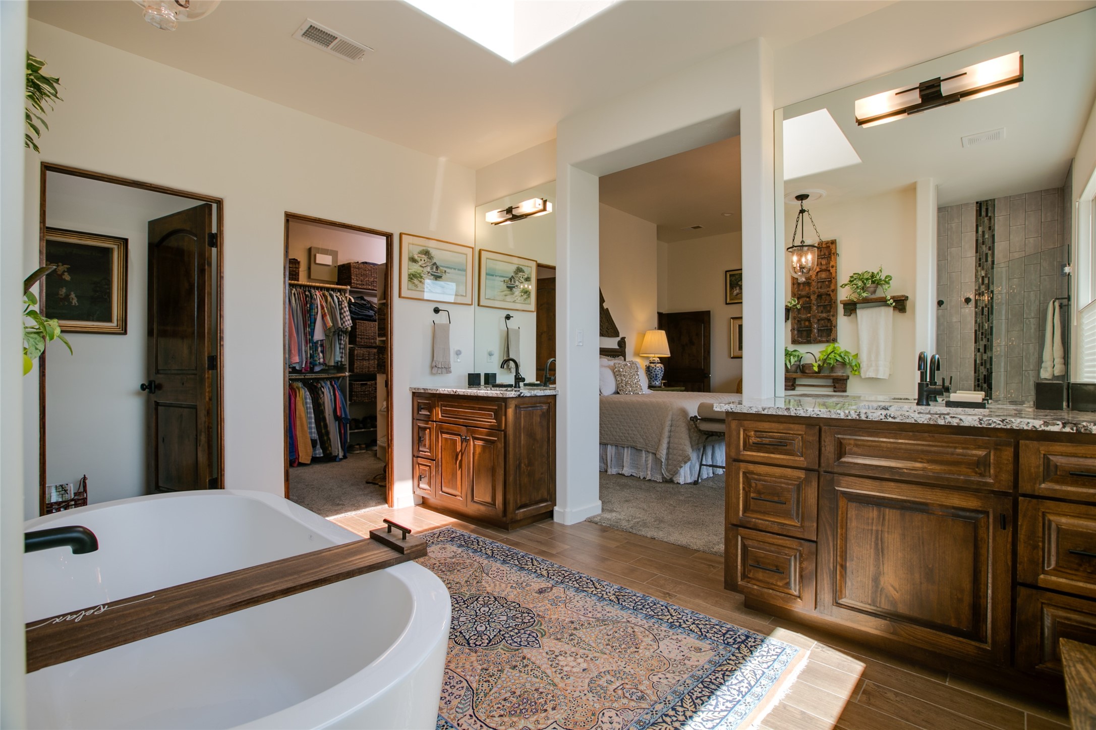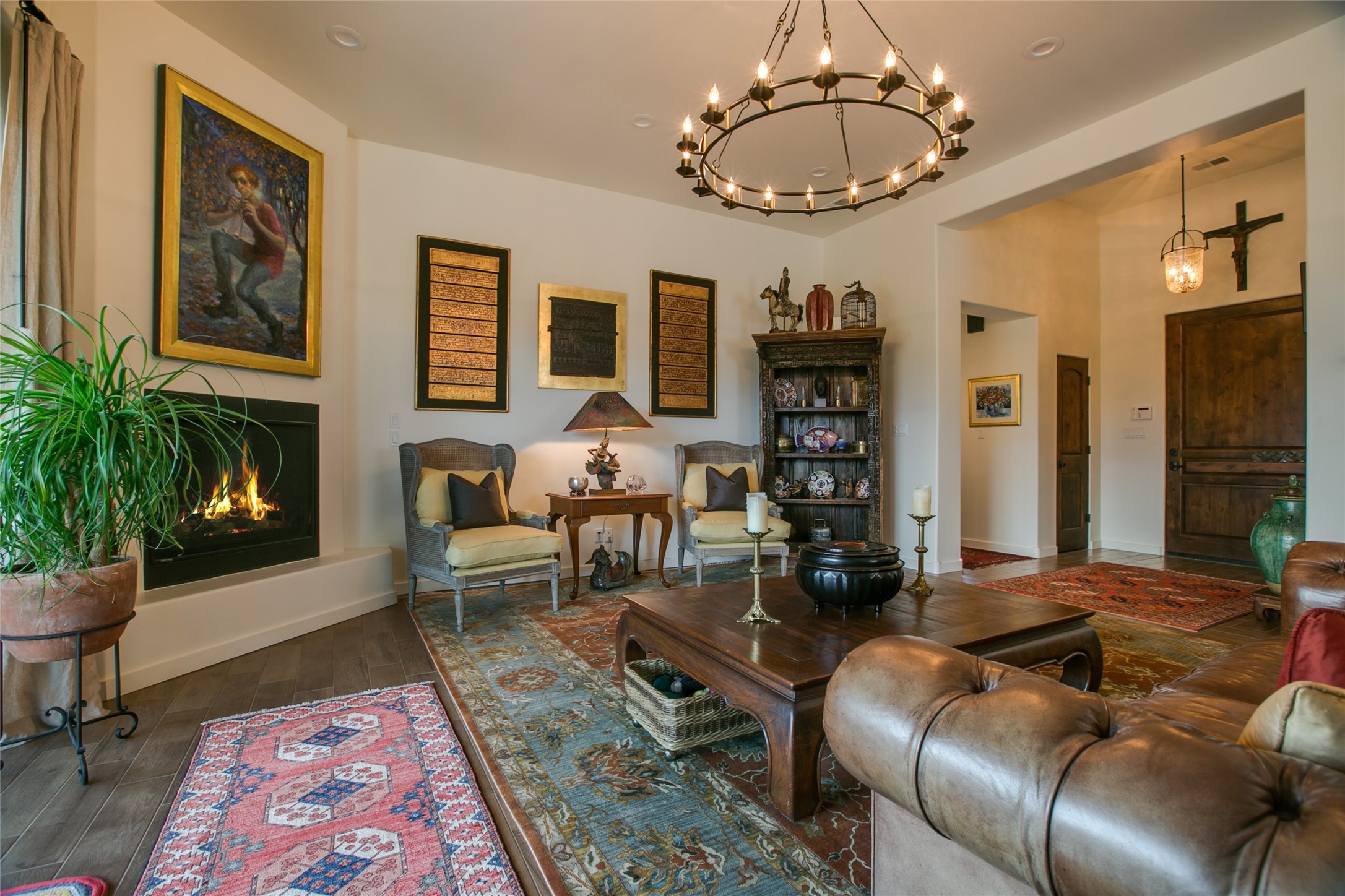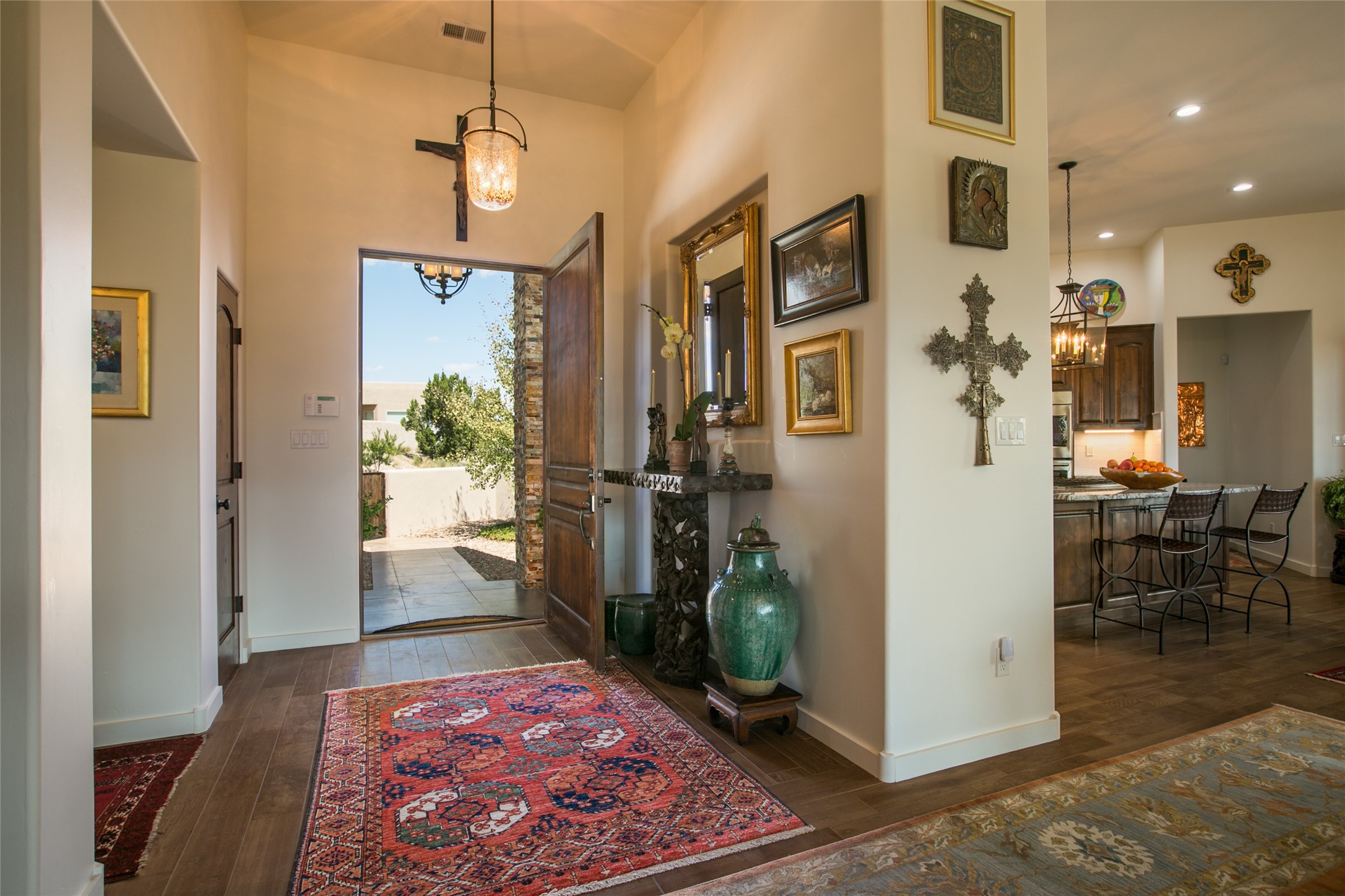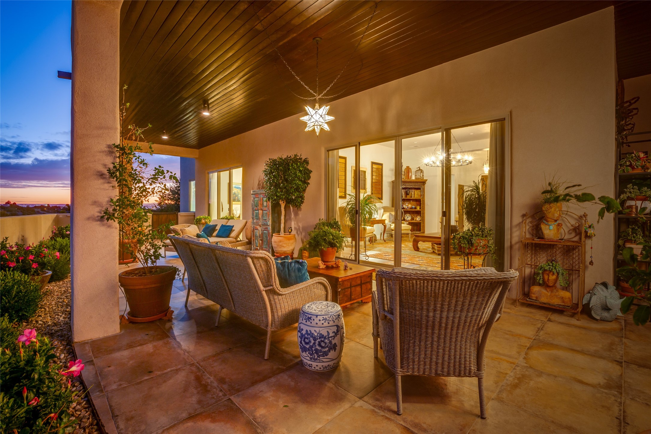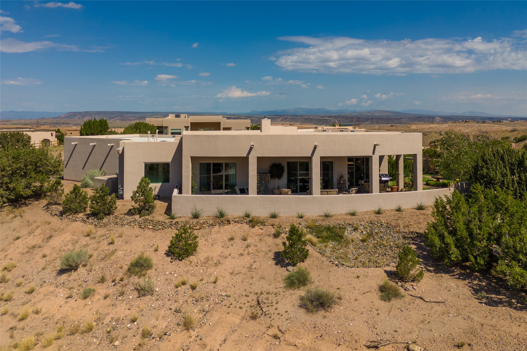 One-level Placitas home built in 2020, perfect for downsizing without sacrificing quality. The bright kitchen features high-end appliances, double ovens, a copper sink, a large pantry, and marble backsplashes. The great room and dining room overlook the Sandia Mountains and open onto an east-facing wraparound patio ideal for outdoor enjoyment. The large primary suite also has mountain views and a door to the covered patio; its spa-like bath includes double sinks, a luxurious tub, and a walk-in shower. Two additional bedrooms on the opposite side of the house share a full bath. Gorgeous outdoor spaces, easy-care landscaping, and an immaculate three-car finished garage with epoxy floors and storage complete this perfect Placitas perch.