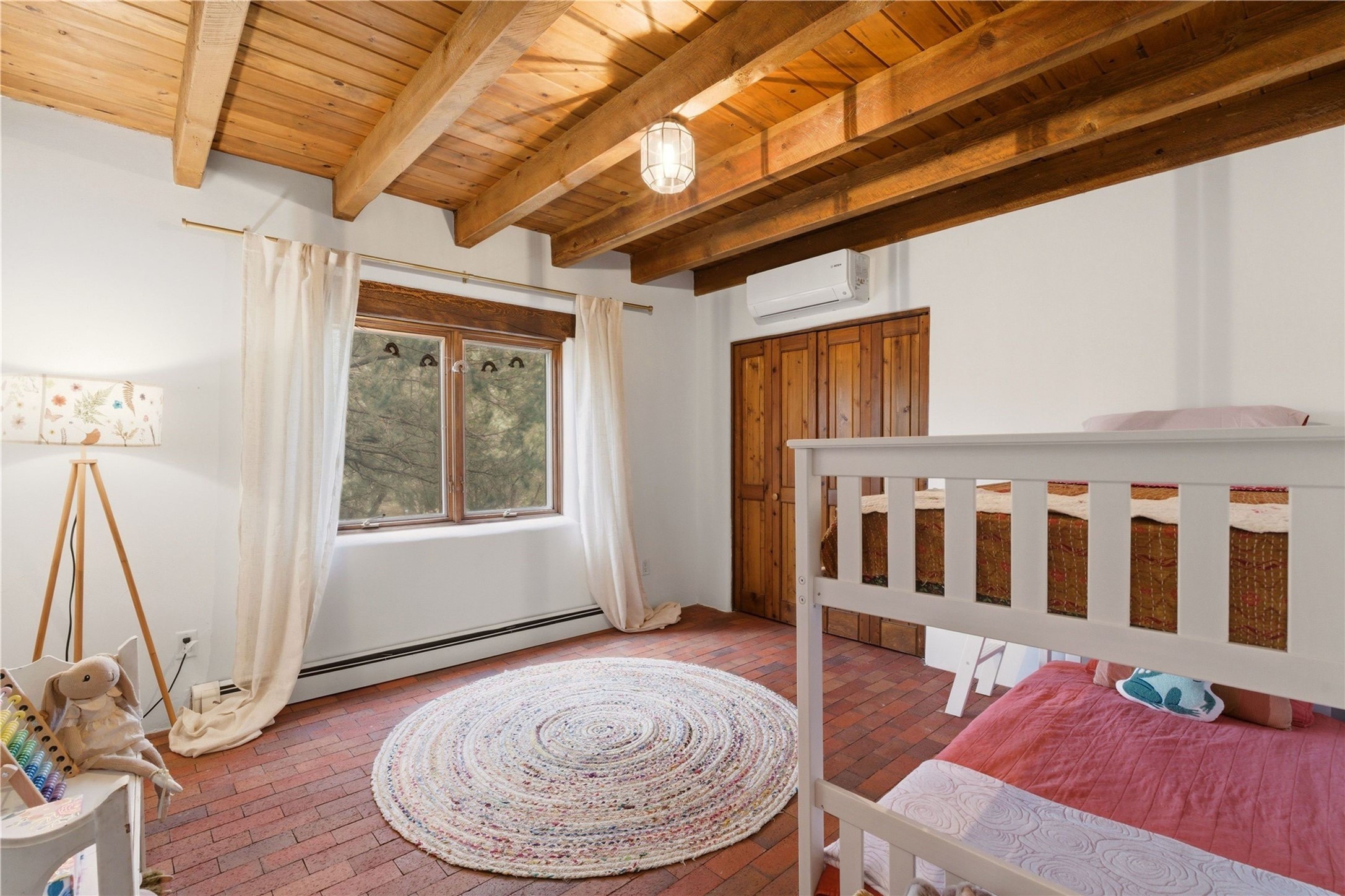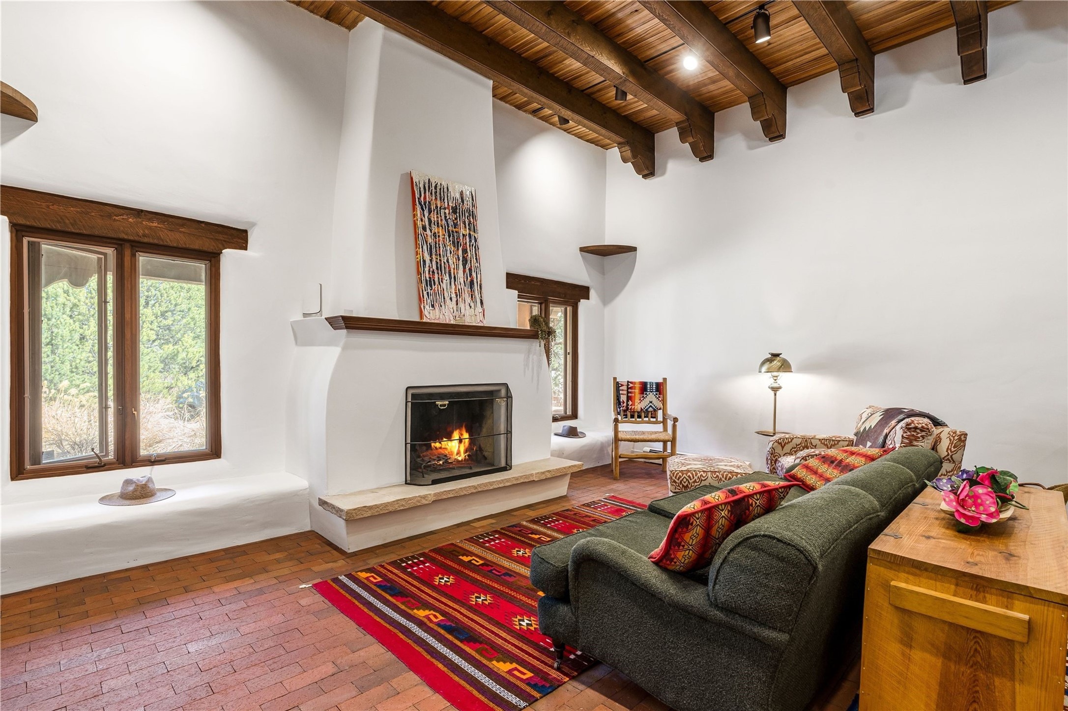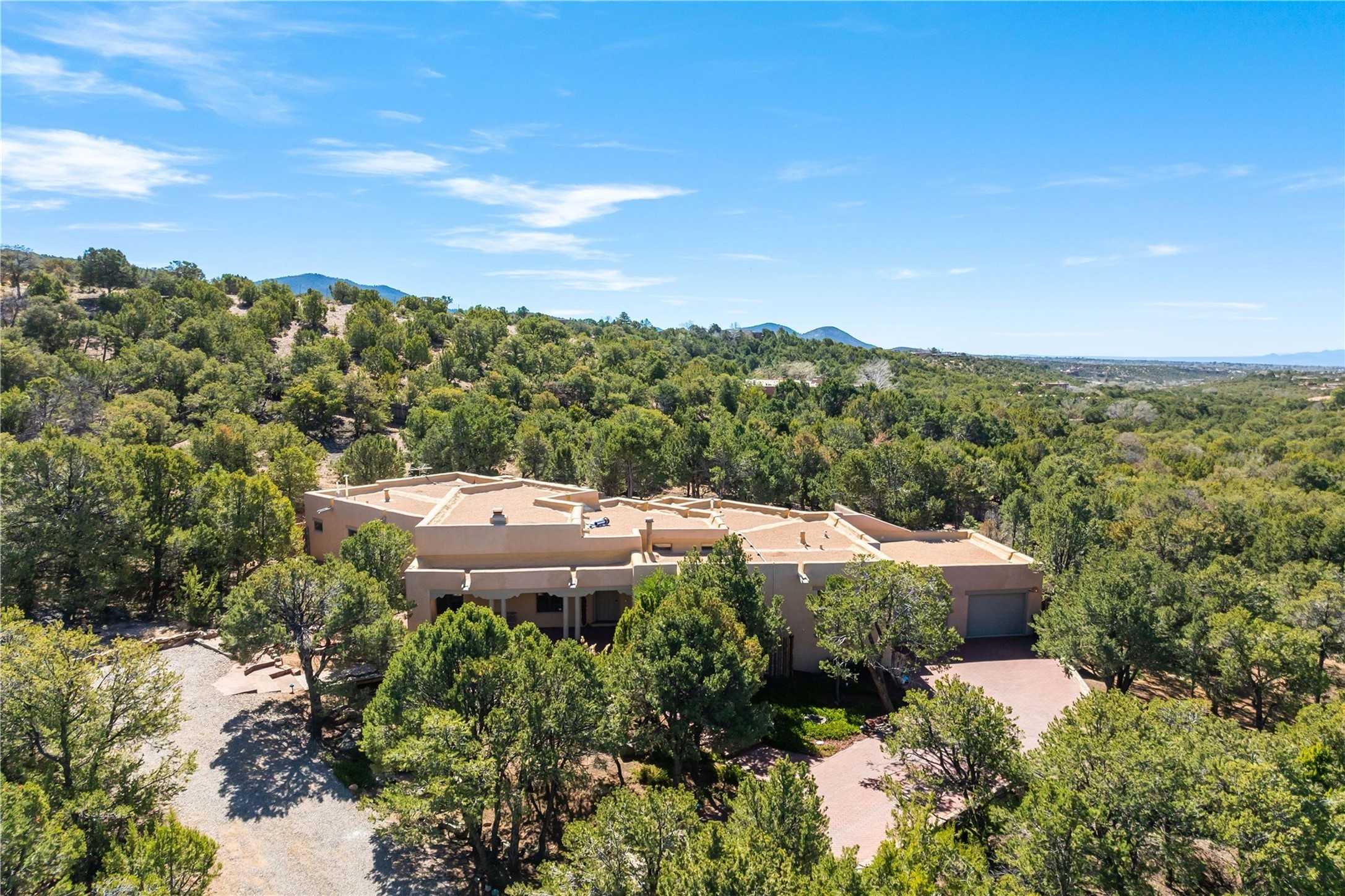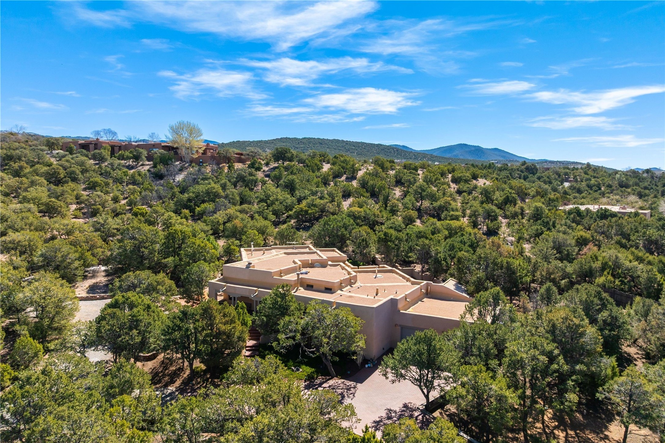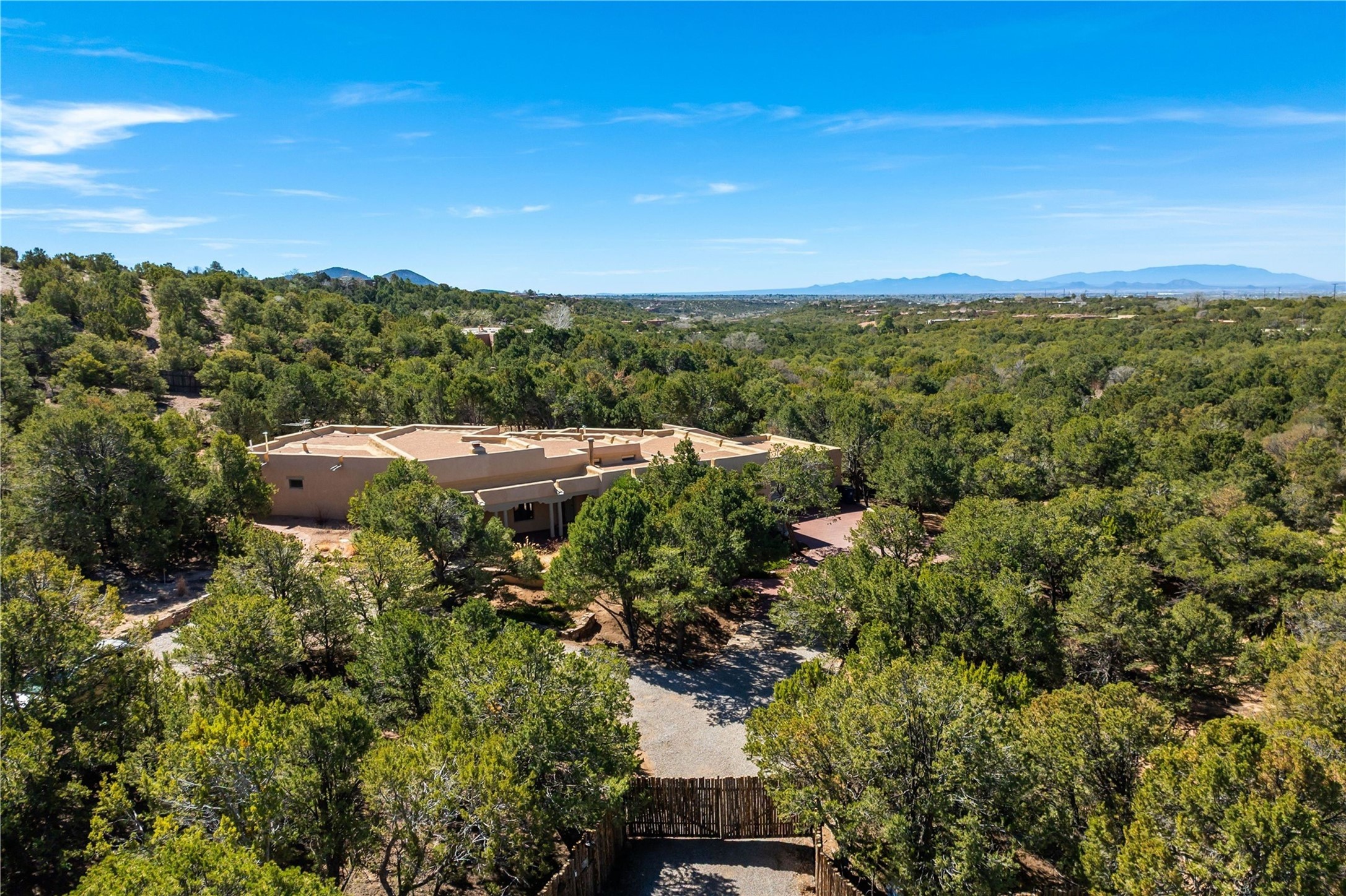 Updated Bishops Lodge Road 3-bedroom 2.5-bath home situated off the road on 1.18 wooded acres with mountain views and only 10 minutes from the vibrant Santa Fe Plaza. Recent improvements include new kitchen cabinets and appliances, new master and secondary bathrooms, new floors throughout the house, new mini splits, new front fence and driveway gates and more. Home includes 2 living areas, one with fireplace. Delightful contemporary sage kitchen is appointed with large center island, elegant nicho, light wood beams, farmhouse sink and new, high-end stainless-steel appliances. Separation of primary bedroom from two guest bedrooms for maximum privacy. In addition, there is a versatile, 1,038 sq. ft. lower-level floor which provides flex space for a recreational room plus home office and studio. 2-car attached garage. Enjoy living in a coveted Santa Fe location that is private yet at the same time close to all the cultural, culinary and recreational amenities of the area.