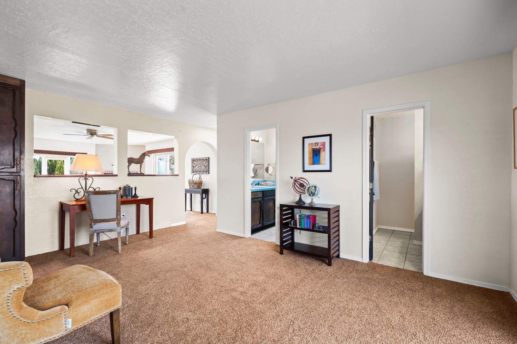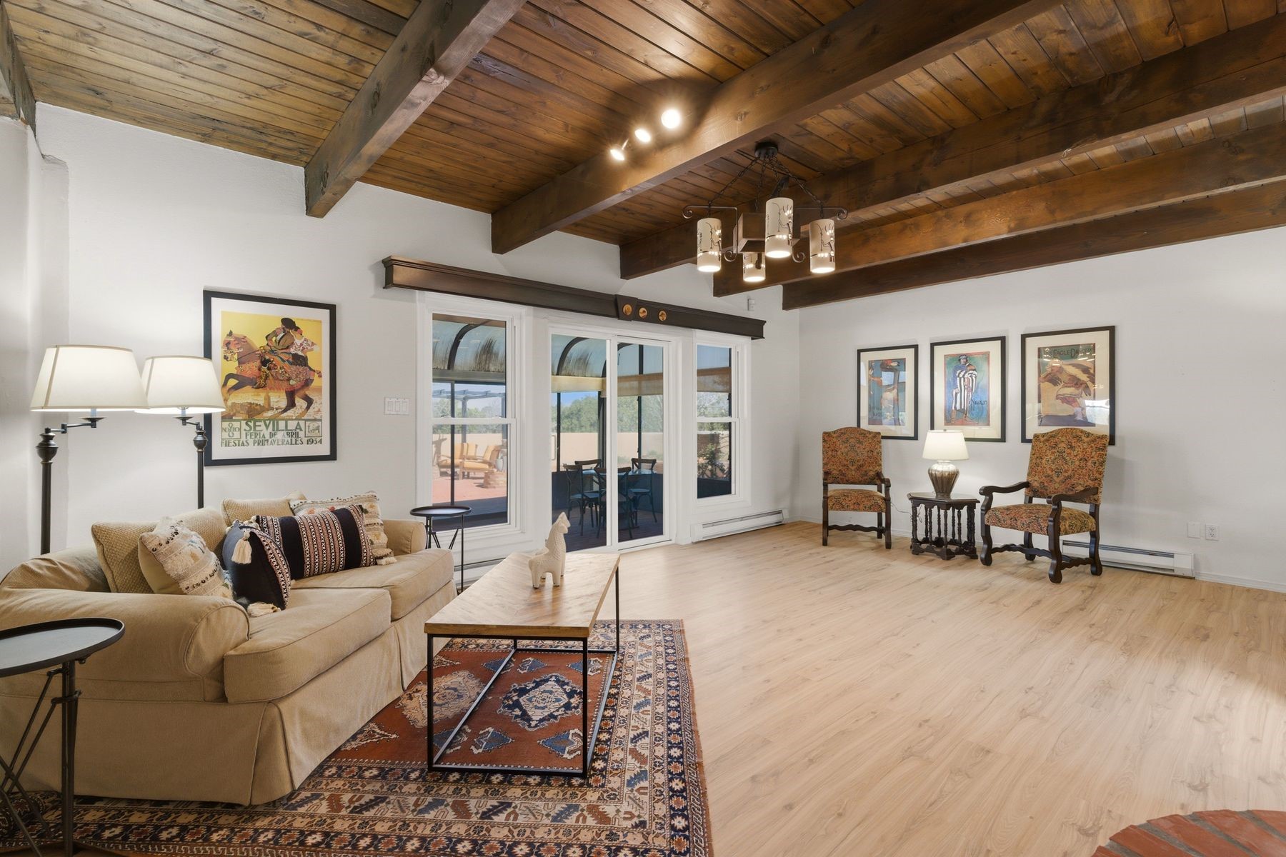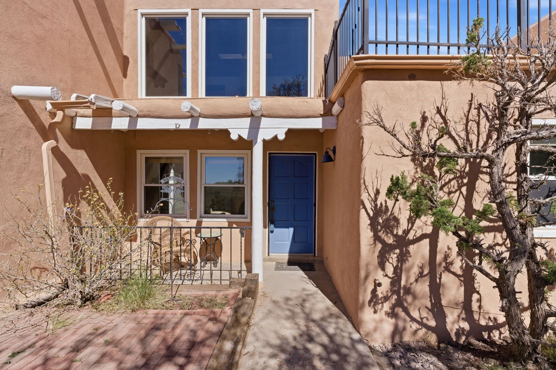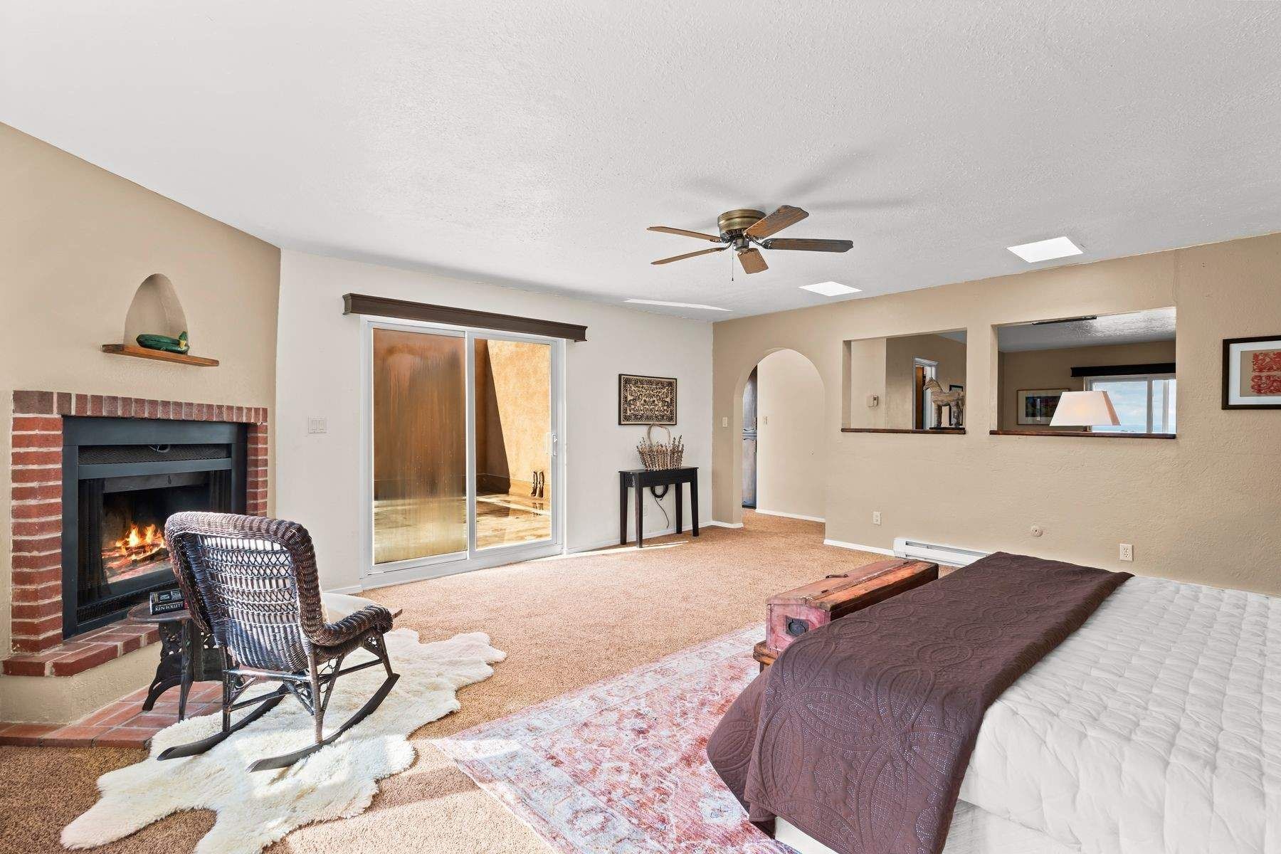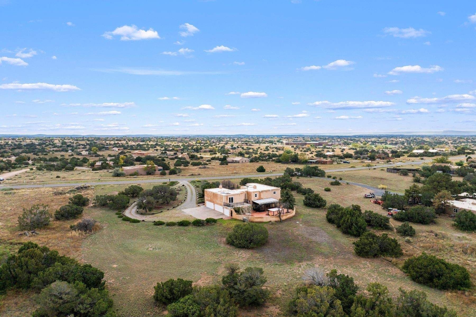 Pueblo Revival home in Eldorado on 1.65 acres with Sangre de Cristo mountain views, located just 15 minutes from the Santa Fe Plaza with easy access to I-25. This 3,562 square foot, two-story residence offers 4 bedrooms, 4 bathrooms, and a flexible layout designed for living, working, and creative use in one of Santa Fe's most sought-after communities. A dramatic entry leads into a spacious living room with dual-sided kiva fireplace, connecting to a flex space and sunroom that opens to a walled patio with mountain views. New laminate flooring in the main-level living areas enhances flow and durability, while brick and tile floors, banco seating, custom kachina-painted doors, and beamed ceilings reflect classic Southwestern design. The kitchen features quartz countertops, dual ovens, custom cabinetry, and a generous dining area. Upstairs, four bedrooms include walk-in closets and a large primary suite with two decks, dual baths, a bonus room, and a second fireplace. Additional flexible spaces include a main-level bonus room adjacent to the oversized five-car garage, suitable for studio, workshop, or gym use. A greenhouse with hot tub, storage shed, and multiple outdoor living areas support year-round use and a variety of lifestyle needs. Recent improvements include new exterior paint on the home and privacy wall. The level 1.65-acre lot offers usable space for gardens, outdoor living, or future improvements, with direct access to Eldorado's trail network and the nearby Santa Fe Rail Trail. Eldorado amenities include a community center, pool, tennis courts, stables, shopping, and El Dorado Community School. This property combines acreage, flexible living space, and proximity to Santa Fe, medical facilities, and Los Alamos commuting routes.