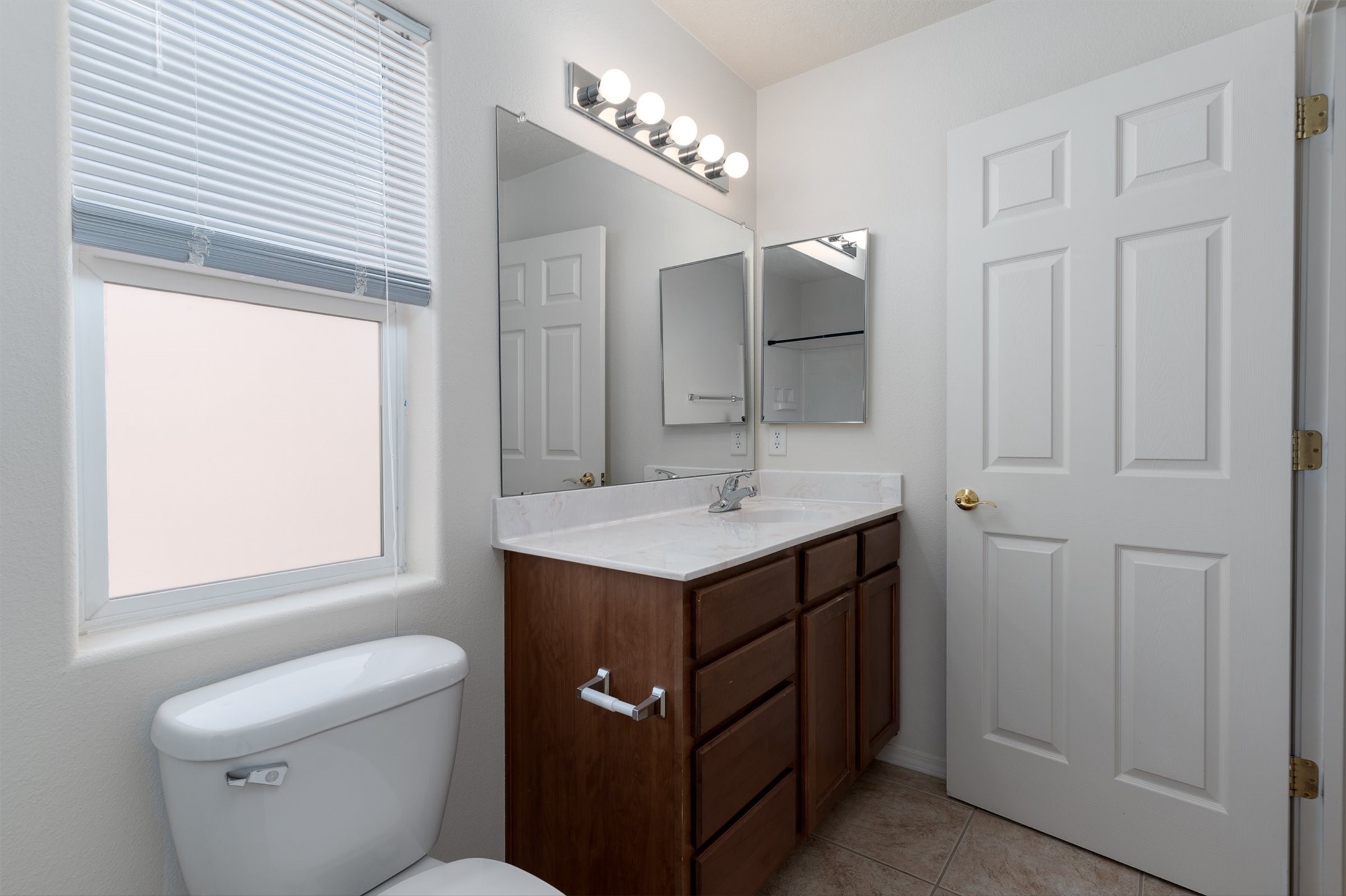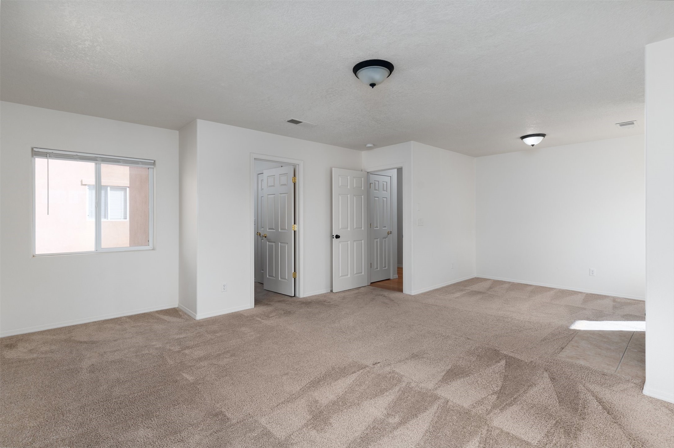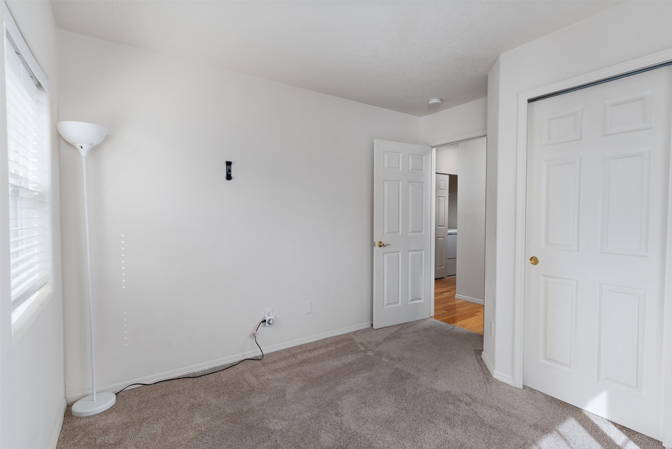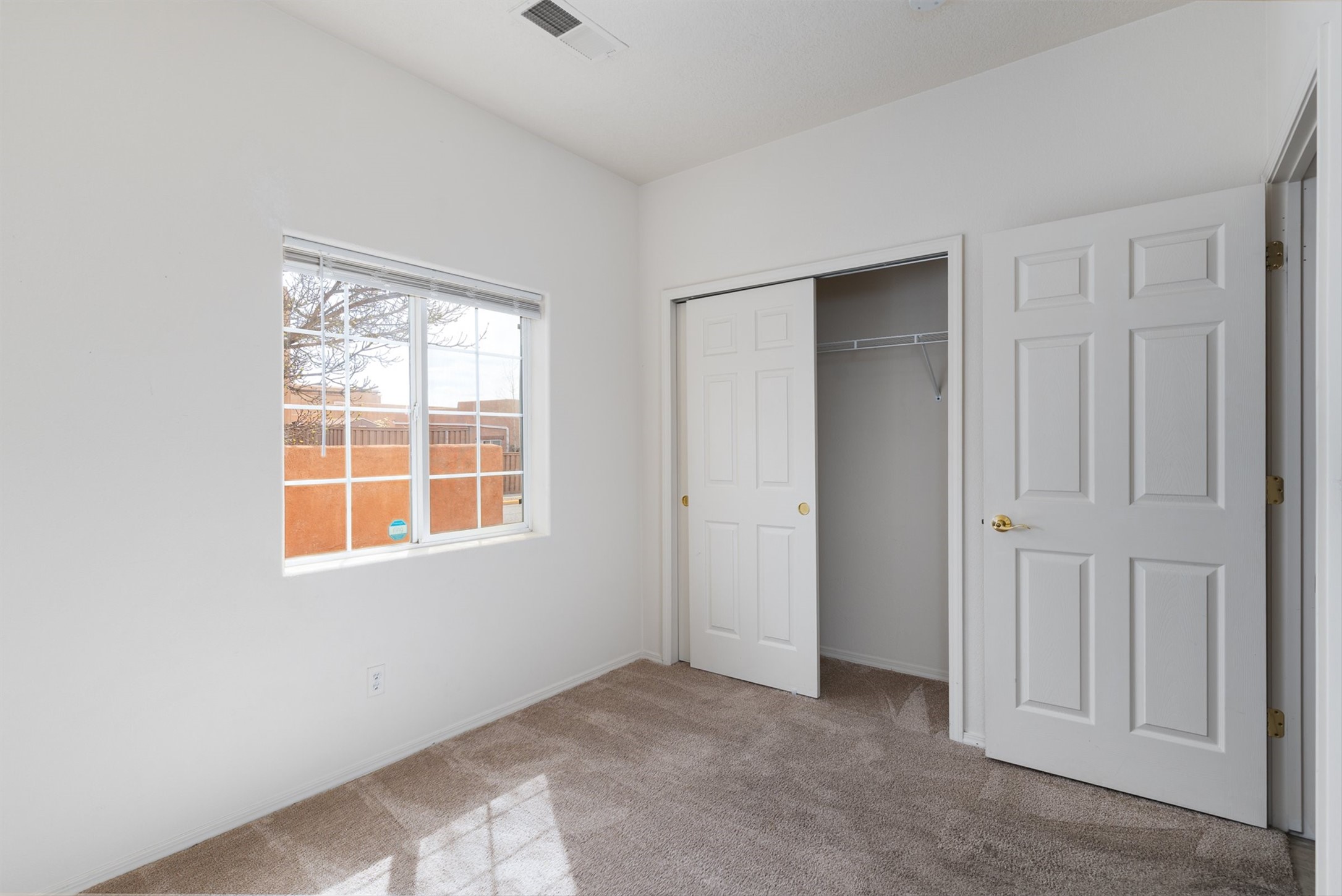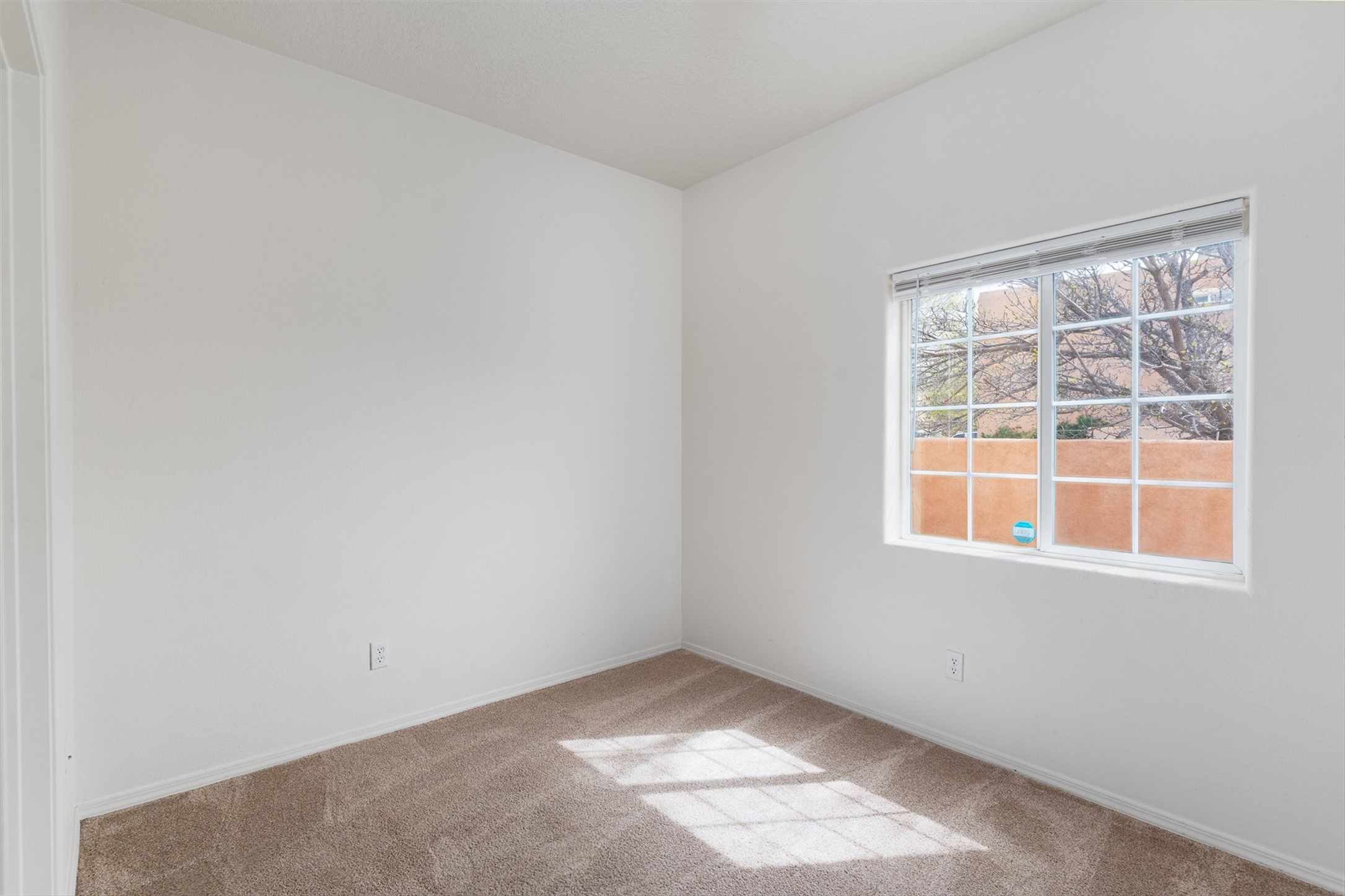 Light-filled contemporary home backing directly to open space and a paved trail, offering unobstructed views, a more open setting than typical neighborhood homes, and immediate access to outdoor recreation. This two-story residence features 3 bedrooms, 3 full bathrooms, and approximately 1,688 square feet, along with a 1-car attached garage. The main living area is bright and open, with a functional layout and easy flow between living, dining, and kitchen spaces. The kitchen offers warm wood cabinetry, ample counter space, and bar seating, making it well-suited for both everyday living and entertaining. Large windows bring in natural light throughout the home. Upstairs, wood flooring along the stairway and hallway adds warmth and contrast to the home's clean interior finishes. The primary bedroom includes a tile-faced fireplace, creating a comfortable and inviting retreat. One of the secondary bedrooms features a French door with an iron railing, allowing for additional light and architectural detail. The backyard opens directly to the trail and surrounding open space, enhancing the sense of privacy and connection to the outdoors. The low-maintenance outdoor area includes a hot tub that conveys with the property, ideal for enjoying Santa Fe evenings. Recent improvements include a modified bitumen roof replaced in 2020 with a 10-year warranty, and a newer Rheem HVAC system installed in 2024. The home also features central refrigerated air, forced air heating, county water, and city sewer. Located near neighborhood parks with convenient access to I-25, 599, and the Santa Fe Brewery, this property offers a well-located option in a popular area with direct access to trails and open space.
