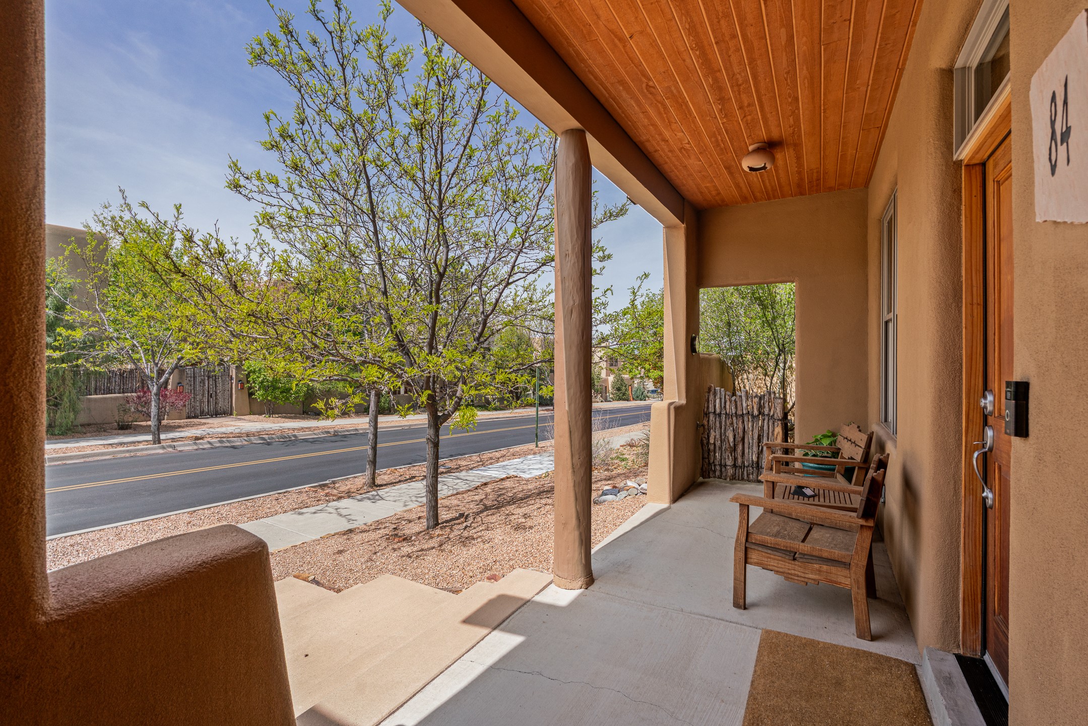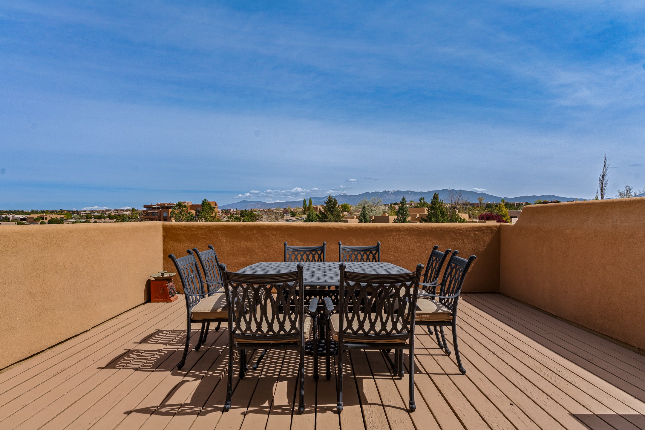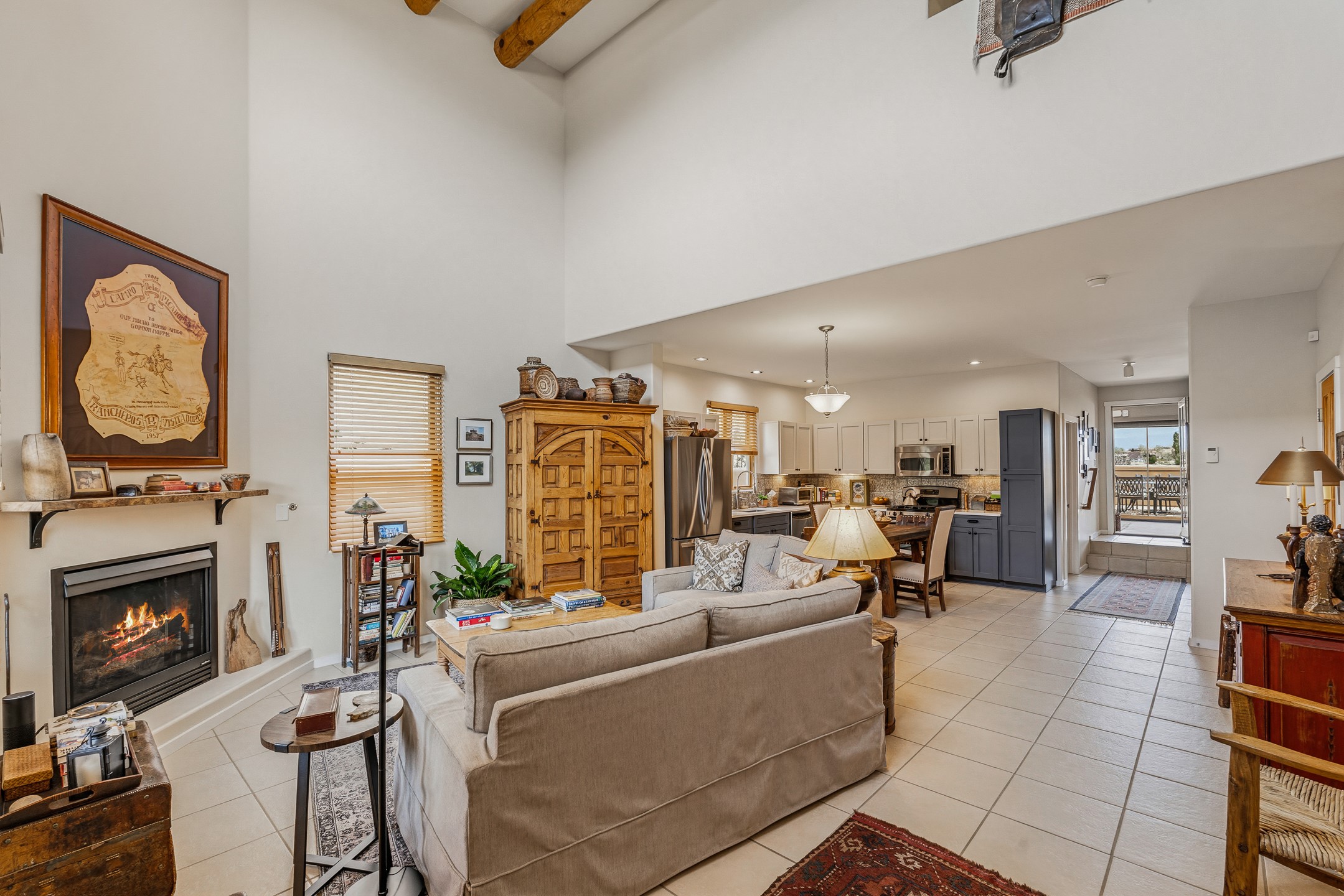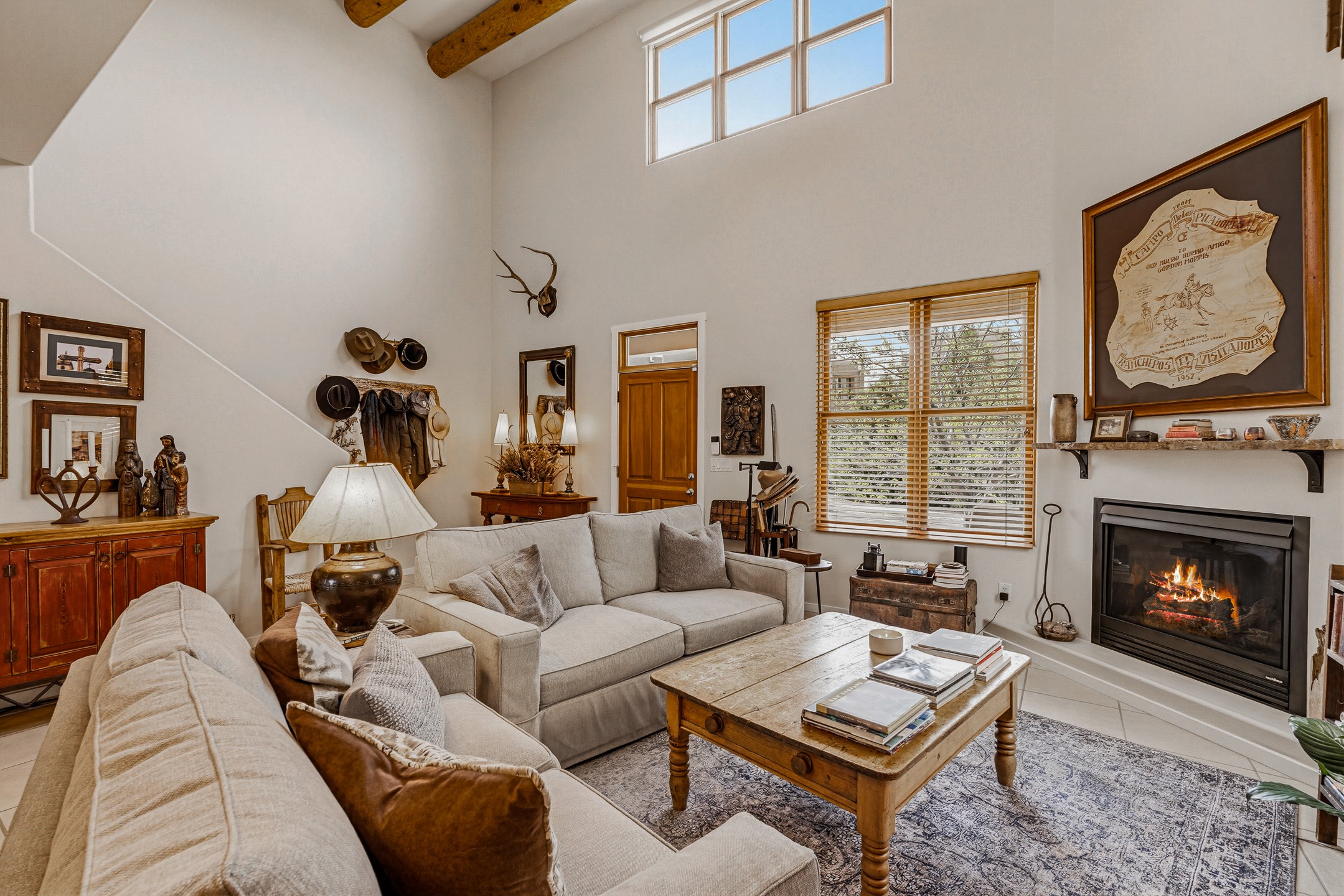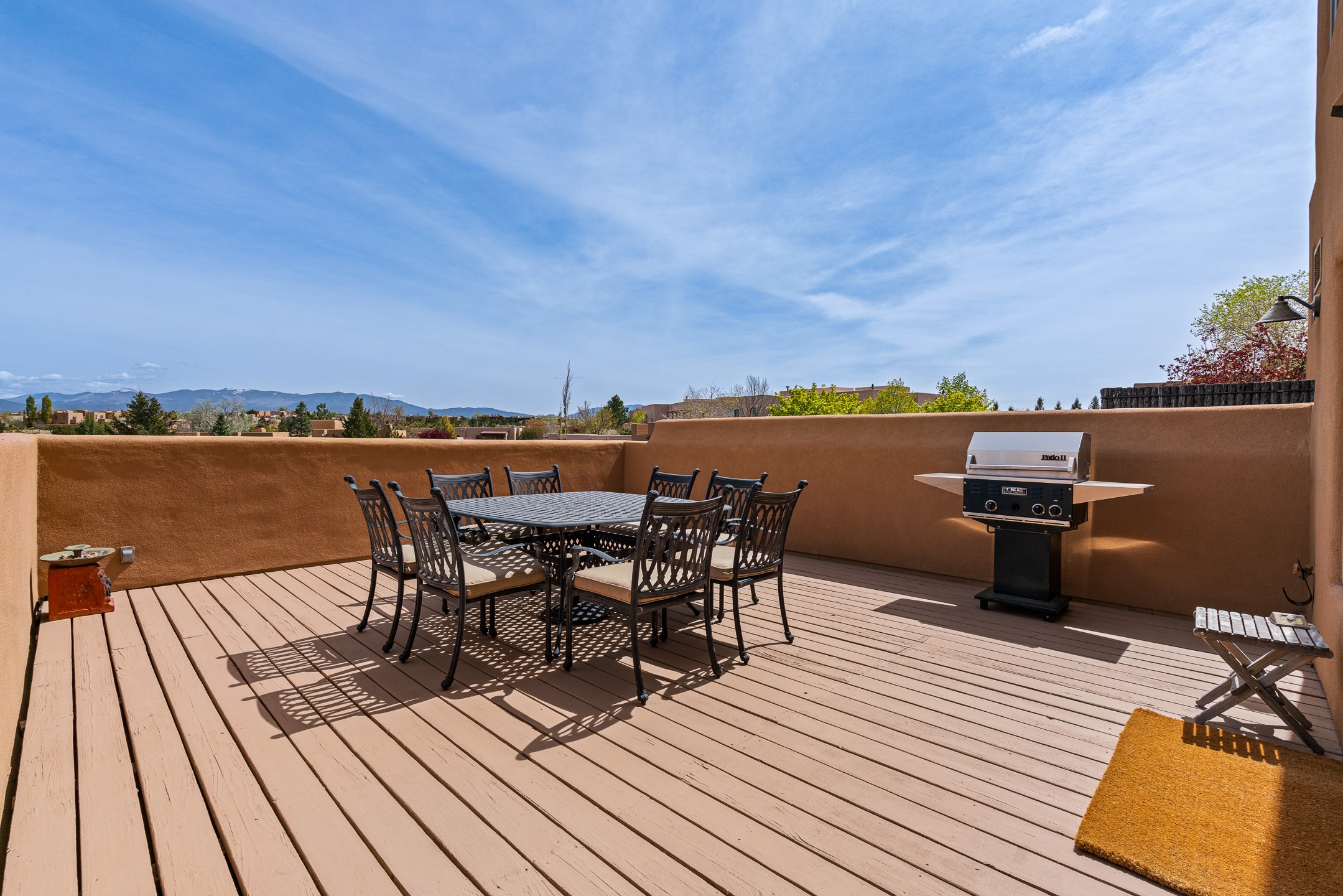 Welcome to this light-filled 4-bedroom, 3-bath townhome nestled in the highly sought-after Aldea community -- where Santa Fe's natural beauty meets effortless, elegant living. With over 2,000 sq. ft. of thoughtfully designed space, this home impresses from the moment you step inside, featuring soaring ceilings with rustic vigas, rich tile floors, and a cozy gas fireplace that sets the perfect ambiance.The expanded sunroom and family room flow seamlessly onto a spacious deck, where breathtaking Sangre de Cristo mountain views steal the show -- an idyllic setting for morning coffee or sunset evenings with friends. The kitchen is equipped with stainless steel appliances and tile countertops, combining style and everyday functionality. A conveniently located main-level bedroom and full bath offer a private and welcoming guest suite or ideal in-law quarters.Enjoy the best of indoor/outdoor living with a welcoming covered front porch and a detached two-car garage. Recent upgrades provide true peace of mind: new roof (2020), new water heater (late 2024/early 2025), new refrigerator (2025), and a newer washer and dryer.Located just 8 minutes from the heart of downtown Santa Fe, Aldea offers a tranquil lifestyle with beautifully maintained surroundings, scenic community trails, and a genuine neighborhood charm that is truly hard to find.Home Highlights:Spacious 4-bed / 3-bath with an open, airy floor planExpanded sunroom flowing to a mountain-view deckHigh ceilings with vigas + gas fireplaceMain-level guest suite with full bathDetached two-car garageNew roof, water heater, refrigerator, and washer/dryerQuiet, well-maintained community minutes from downtownThis is Santa Fe living at its finest -- serene, stylish, and perfectly situated.