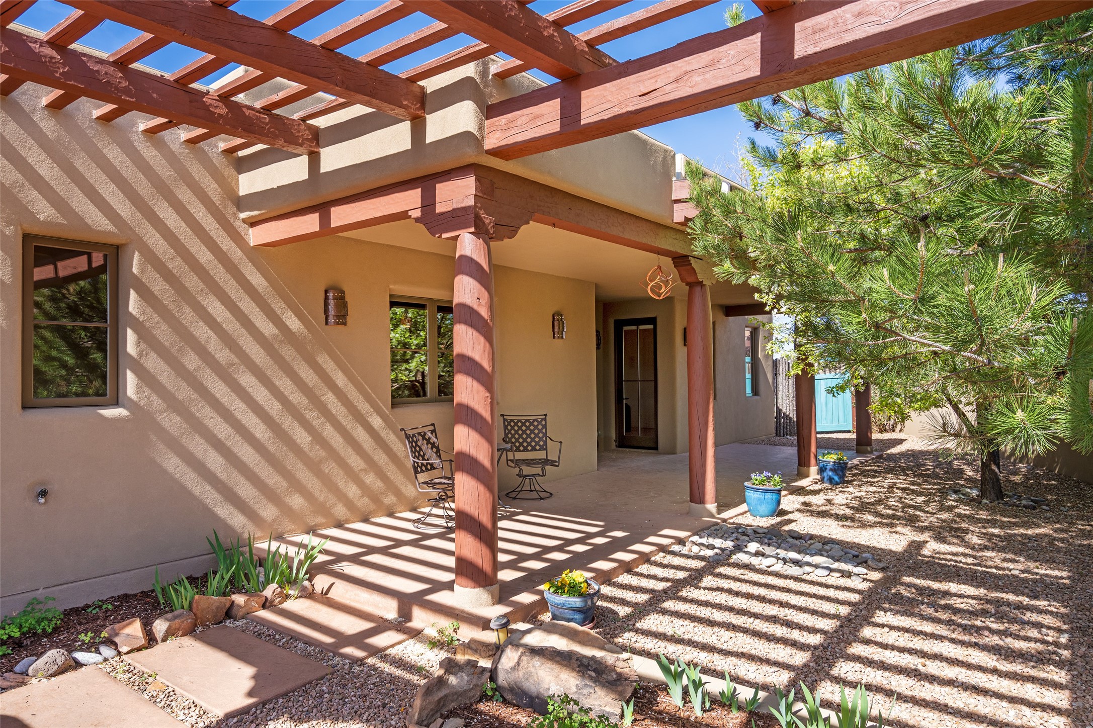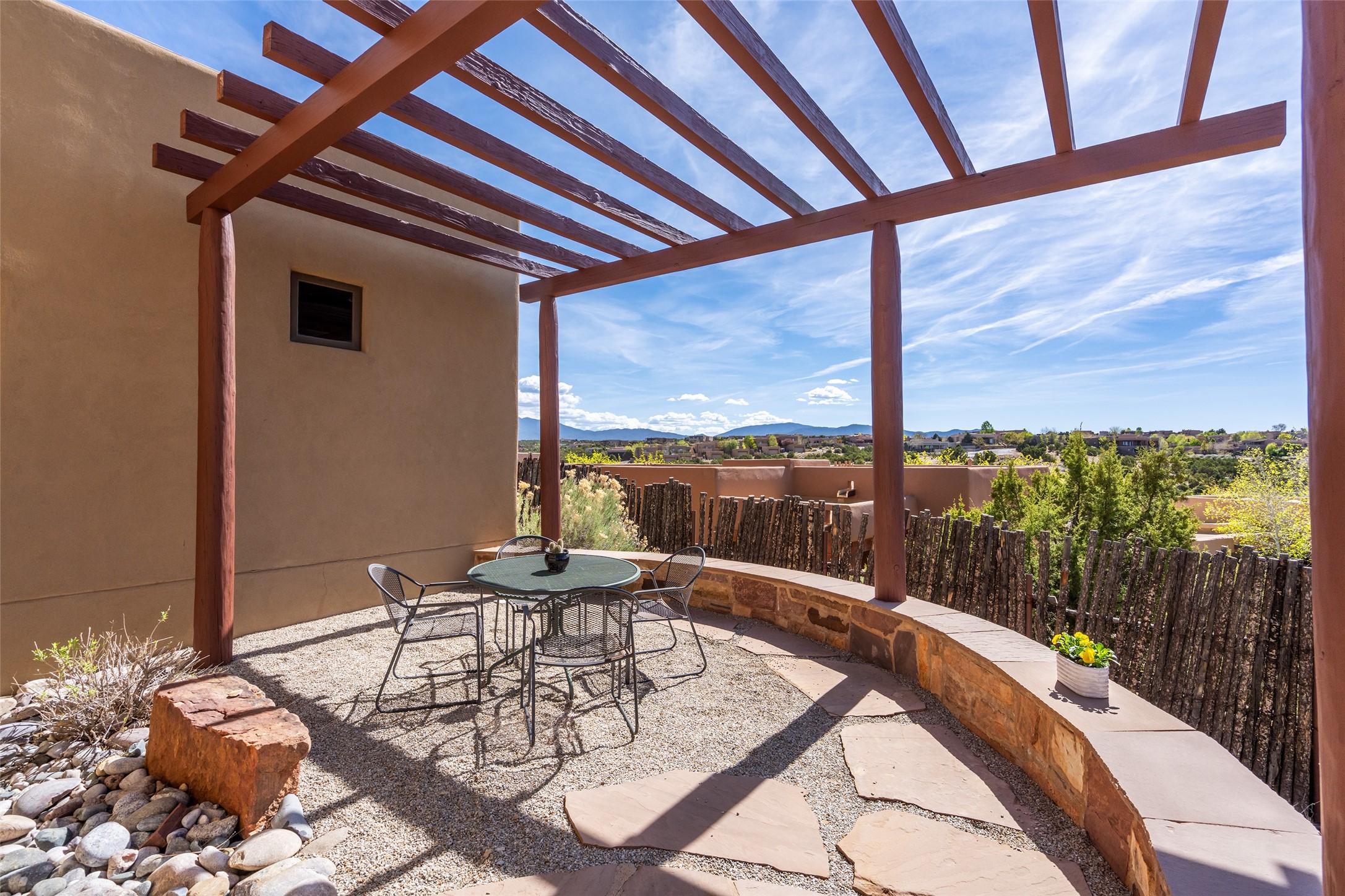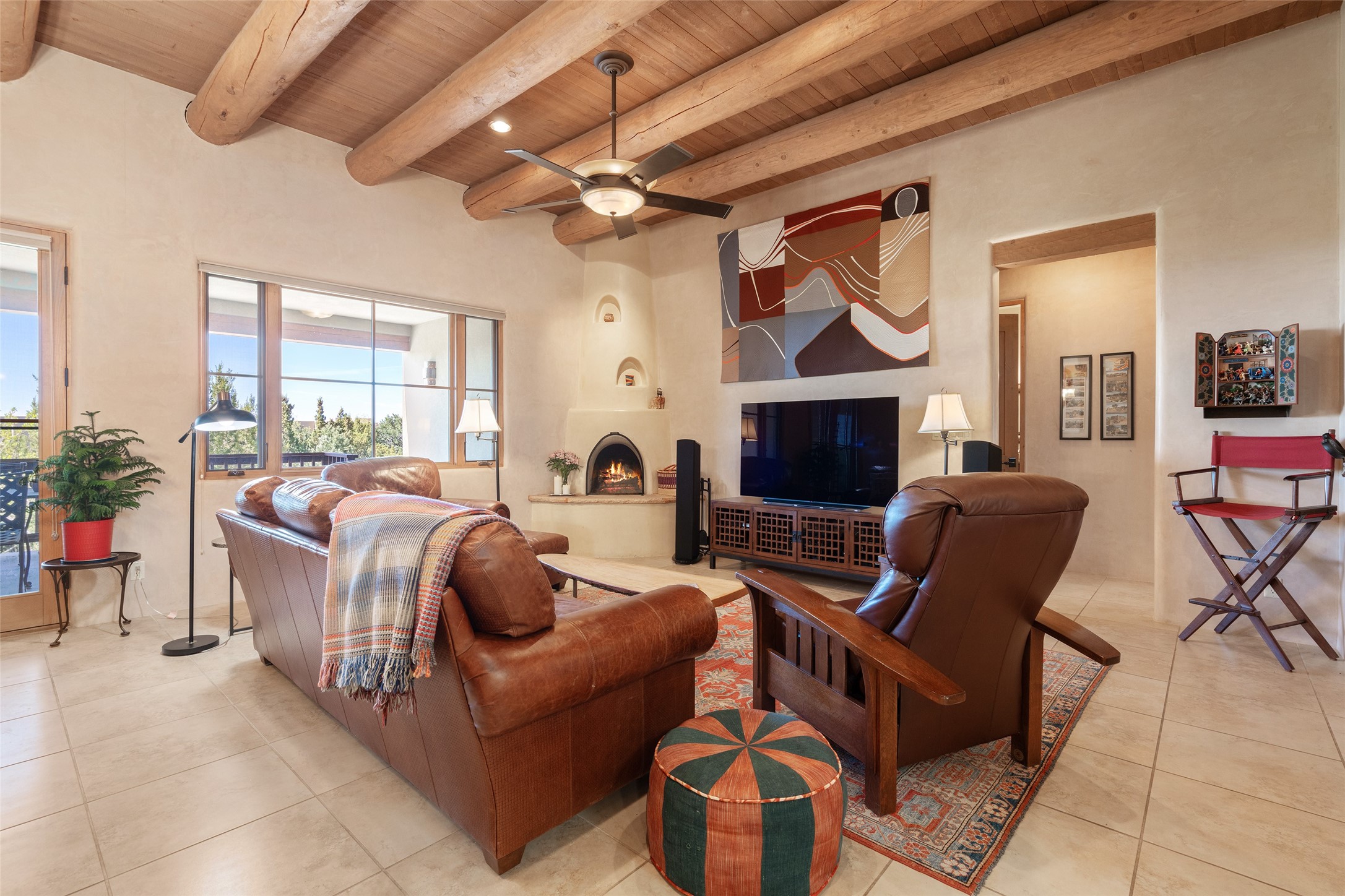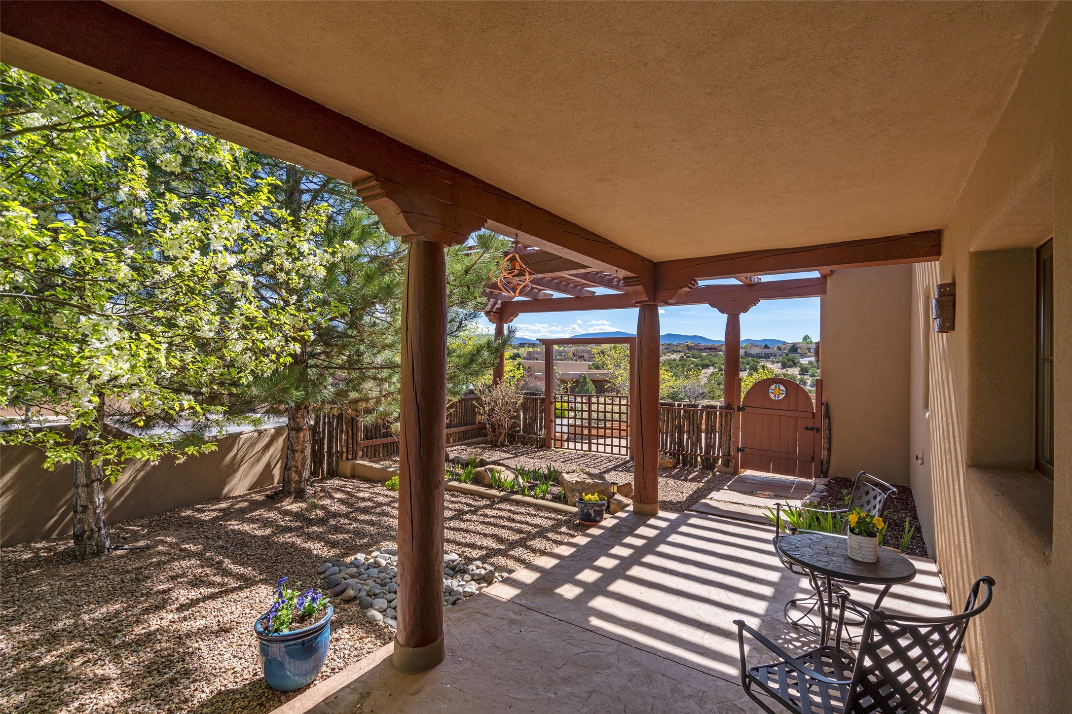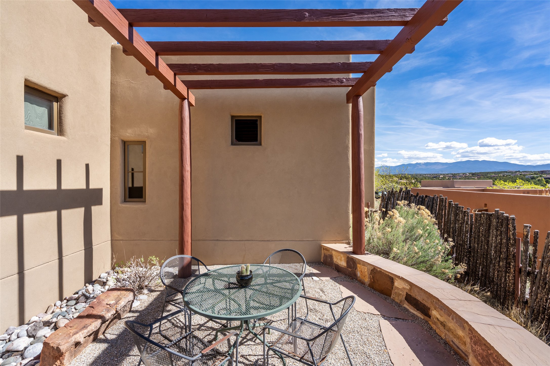 Run, don't walk to experience this outstanding new offering in the sought-after Aldea de Santa Fe. Beautifully crafted in classic Pueblo style, this home captures the essence of Santa Fe living with warmth, character, and thoughtful design throughout. A welcoming foyer opens to a spacious great room filled with natural light, where plaster walls, a beautifully crafted kiva fireplace, wood-beamed ceilings, and tile floors create an inviting and timeless aesthetic. The open kitchen is both functional and charming, featuring abundant storage, granite countertops, a stone tile backsplash, and delightful views from the kitchen sink. Designed with comfort and privacy in mind, the split-bedroom floor plan offers a generous primary suite with direct access to the rear patio. The luxurious bath includes a soaking tub, separate shower, dual vanities, and a well-sized walk-in closet. On the opposite side of the home, two additional bedrooms provide flexibility for guests or work-from-home needs, including one ensuite. Outdoor living is equally appealing, with a charming front courtyard--perfect for morning coffee--and a stone patio ideal for enjoying sunset skies and surrounding views. An oversized garage offers ample space for storage or a workshop. Recent upgrades ensure peace of mind and year-round comfort, including a brand-new roof with a transferable warranty and four newly installed mini-splits for efficient heating and cooling. This mostly single-level home (with just one step in the garage) offers ease of living in one of Santa Fe's most desirable communities.