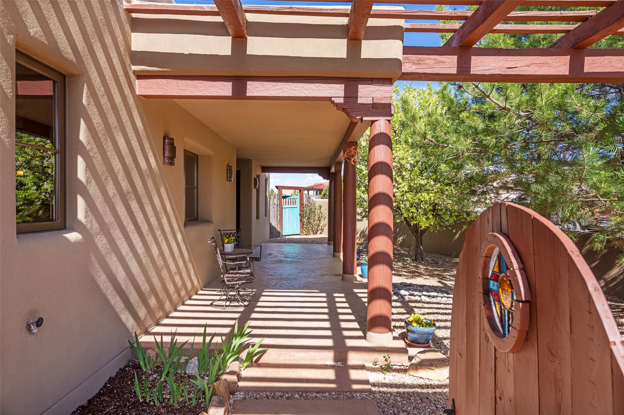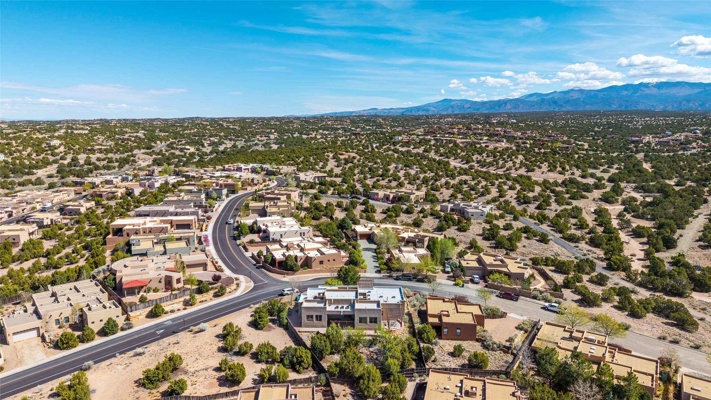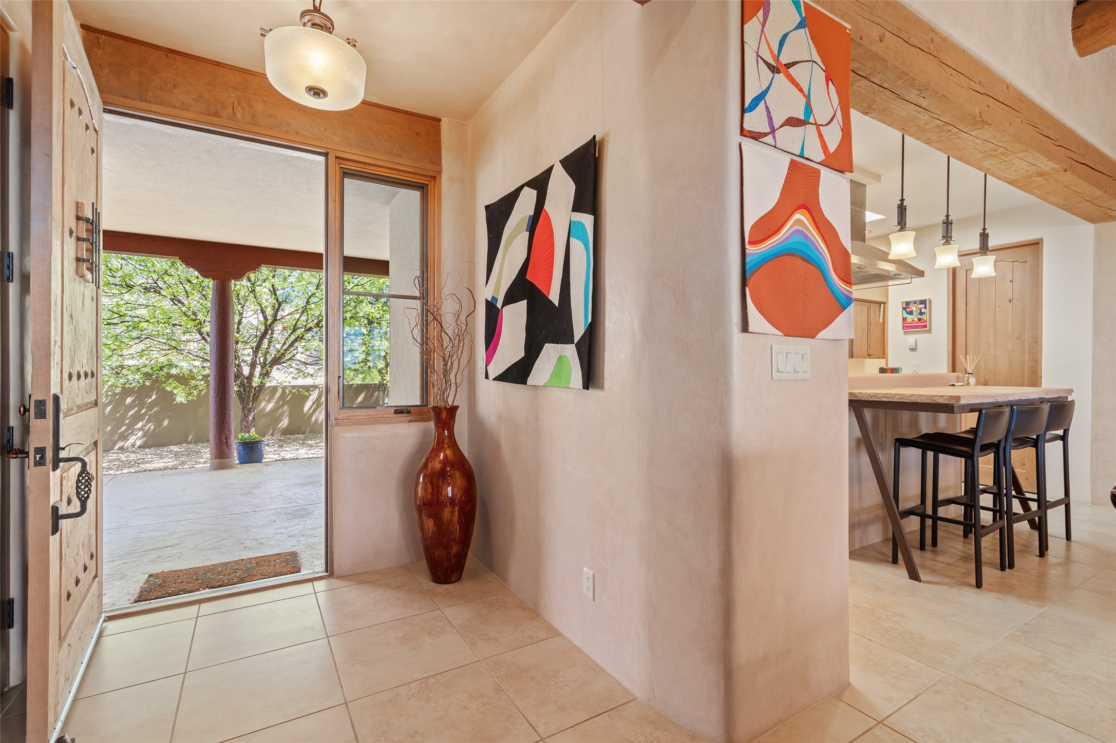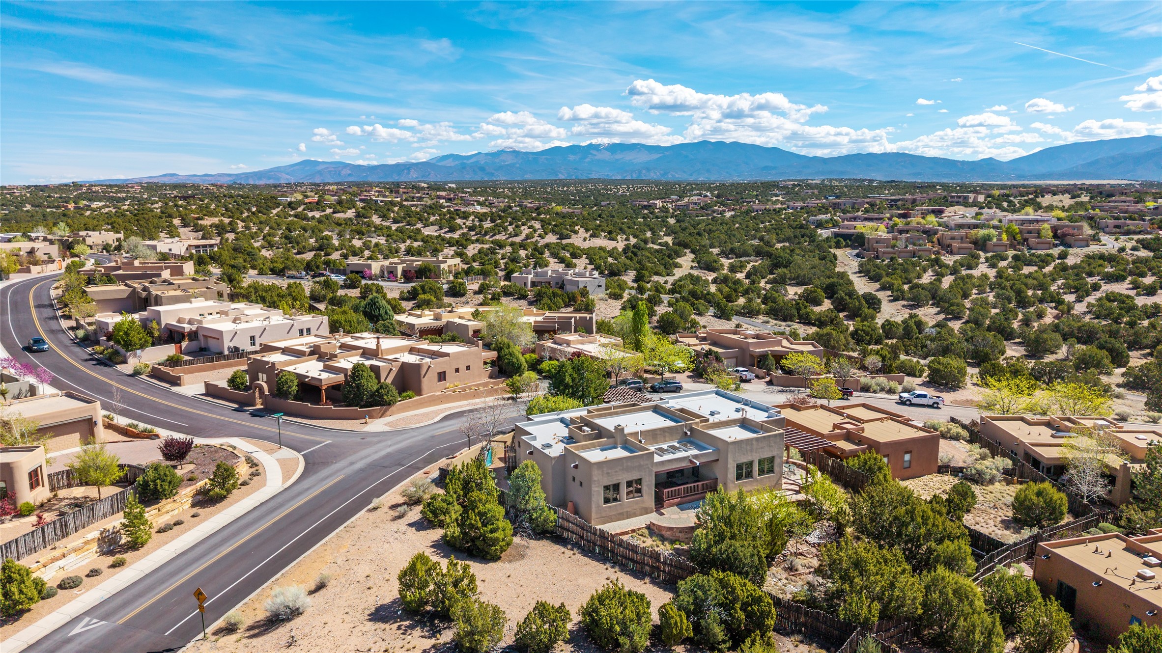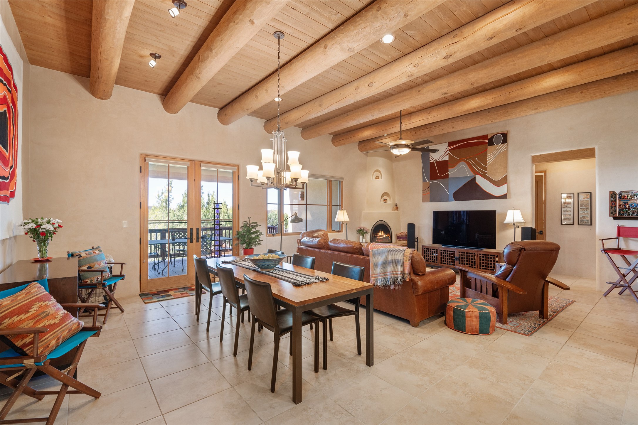 Run, don't walk to experience this outstanding new offering in the sought-after Aldea de Santa Fe. Beautifully crafted in classic Pueblo style, this home captures the essence of Santa Fe living with warmth, character, and thoughtful design throughout. A welcoming foyer opens to a spacious great room filled with natural light, where plaster walls, a beautifully crafted kiva fireplace, wood-beamed ceilings, and tile floors create an inviting and timeless aesthetic. The open kitchen is both functional and charming, featuring abundant storage, granite countertops, a stone tile backsplash, and delightful views from the kitchen sink. Designed with comfort and privacy in mind, the split-bedroom floor plan offers a generous primary suite with direct access to the rear patio. The luxurious bath includes a soaking tub, separate shower, dual vanities, and a well-sized walk-in closet. On the opposite side of the home, two additional bedrooms provide flexibility for guests or work-from-home needs, including one ensuite. Outdoor living is equally appealing, with a charming front courtyard--perfect for morning coffee--and a stone patio ideal for enjoying sunset skies and surrounding views. An oversized garage offers ample space for storage or a workshop. Recent upgrades ensure peace of mind and year-round comfort, including a brand-new roof with a transferable warranty and four newly installed mini-splits for efficient heating and cooling. This mostly single-level home (with just one step in the garage) offers ease of living in one of Santa Fe's most desirable communities.