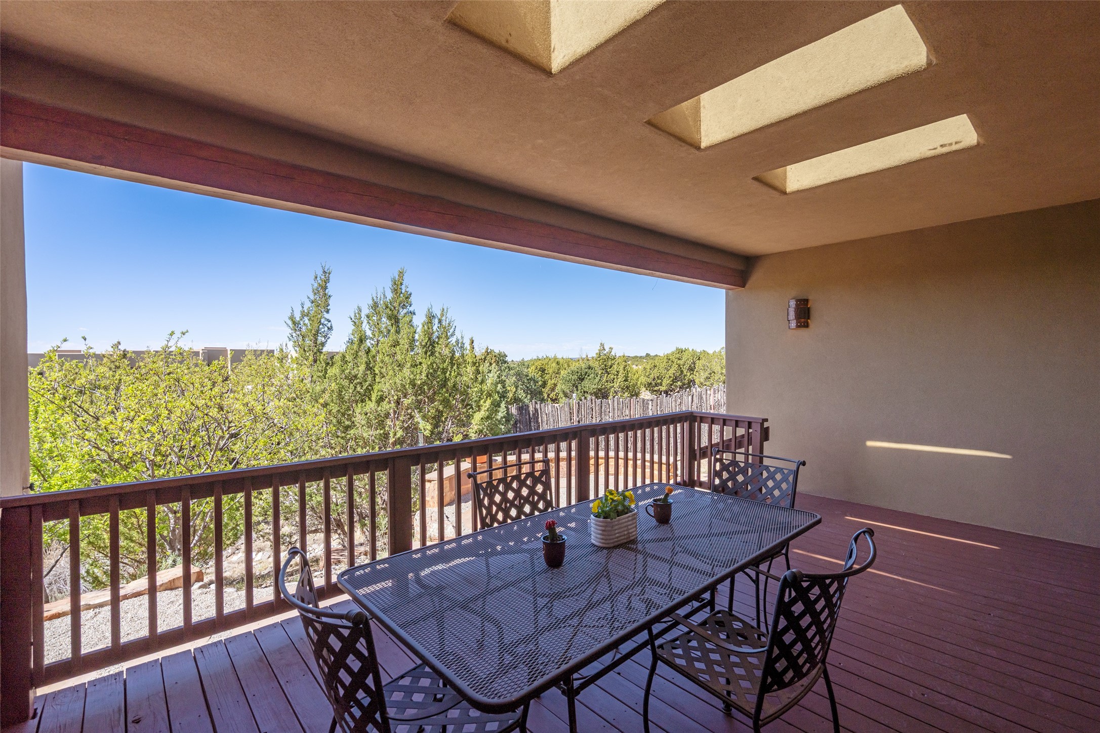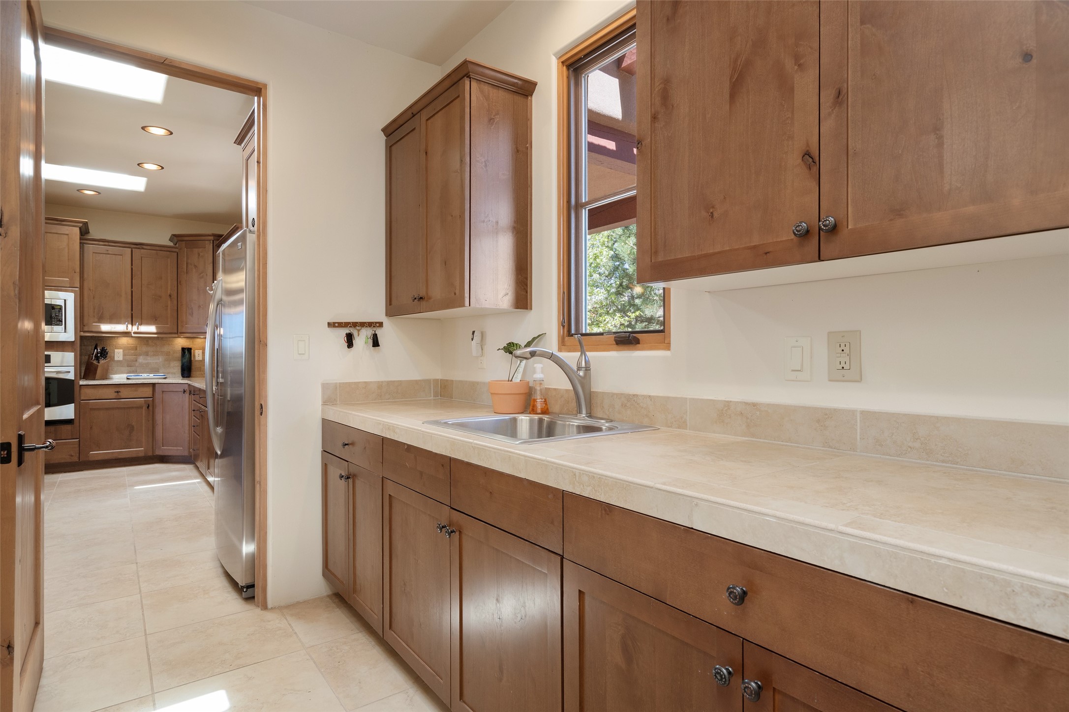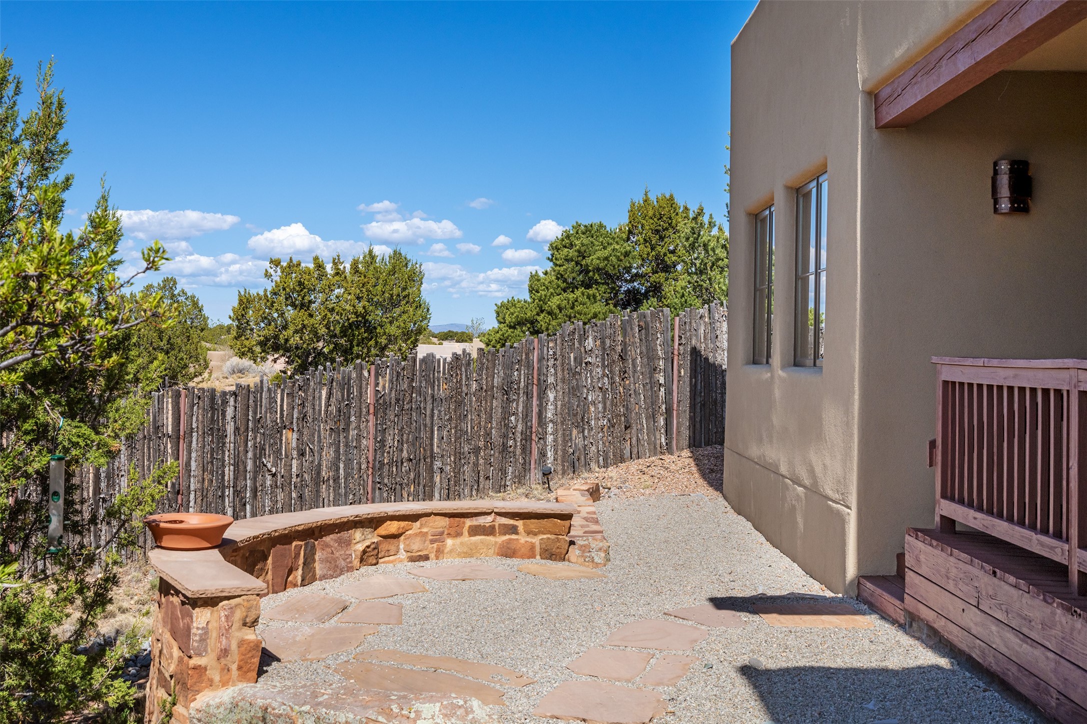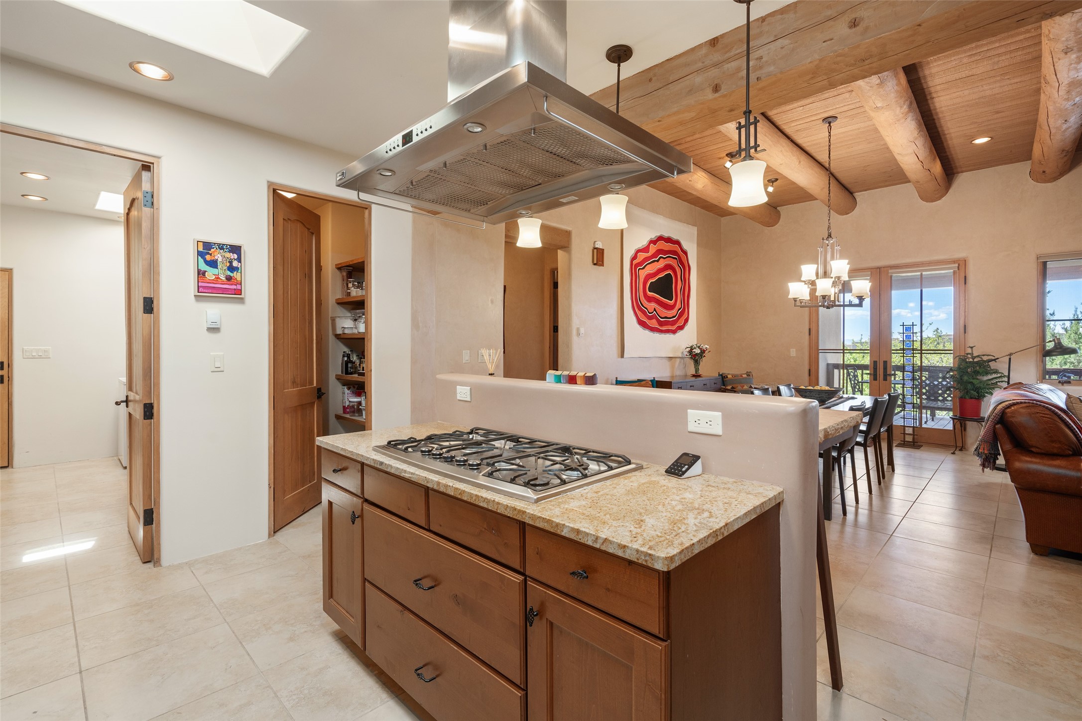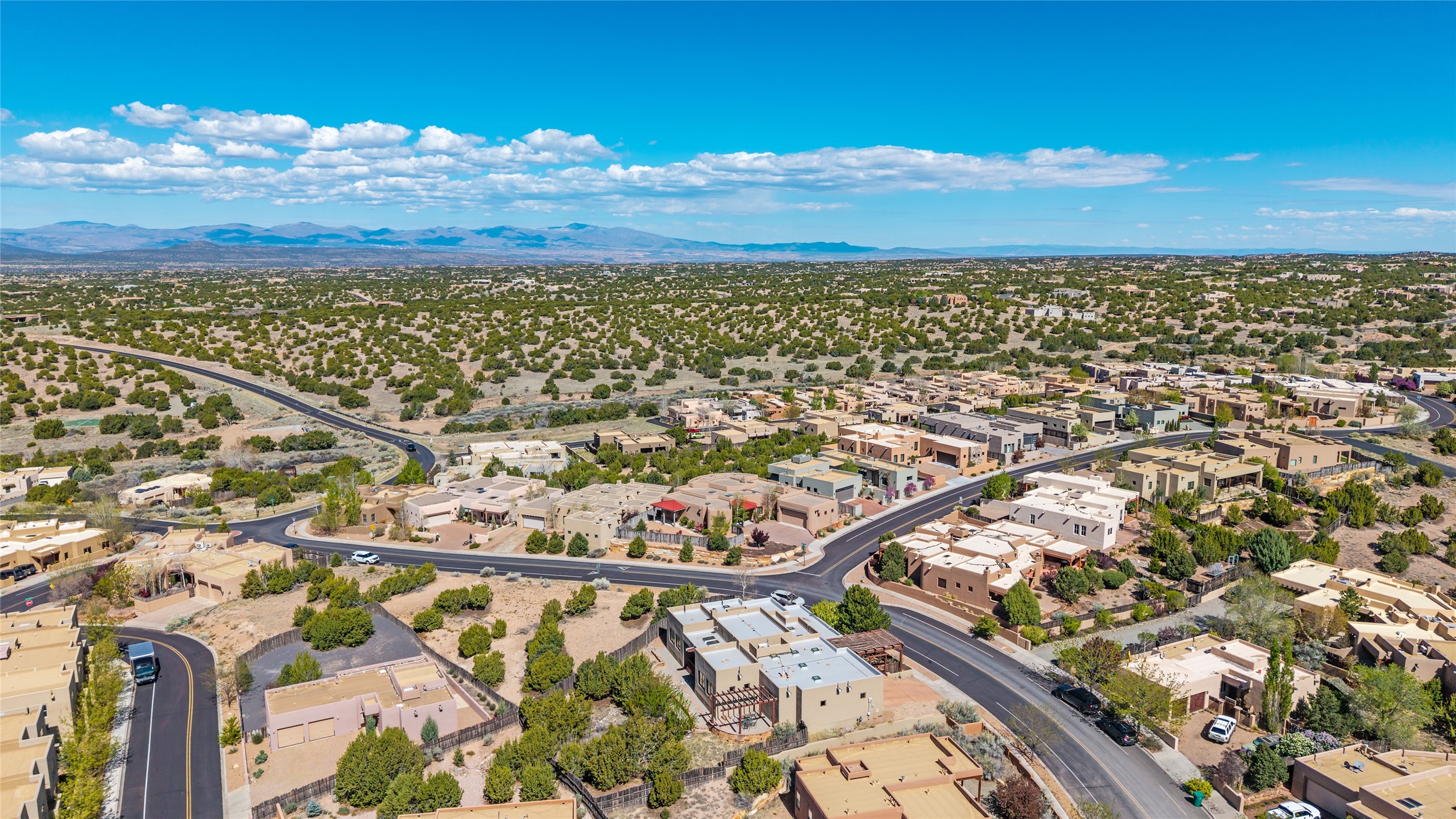 Run, don't walk to experience this outstanding new offering in the sought-after Aldea de Santa Fe. Beautifully crafted in classic Pueblo style, this home captures the essence of Santa Fe living with warmth, character, and thoughtful design throughout. A welcoming foyer opens to a spacious great room filled with natural light, where plaster walls, a beautifully crafted kiva fireplace, wood-beamed ceilings, and tile floors create an inviting and timeless aesthetic. The open kitchen is both functional and charming, featuring abundant storage, granite countertops, a stone tile backsplash, and delightful views from the kitchen sink. Designed with comfort and privacy in mind, the split-bedroom floor plan offers a generous primary suite with direct access to the rear patio. The luxurious bath includes a soaking tub, separate shower, dual vanities, and a well-sized walk-in closet. On the opposite side of the home, two additional bedrooms provide flexibility for guests or work-from-home needs, including one ensuite. Outdoor living is equally appealing, with a charming front courtyard--perfect for morning coffee--and a stone patio ideal for enjoying sunset skies and surrounding views. An oversized garage offers ample space for storage or a workshop. Recent upgrades ensure peace of mind and year-round comfort, including a brand-new roof with a transferable warranty and four newly installed mini-splits for efficient heating and cooling. This mostly single-level home (with just one step in the garage) offers ease of living in one of Santa Fe's most desirable communities.
