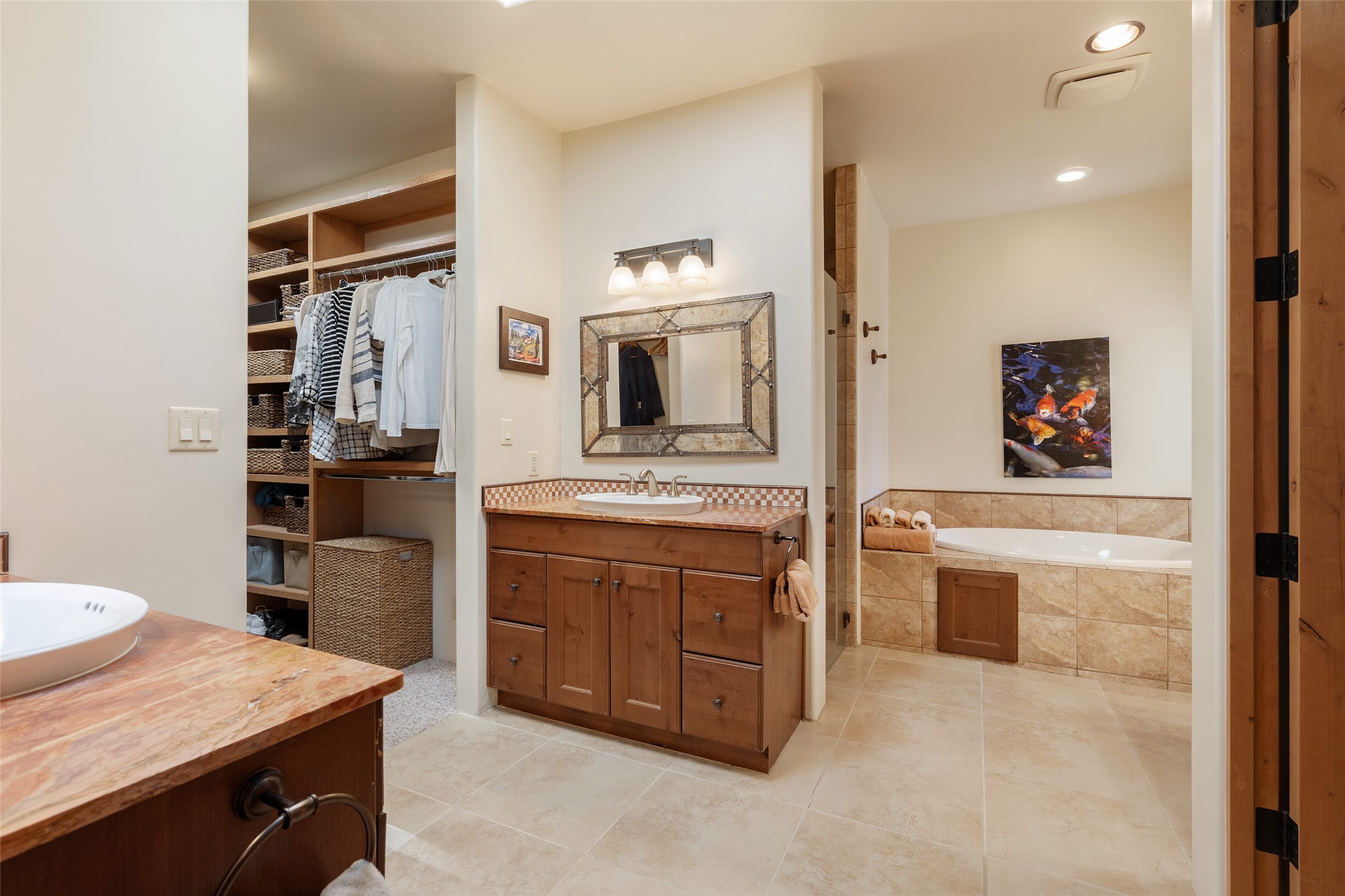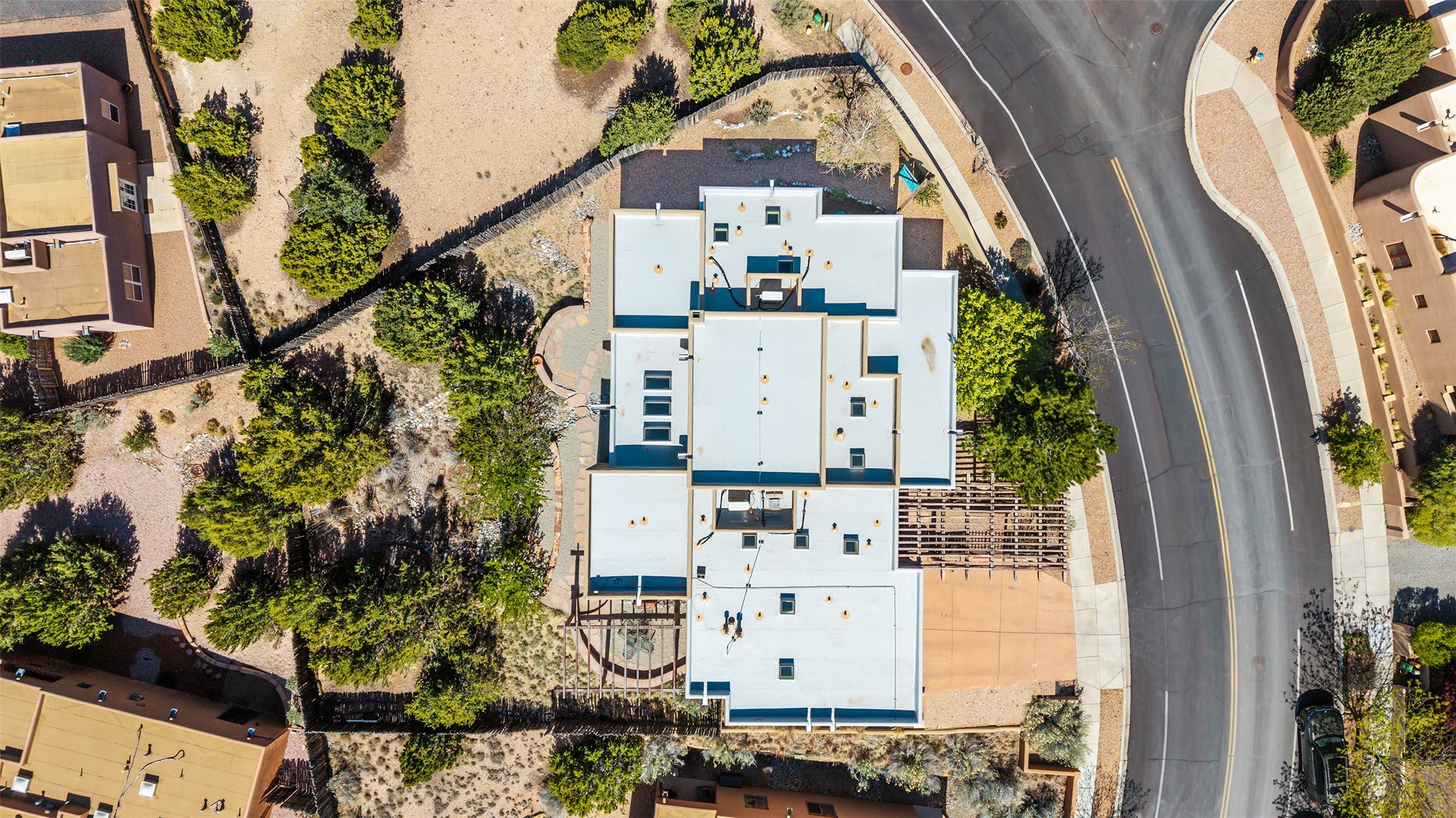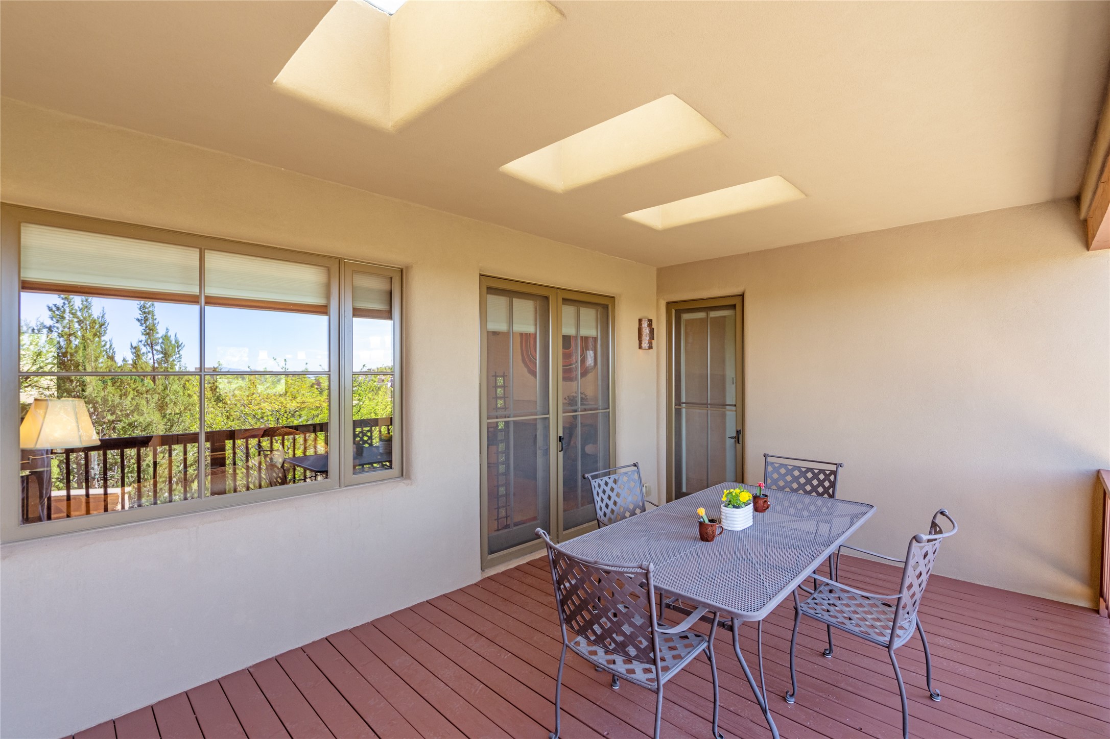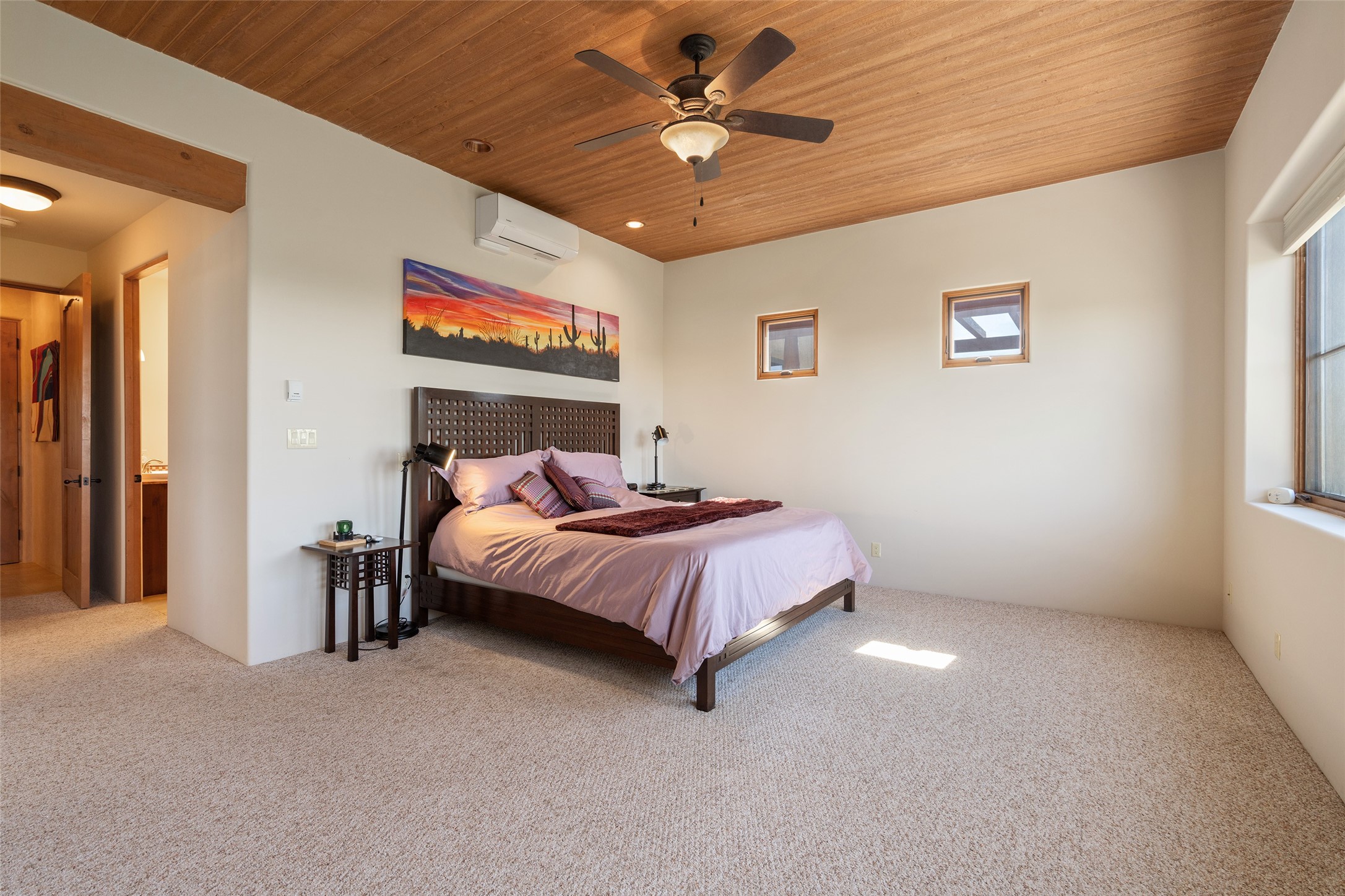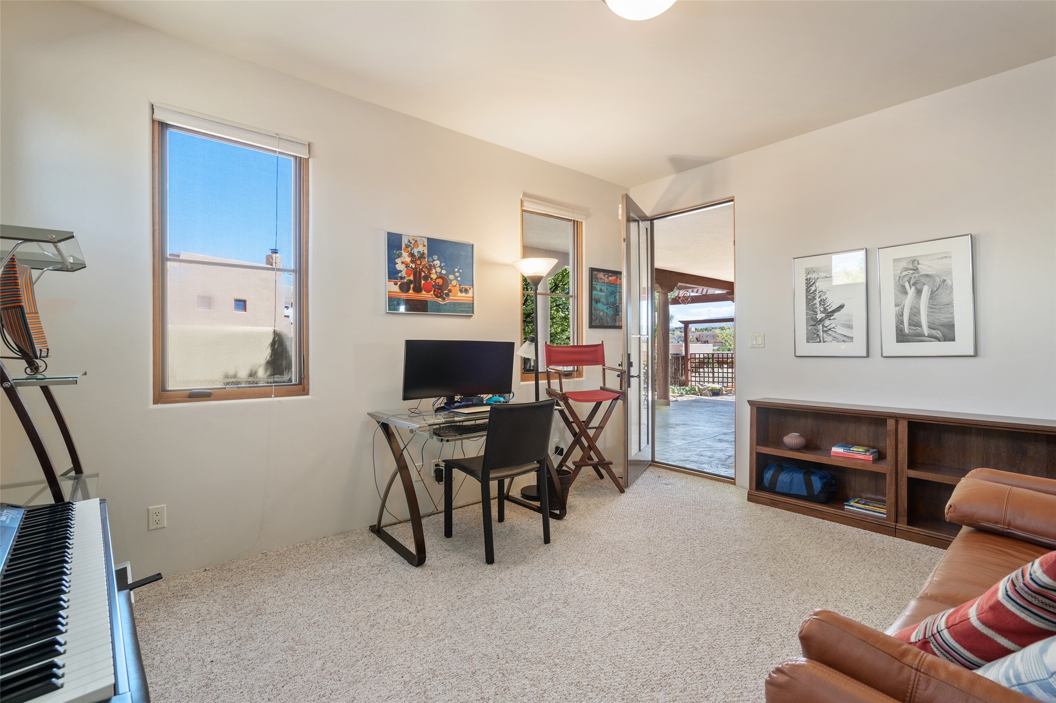 Run, don't walk to experience this outstanding new offering in the sought-after Aldea de Santa Fe. Beautifully crafted in classic Pueblo style, this home captures the essence of Santa Fe living with warmth, character, and thoughtful design throughout. A welcoming foyer opens to a spacious great room filled with natural light, where plaster walls, a beautifully crafted kiva fireplace, wood-beamed ceilings, and tile floors create an inviting and timeless aesthetic. The open kitchen is both functional and charming, featuring abundant storage, granite countertops, a stone tile backsplash, and delightful views from the kitchen sink. Designed with comfort and privacy in mind, the split-bedroom floor plan offers a generous primary suite with direct access to the rear patio. The luxurious bath includes a soaking tub, separate shower, dual vanities, and a well-sized walk-in closet. On the opposite side of the home, two additional bedrooms provide flexibility for guests or work-from-home needs, including one ensuite. Outdoor living is equally appealing, with a charming front courtyard--perfect for morning coffee--and a stone patio ideal for enjoying sunset skies and surrounding views. An oversized garage offers ample space for storage or a workshop. Recent upgrades ensure peace of mind and year-round comfort, including a brand-new roof with a transferable warranty and four newly installed mini-splits for efficient heating and cooling. This mostly single-level home (with just one step in the garage) offers ease of living in one of Santa Fe's most desirable communities.