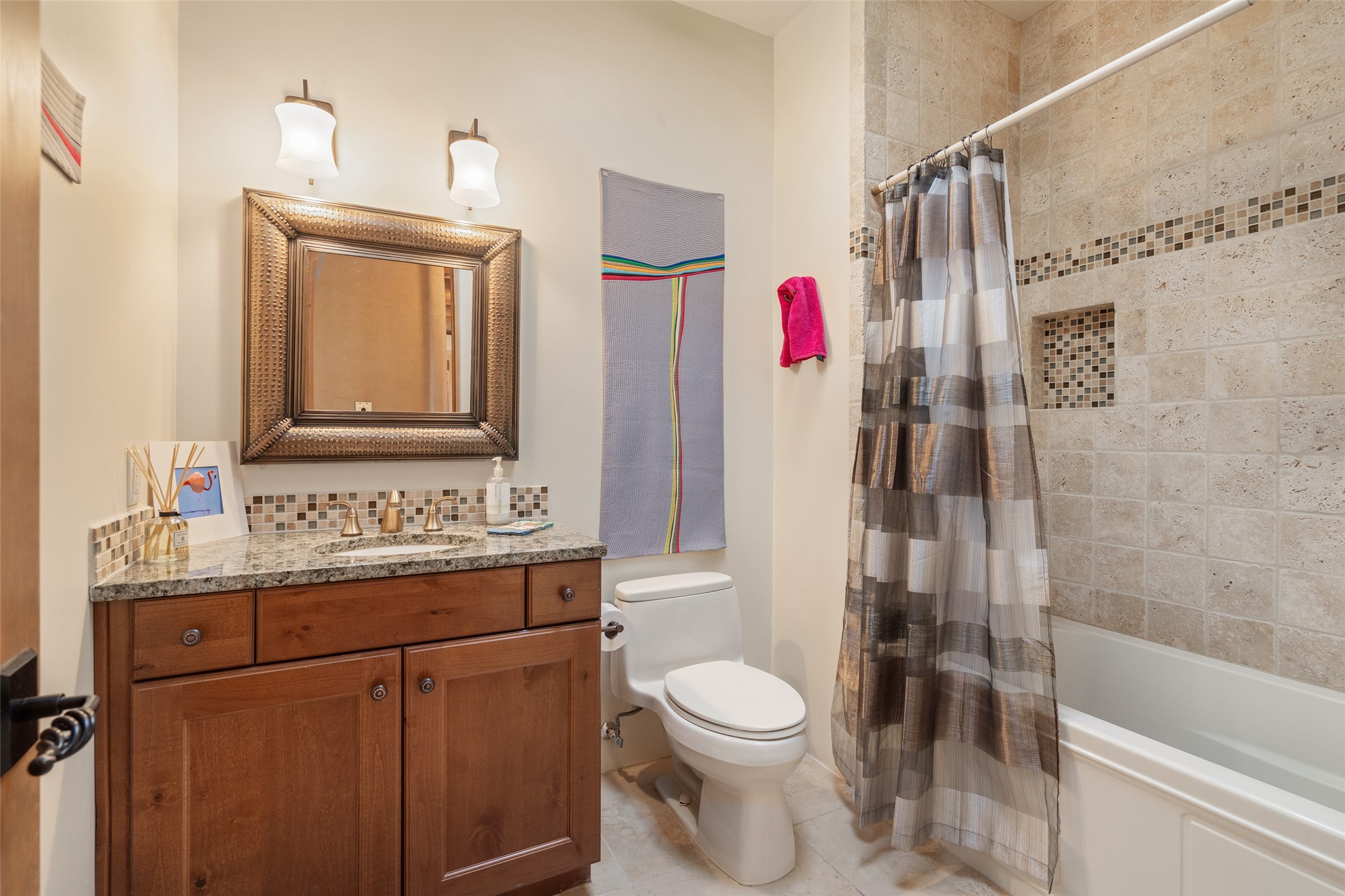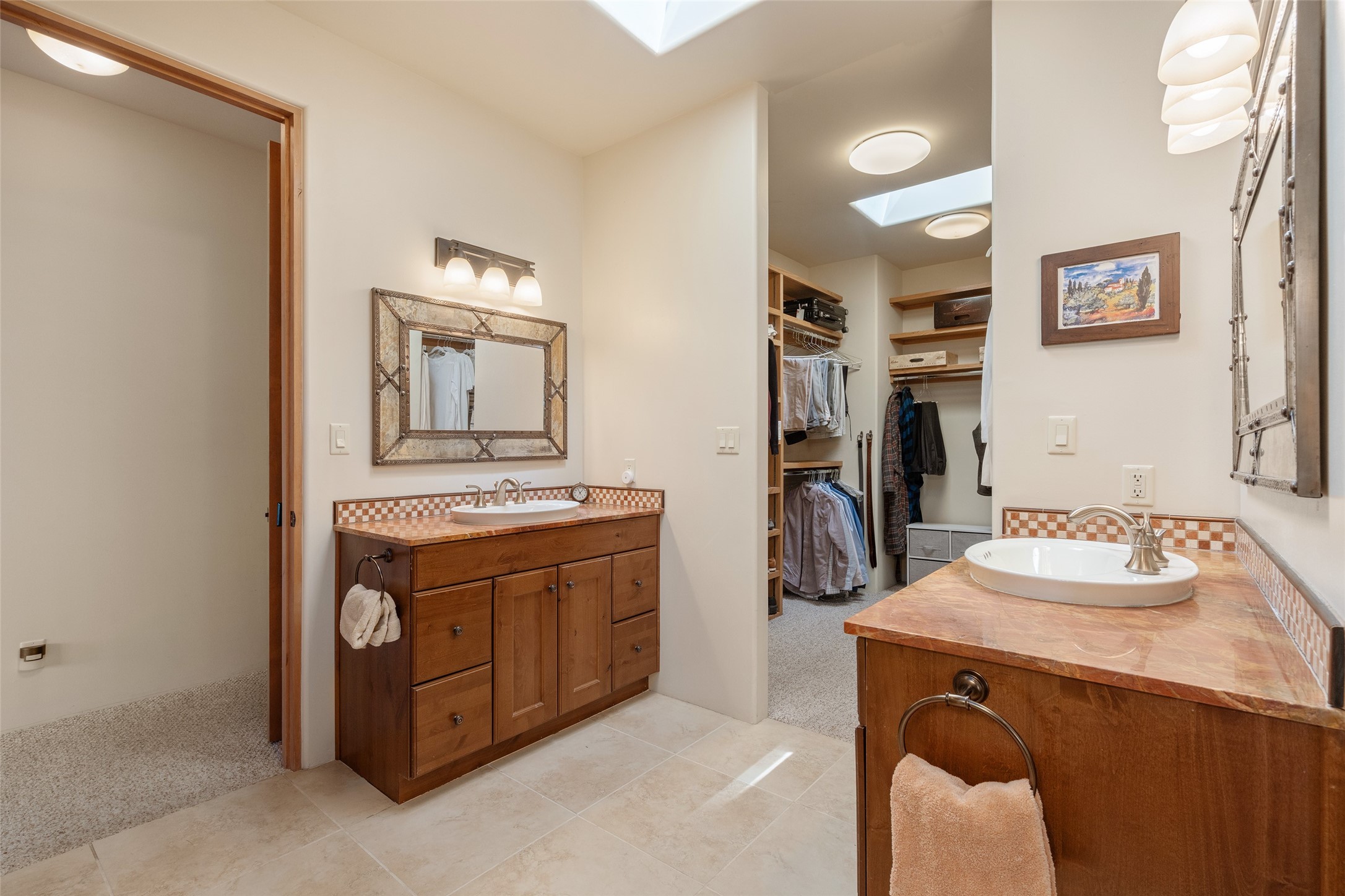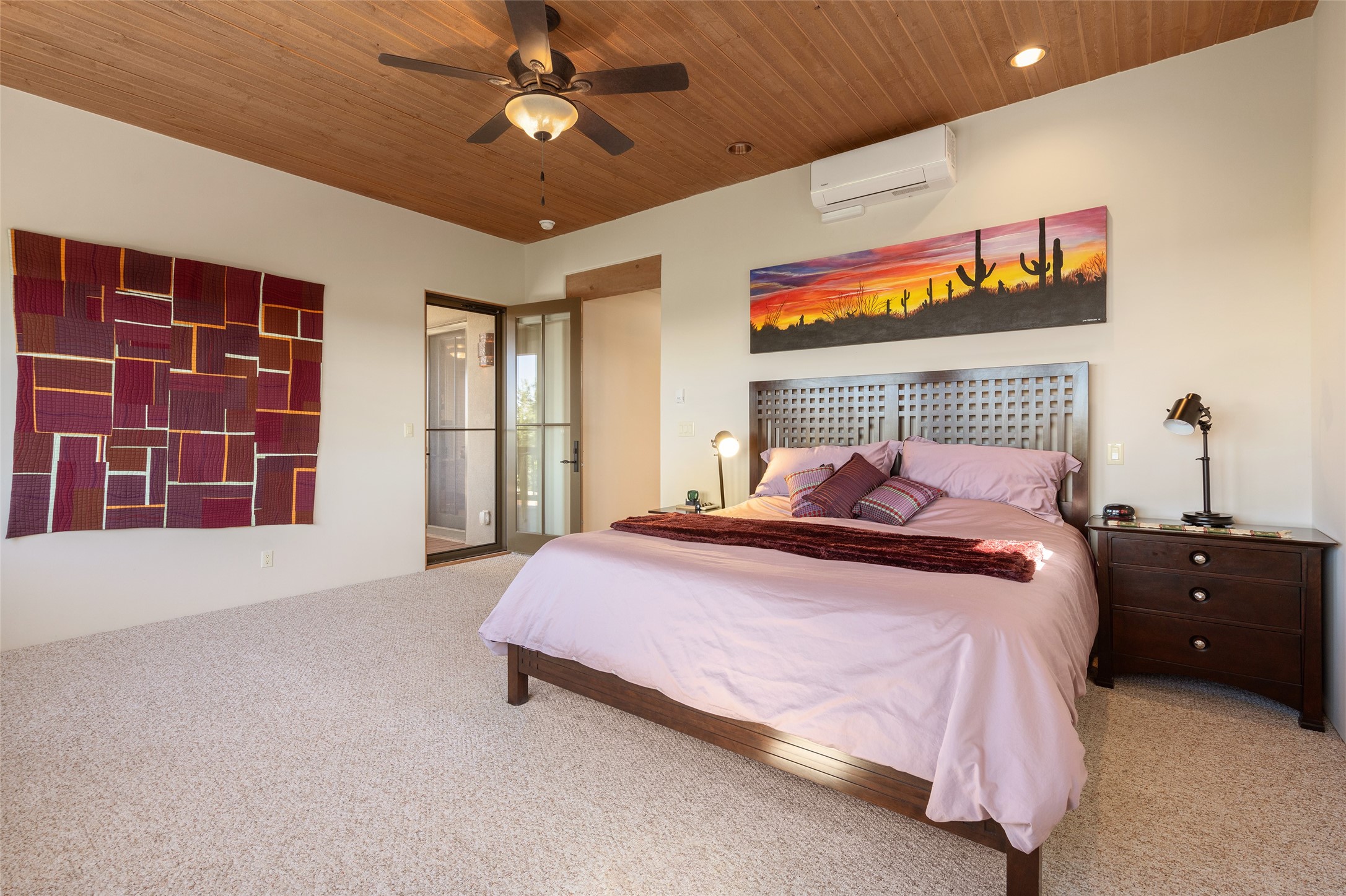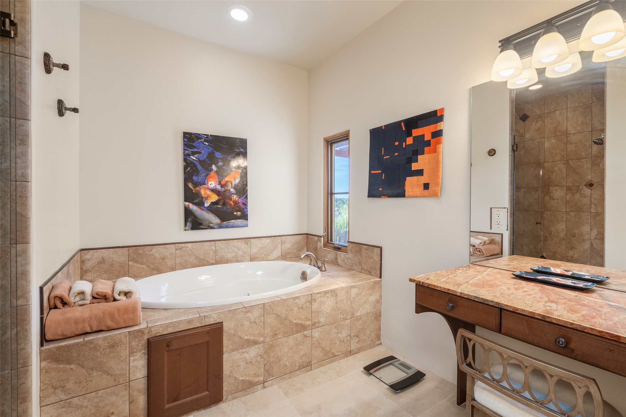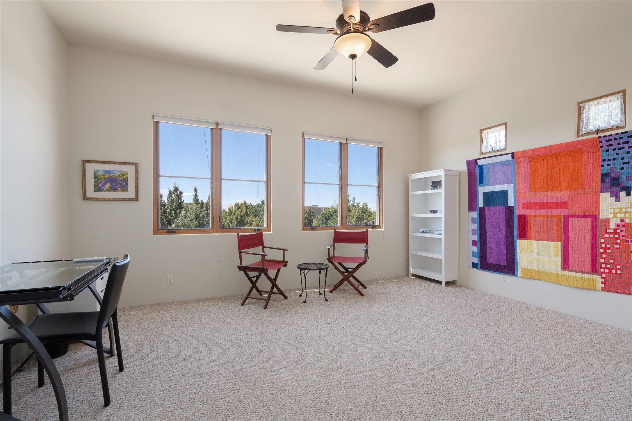 Run, don't walk to experience this outstanding new offering in the sought-after Aldea de Santa Fe. Beautifully crafted in classic Pueblo style, this home captures the essence of Santa Fe living with warmth, character, and thoughtful design throughout. A welcoming foyer opens to a spacious great room filled with natural light, where plaster walls, a beautifully crafted kiva fireplace, wood-beamed ceilings, and tile floors create an inviting and timeless aesthetic. The open kitchen is both functional and charming, featuring abundant storage, granite countertops, a stone tile backsplash, and delightful views from the kitchen sink. Designed with comfort and privacy in mind, the split-bedroom floor plan offers a generous primary suite with direct access to the rear patio. The luxurious bath includes a soaking tub, separate shower, dual vanities, and a well-sized walk-in closet. On the opposite side of the home, two additional bedrooms provide flexibility for guests or work-from-home needs, including one ensuite. Outdoor living is equally appealing, with a charming front courtyard--perfect for morning coffee--and a stone patio ideal for enjoying sunset skies and surrounding views. An oversized garage offers ample space for storage or a workshop. Recent upgrades ensure peace of mind and year-round comfort, including a brand-new roof with a transferable warranty and four newly installed mini-splits for efficient heating and cooling. This mostly single-level home (with just one step in the garage) offers ease of living in one of Santa Fe's most desirable communities.