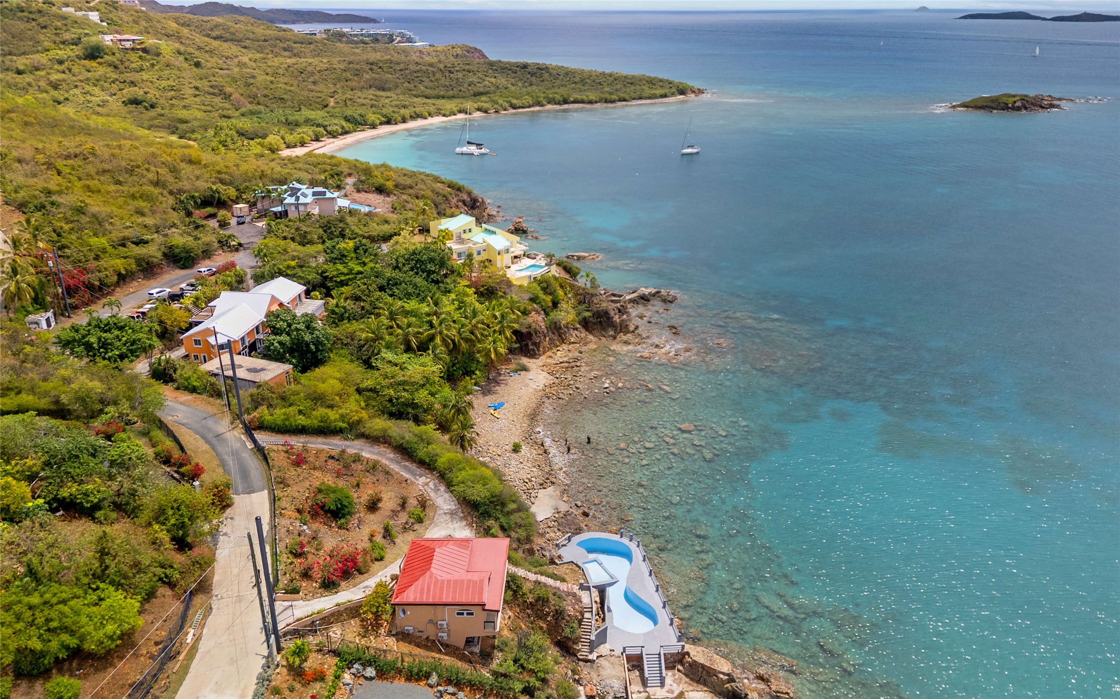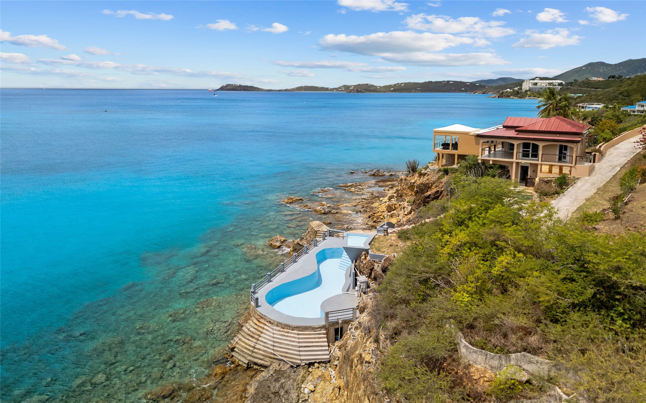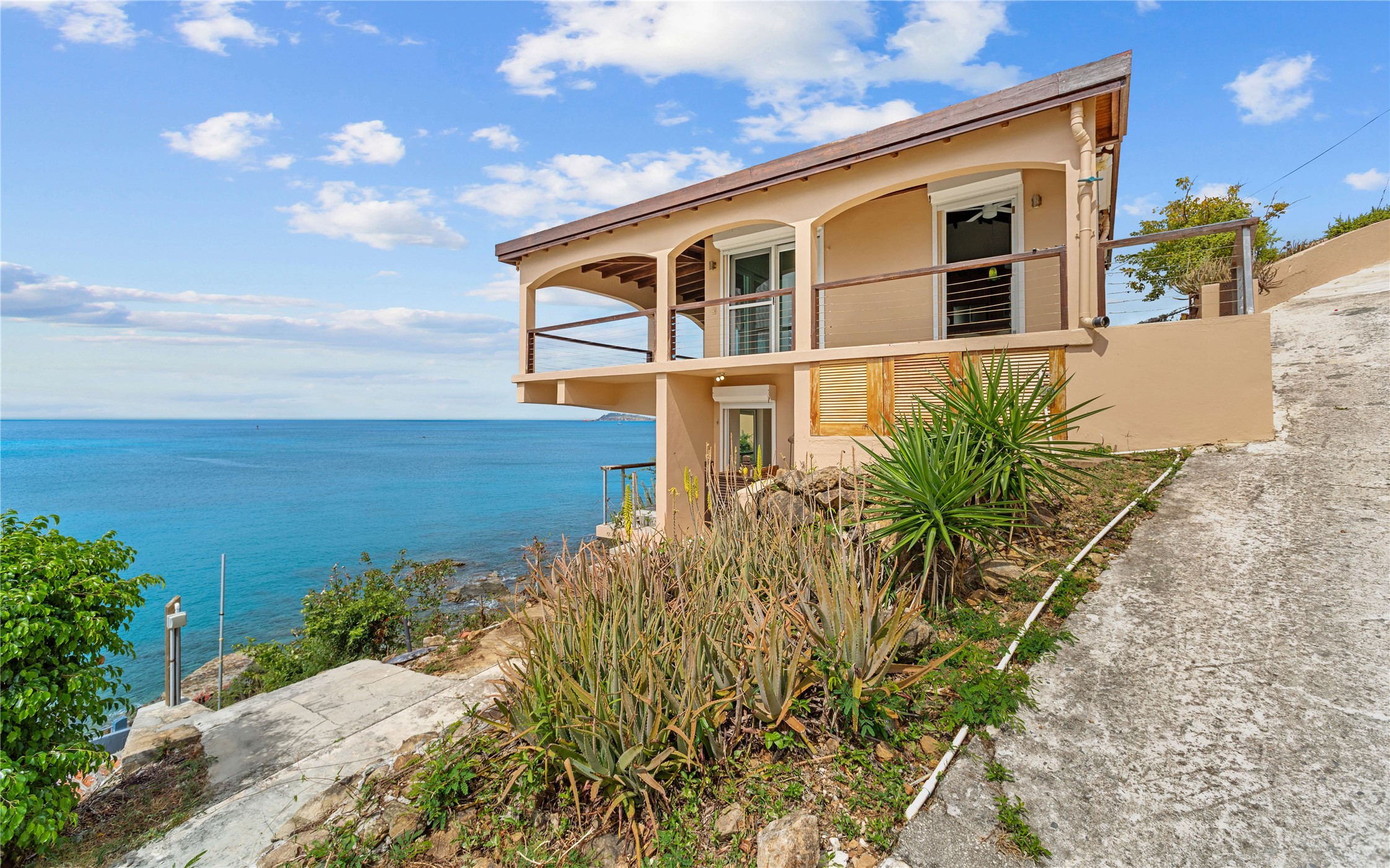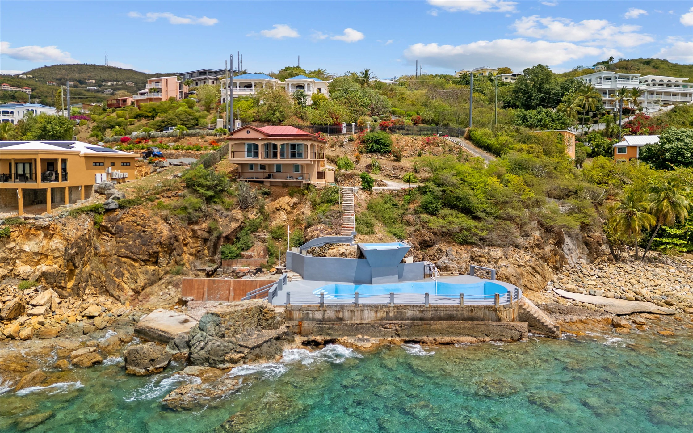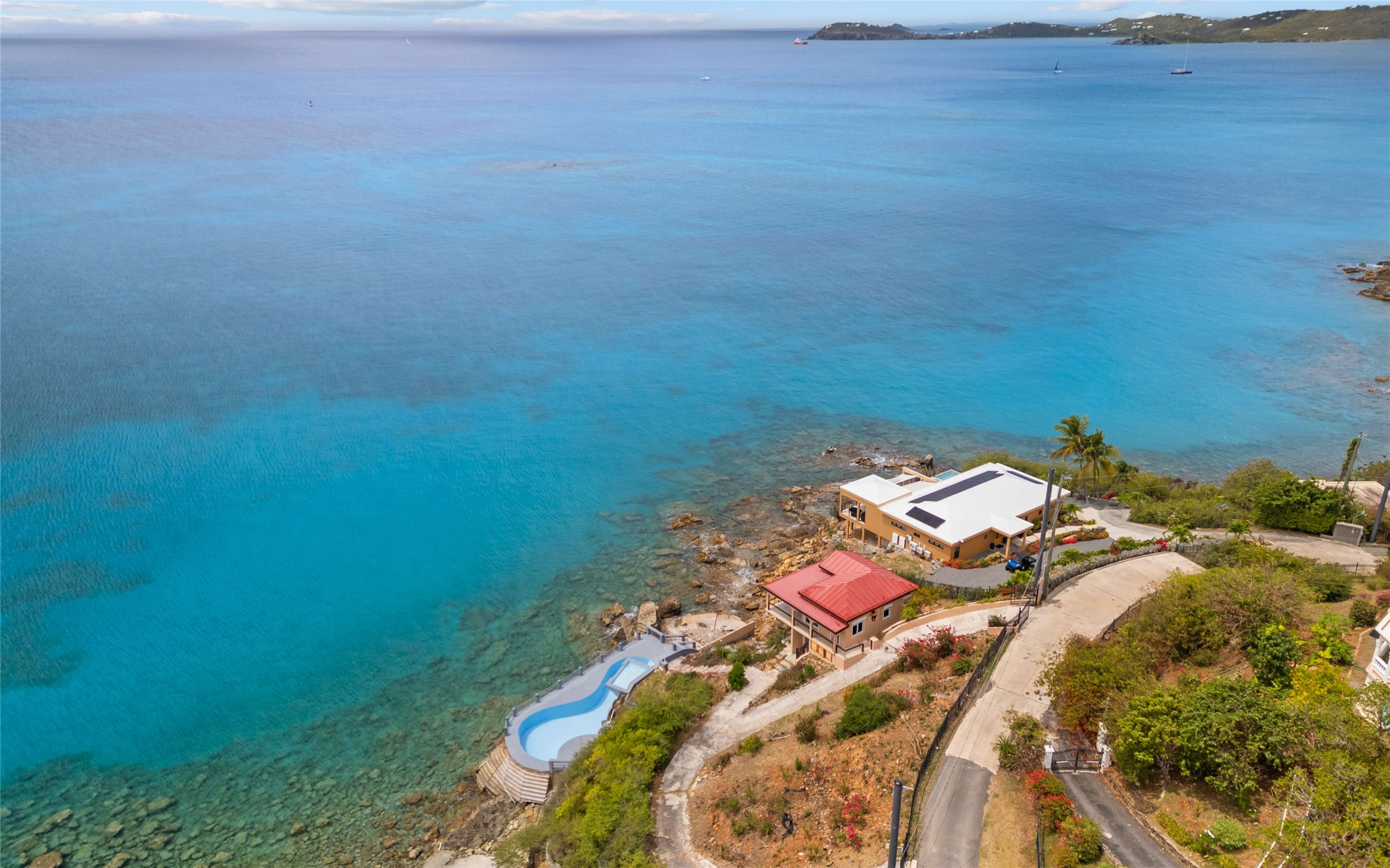Absolutely STUNNING! This is truly a one of a kind waterfront property on St Thomas, US Virgin Islands! Imagine... a charming cottage...on a gated parcel... room to expand...with your pool literally built out into the ocean! There's just no better place than floating in your pool at sea level! The cottage is solid masonry construction featuring a beautiful kitchen, open concept living surrounded by sliding doors opening to expansive ocean view decks. Vaulted tongue and groove ceilings throughout. Full one bedroom/one bath on the main level. The lower level offers second bedroom space with a full bath. Original plan was to live in the cottage while building your dream villa on the remainder of the generous parcel. It's beautifully imagined as is too. The pool... what's not to love! The best of island living.
