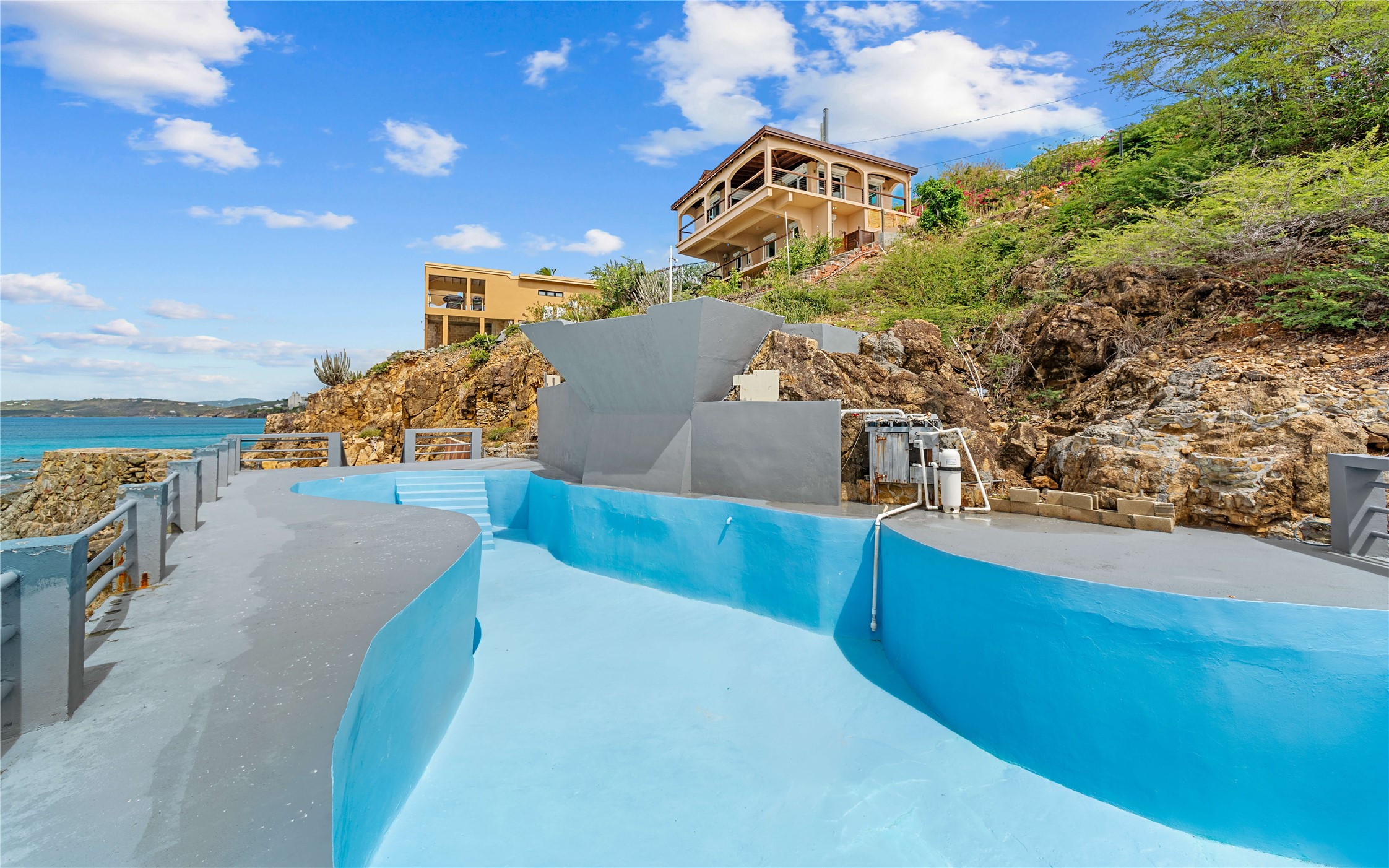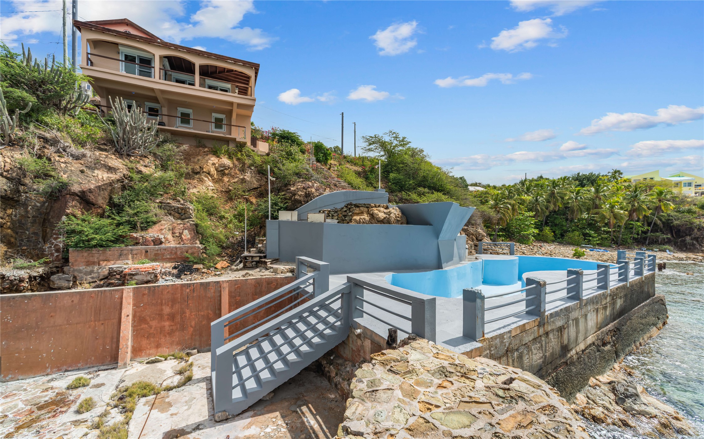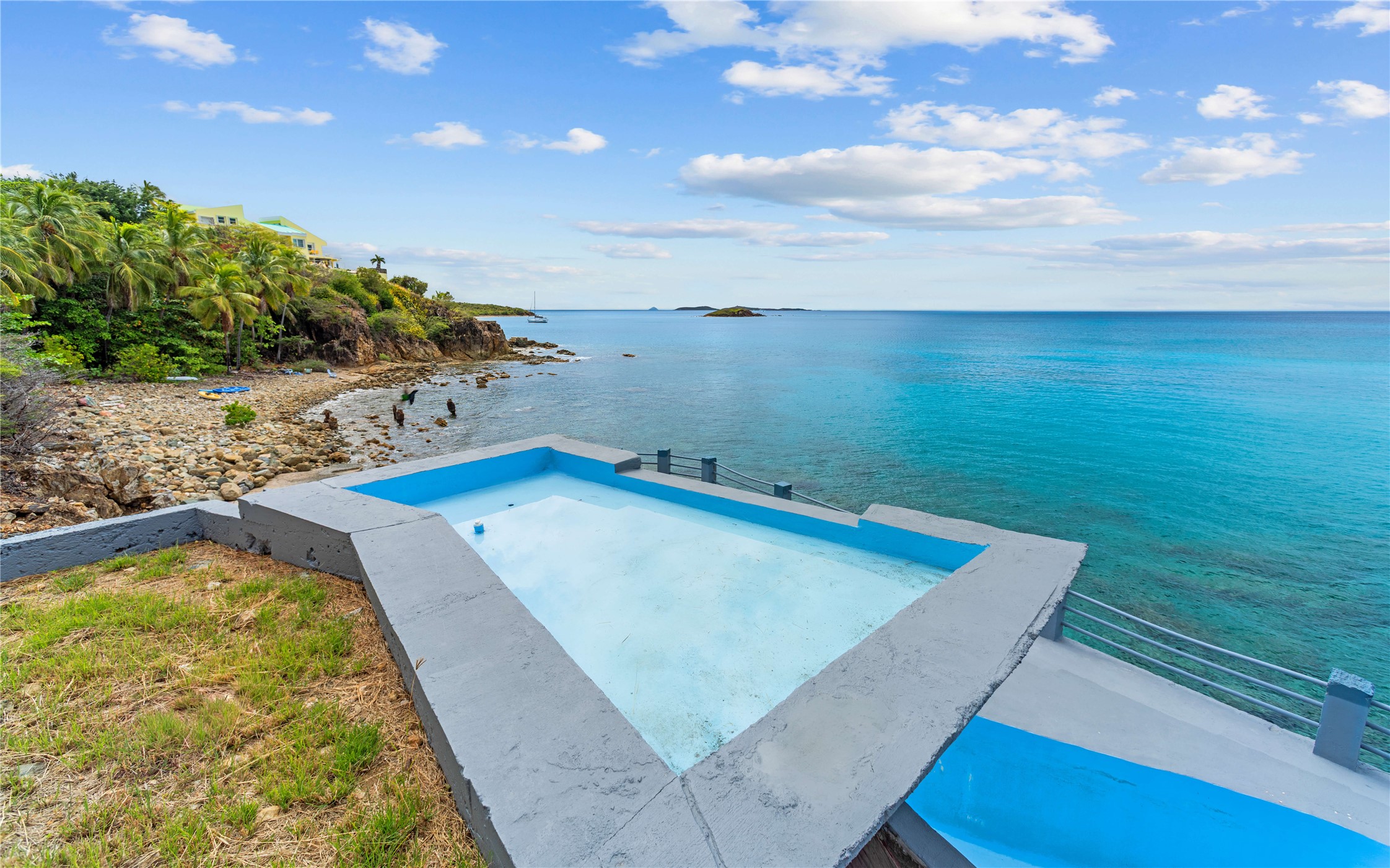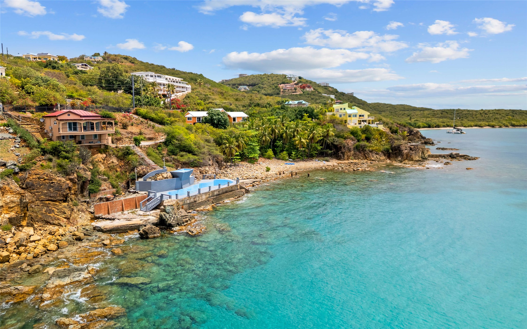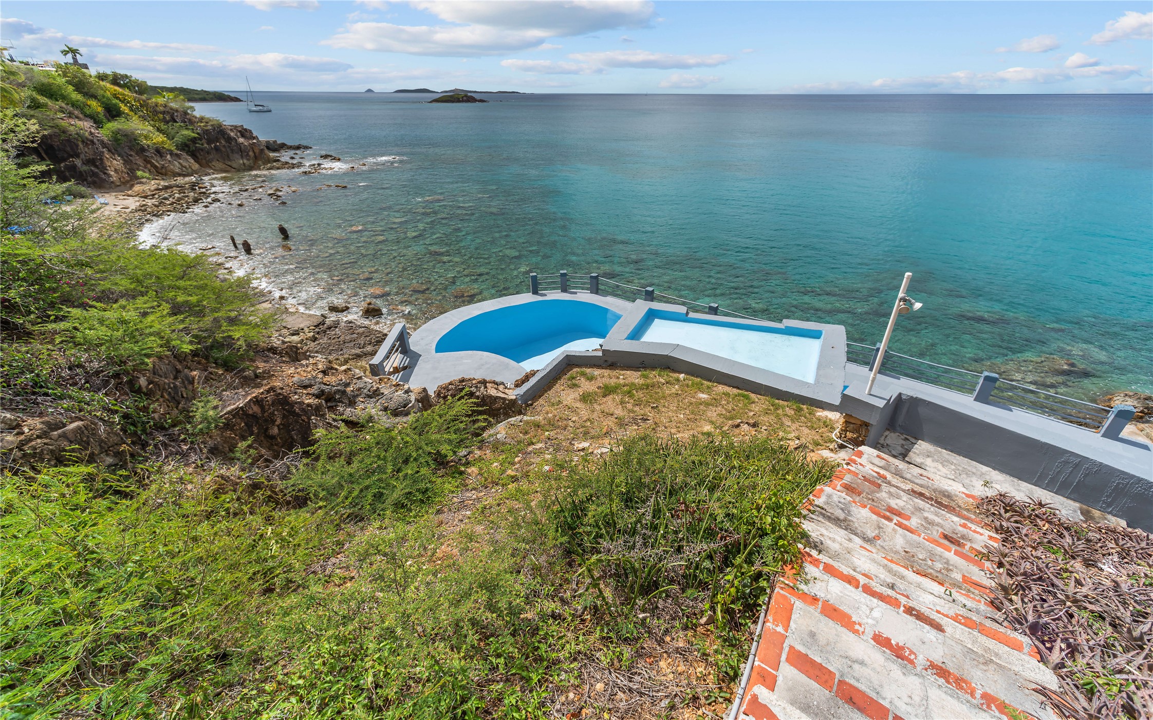 Absolutely STUNNING! This is truly a one of a kind waterfront property on St Thomas, US Virgin Islands! Imagine... a charming cottage...on a gated parcel... room to expand...with your pool literally built out into the ocean! There's just no better place than floating in your pool at sea level! The cottage is solid masonry construction featuring a beautiful kitchen, open concept living surrounded by sliding doors opening to expansive ocean view decks. Vaulted tongue and groove ceilings throughout. Full one bedroom/one bath on the main level. The lower level offers second bedroom space with a full bath. Original plan was to live in the cottage while building your dream villa on the remainder of the generous parcel. It's beautifully imagined as is too. The pool... what's not to love! The best of island living.