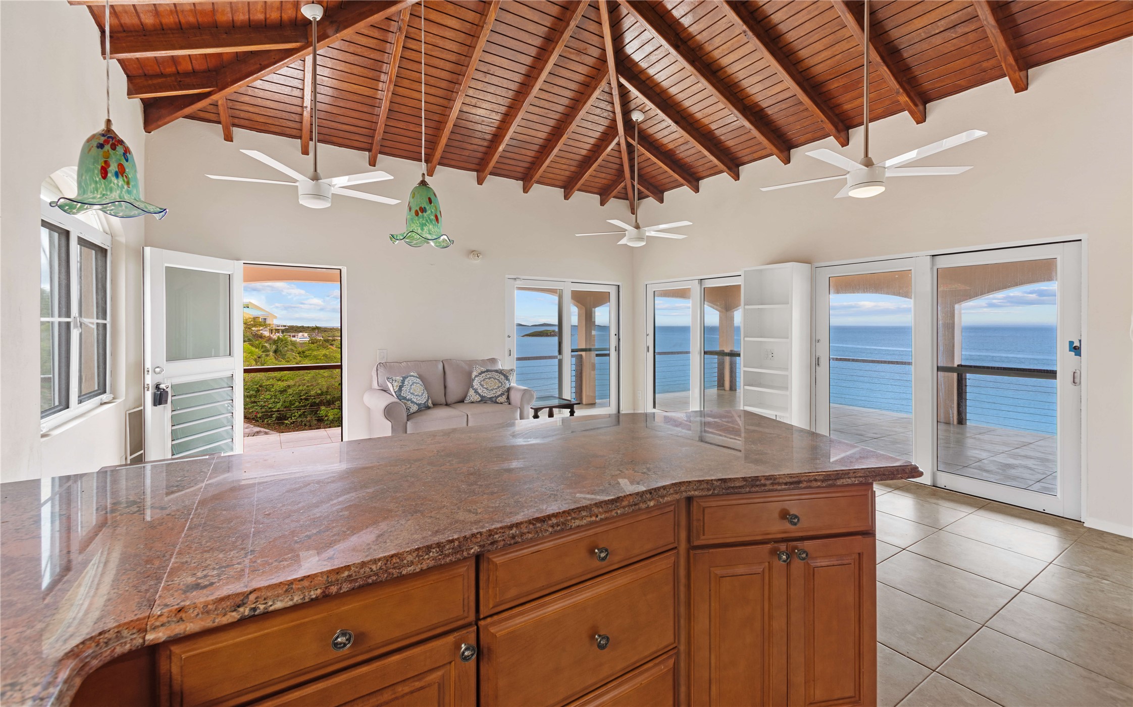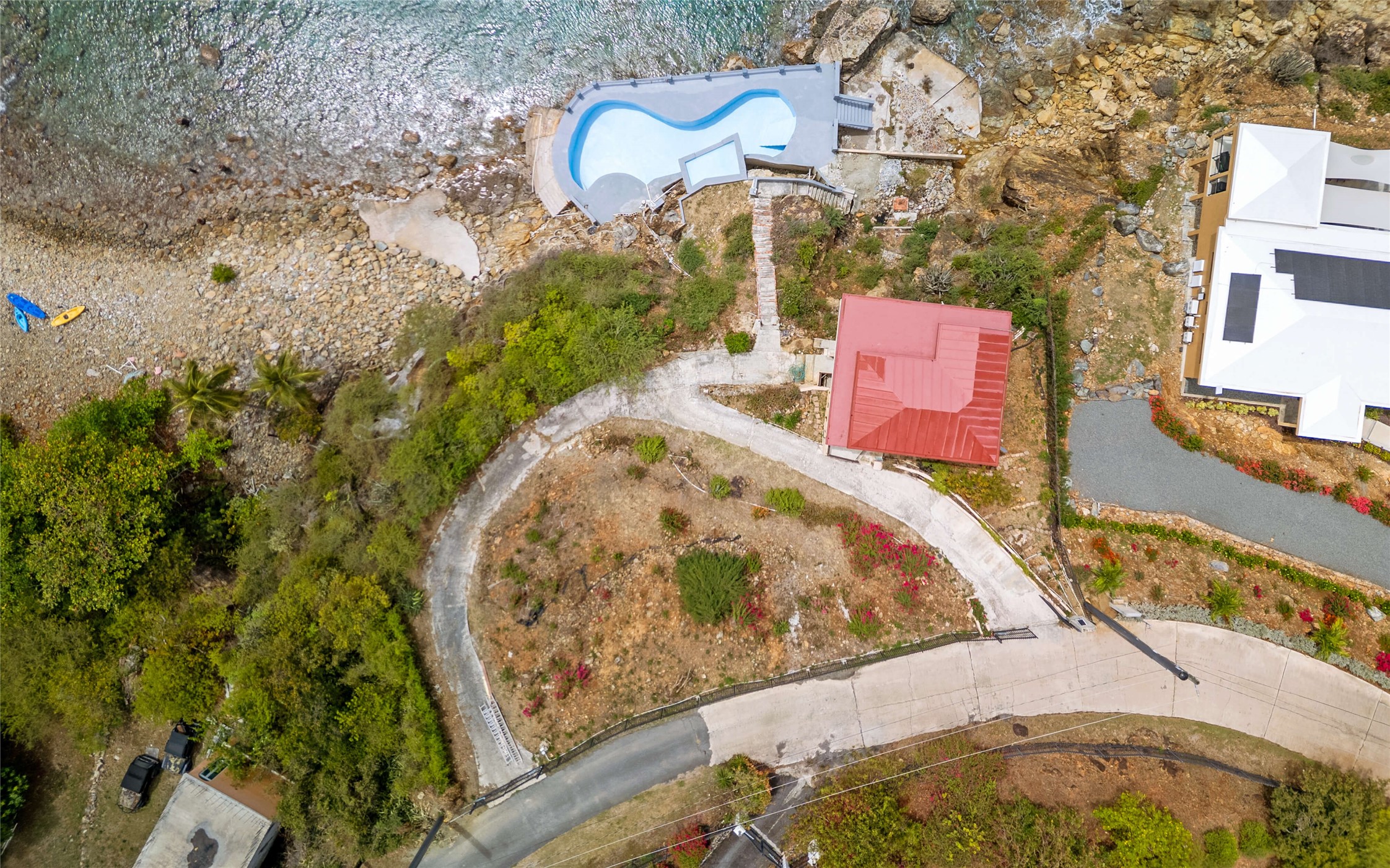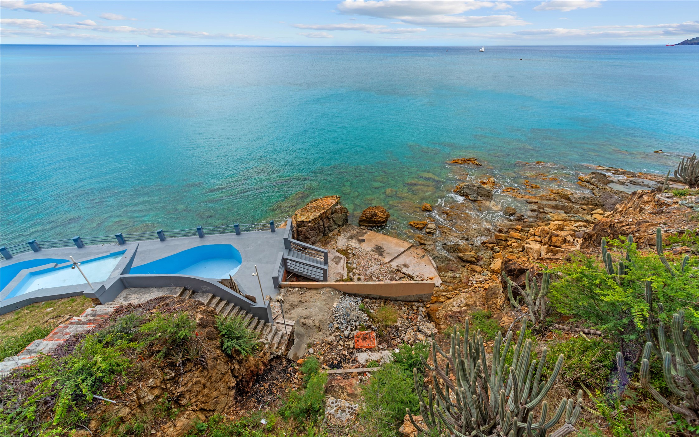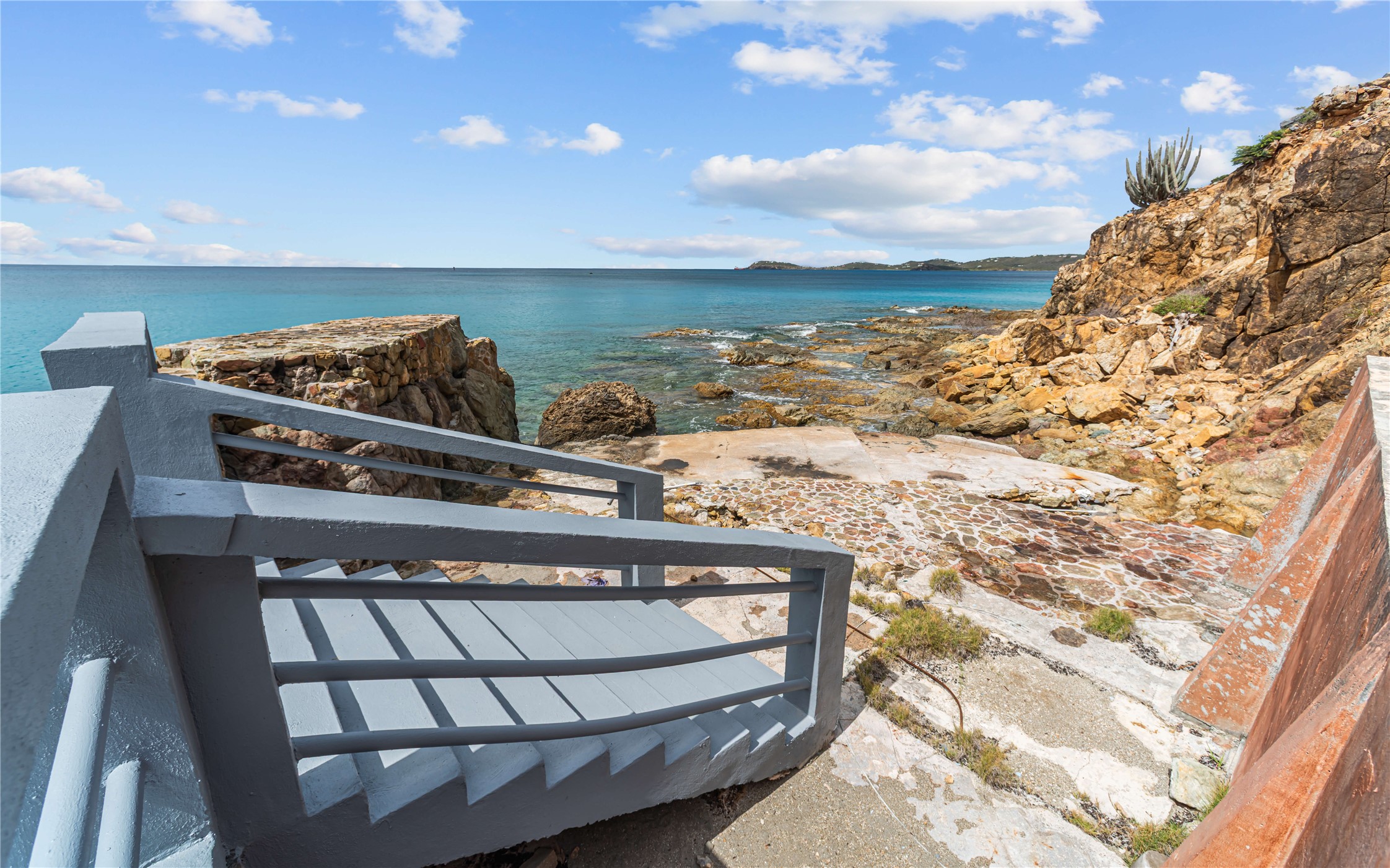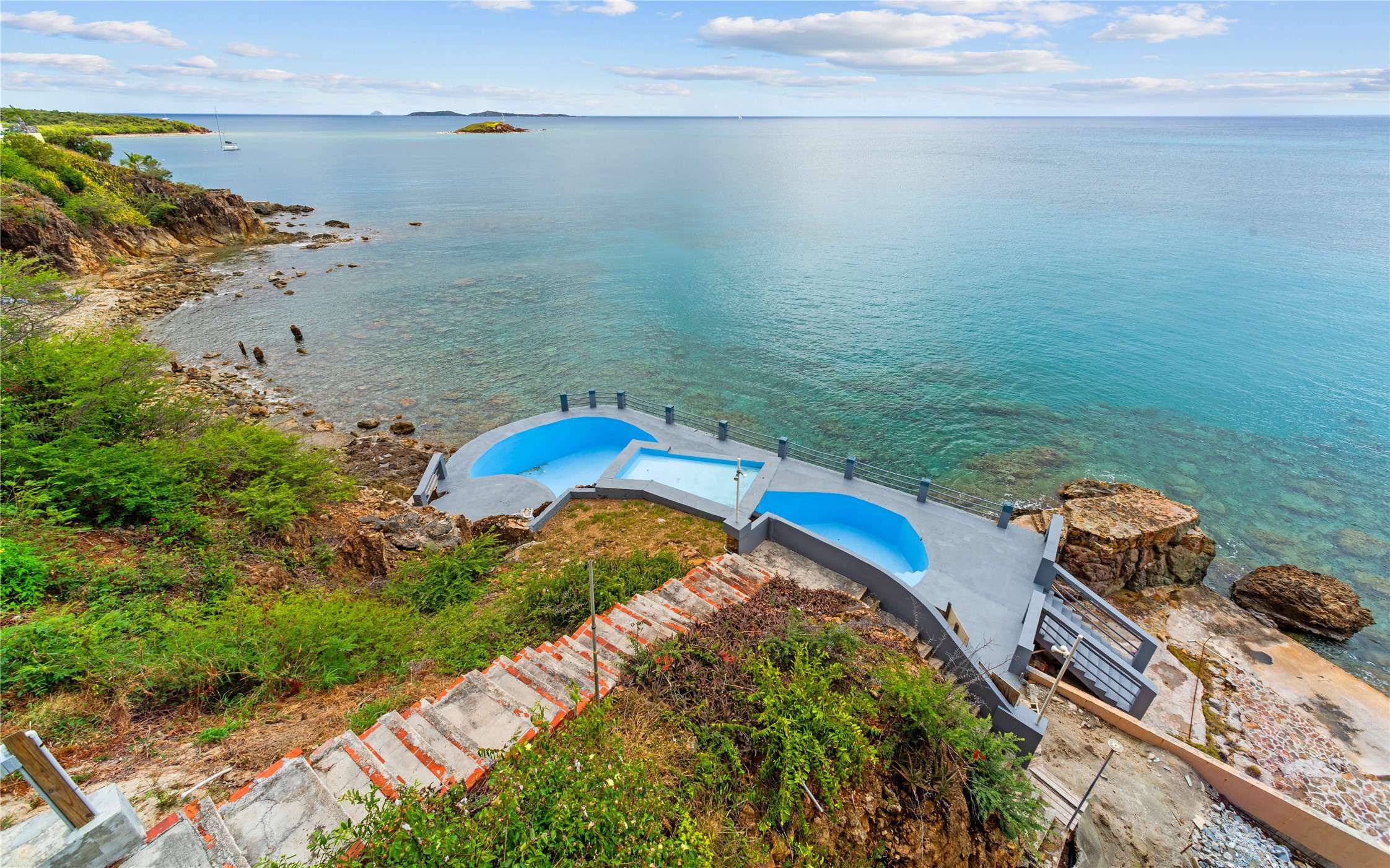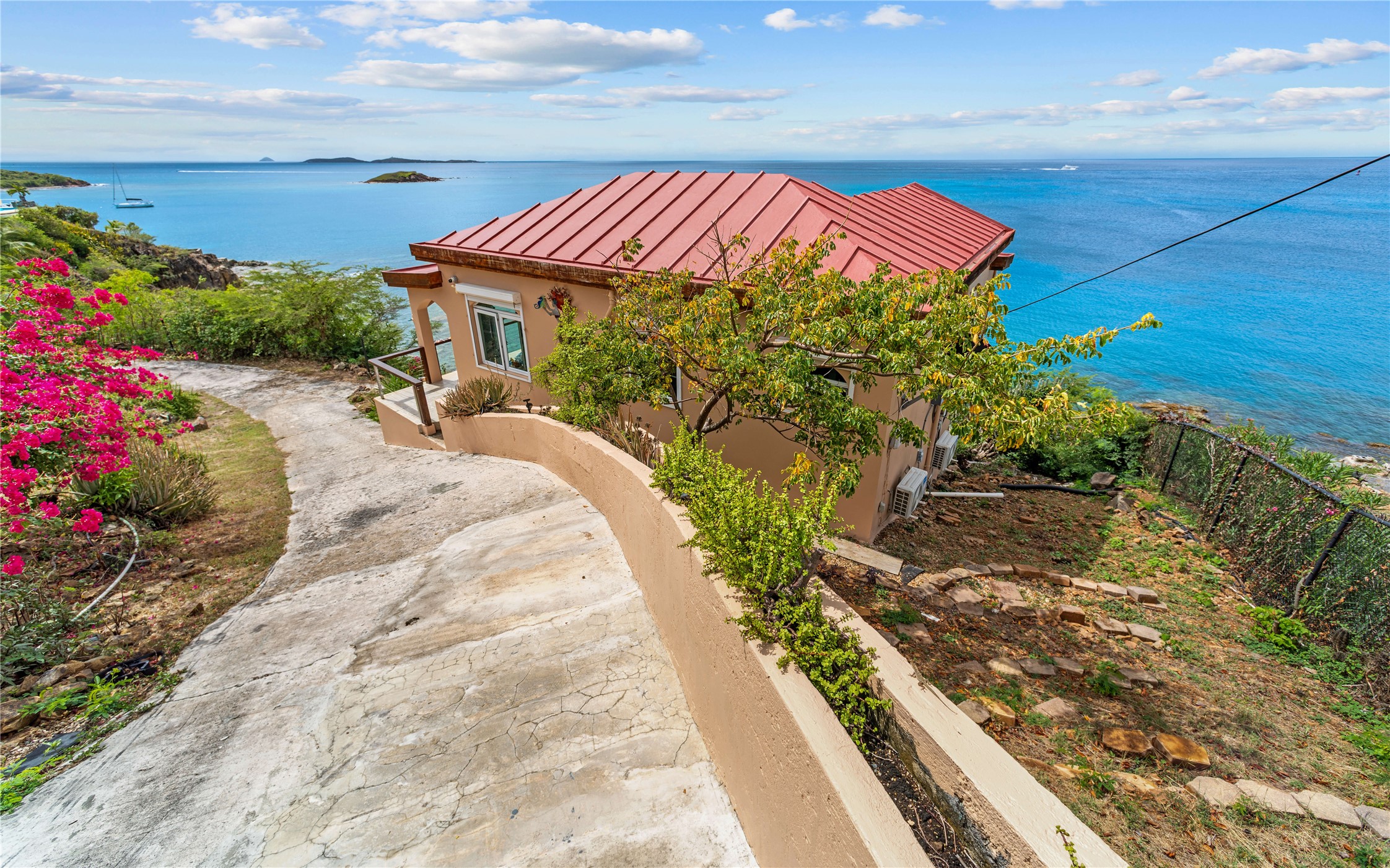 Absolutely STUNNING! This is truly a one of a kind waterfront property on St Thomas, US Virgin Islands! Imagine... a charming cottage...on a gated parcel... room to expand...with your pool literally built out into the ocean! There's just no better place than floating in your pool at sea level! The cottage is solid masonry construction featuring a beautiful kitchen, open concept living surrounded by sliding doors opening to expansive ocean view decks. Vaulted tongue and groove ceilings throughout. Full one bedroom/one bath on the main level. The lower level offers second bedroom space with a full bath. Original plan was to live in the cottage while building your dream villa on the remainder of the generous parcel. It's beautifully imagined as is too. The pool... what's not to love! The best of island living.