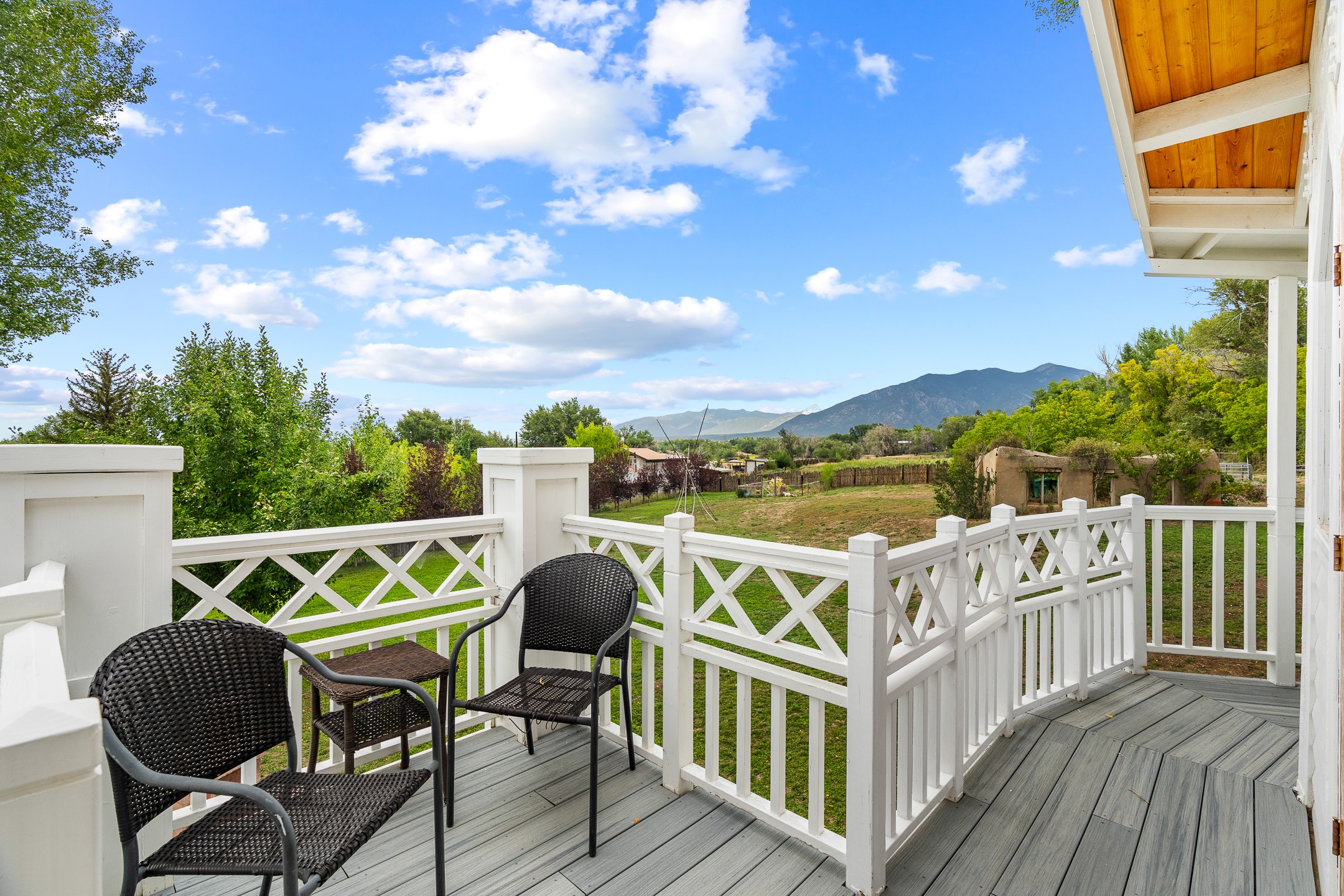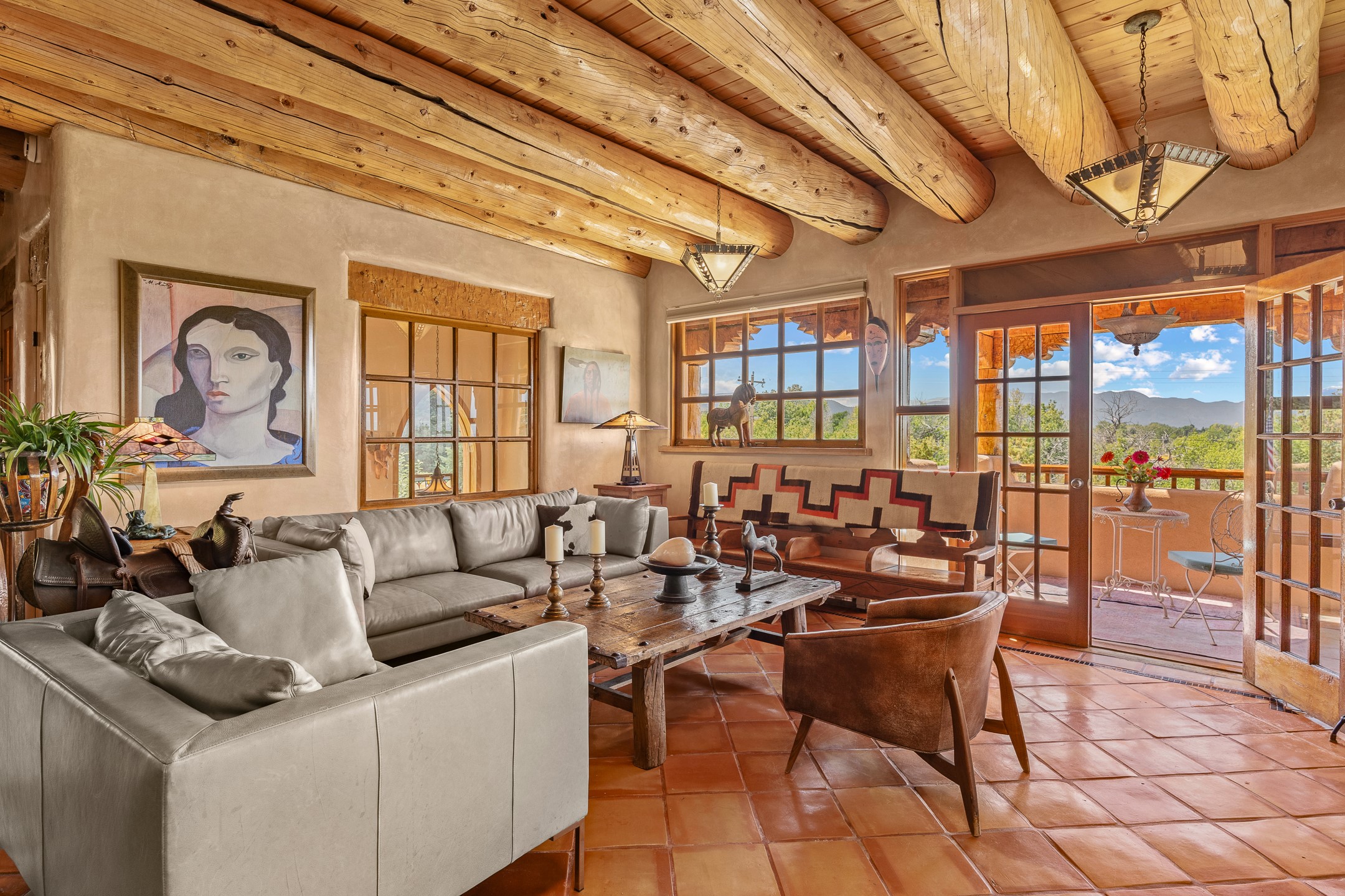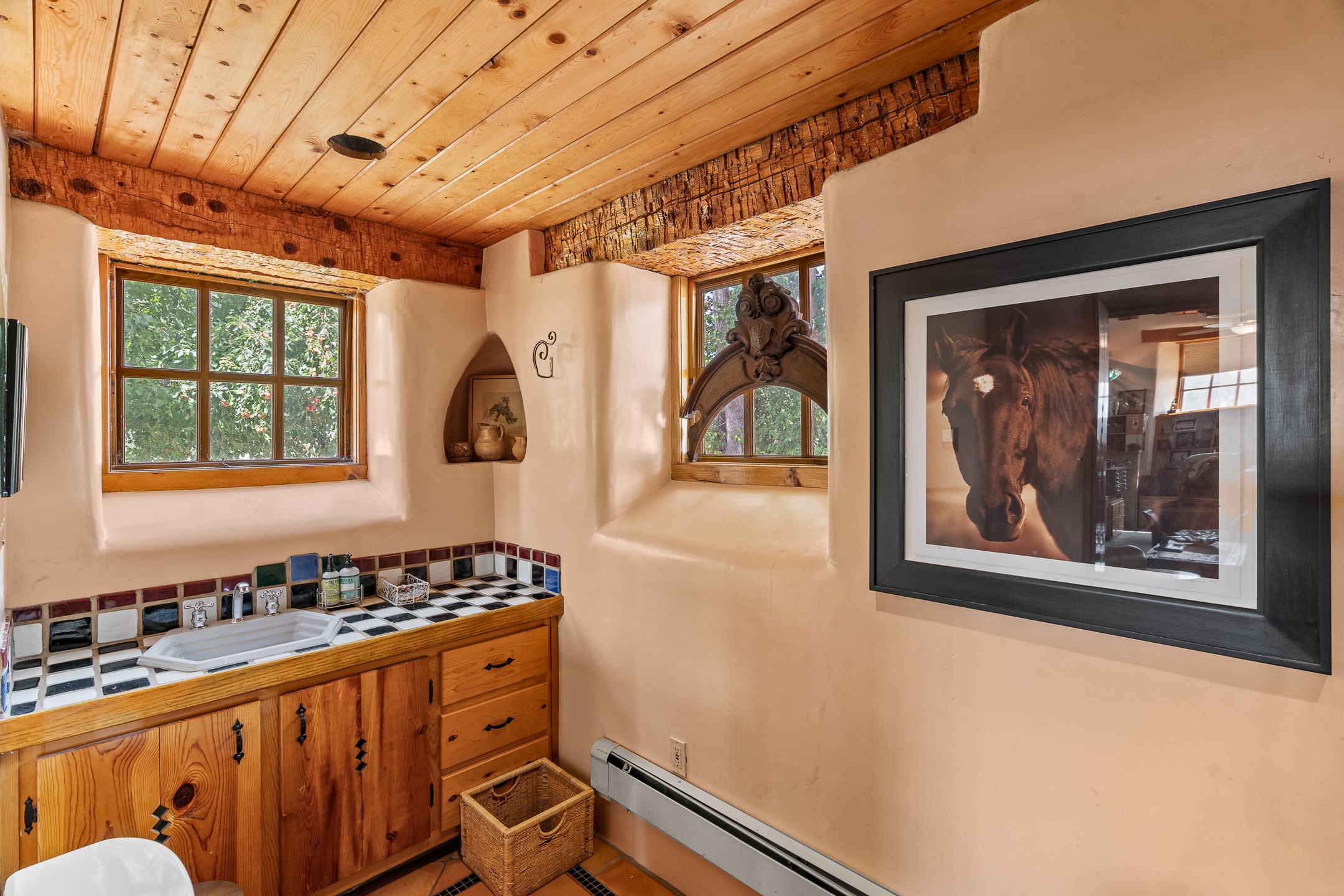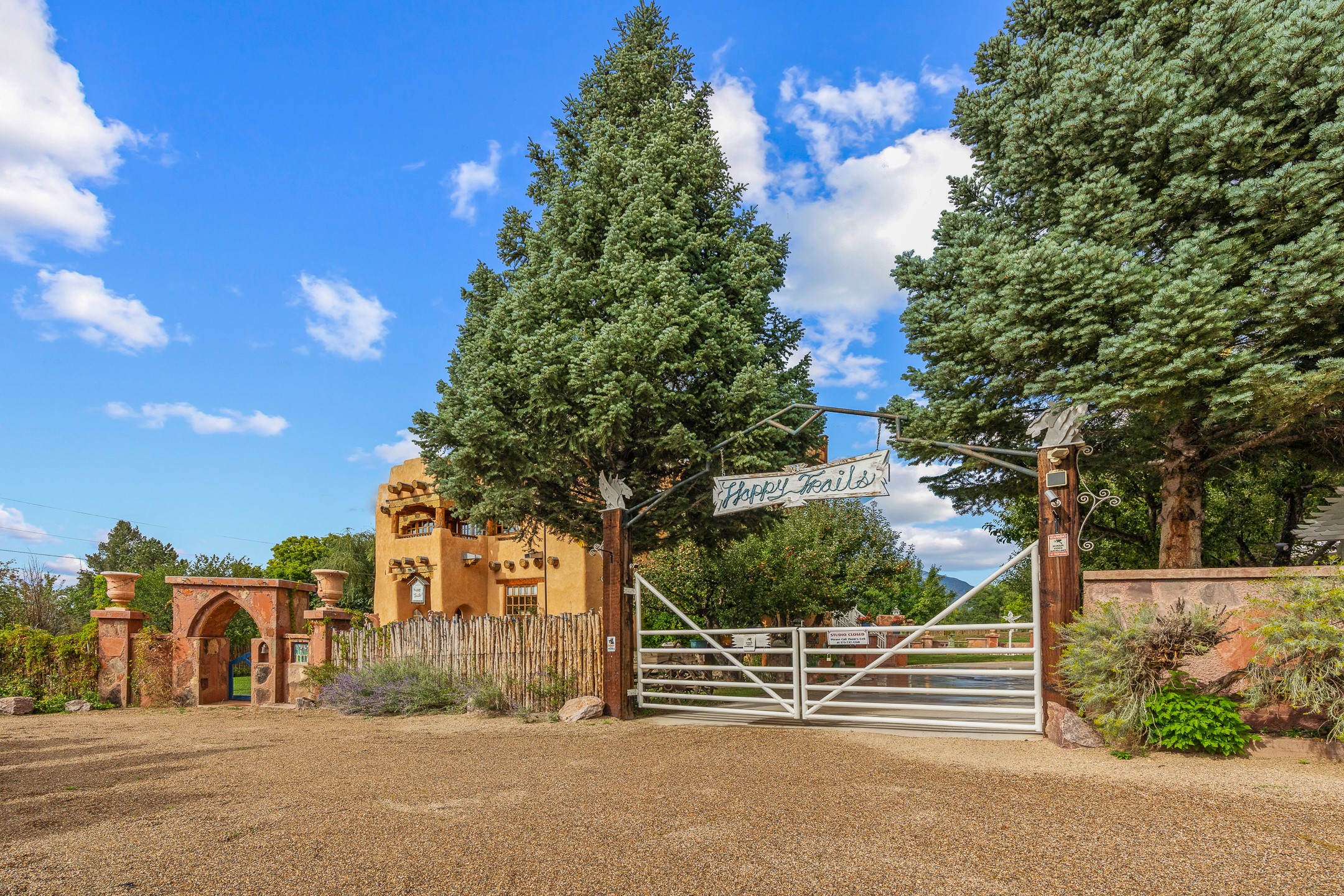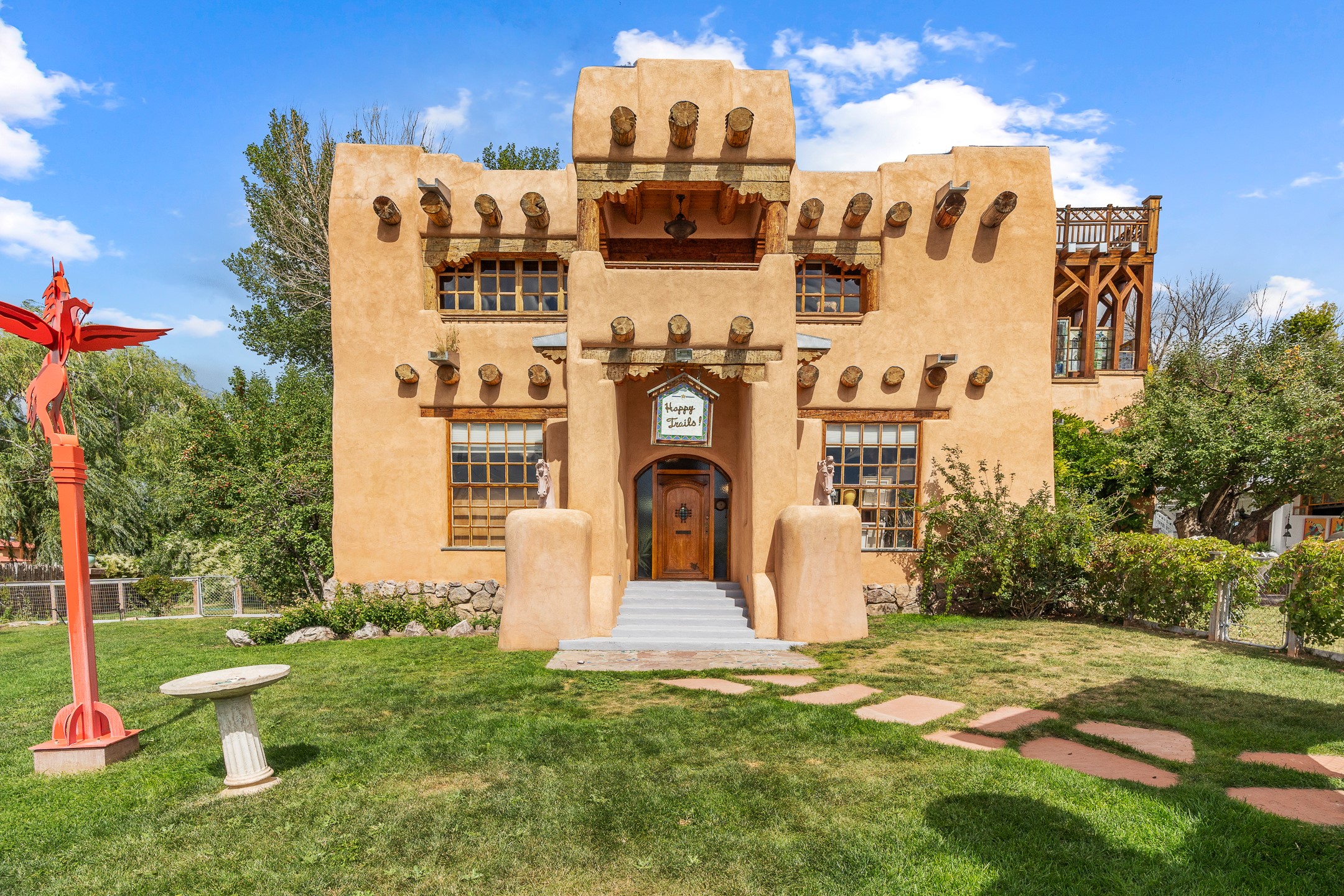 A rare and soulful Northern New Mexico compound, this extraordinary property blends history, artistry, and lifestyle in a way few offerings can. Created by acclaimed Sculptor Thom Wheeler, the main home and gallery spaces are built of authentic adobe and defined by massive pine vigas harvested from Wheeler Peak and hand-hewn by Wheeler himself. Throughout the property, irreplaceable architectural details and storied artisan pieces create a setting of warmth, character, and distinction, including stained glass windows sourced from churches across America and the original fight bell from Madison Square Garden. The main residence offers 2 bedrooms and 2.5 baths, while the guest house features 2 bedrooms and 2 baths with separate private entrances, creating flexibility for extended living, guest accommodations, boutique hospitality, or a refined live/work compound. Rich with heritage, the property also includes an adobe structure dating to 1840, built by Juan Santistevenson, adding yet another layer of authenticity and cultural significance. Set on two separately deeded lots totaling nearly 1.7 acres, the grounds are equally captivating. A 3 acre-foot well, surface water rights, and an acequia running through the property enhance both beauty and value. Near the acequia, an outdoor kitchen and entertaining area create an unforgettable setting for gatherings beneath the New Mexico sky. Zoned for both residential and commercial use, the possibilities are exceptional: an elegant private residence, gallery or studio compound, boutique inn or B&B, event venue, or investment opportunity with future subdivision potential. Timeless, inspiring, and deeply rooted in place, this is more than a property--it is an experience.