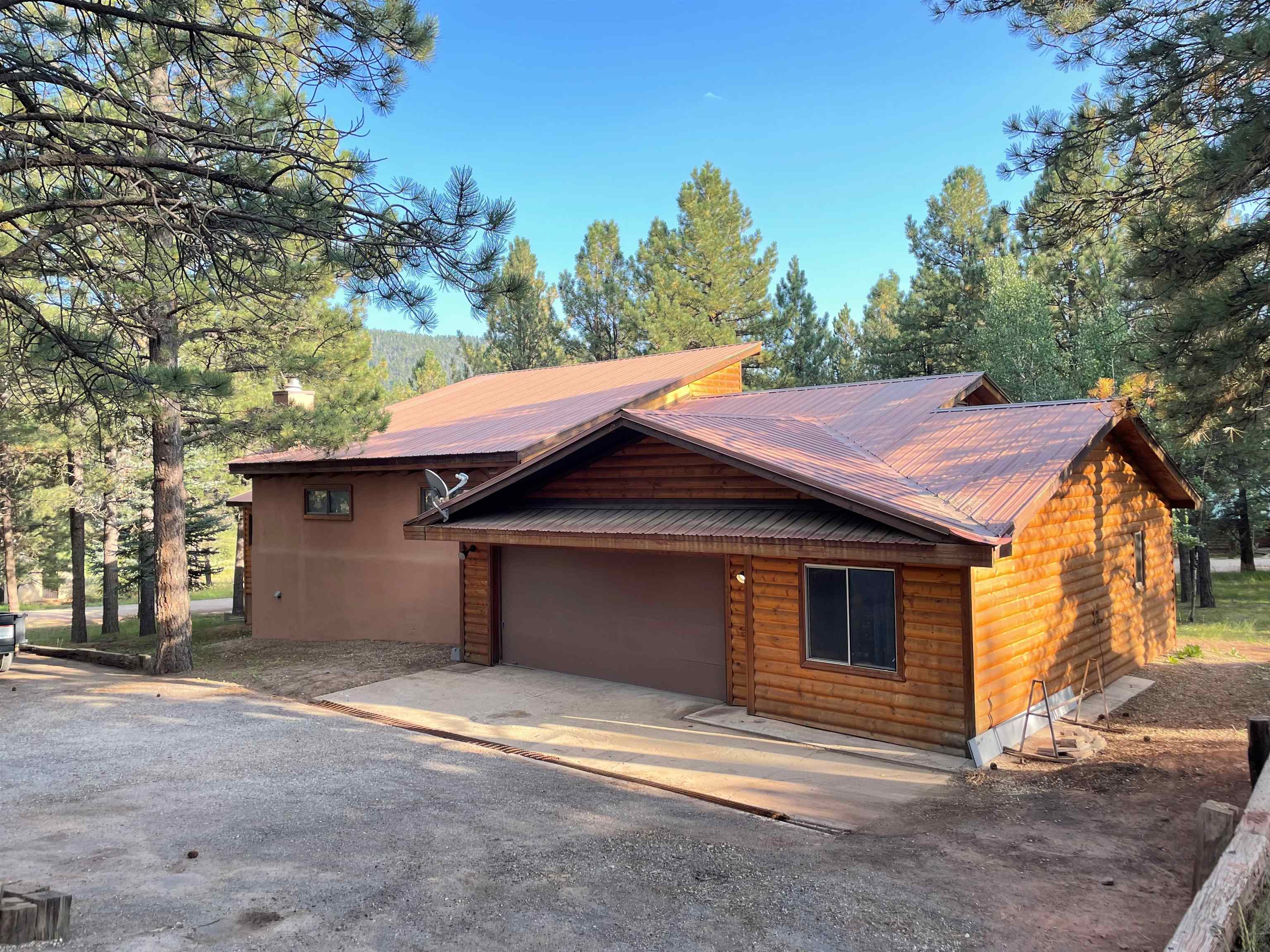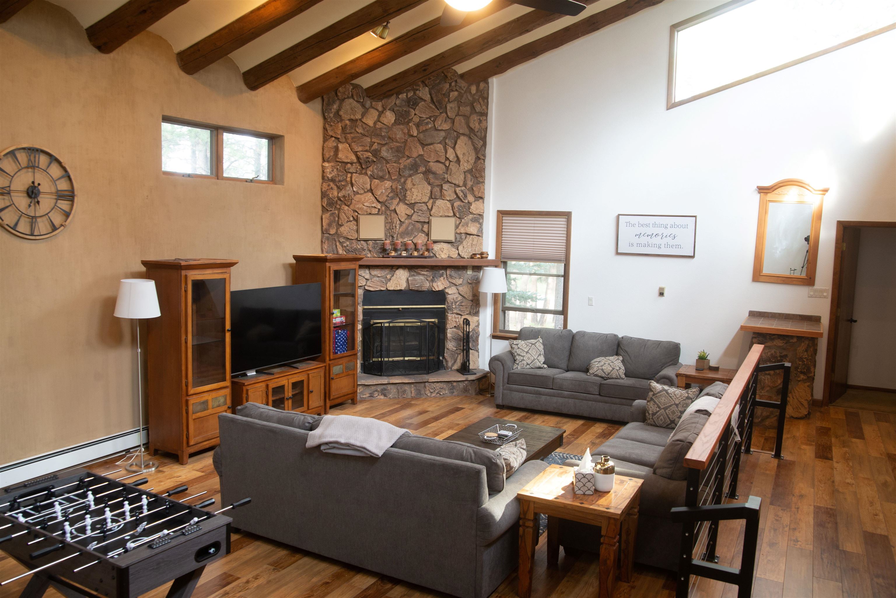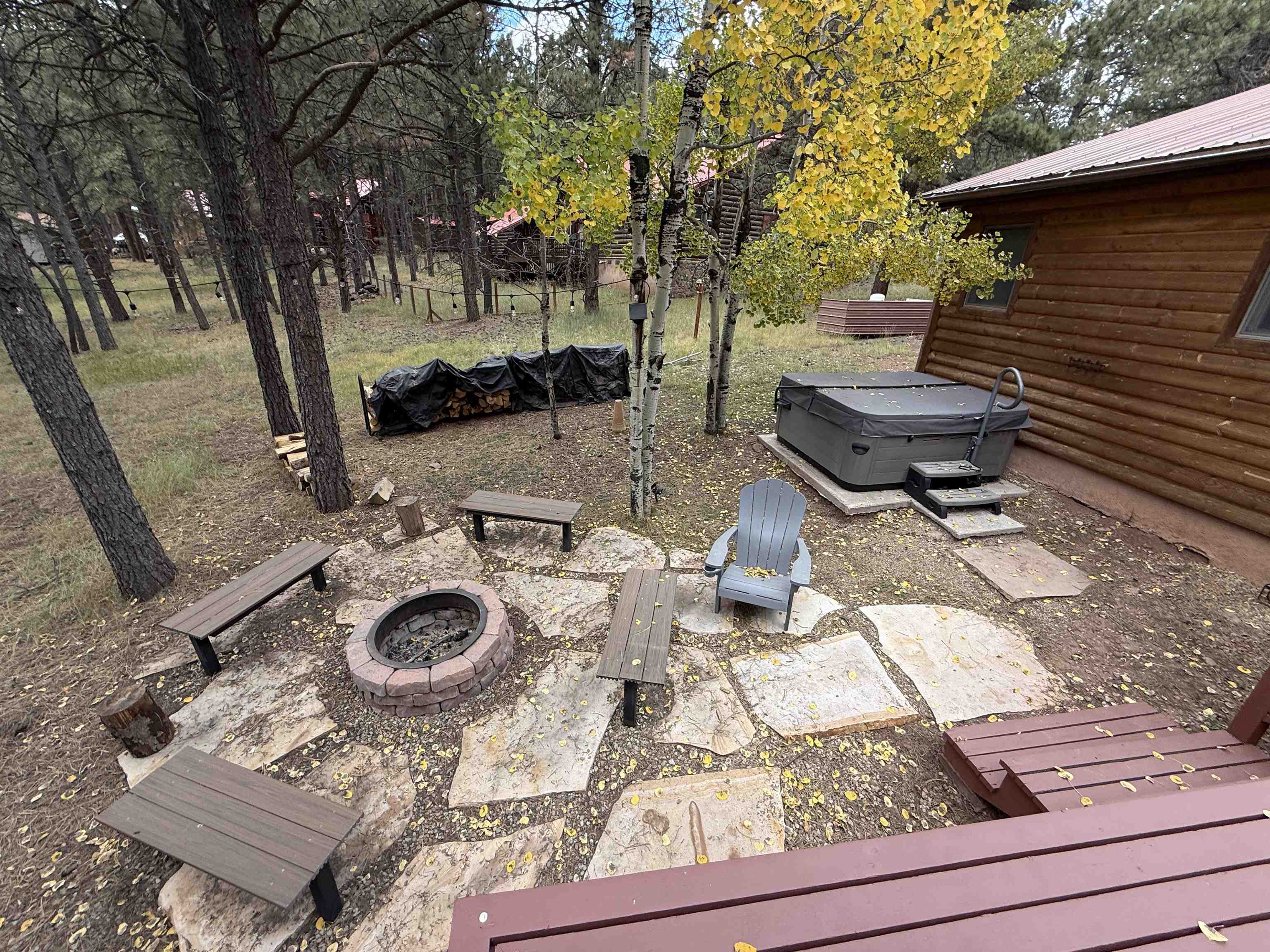 Beautiful getaway in Angel Fire only 1.7 mi from the ski base and 0.8mi from the country club and PGA golf course. Paved roads to both driveways on this incredible corner lot. The home has an extremely large living room with carved beams, wood fireplace, with overlooking kitchen and dining area for a dream entertaining area. Three Bedrooms with new Laminate flooring, remodeled doors as of 9/25/2025 and quartz countertops throughout. All items down to the dishes will remain with a few exceptions. Outside is a large deck with wrap around seating, leading to a comfy fire pit with built-in seating and a nearly new bullfrog spa. Can be accessed via the garage without any steps/stairs. On city sewage and has a new combi boiler/tankless water heater. Priced to sell quickly, don't miss out!