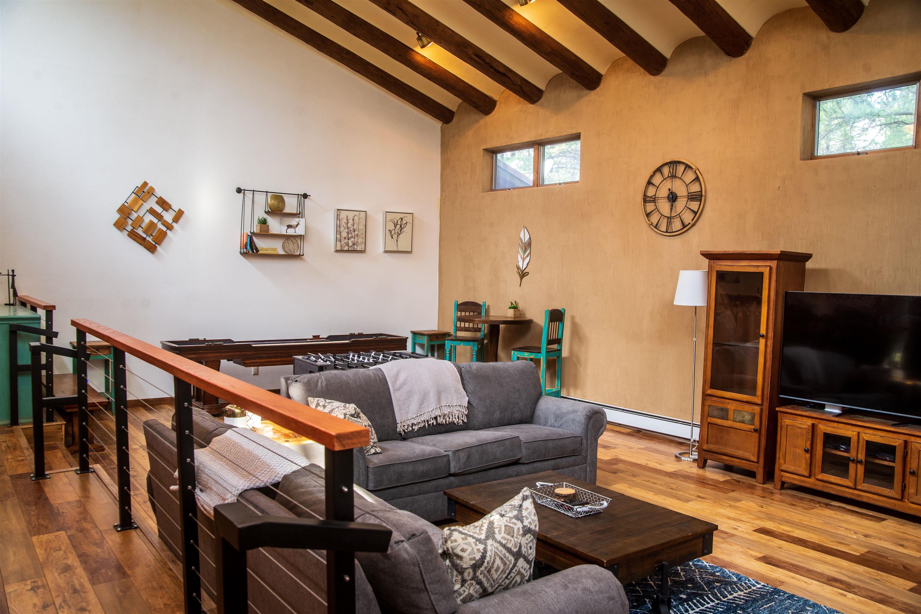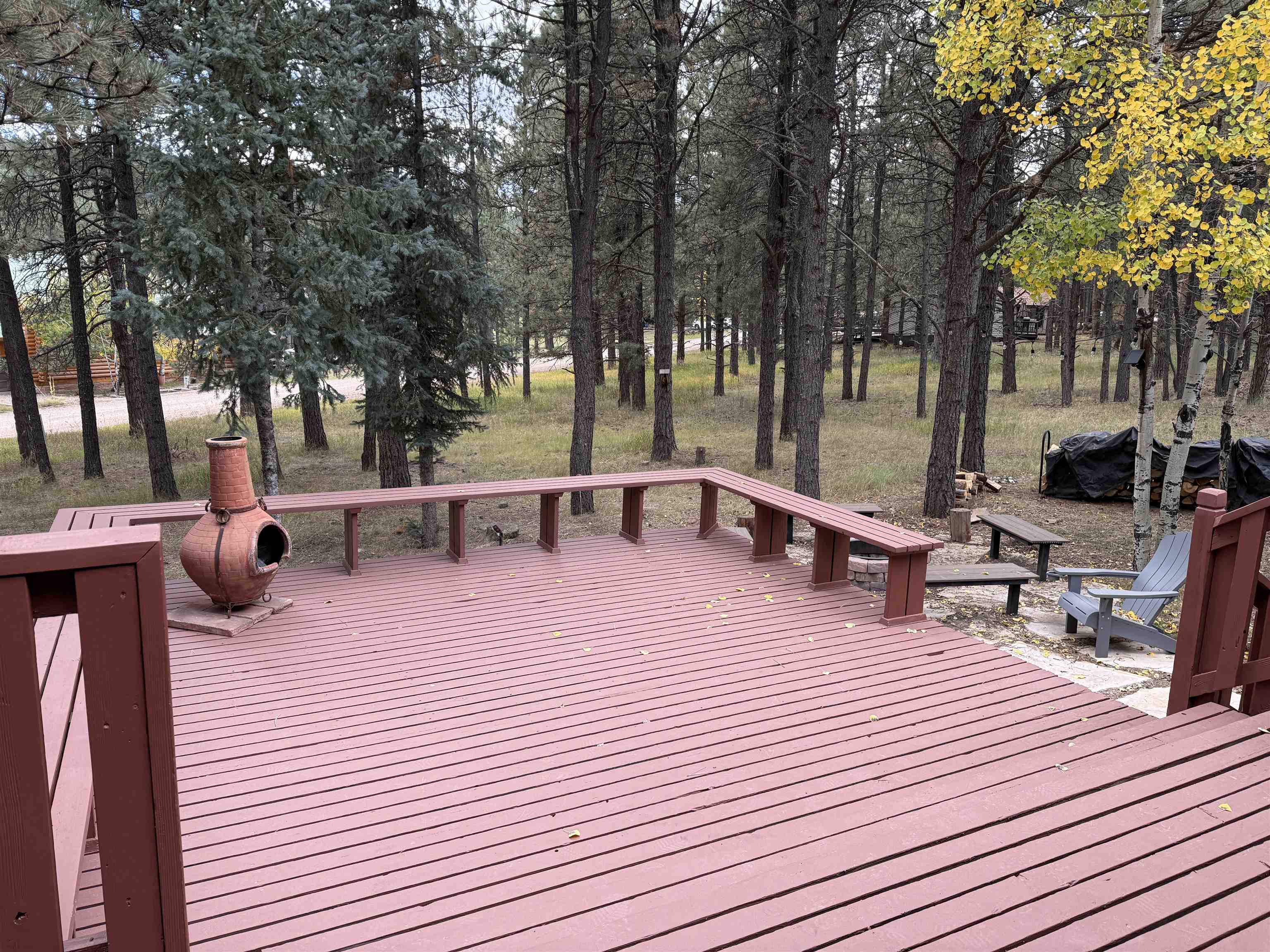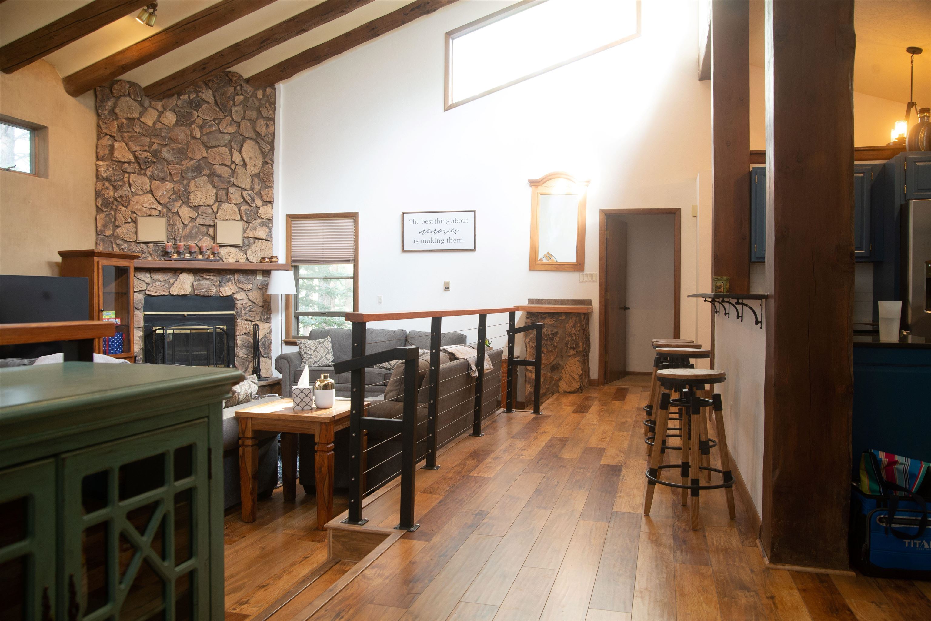 Beautiful getaway in Angel Fire only 1.7 mi from the ski base and 0.8mi from the country club and PGA golf course. Paved roads to both driveways on this incredible corner lot. The home has an extremely large living room with carved beams, wood fireplace, with overlooking kitchen and dining area for a dream entertaining area. Three Bedrooms with new Laminate flooring, remodeled doors as of 9/25/2025 and quartz countertops throughout. All items down to the dishes will remain with a few exceptions. Outside is a large deck with wrap around seating, leading to a comfy fire pit with built-in seating and a nearly new bullfrog spa. Can be accessed via the garage without any steps/stairs. On city sewage and has a new combi boiler/tankless water heater. Priced to sell quickly, don't miss out!