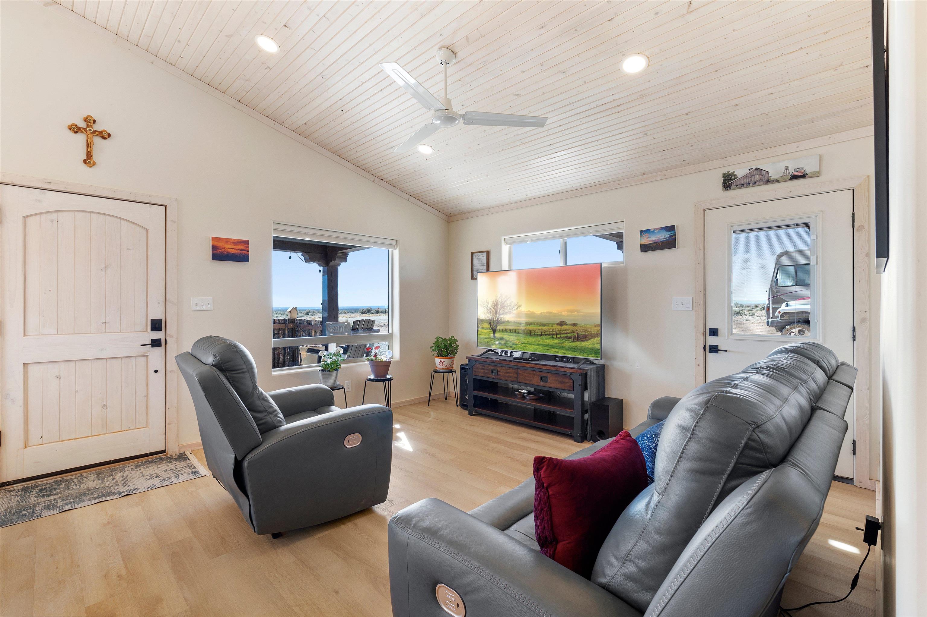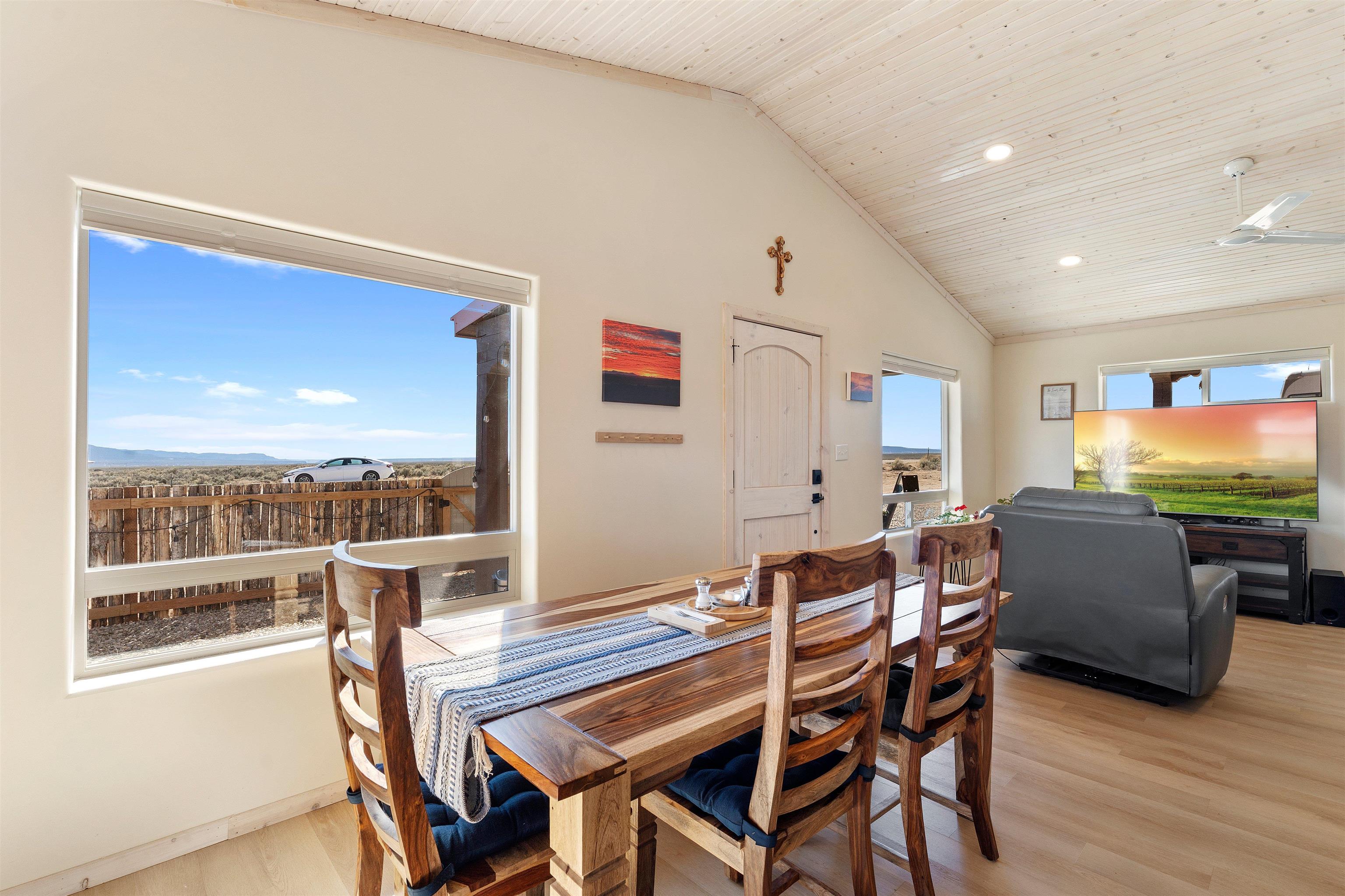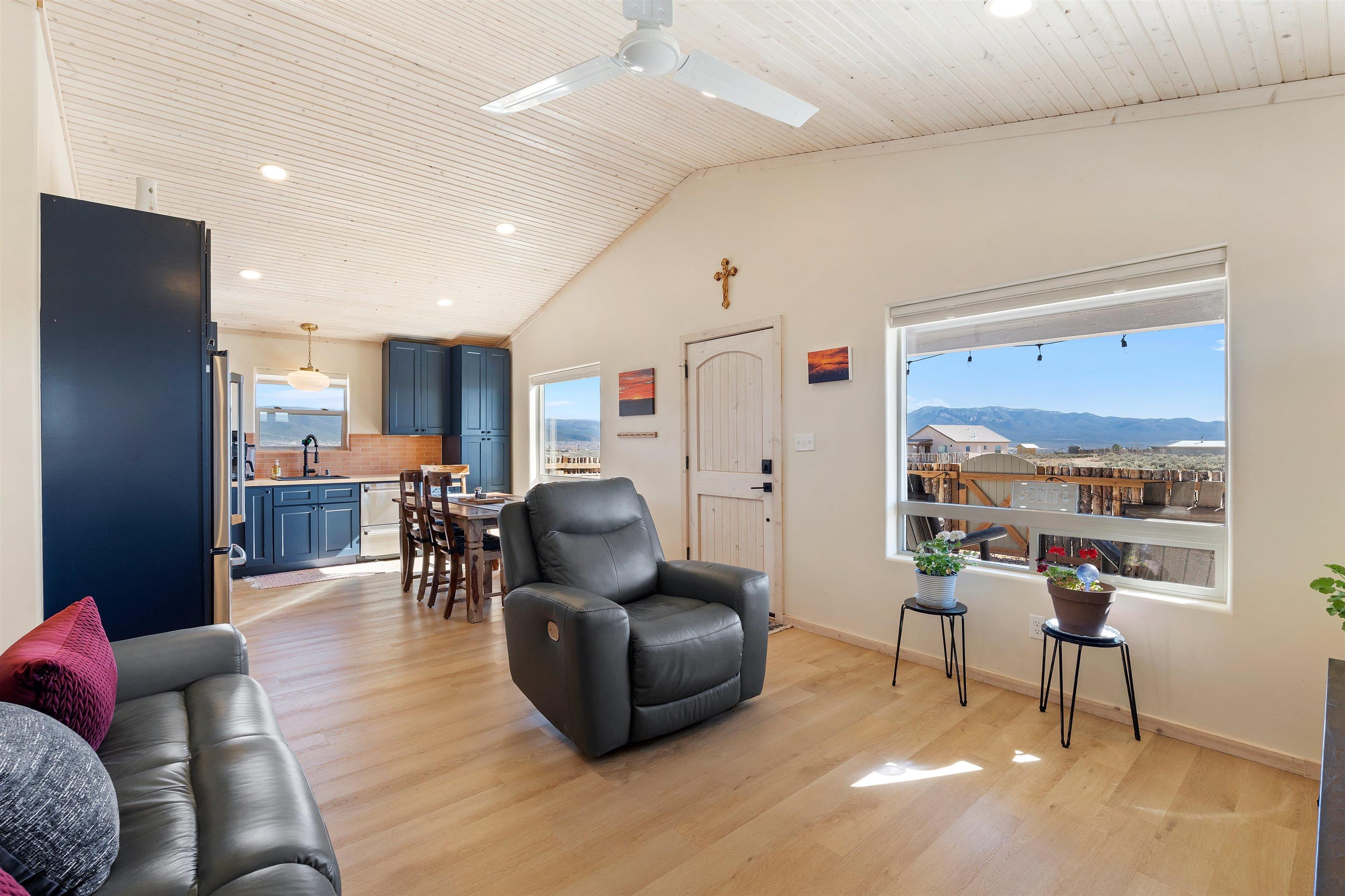 $5,000 seller credit with acceptable offer! Unbelievable views! Perfect for watching those beautiful morning sunrises and evening sunsets! This cute country home has an updated light and bright kitchen with stainless steel appliances and butcher block countertops, 2 bedrooms and 2 baths with all the space for your toys! Home is energy efficient with radiant floor heating, natural gas with NM gas company, Electric with Kit Carson, and internet with Taos net! Ceiling fans with dimmer lights throughout and blinds open from top or bottom. Come see this beauty today!