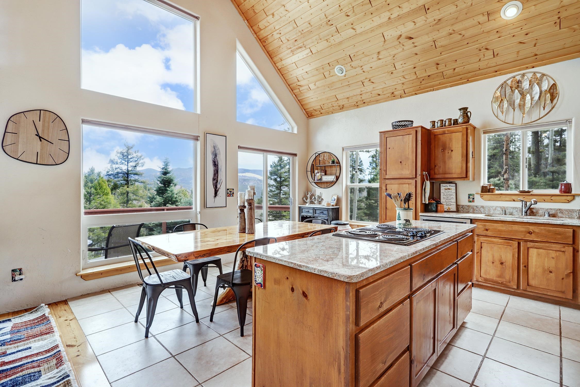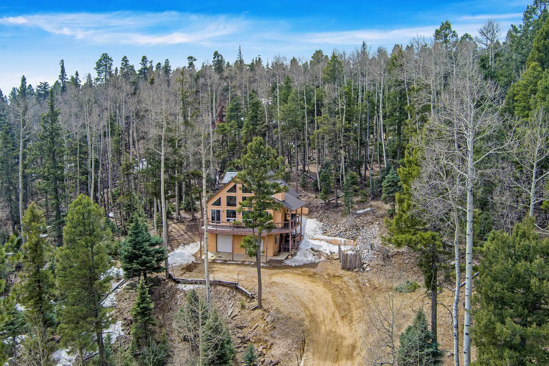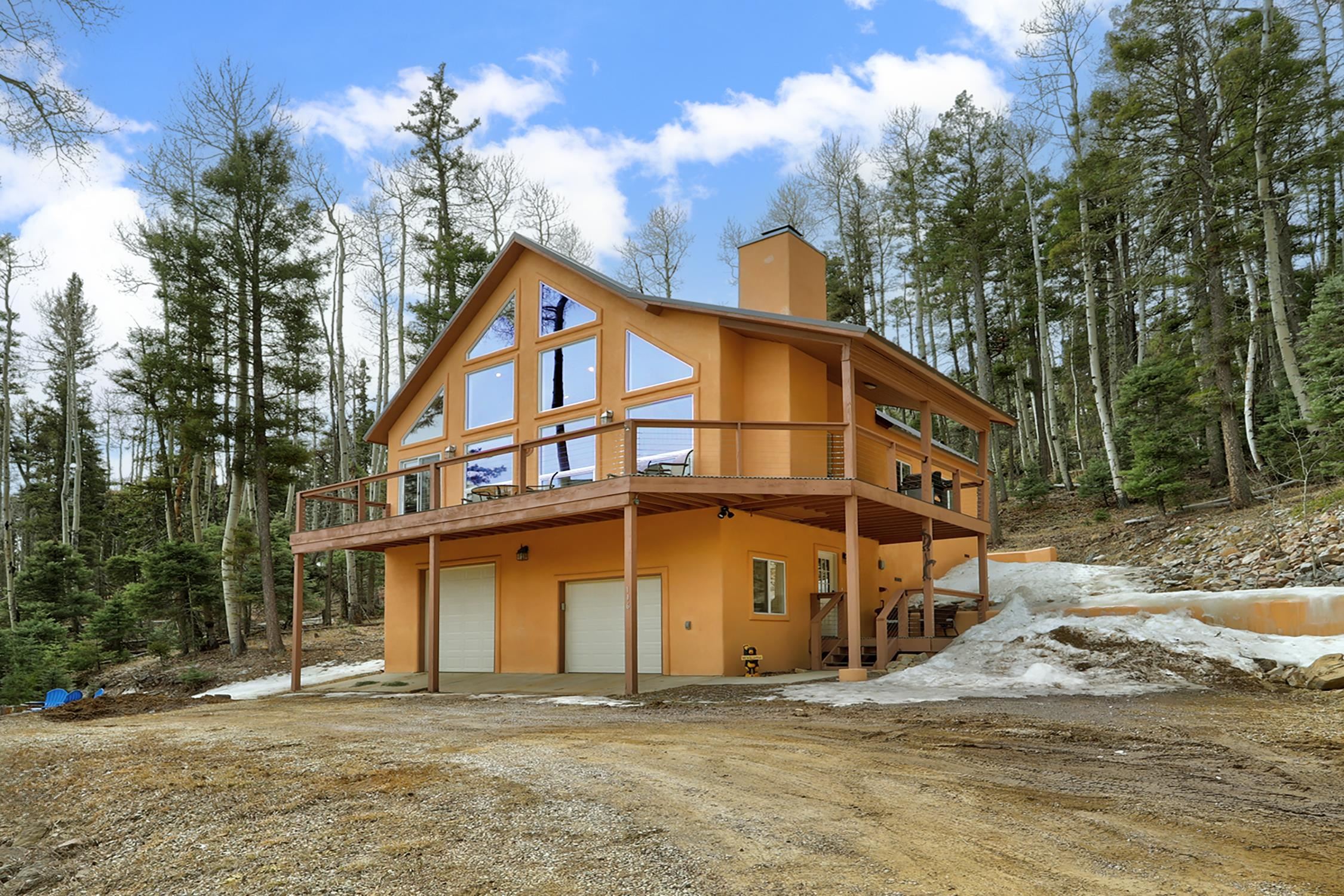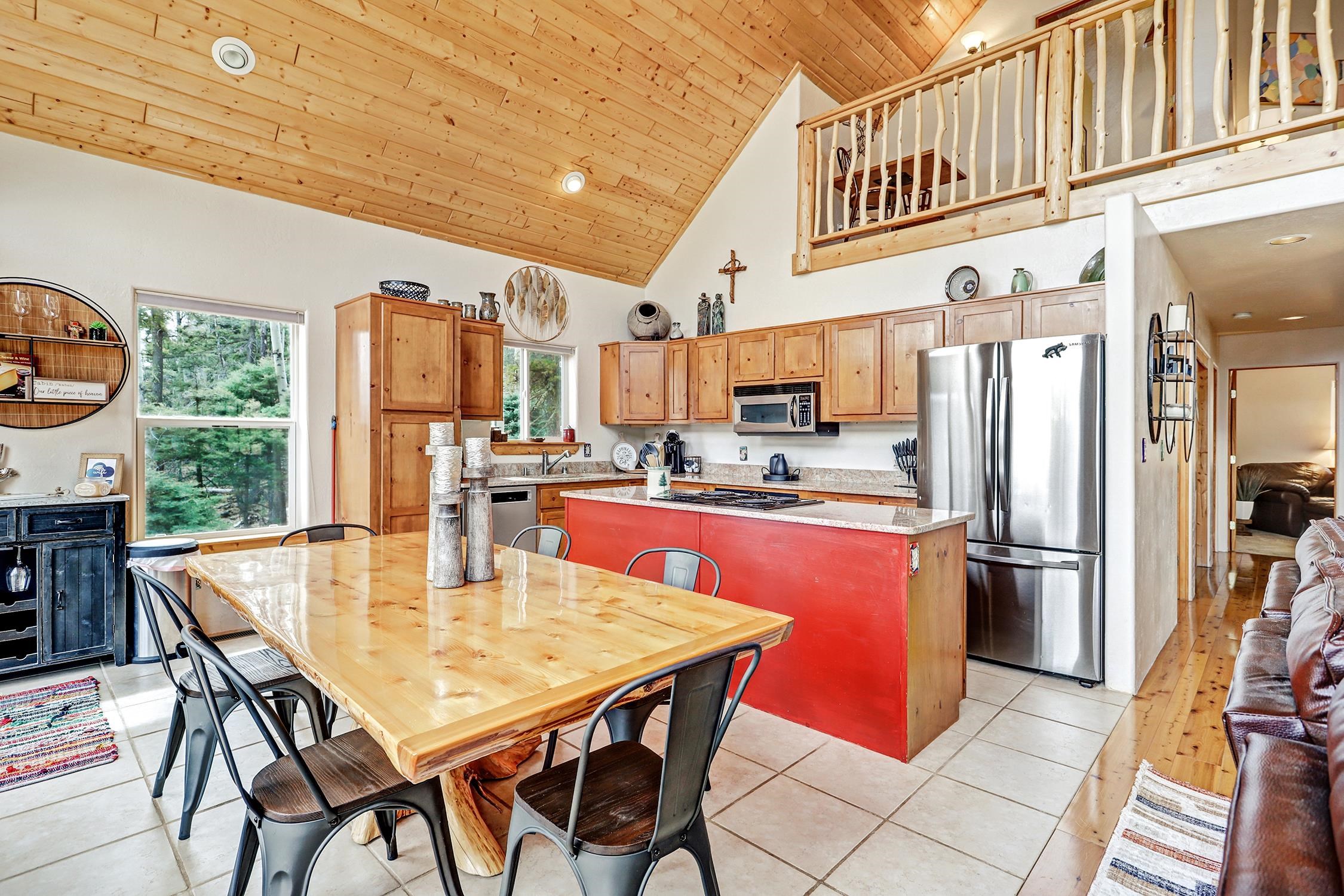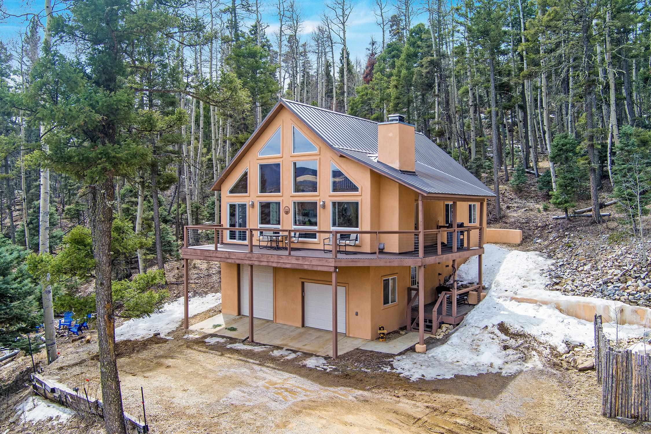 Perched in the trees of Angel Fire, NM, this 4-bedroom, 3-bathroom home is comfortable and inviting. As you step inside, you'll be greeted by a cozy living room, complete with a wood-burning stove, perfect for those chilly mountain evenings. The open-concept design seamlessly connects the living area to a kitchen featuring solid surface countertops, and a dining area with a wine bar, providing both style and functionality for all your gatherings. This home features not one, but two master suites, offering privacy and convenience. The additional loft space serves as a versatile area for extra sleeping with a sleeper sofa or an extra hangout spot. Step outside onto the expansive deck and take in the breathtaking mountain views that Angel Fire is renowned for. The large 1.64-acre lot provides ample space for outdoor activities and future landscaping dreams. The property is move-in ready, with a proven rental history, making it a home as well as an investment opportunity. For those with a passion for vehicles or outdoor gear, the 2-car garage includes an extra tall bay, accommodating larger vehicles or additional storage needs. Don't delay, this stylish home is sure to get lots of attention!