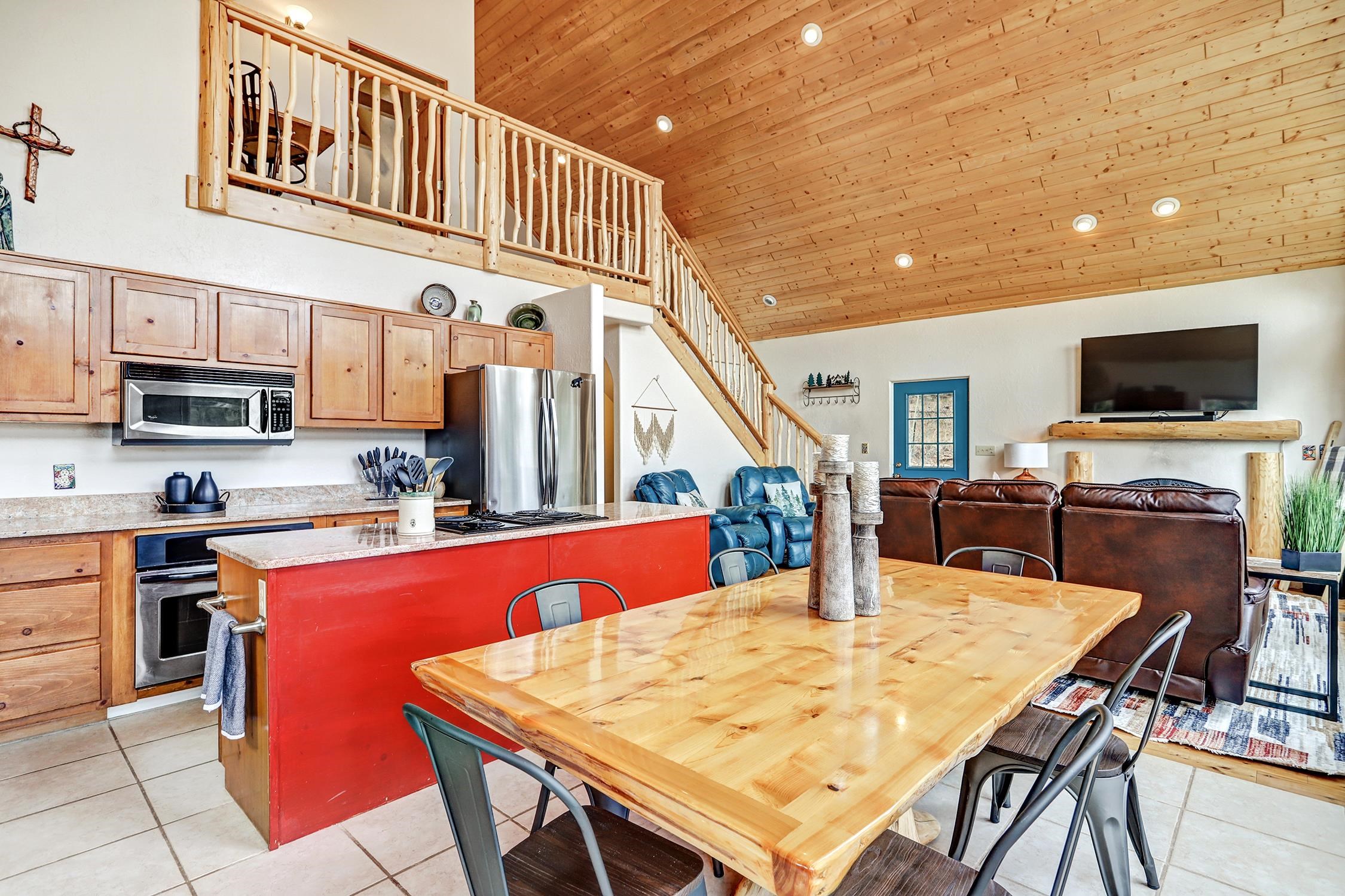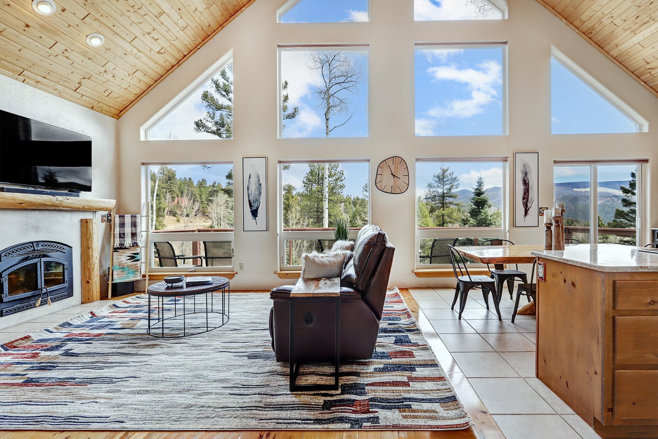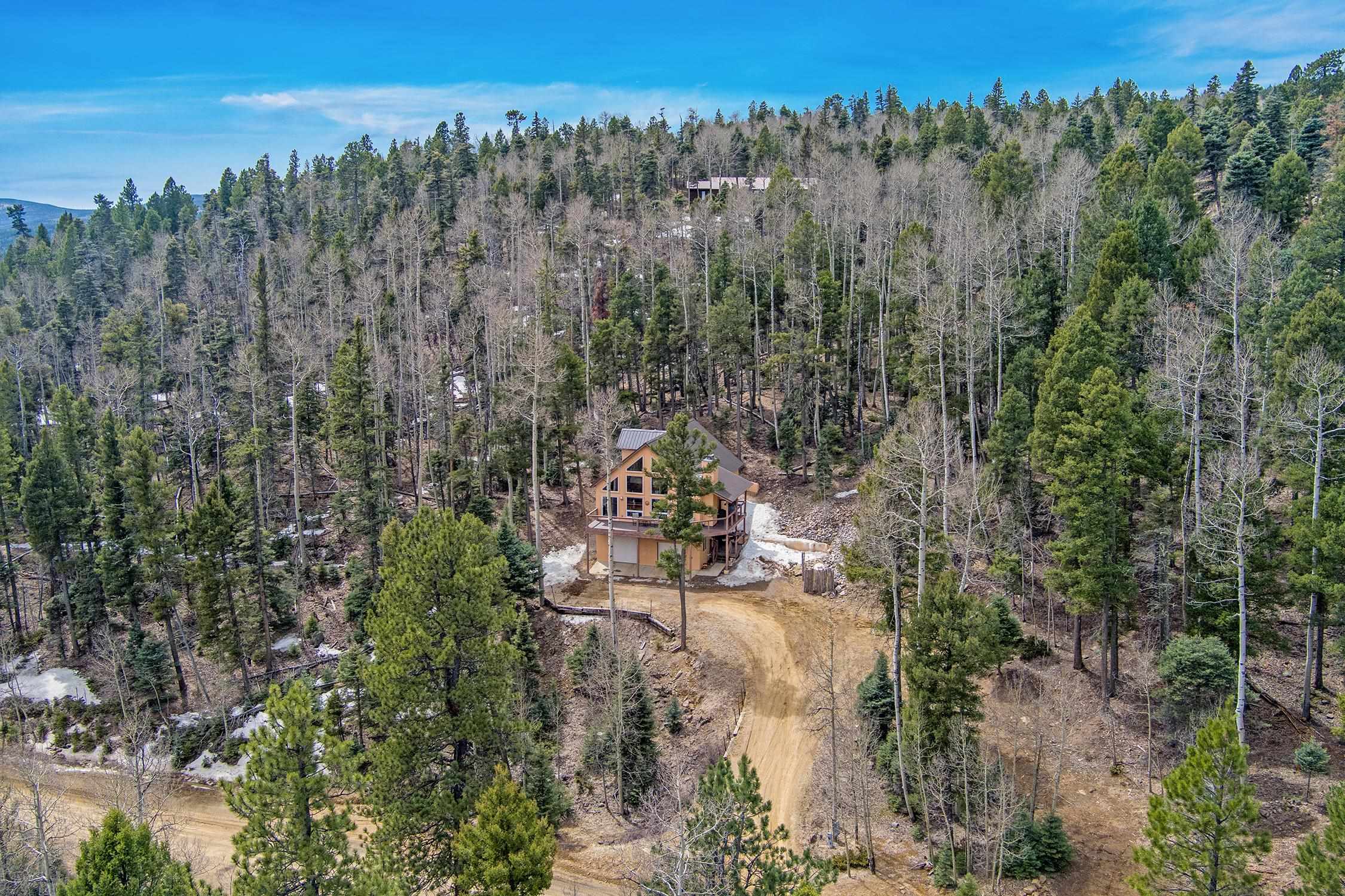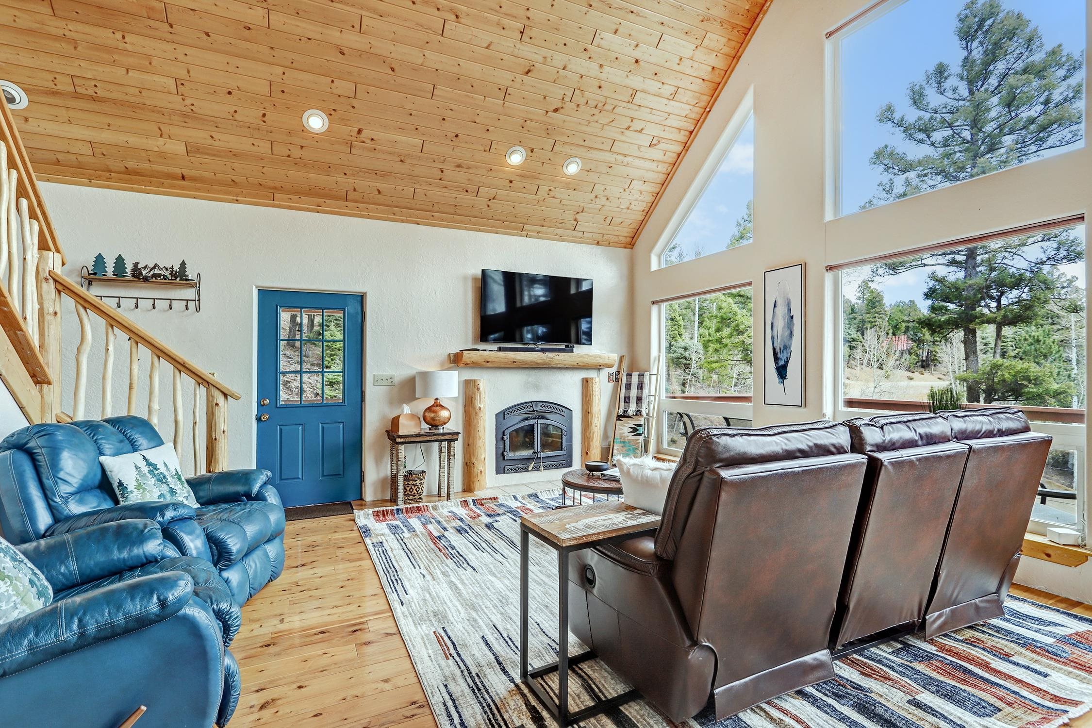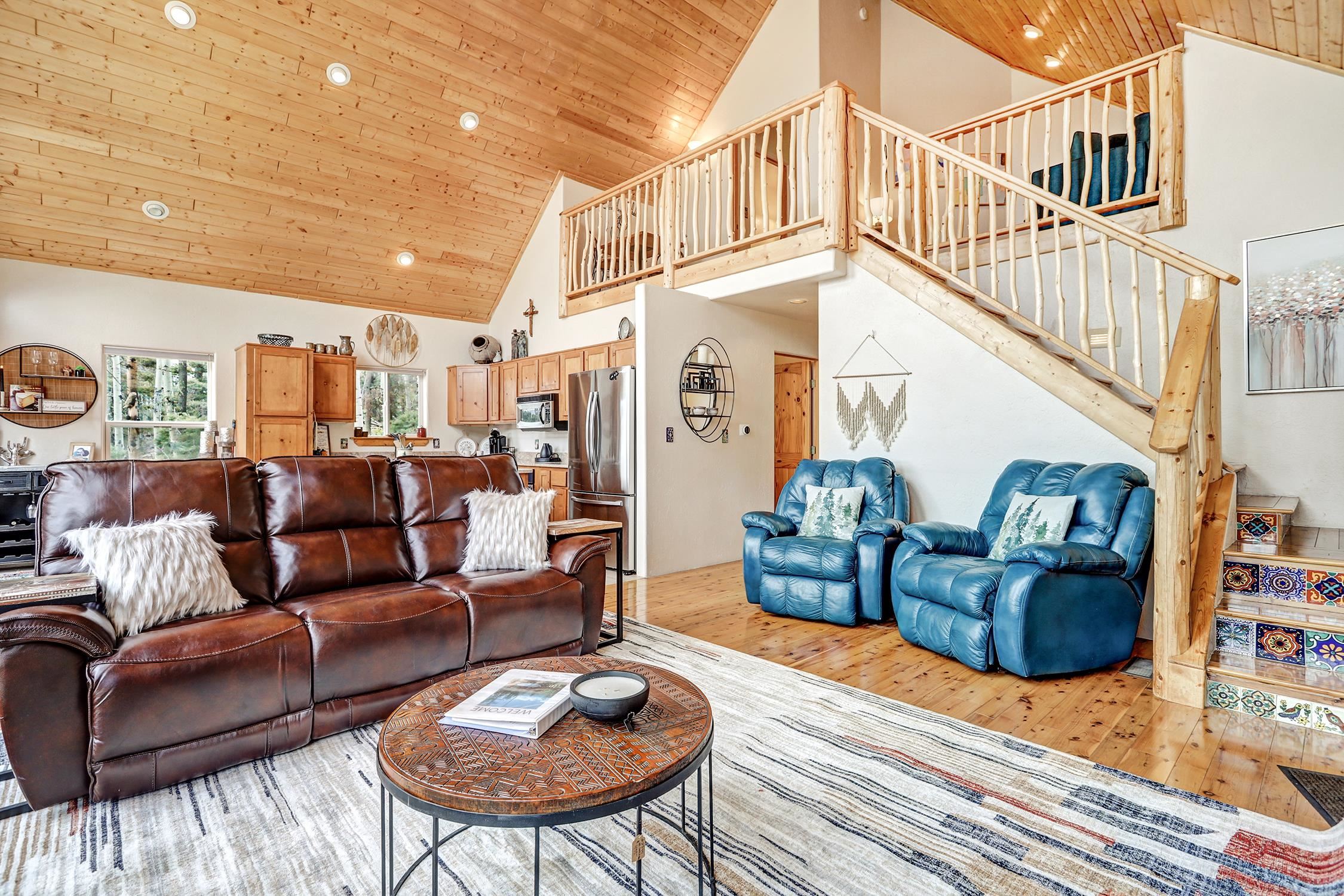 Perched in the trees of Angel Fire, NM, this 4-bedroom, 3-bathroom home is comfortable and inviting. As you step inside, you'll be greeted by a cozy living room, complete with a wood-burning stove, perfect for those chilly mountain evenings. The open-concept design seamlessly connects the living area to a kitchen featuring solid surface countertops, and a dining area with a wine bar, providing both style and functionality for all your gatherings. This home features not one, but two master suites, offering privacy and convenience. The additional loft space serves as a versatile area for extra sleeping with a sleeper sofa or an extra hangout spot. Step outside onto the expansive deck and take in the breathtaking mountain views that Angel Fire is renowned for. The large 1.64-acre lot provides ample space for outdoor activities and future landscaping dreams. The property is move-in ready, with a proven rental history, making it a home as well as an investment opportunity. For those with a passion for vehicles or outdoor gear, the 2-car garage includes an extra tall bay, accommodating larger vehicles or additional storage needs. Don't delay, this stylish home is sure to get lots of attention!