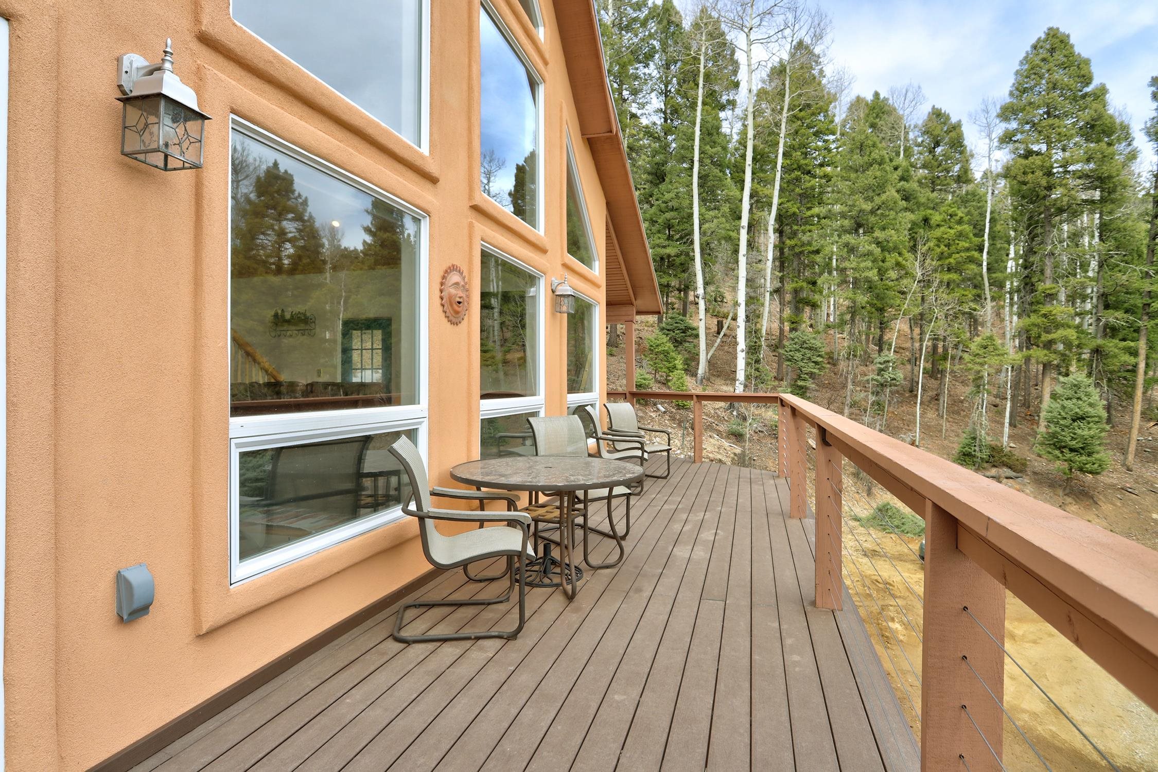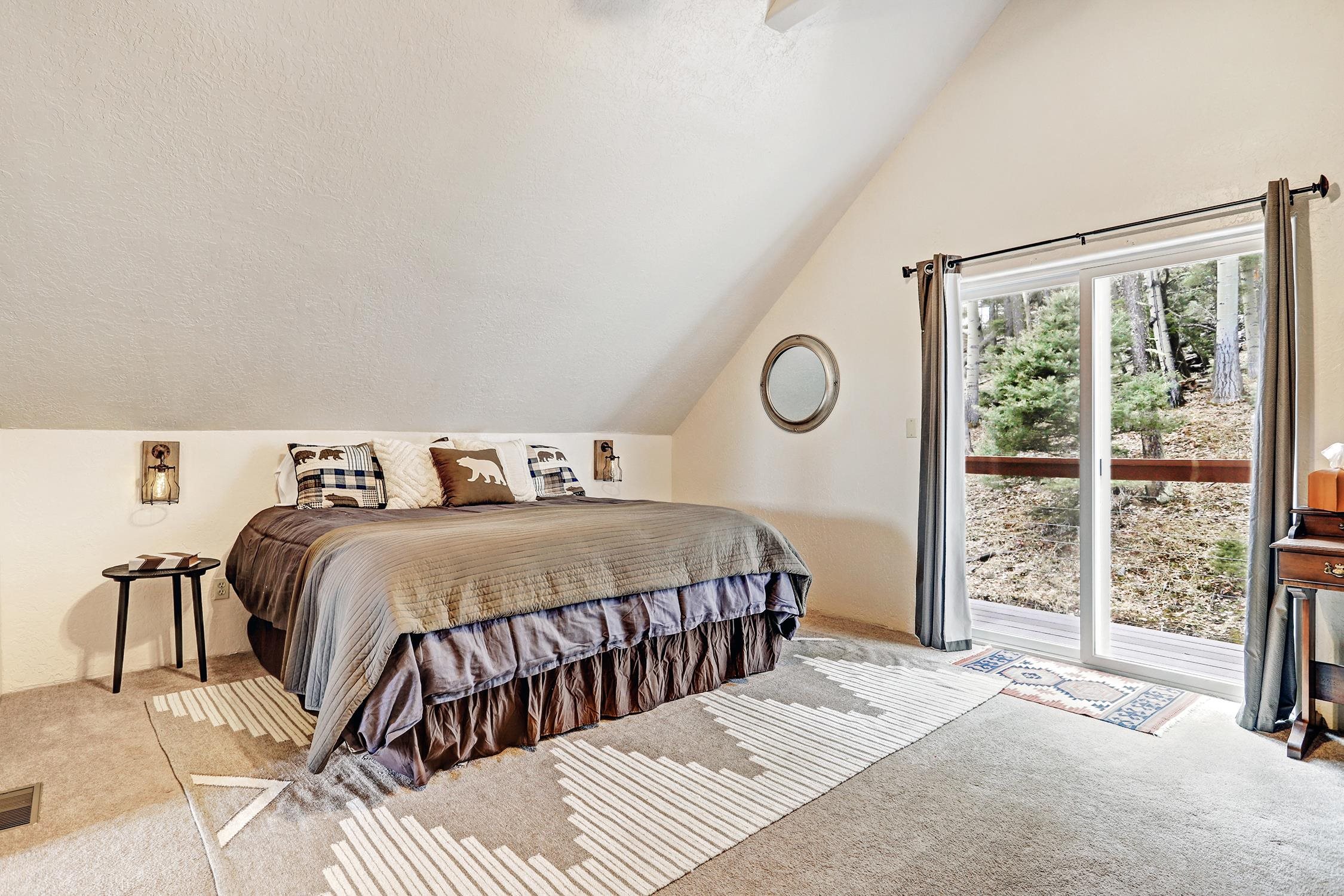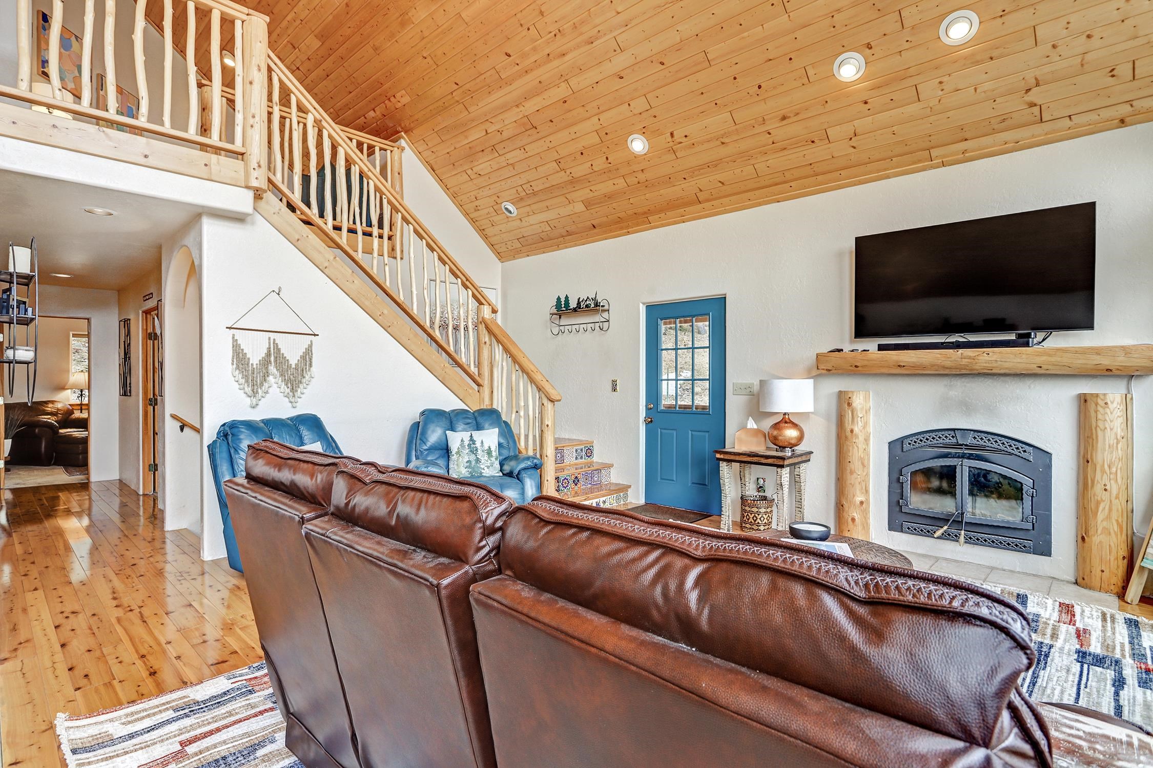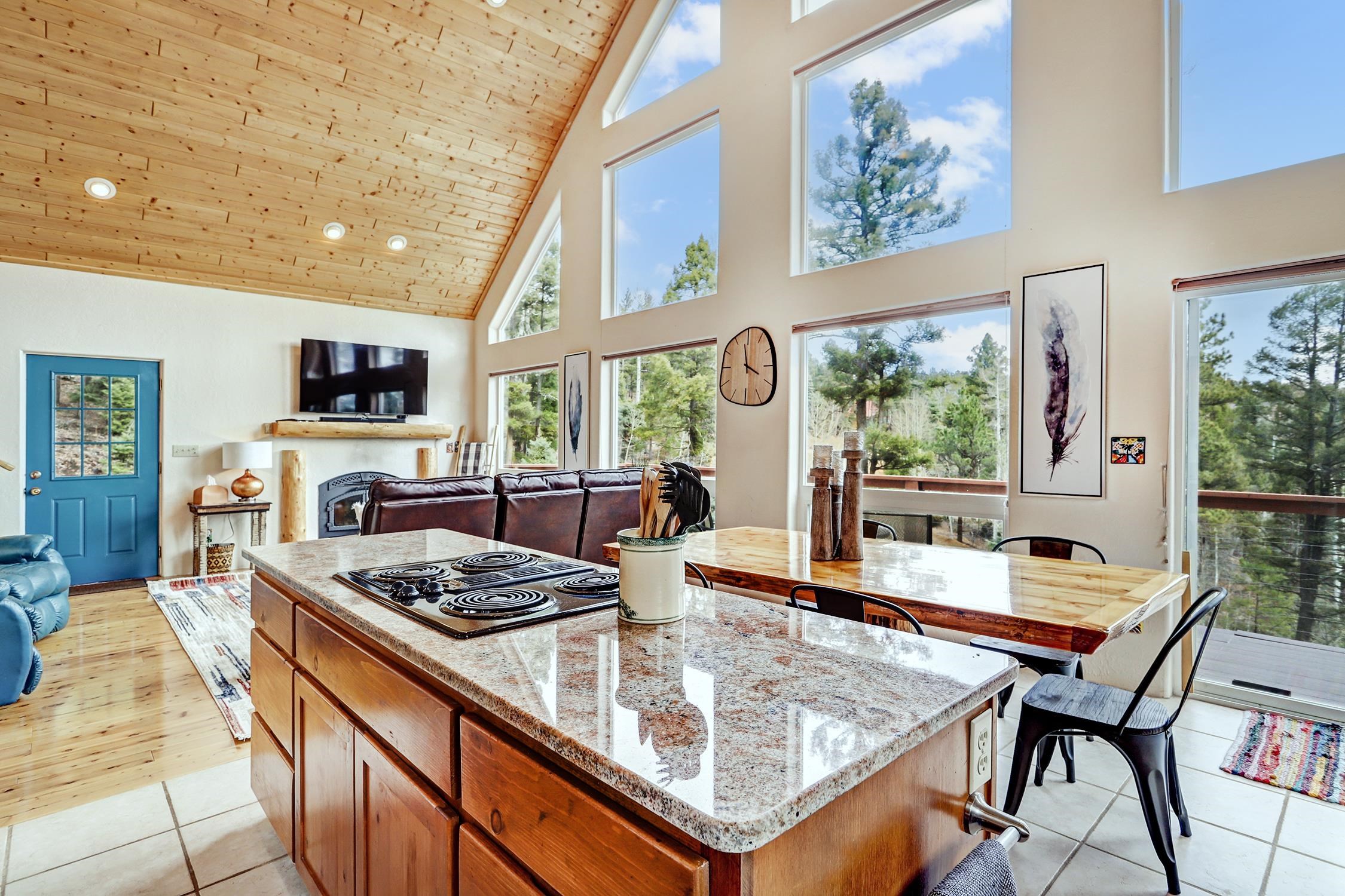 Perched in the trees of Angel Fire, NM, this 4-bedroom, 3-bathroom home is comfortable and inviting. As you step inside, you'll be greeted by a cozy living room, complete with a wood-burning stove, perfect for those chilly mountain evenings. The open-concept design seamlessly connects the living area to a kitchen featuring solid surface countertops, and a dining area with a wine bar, providing both style and functionality for all your gatherings. This home features not one, but two master suites, offering privacy and convenience. The additional loft space serves as a versatile area for extra sleeping with a sleeper sofa or an extra hangout spot. Step outside onto the expansive deck and take in the breathtaking mountain views that Angel Fire is renowned for. The large 1.64-acre lot provides ample space for outdoor activities and future landscaping dreams. The property is move-in ready, with a proven rental history, making it a home as well as an investment opportunity. For those with a passion for vehicles or outdoor gear, the 2-car garage includes an extra tall bay, accommodating larger vehicles or additional storage needs. Don't delay, this stylish home is sure to get lots of attention!