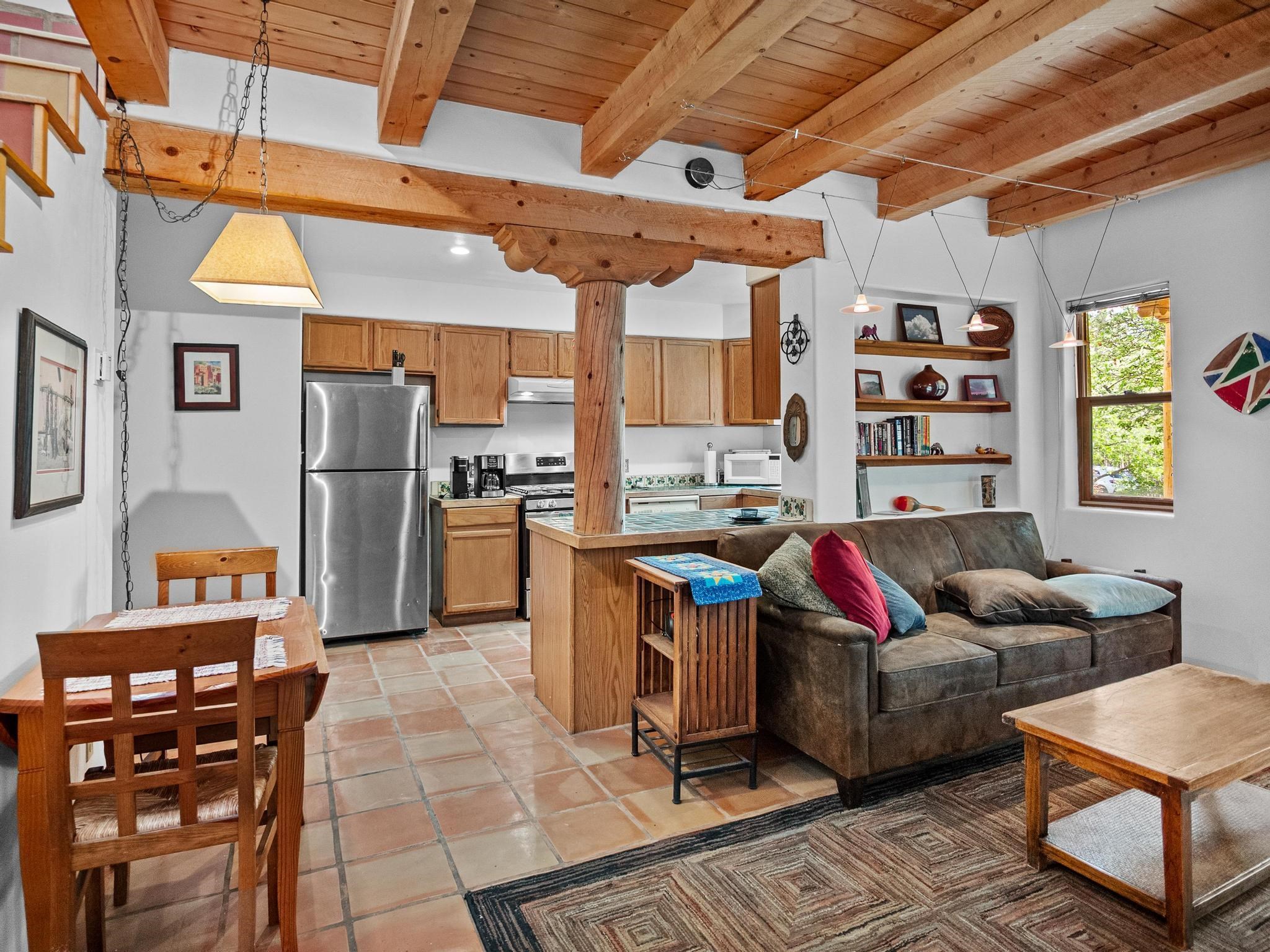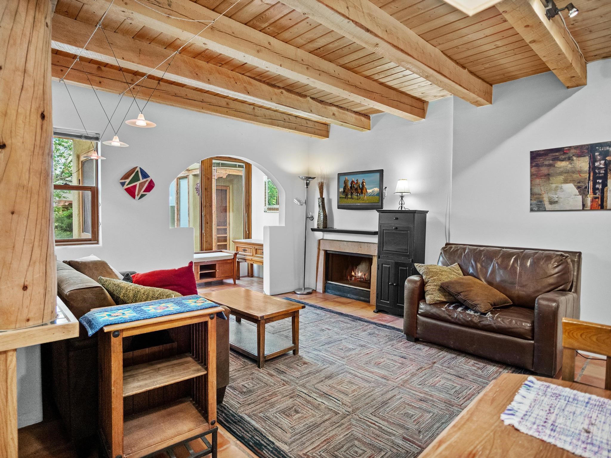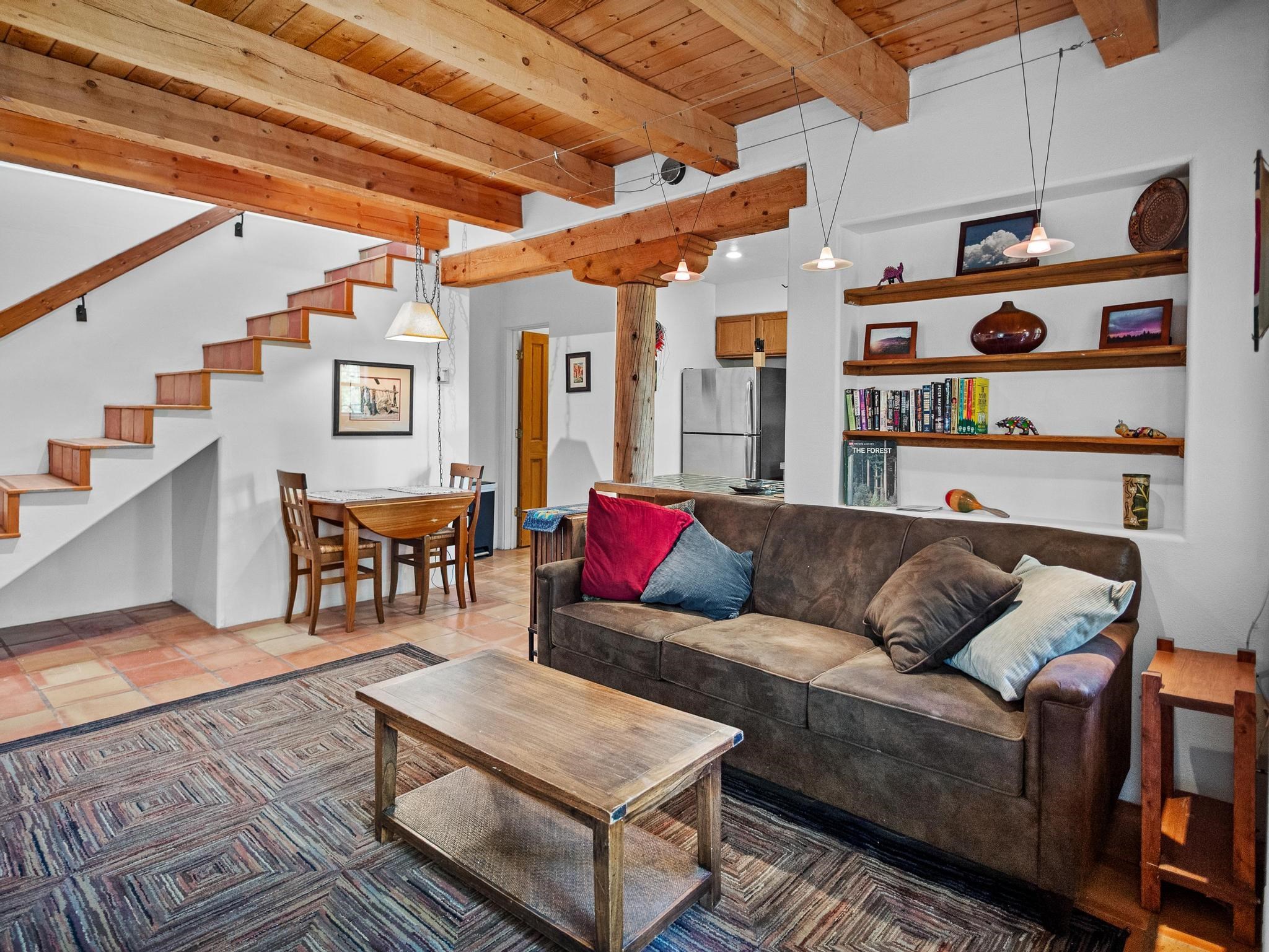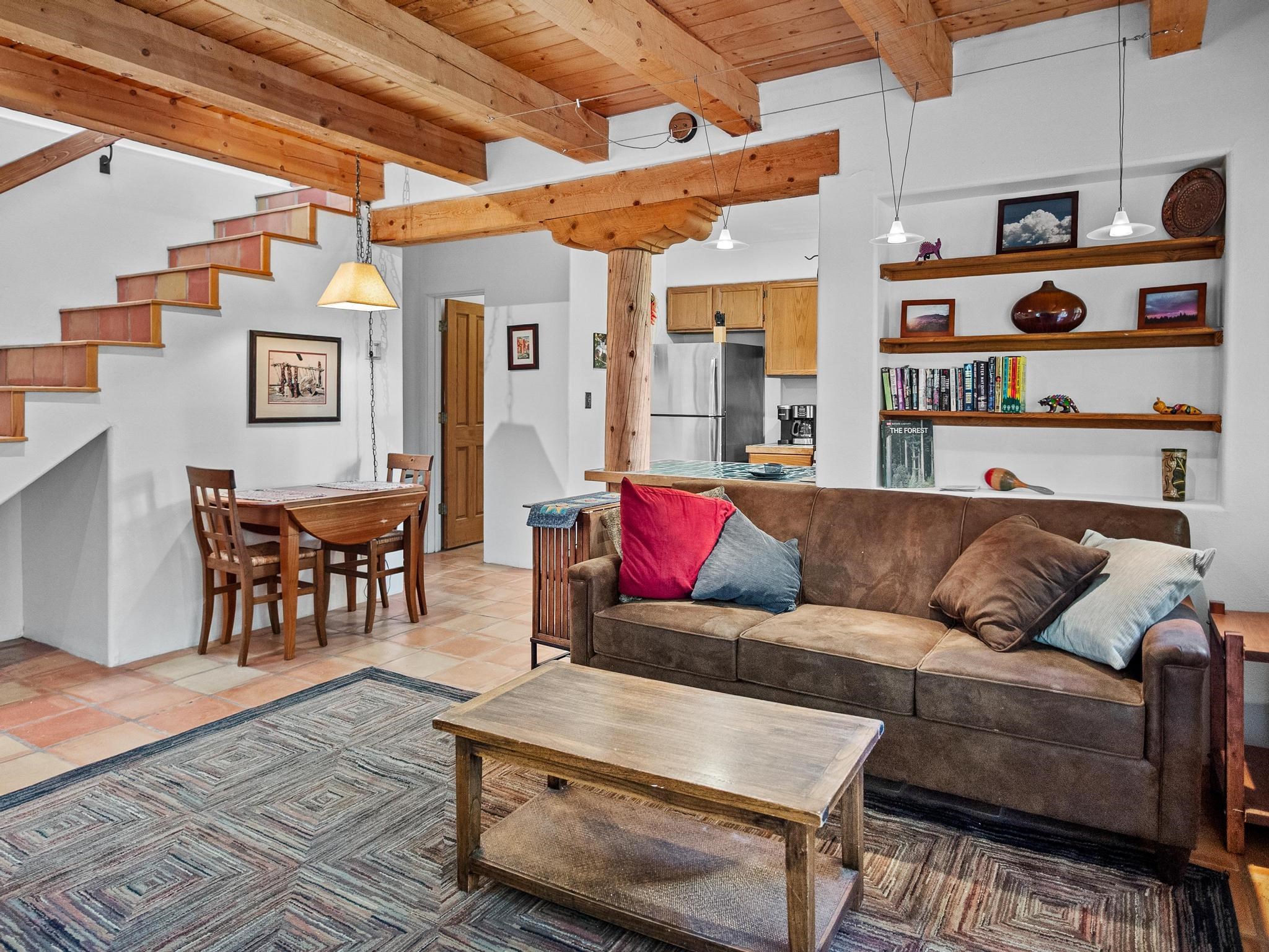 Welcome to La Casitas de Las Cruces - a charming two-level condo in the heart of Taos, NM, offering mountain-town living with comfort and style. The first floor features a spacious 457 sq ft layout including a welcoming foyer, light-filled living room, kitchen, and a convenient half bath. Upstairs, the second level adds 409 sq ft and includes the primary bedroom with private balcony access, a second bedroom, and a beautifully tiled full bath. Warm wood tones and Southwestern character shine throughout with tongue-and-groove ceilings accented by exposed beams, stunning tile work in the bathrooms, and abundant natural light from well-placed windows. Enjoy the outdoors year-round with a covered patio seating area--perfect for morning coffee or evening relaxation. Laundry facilities are available in the complex, and the property is being sold fully furnished. Whether you're looking for a full-time residence, weekend retreat, or investment opportunity, this condo offers it all in a sought-after Taos location.