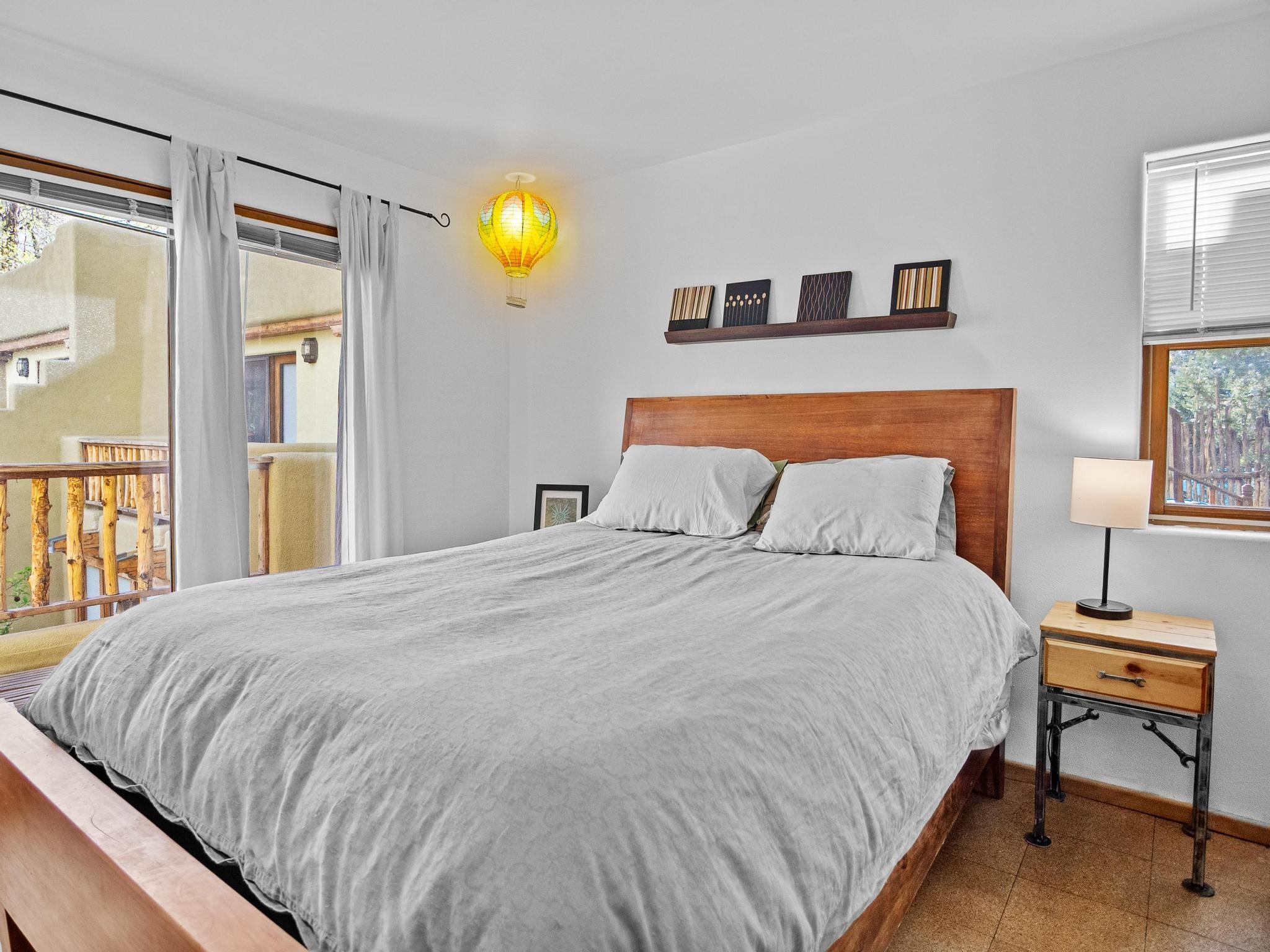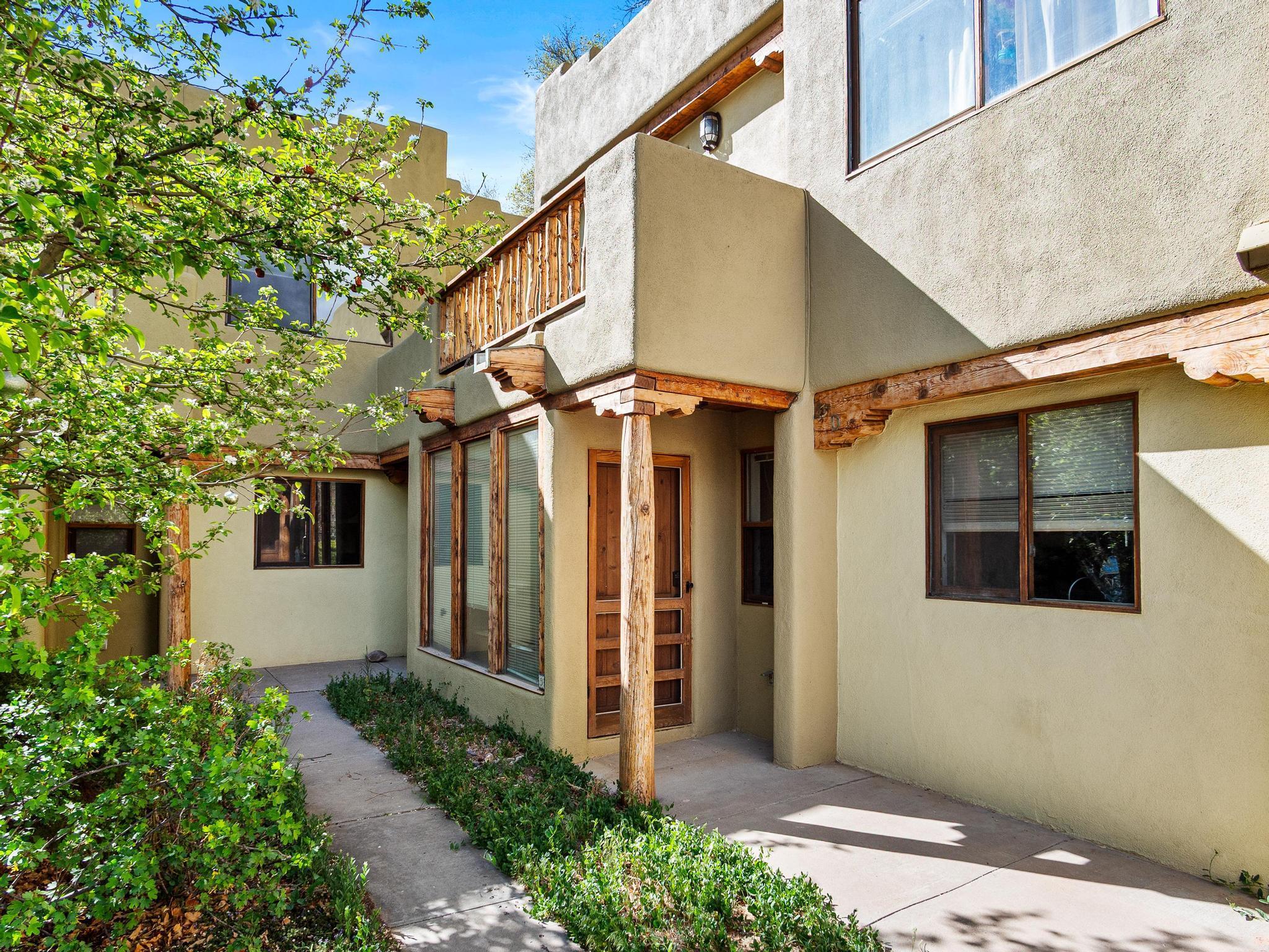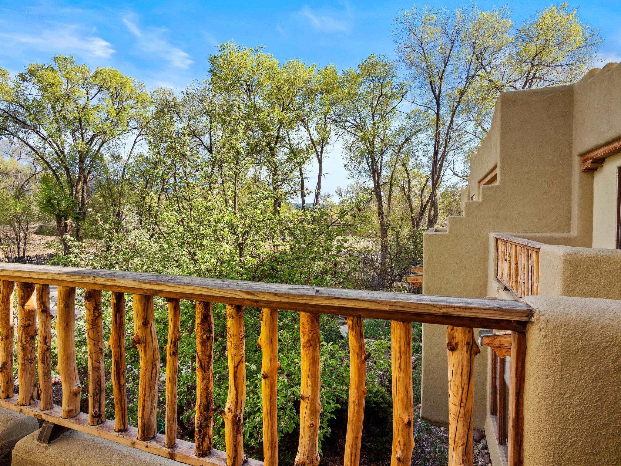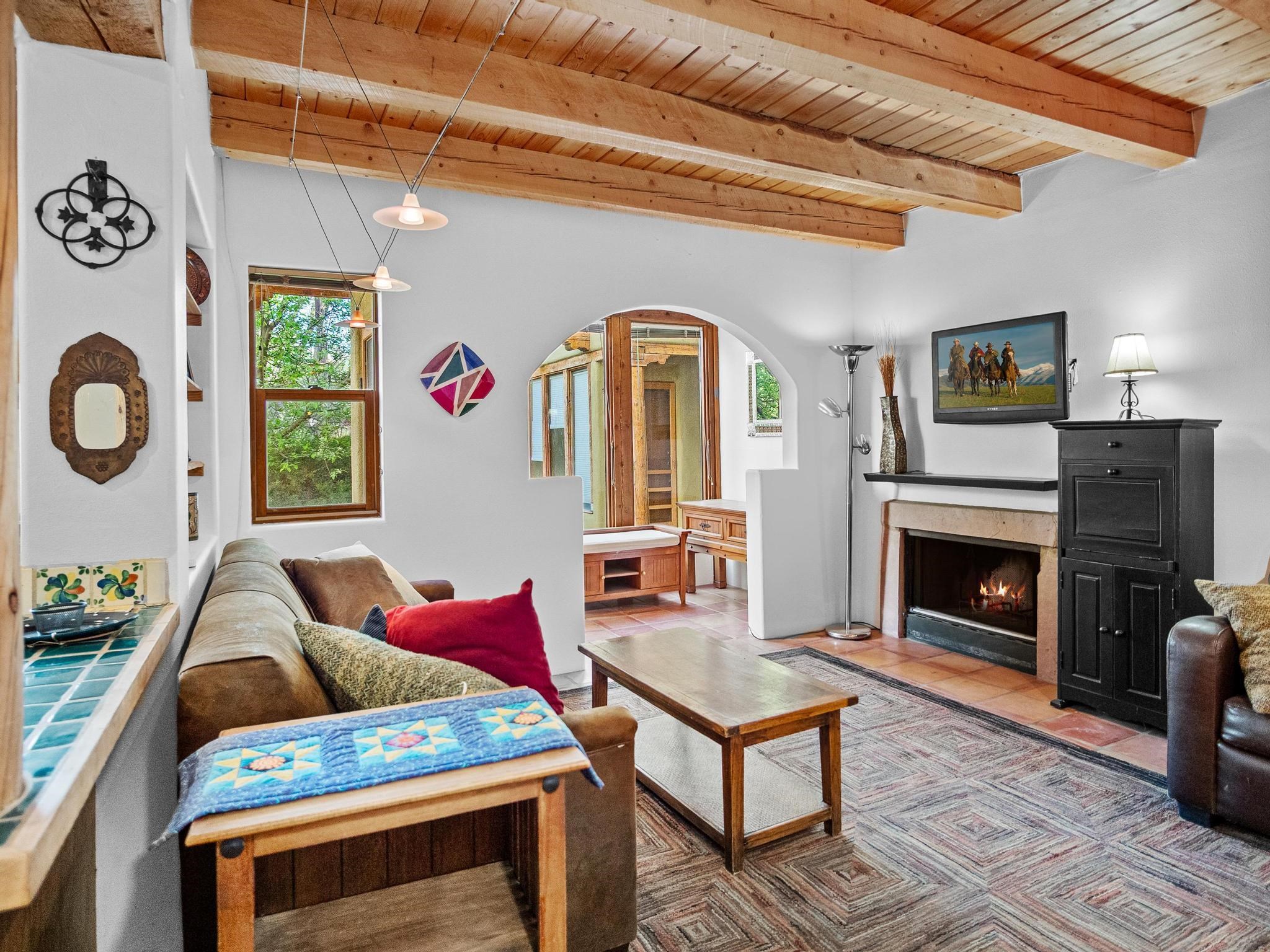 Welcome to La Casitas de Las Cruces - a charming two-level condo in the heart of Taos, NM, offering mountain-town living with comfort and style. The first floor features a spacious 457 sq ft layout including a welcoming foyer, light-filled living room, kitchen, and a convenient half bath. Upstairs, the second level adds 409 sq ft and includes the primary bedroom with private balcony access, a second bedroom, and a beautifully tiled full bath. Warm wood tones and Southwestern character shine throughout with tongue-and-groove ceilings accented by exposed beams, stunning tile work in the bathrooms, and abundant natural light from well-placed windows. Enjoy the outdoors year-round with a covered patio seating area--perfect for morning coffee or evening relaxation. Laundry facilities are available in the complex, and the property is being sold fully furnished. Whether you're looking for a full-time residence, weekend retreat, or investment opportunity, this condo offers it all in a sought-after Taos location.