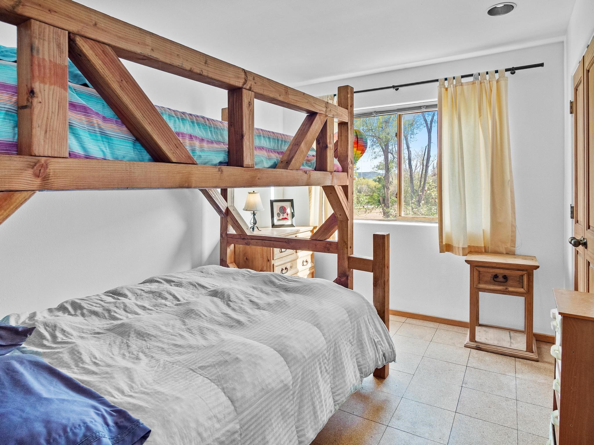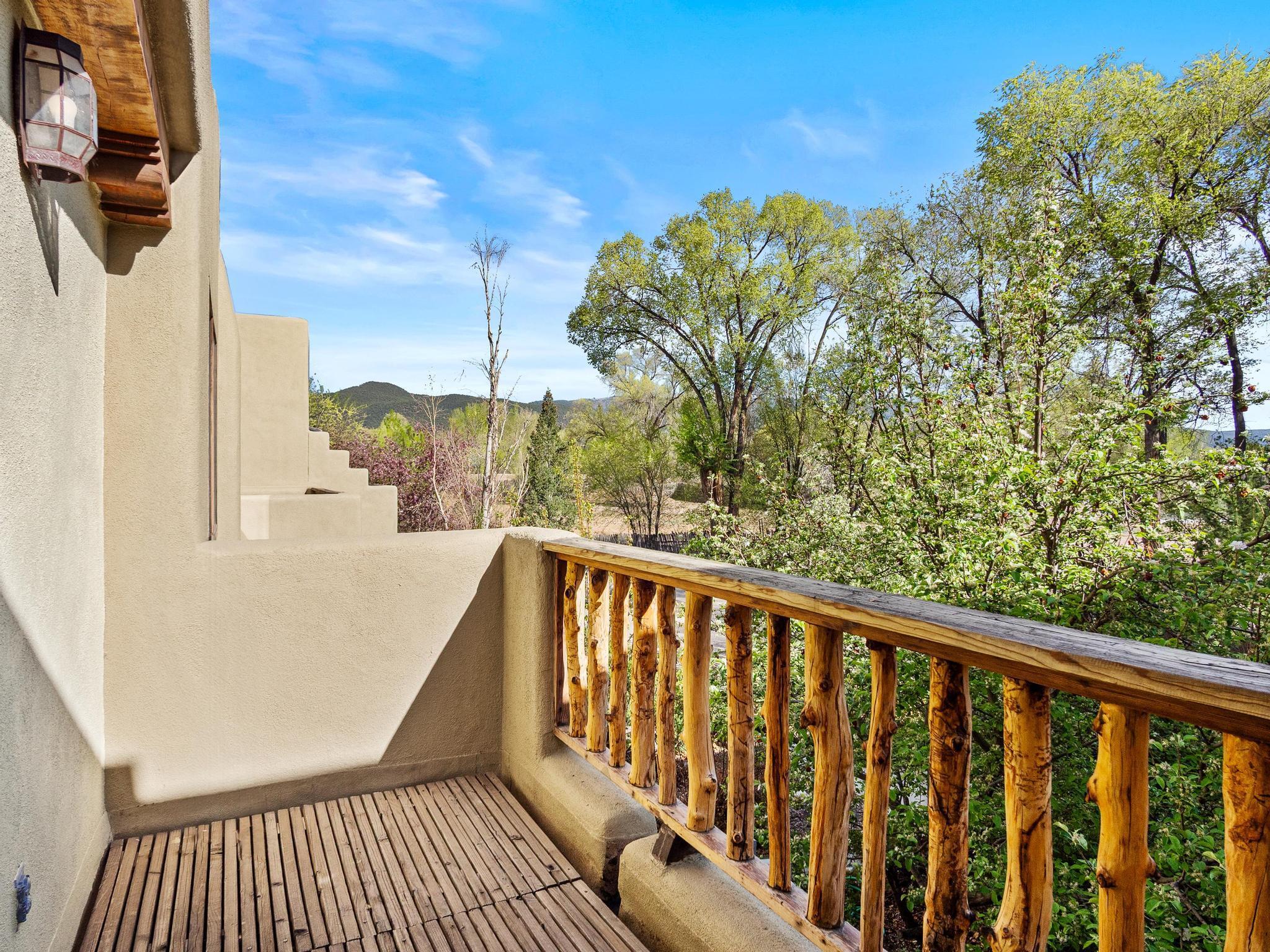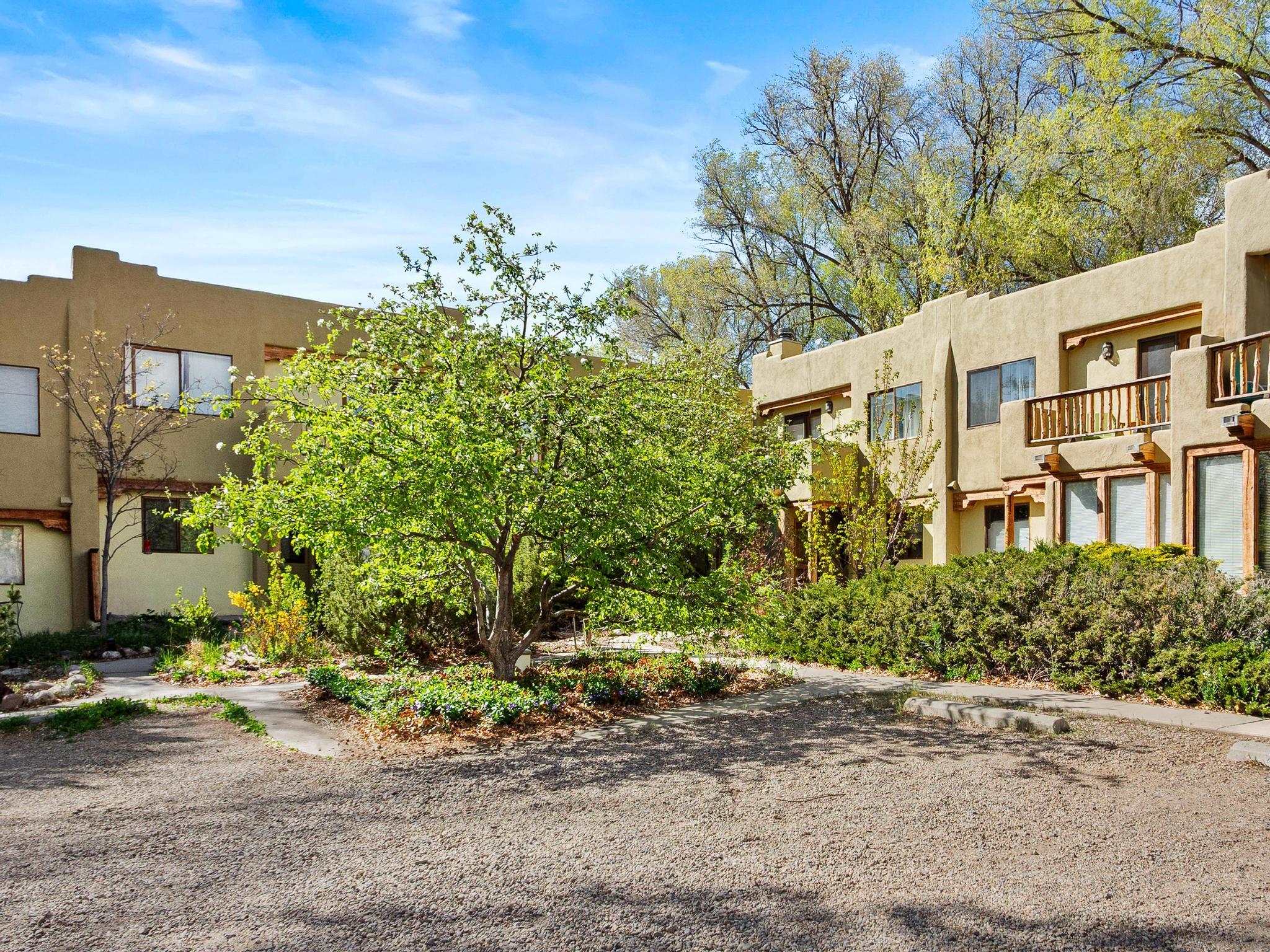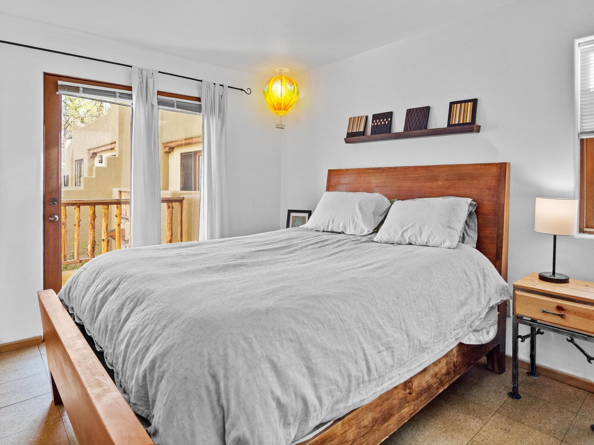 Welcome to La Casitas de Las Cruces - a charming two-level condo in the heart of Taos, NM, offering mountain-town living with comfort and style. The first floor features a spacious 457 sq ft layout including a welcoming foyer, light-filled living room, kitchen, and a convenient half bath. Upstairs, the second level adds 409 sq ft and includes the primary bedroom with private balcony access, a second bedroom, and a beautifully tiled full bath. Warm wood tones and Southwestern character shine throughout with tongue-and-groove ceilings accented by exposed beams, stunning tile work in the bathrooms, and abundant natural light from well-placed windows. Enjoy the outdoors year-round with a covered patio seating area--perfect for morning coffee or evening relaxation. Laundry facilities are available in the complex, and the property is being sold fully furnished. Whether you're looking for a full-time residence, weekend retreat, or investment opportunity, this condo offers it all in a sought-after Taos location.