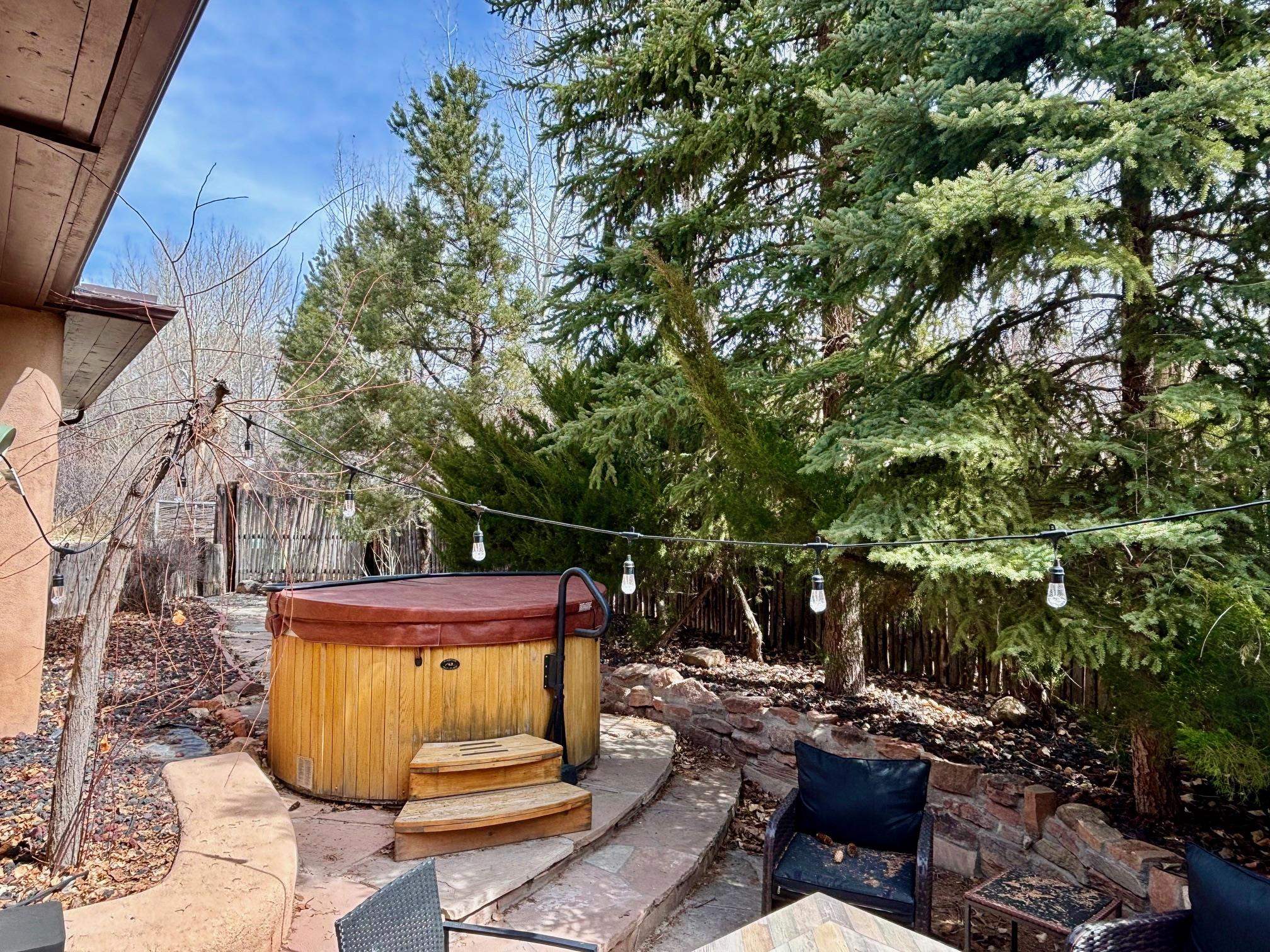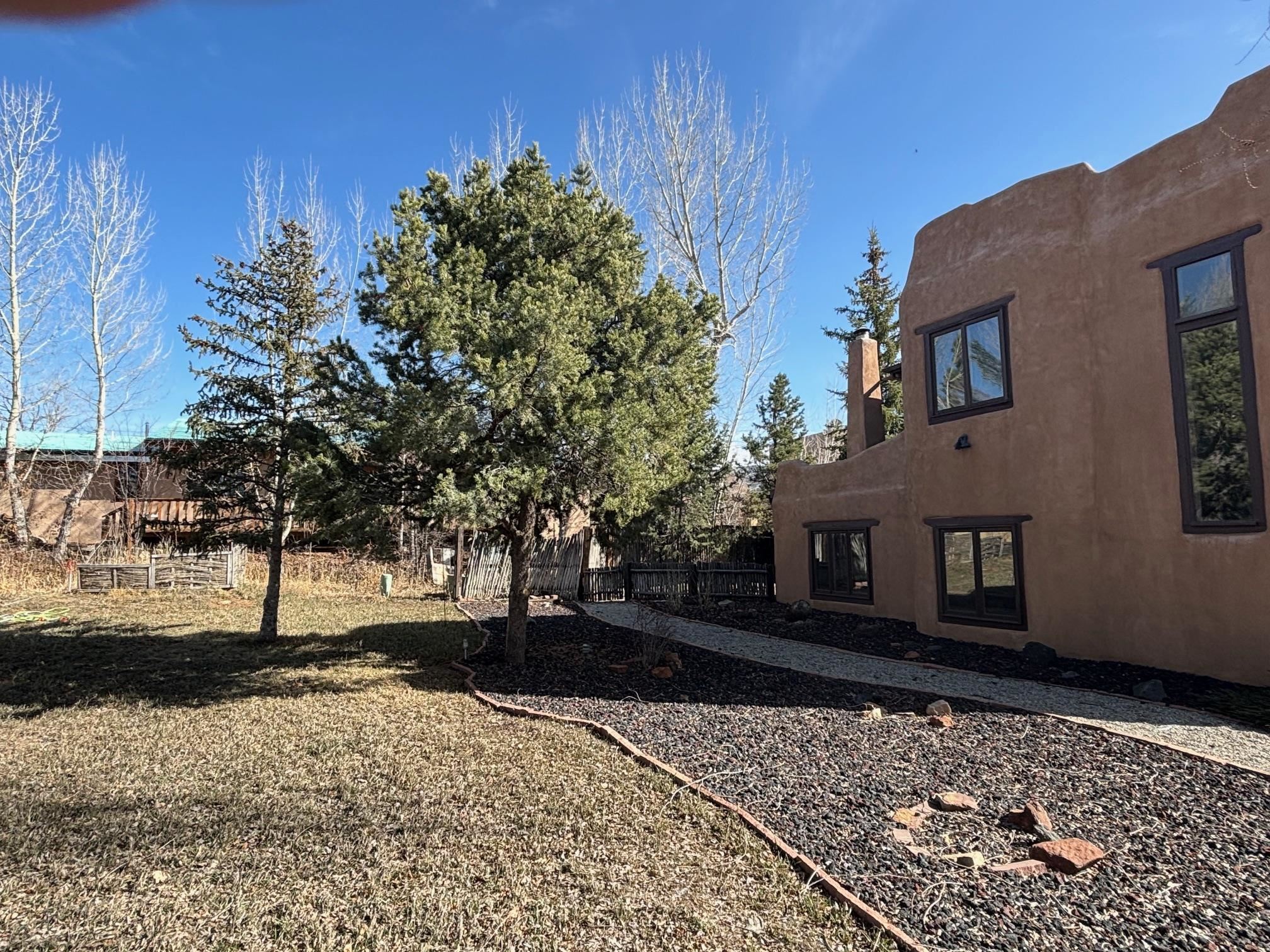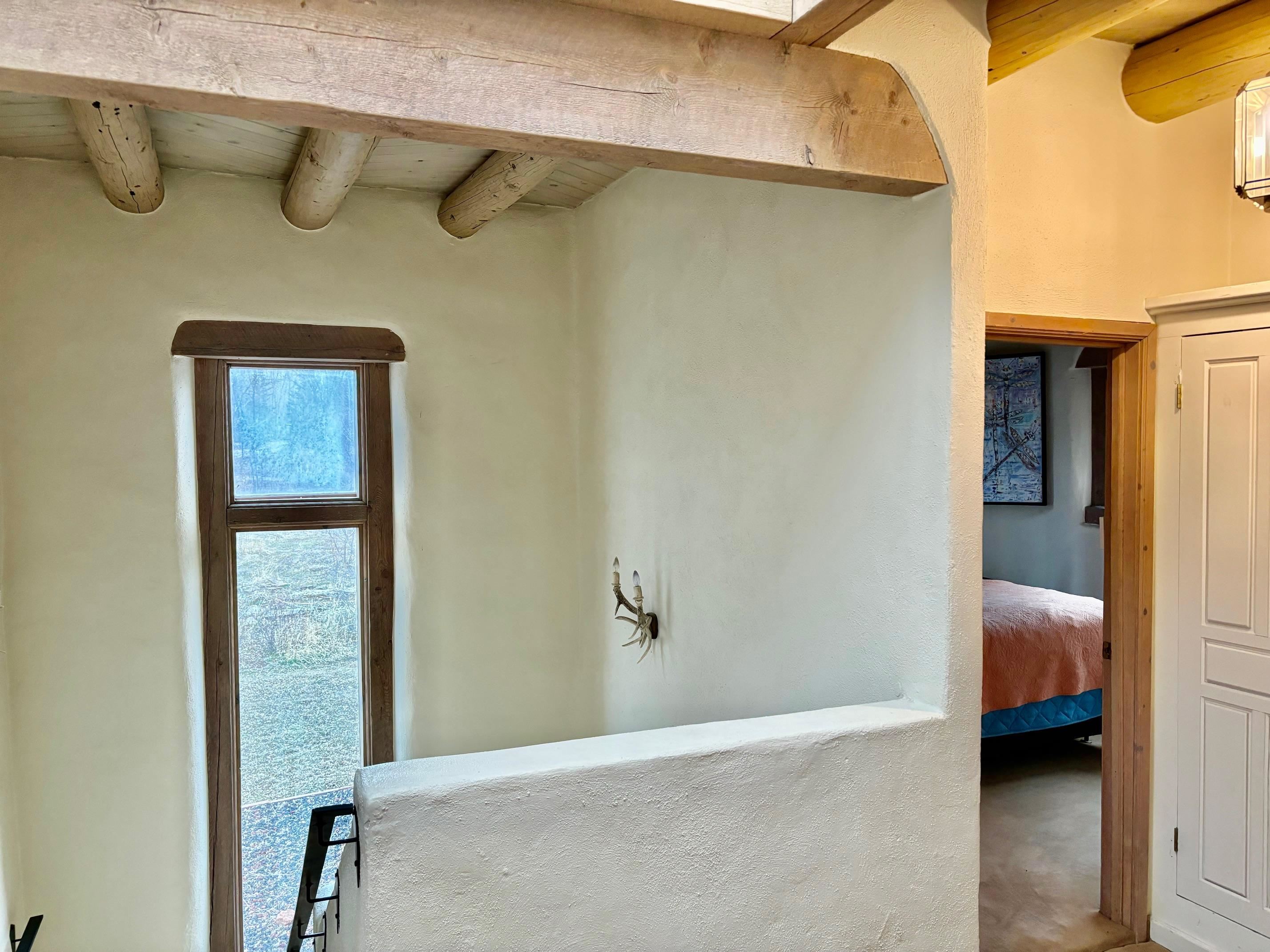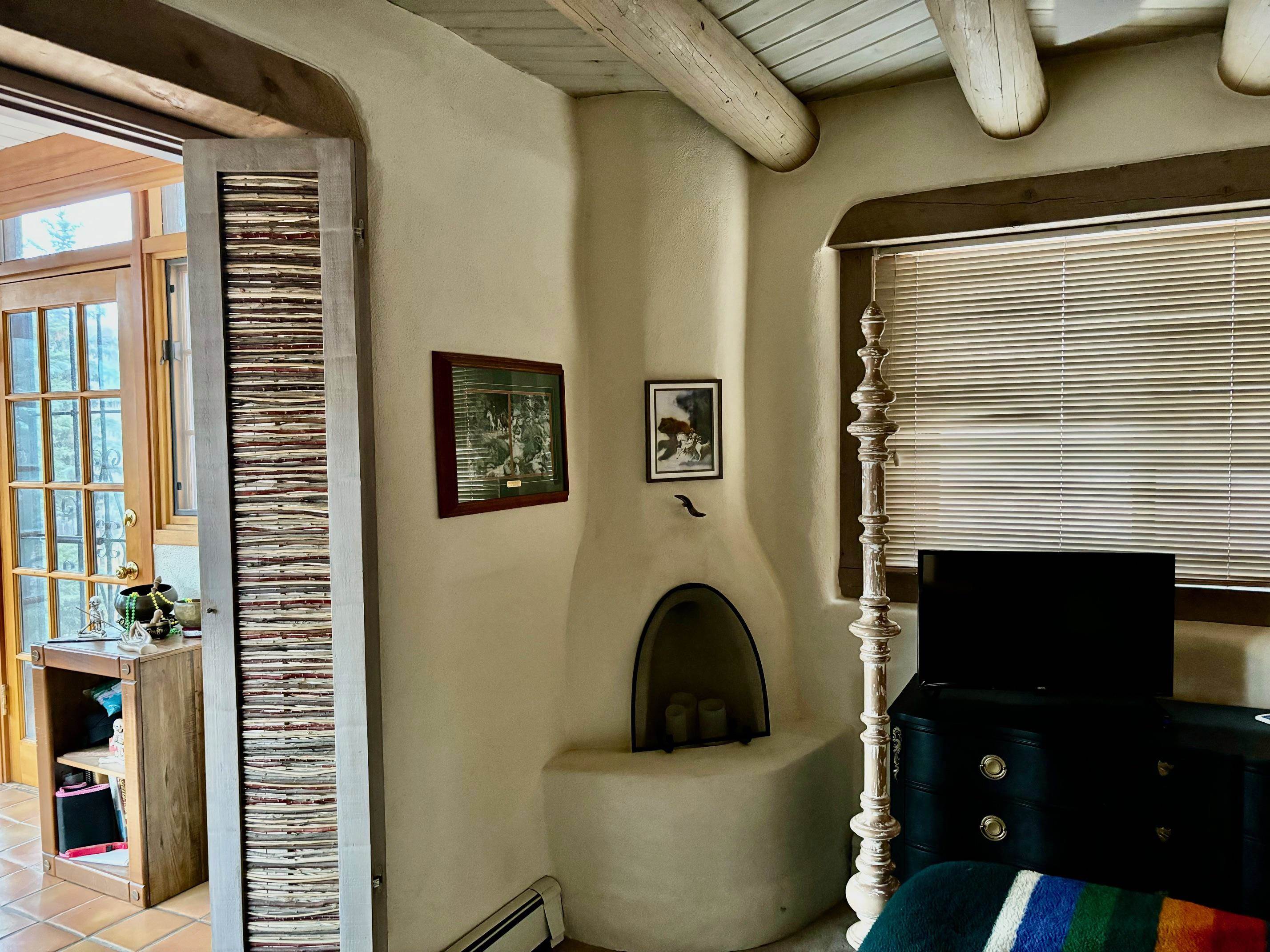 Authentic adobe house located near the historic Taos Plaza and Monte Sagrado. Located at the back end of Spruce Lane, a very quiet and secluded area. The adobe walls are thick. Features three bedrooms and two bathrooms. Two-story house. Features vigas throughout the house with tongue and grove wood. Floors feature wood and tile downstairs and carpet upstairs. The kitchen is large and features stainless steel appliances, built-in wine rack and white cabinets. The house has a formal dining room, and living room. One bedroom is downstairs and two bedrooms are upstairs. Washer and dryer are included. The house also features three fireplaces located in the living room, downstairs bedroom, and primary bedroom upstairs. The primary bedroom is cozy and double doors lead to a gorgeous sun room; plenty of windows and natural light. This room can be used in many different ways. The primary bedroom has a mini-split system for instant heating and air conditioning. The house has several multiple, large skylights. All this house is spread out over 2,188 square feet. The outside has superb landscaping including many trees, grass, flagstone patios and of course a free standing hot tub. This house is indeed a rare find. Come and see it. The square footage is not guaranteed by the seller or the broker so if this is of importance to the buyer then the buyer shall have the house measured by an expert.