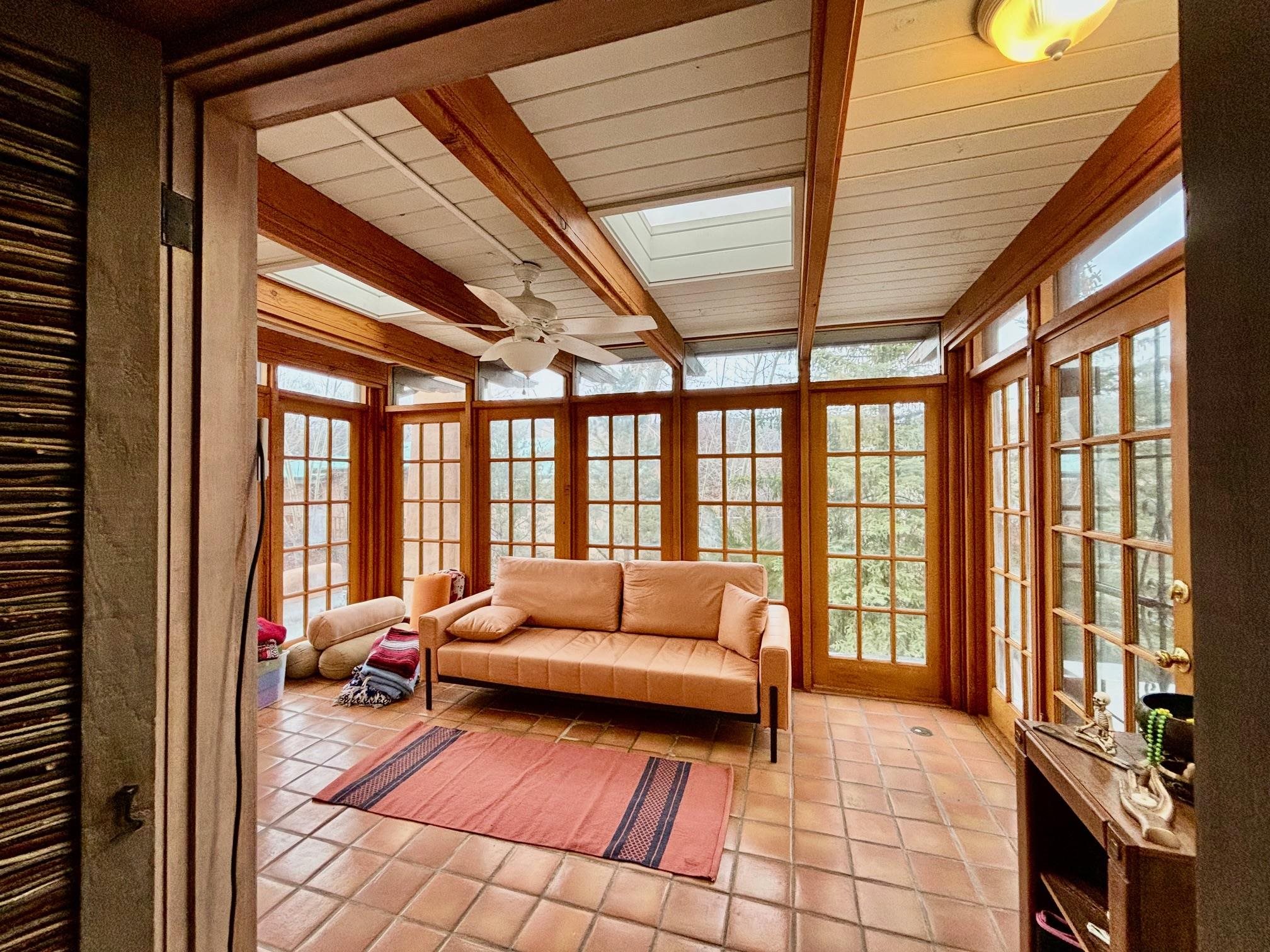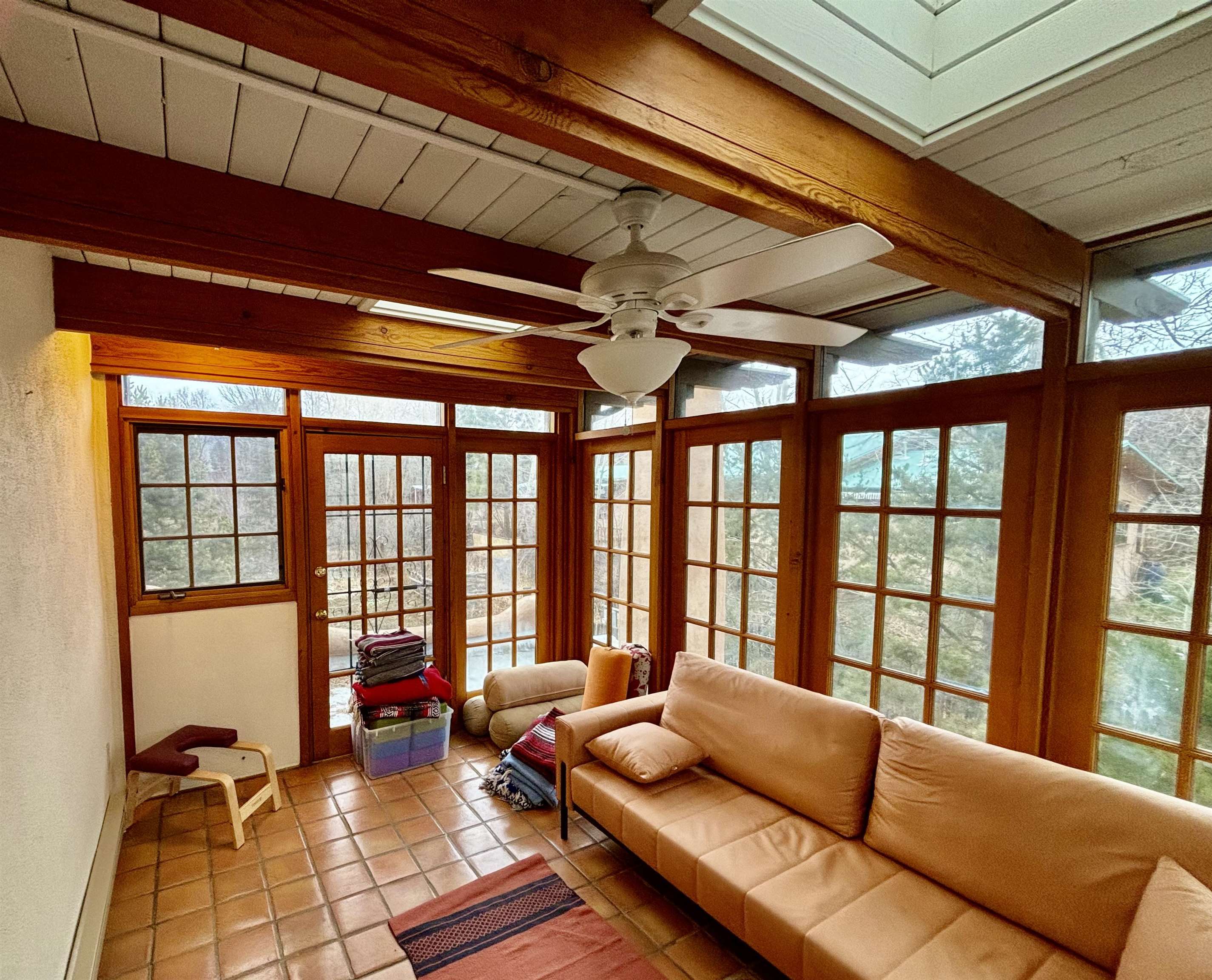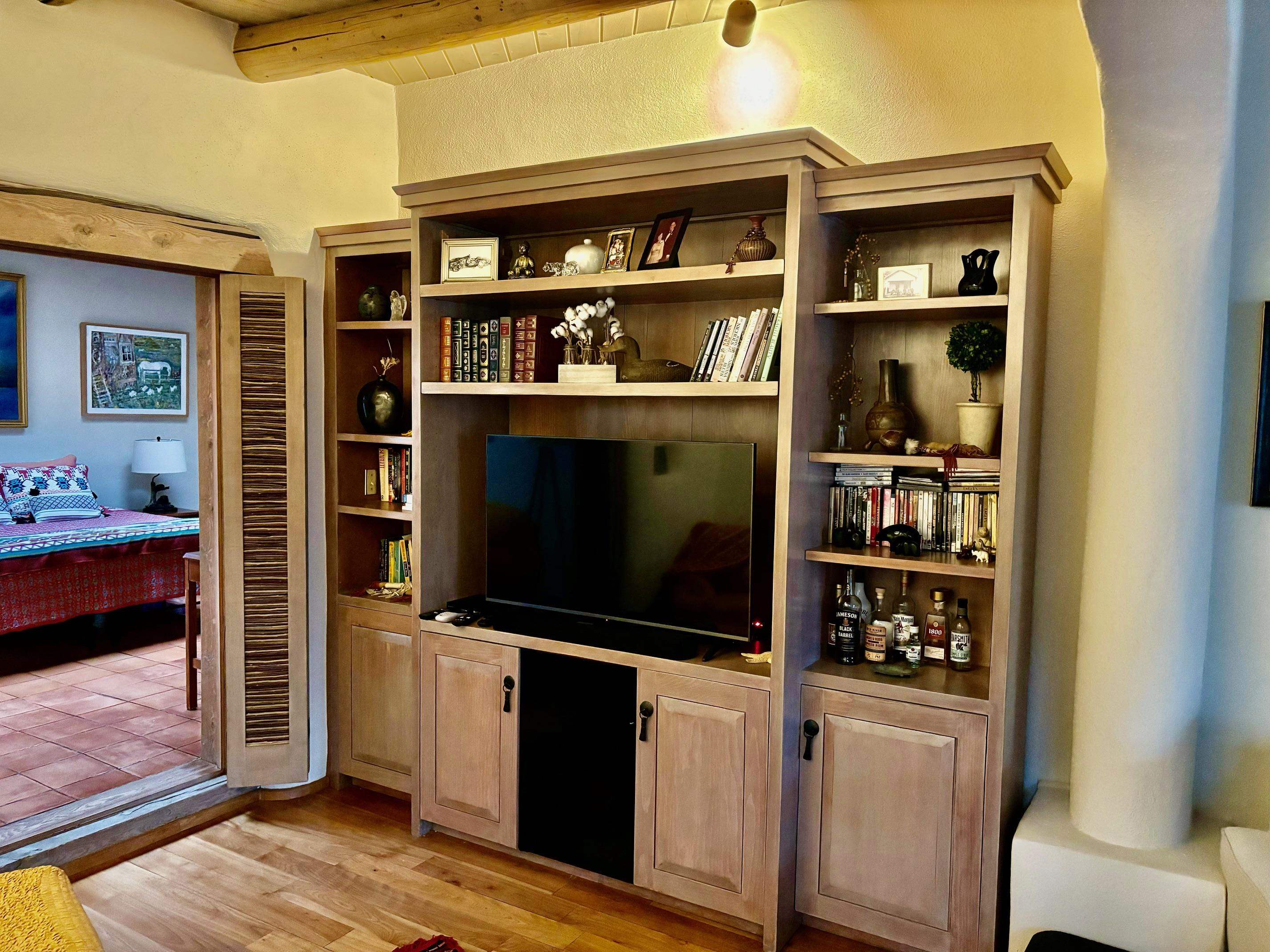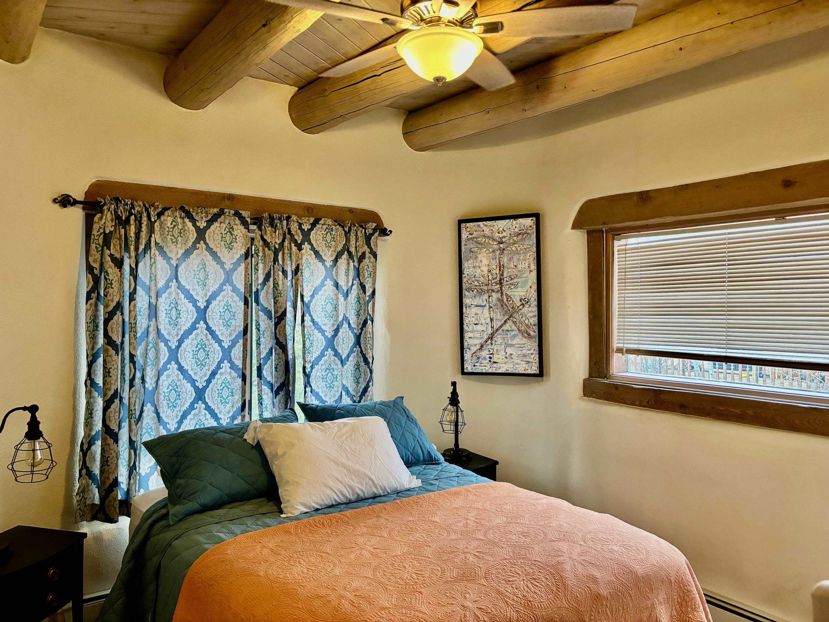 Authentic adobe house located near the historic Taos Plaza and Monte Sagrado. Located at the back end of Spruce Lane, a very quiet and secluded area. The adobe walls are thick. Features three bedrooms and two bathrooms. Two-story house. Features vigas throughout the house with tongue and grove wood. Floors feature wood and tile downstairs and carpet upstairs. The kitchen is large and features stainless steel appliances, built-in wine rack and white cabinets. The house has a formal dining room, and living room. One bedroom is downstairs and two bedrooms are upstairs. Washer and dryer are included. The house also features three fireplaces located in the living room, downstairs bedroom, and primary bedroom upstairs. The primary bedroom is cozy and double doors lead to a gorgeous sun room; plenty of windows and natural light. This room can be used in many different ways. The primary bedroom has a mini-split system for instant heating and air conditioning. The house has several multiple, large skylights. All this house is spread out over 2,188 square feet. The outside has superb landscaping including many trees, grass, flagstone patios and of course a free standing hot tub. This house is indeed a rare find. Come and see it. The square footage is not guaranteed by the seller or the broker so if this is of importance to the buyer then the buyer shall have the house measured by an expert.