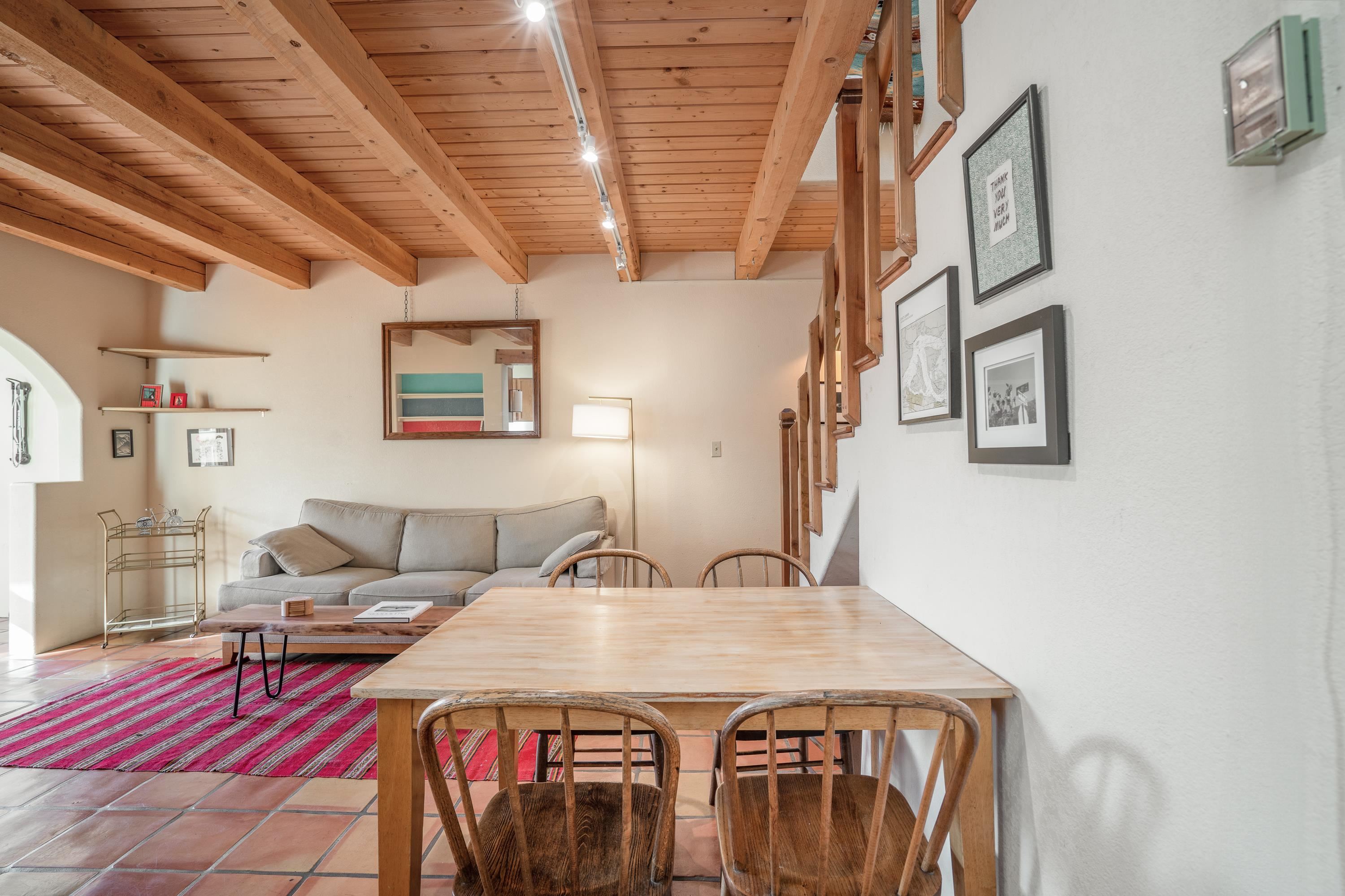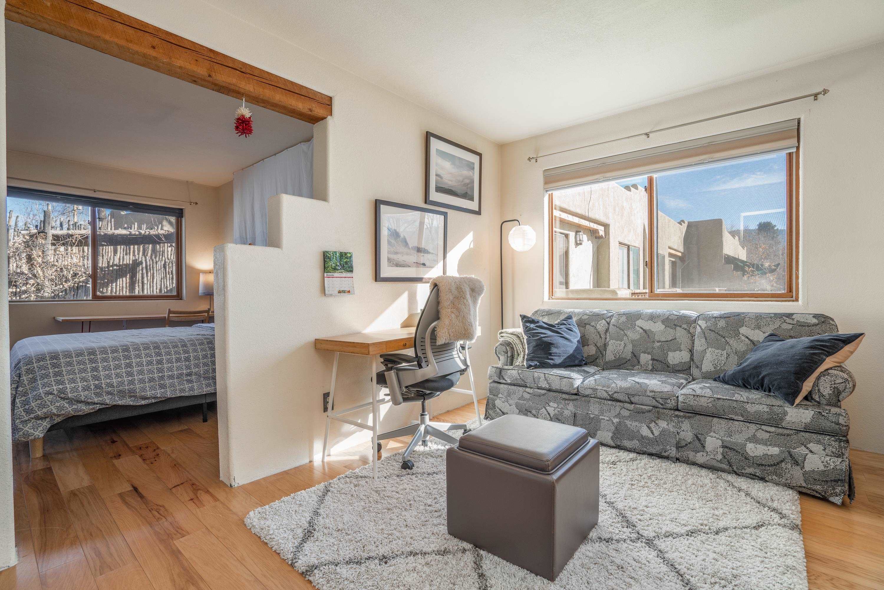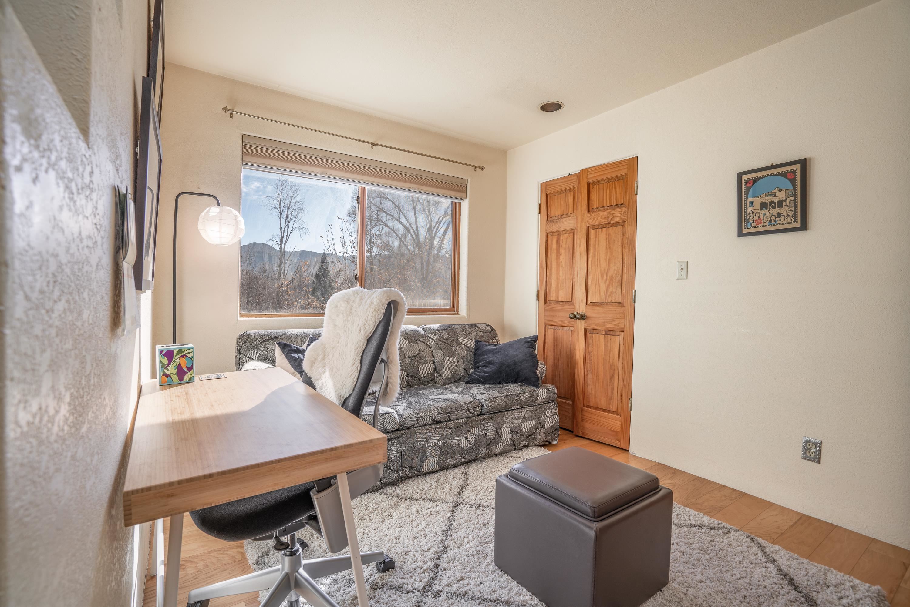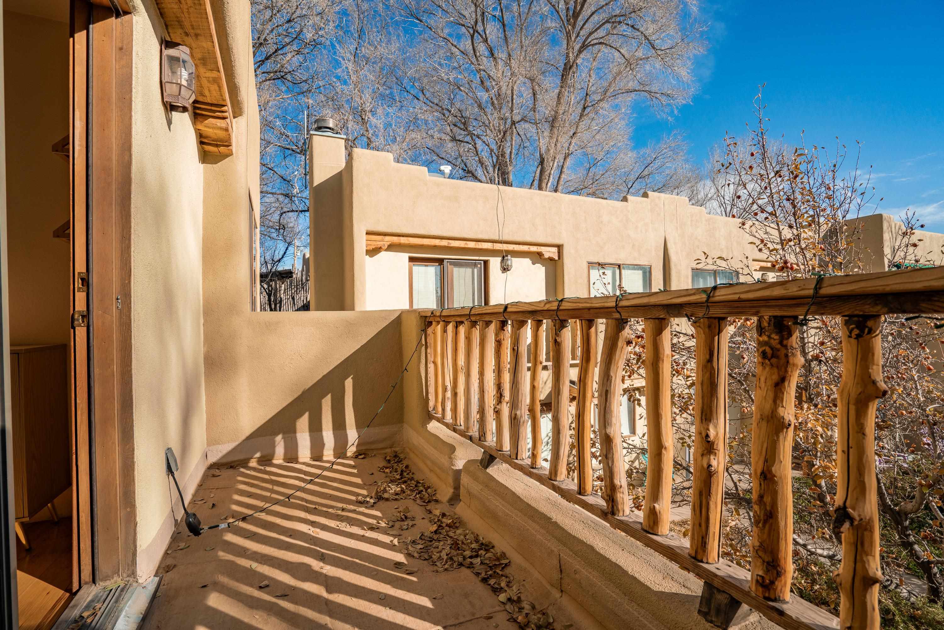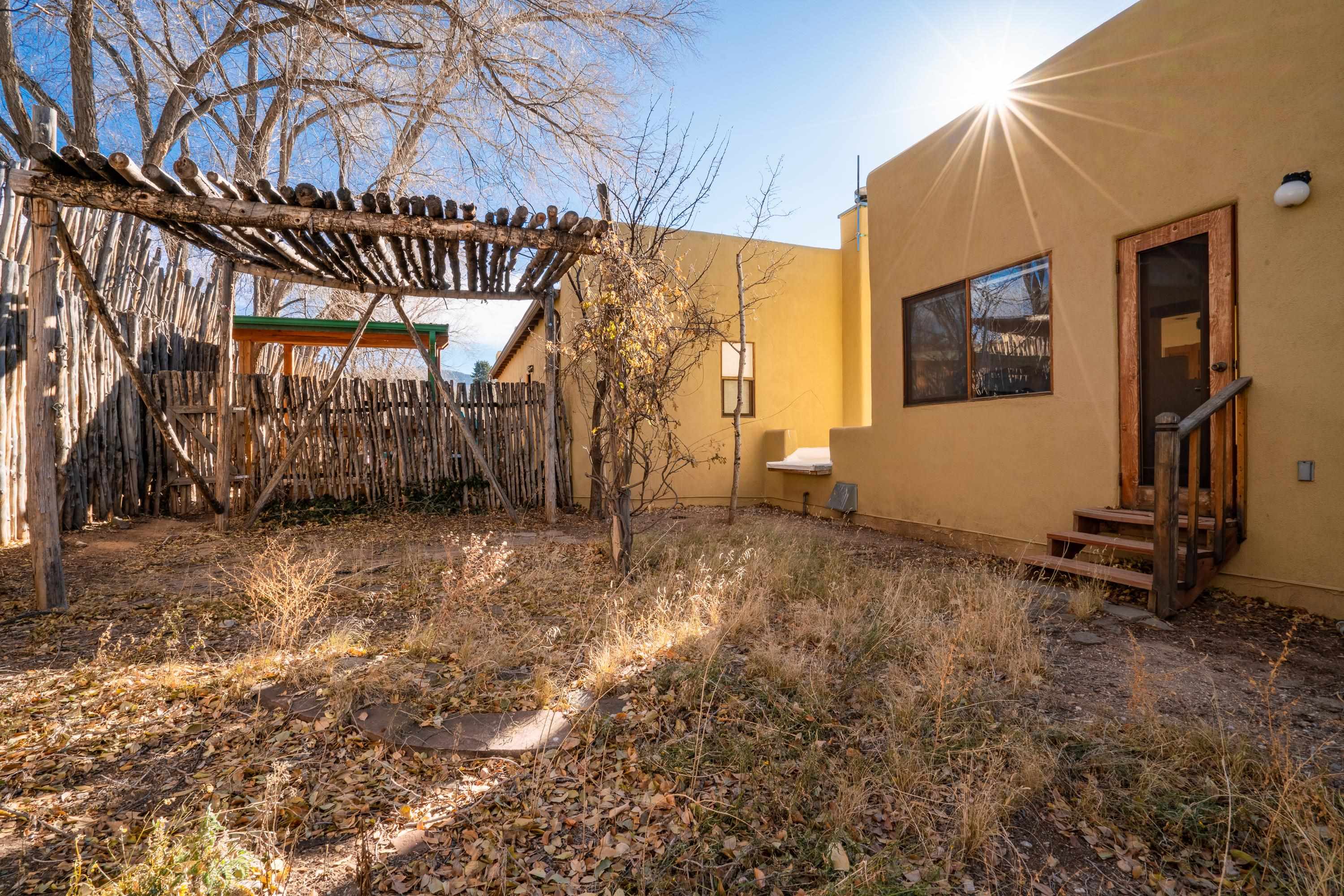 On desirable Las Cruces Street this charming, 2 bed, 1 and a half bath in-town condo at 1013 sq ft is the largest in the complex. Located in a shady quiet corner and yet within pleasant walking distance to Taos plaza, the shops, the eateries, the museums, and the galleries that surround and to nearby Kit Carson Park, this bright and cheery 1013 sq ft condo is easy to own as your pad, a pied a terre, or a vacation home. Enter through a sunny foyer into an open plan living/kitchen with powder room (half bath); upstairs are two bedrooms, a full bath, a bonus office or media room and a front and back deck plus a back yard awaiting your garden. The reasonable HOA (for 7 units) covers building maintenance, building insurance, water, sewer, trash, landscape maintenance and snow removal. A shared laundry and ample parking make for convenient in-town living.
