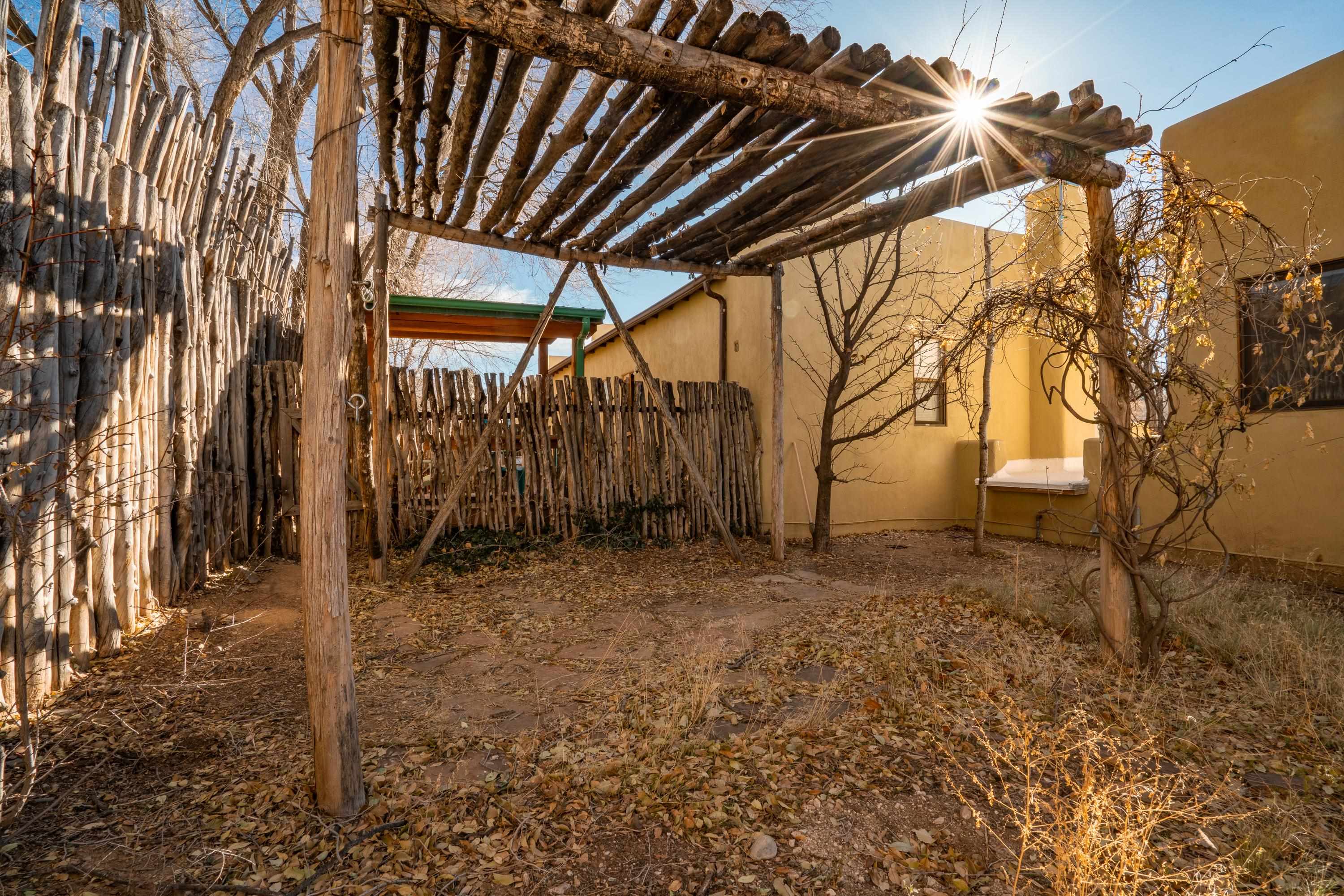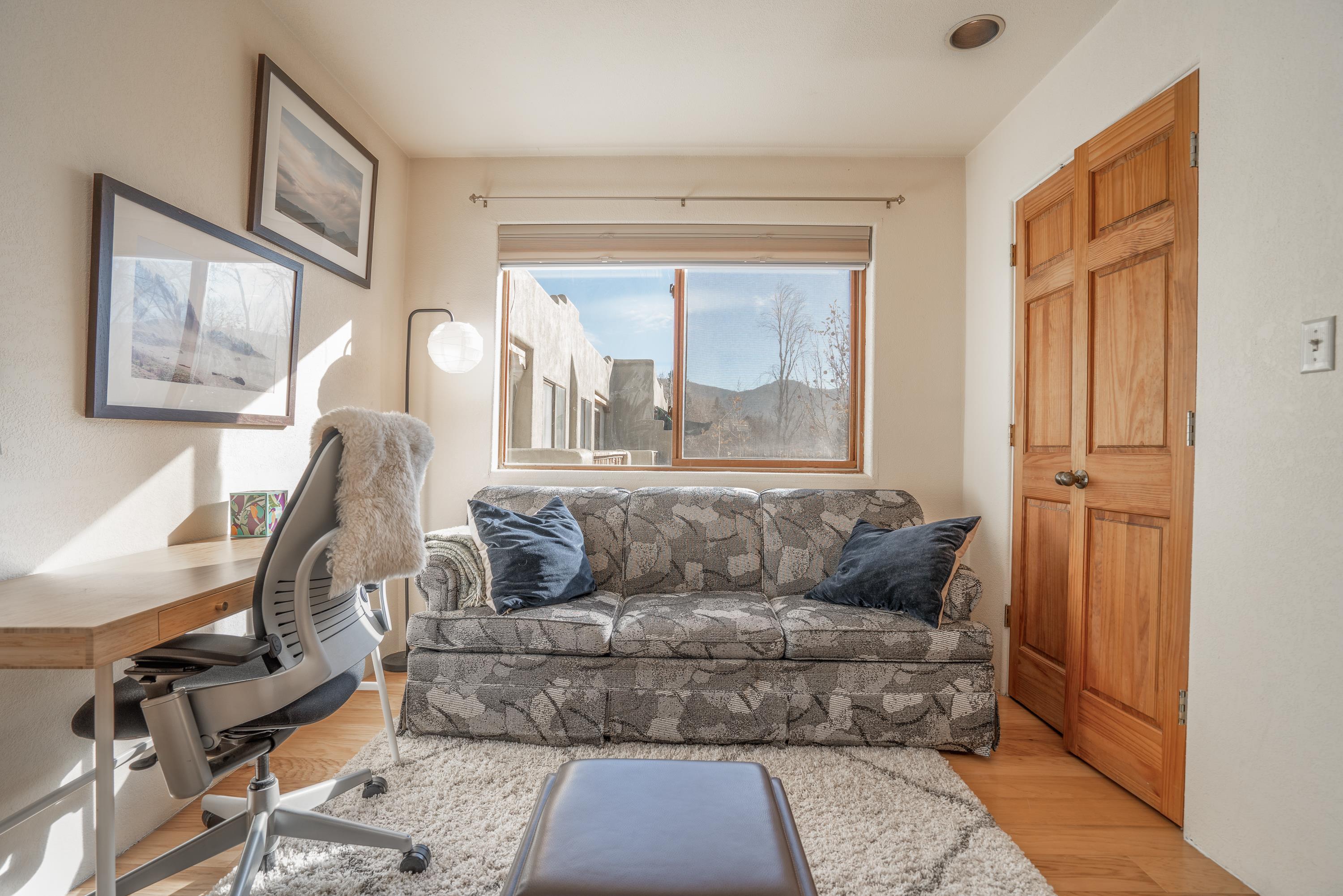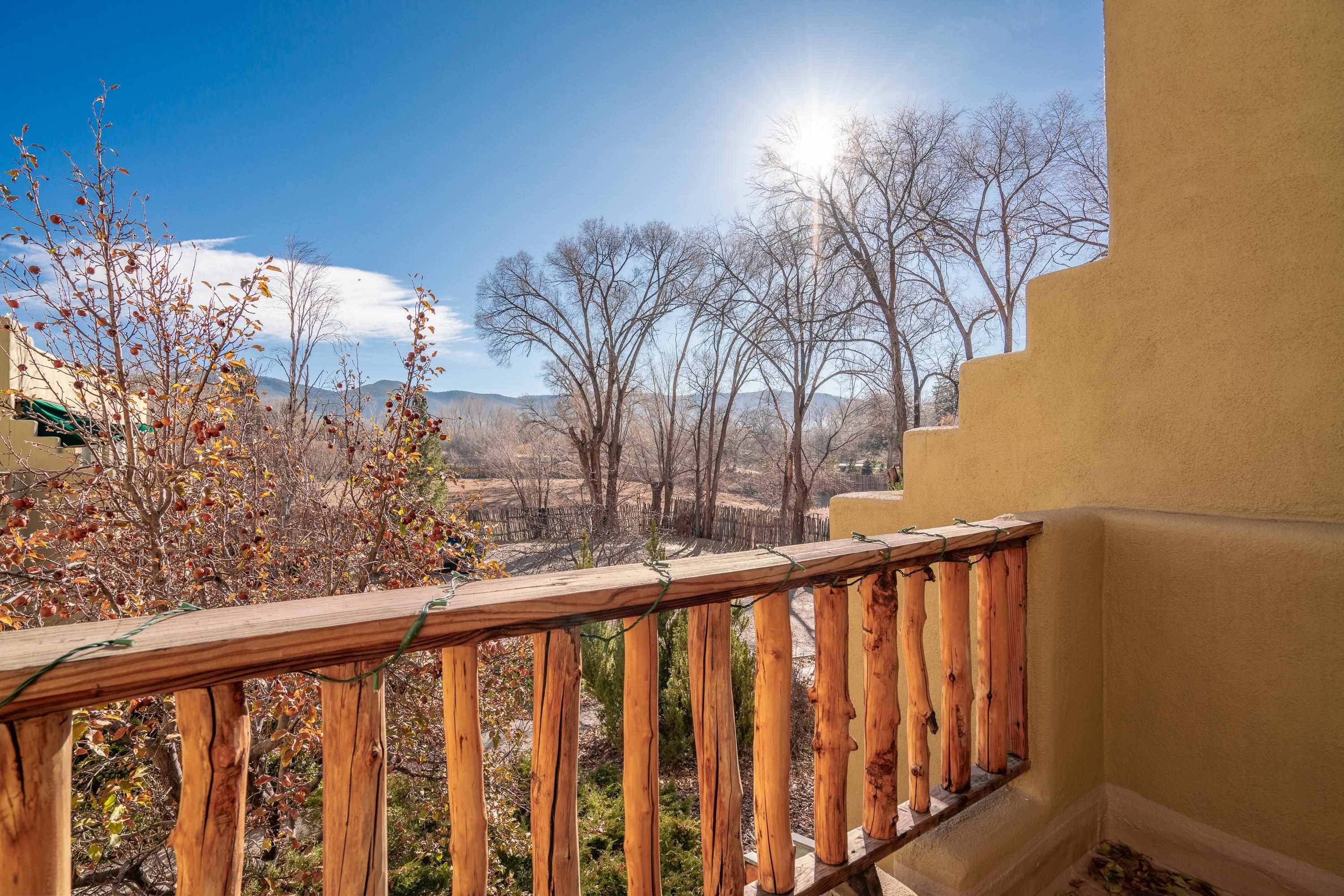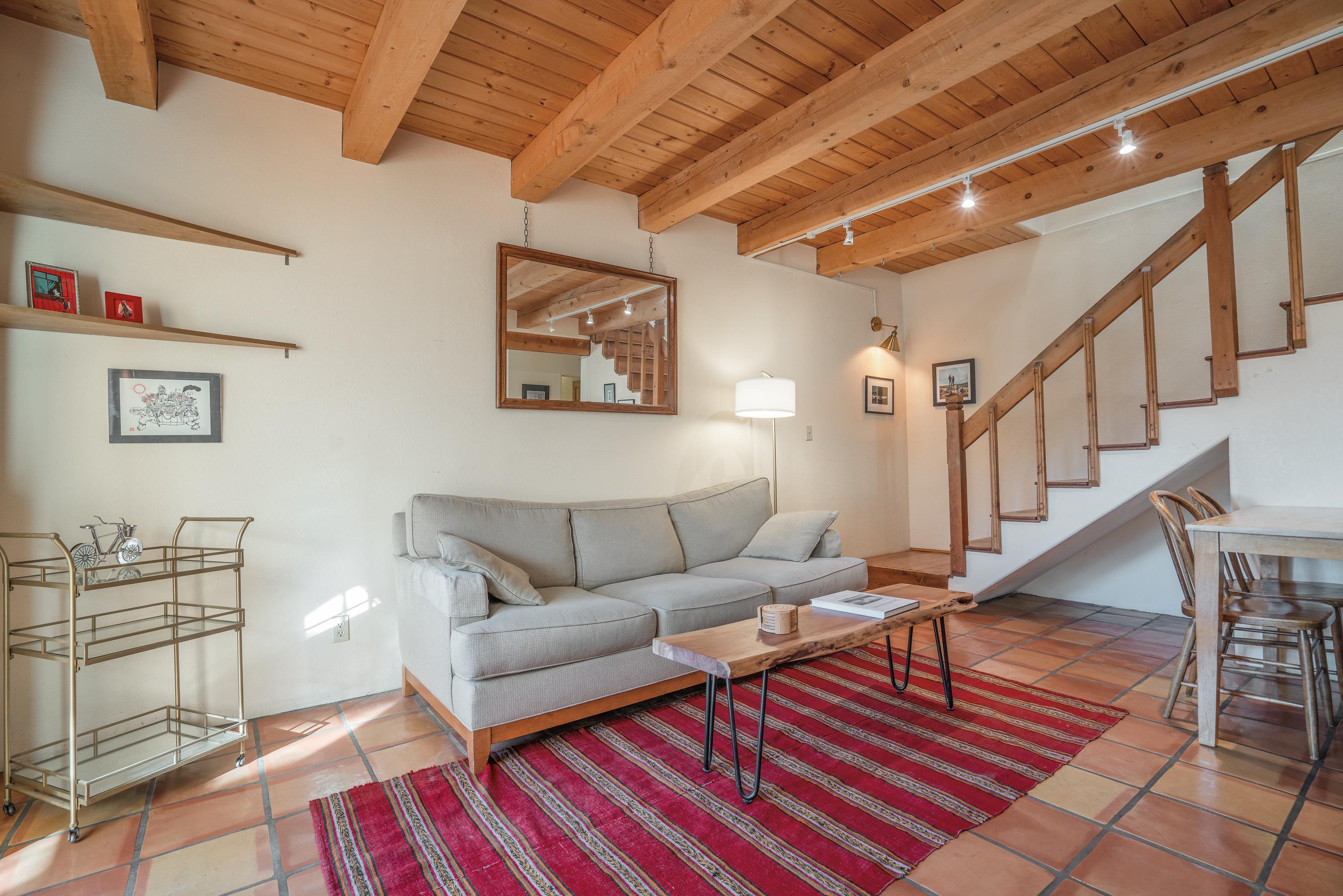 On desirable Las Cruces Street this charming, 2 bed, 1 and a half bath in-town condo at 1013 sq ft is the largest in the complex. Located in a shady quiet corner and yet within pleasant walking distance to Taos plaza, the shops, the eateries, the museums, and the galleries that surround and to nearby Kit Carson Park, this bright and cheery 1013 sq ft condo is easy to own as your pad, a pied a terre, or a vacation home. Enter through a sunny foyer into an open plan living/kitchen with powder room (half bath); upstairs are two bedrooms, a full bath, a bonus office or media room and a front and back deck plus a back yard awaiting your garden. The reasonable HOA (for 7 units) covers building maintenance, building insurance, water, sewer, trash, landscape maintenance and snow removal. A shared laundry and ample parking make for convenient in-town living.