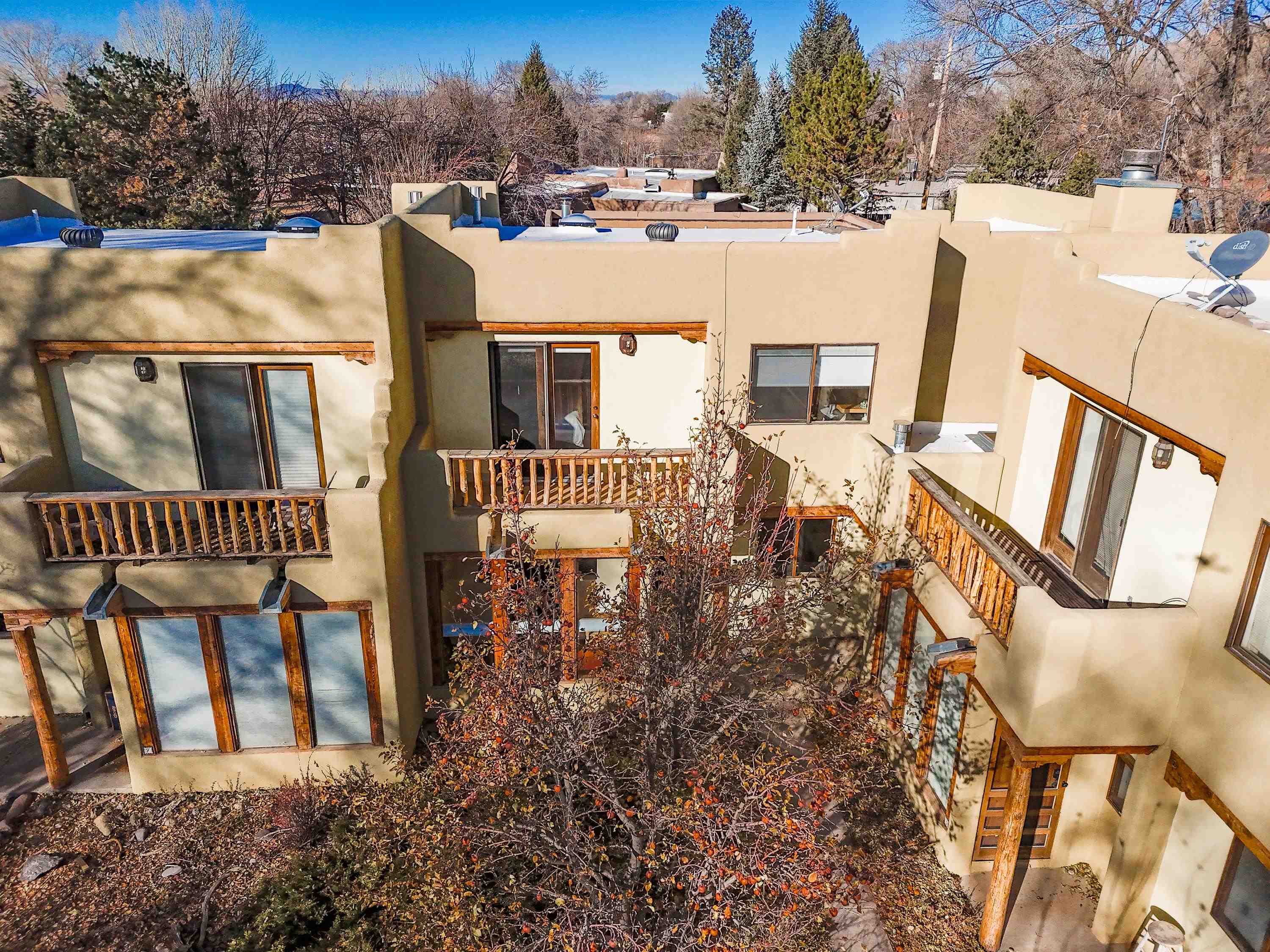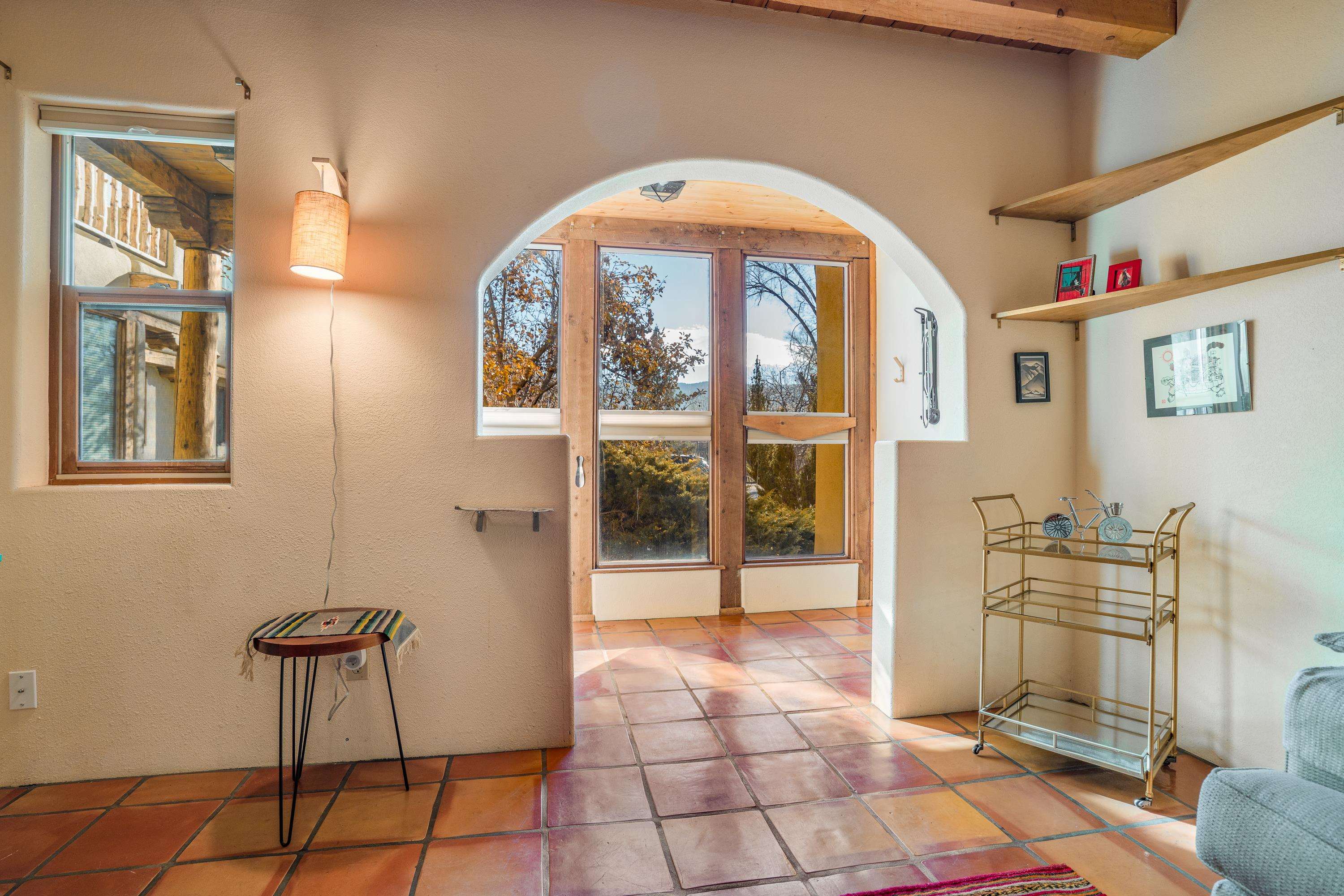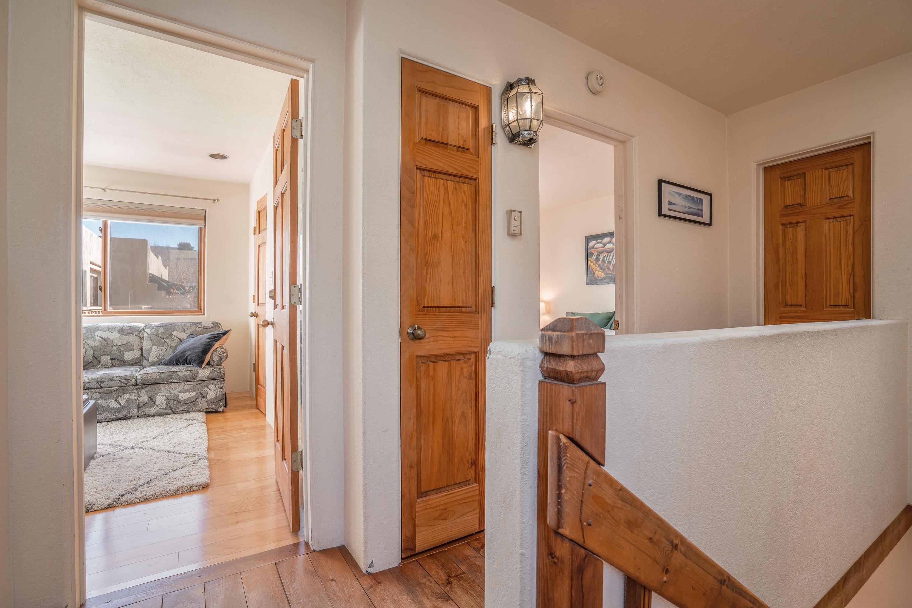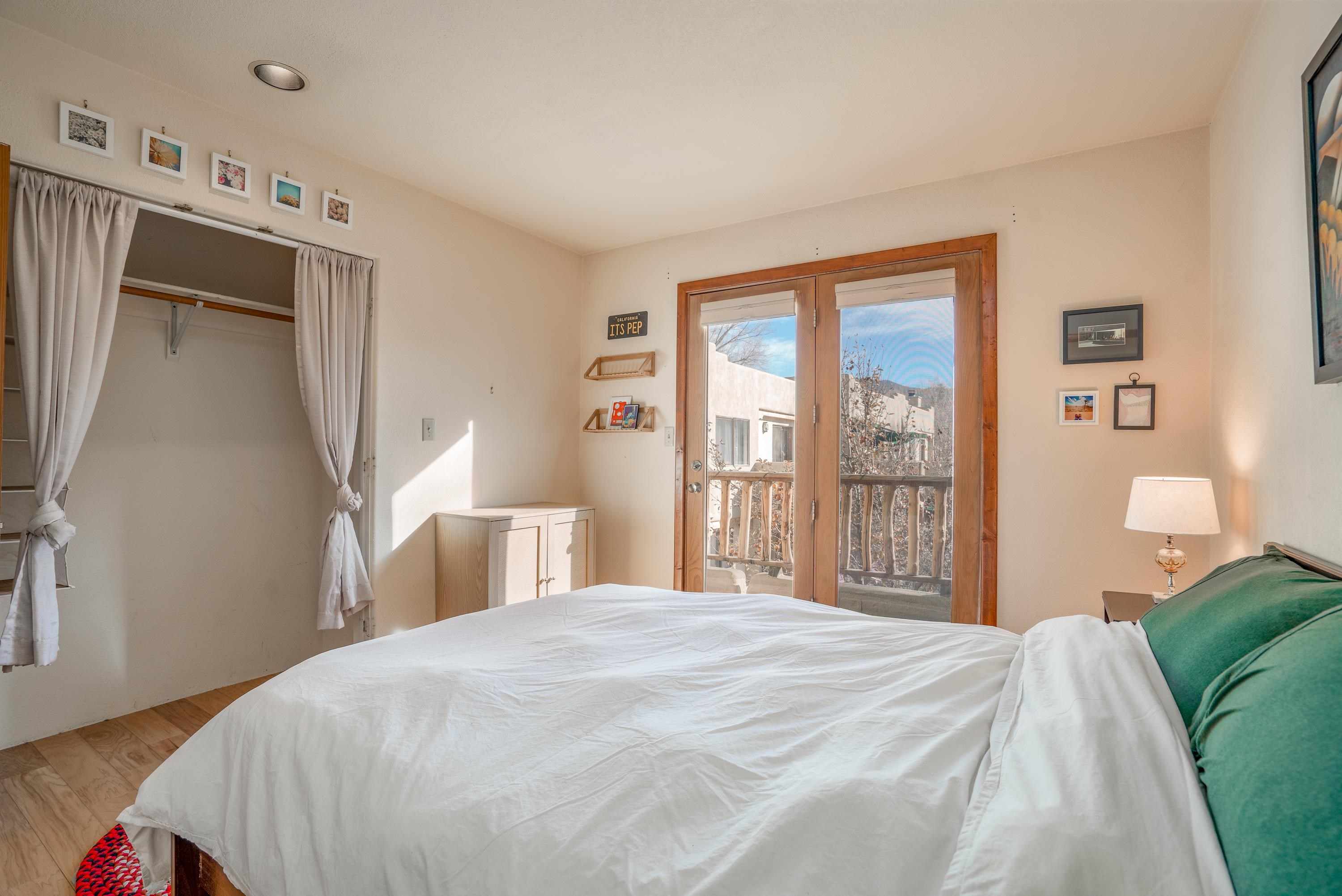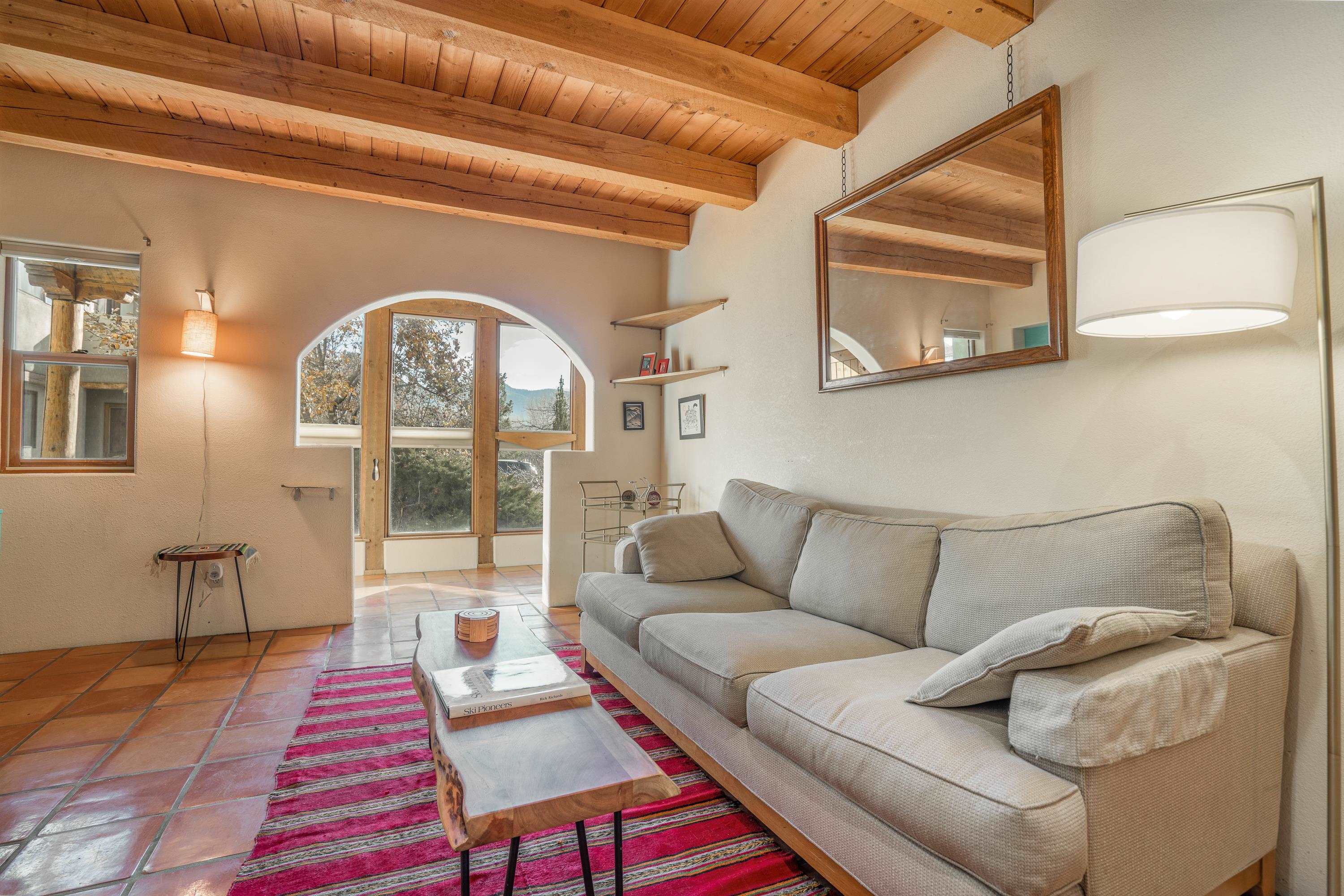 On desirable Las Cruces Street this charming, 2 bed, 1 and a half bath in-town condo at 1013 sq ft is the largest in the complex. Located in a shady quiet corner and yet within pleasant walking distance to Taos plaza, the shops, the eateries, the museums, and the galleries that surround and to nearby Kit Carson Park, this bright and cheery 1013 sq ft condo is easy to own as your pad, a pied a terre, or a vacation home. Enter through a sunny foyer into an open plan living/kitchen with powder room (half bath); upstairs are two bedrooms, a full bath, a bonus office or media room and a front and back deck plus a back yard awaiting your garden. The reasonable HOA (for 7 units) covers building maintenance, building insurance, water, sewer, trash, landscape maintenance and snow removal. A shared laundry and ample parking make for convenient in-town living.
