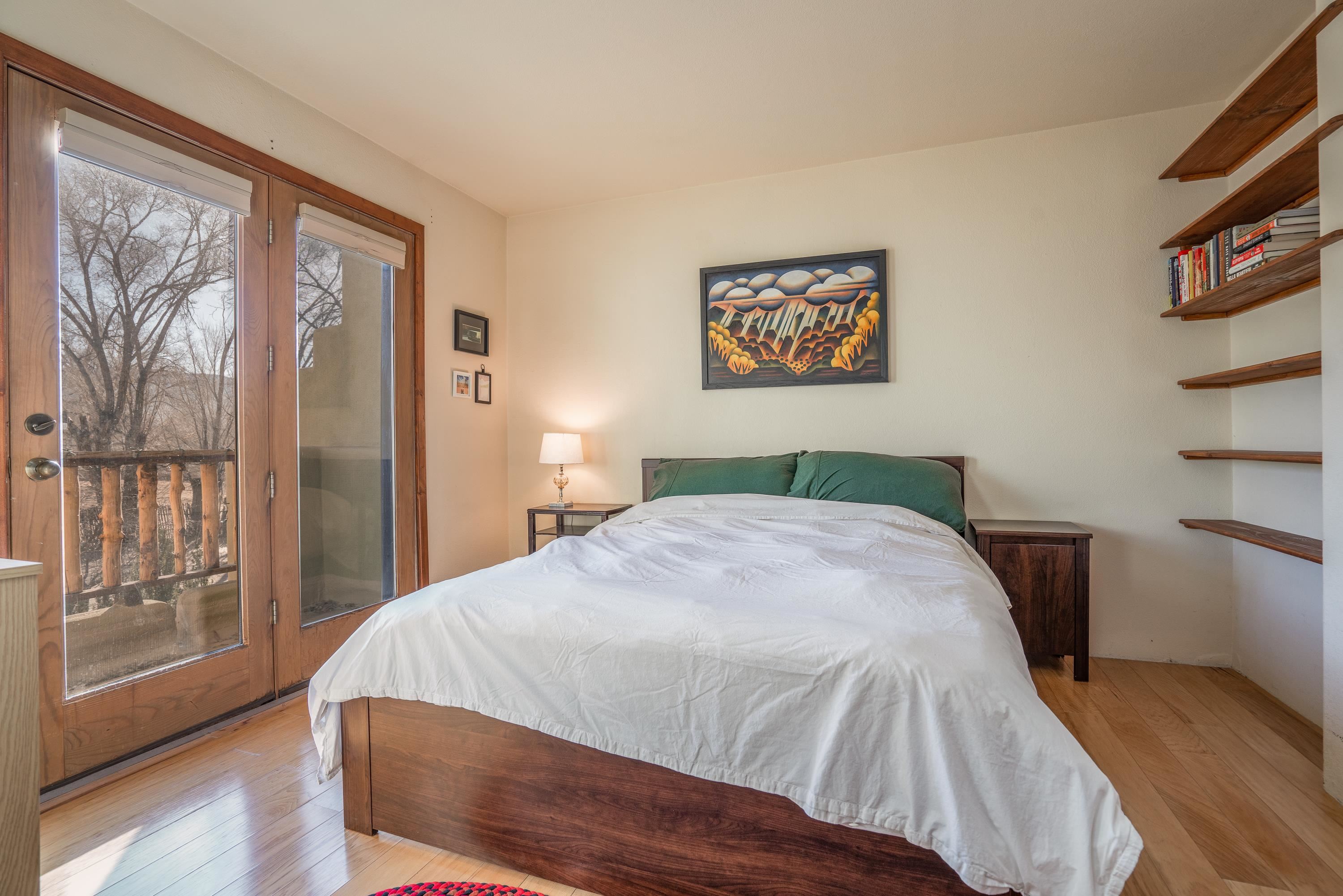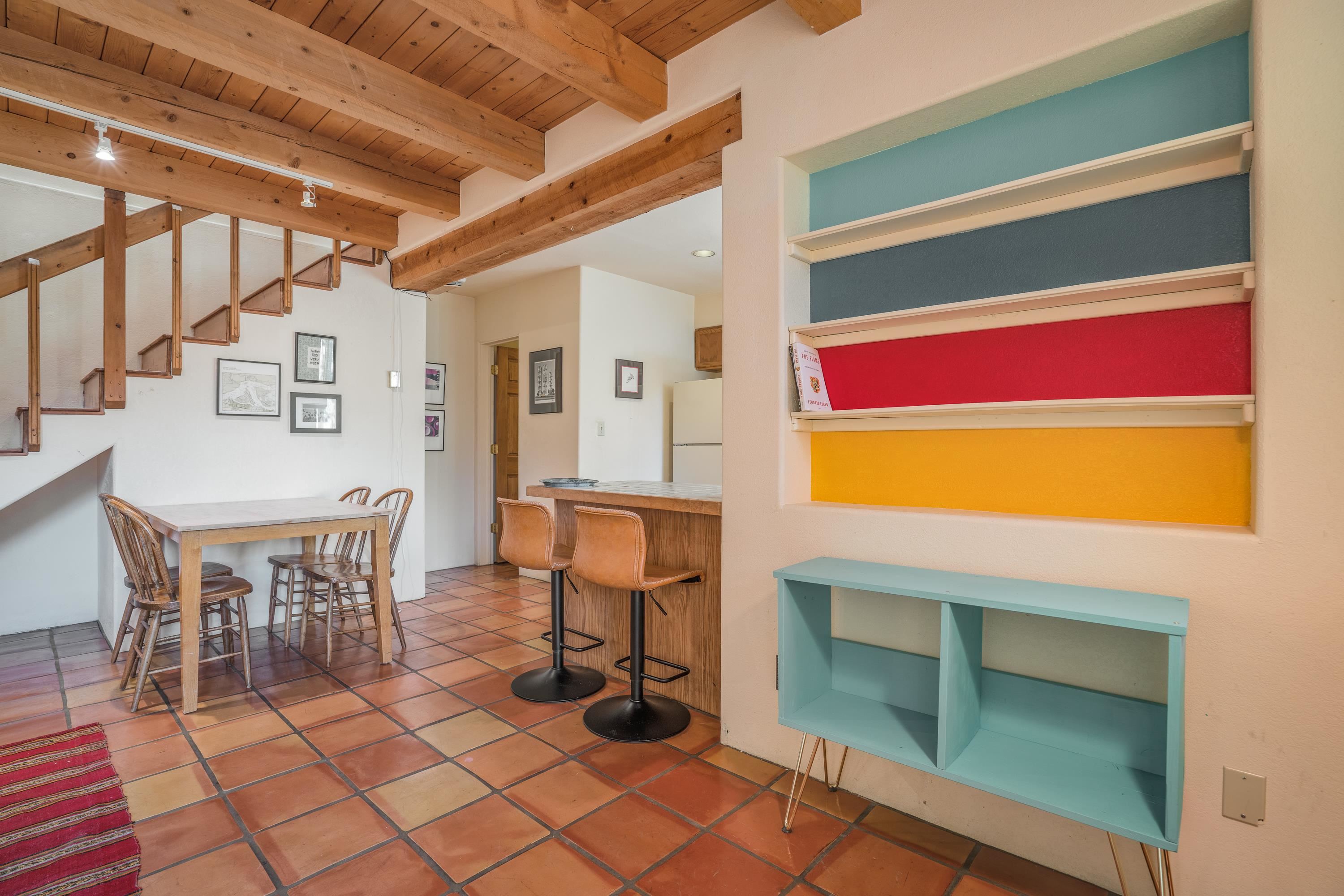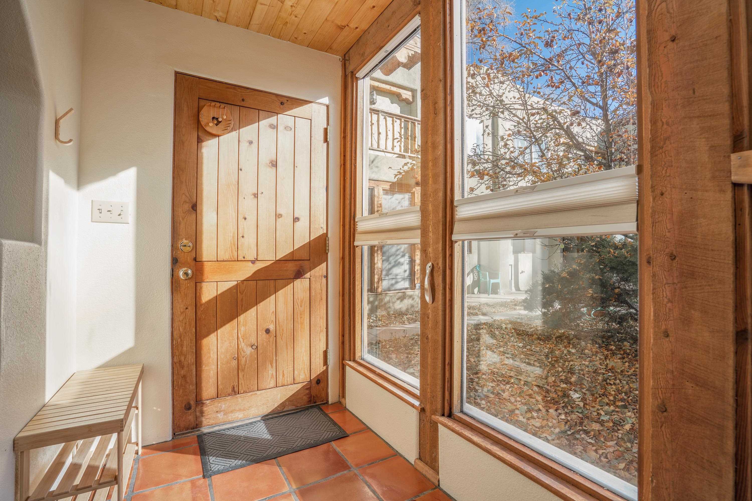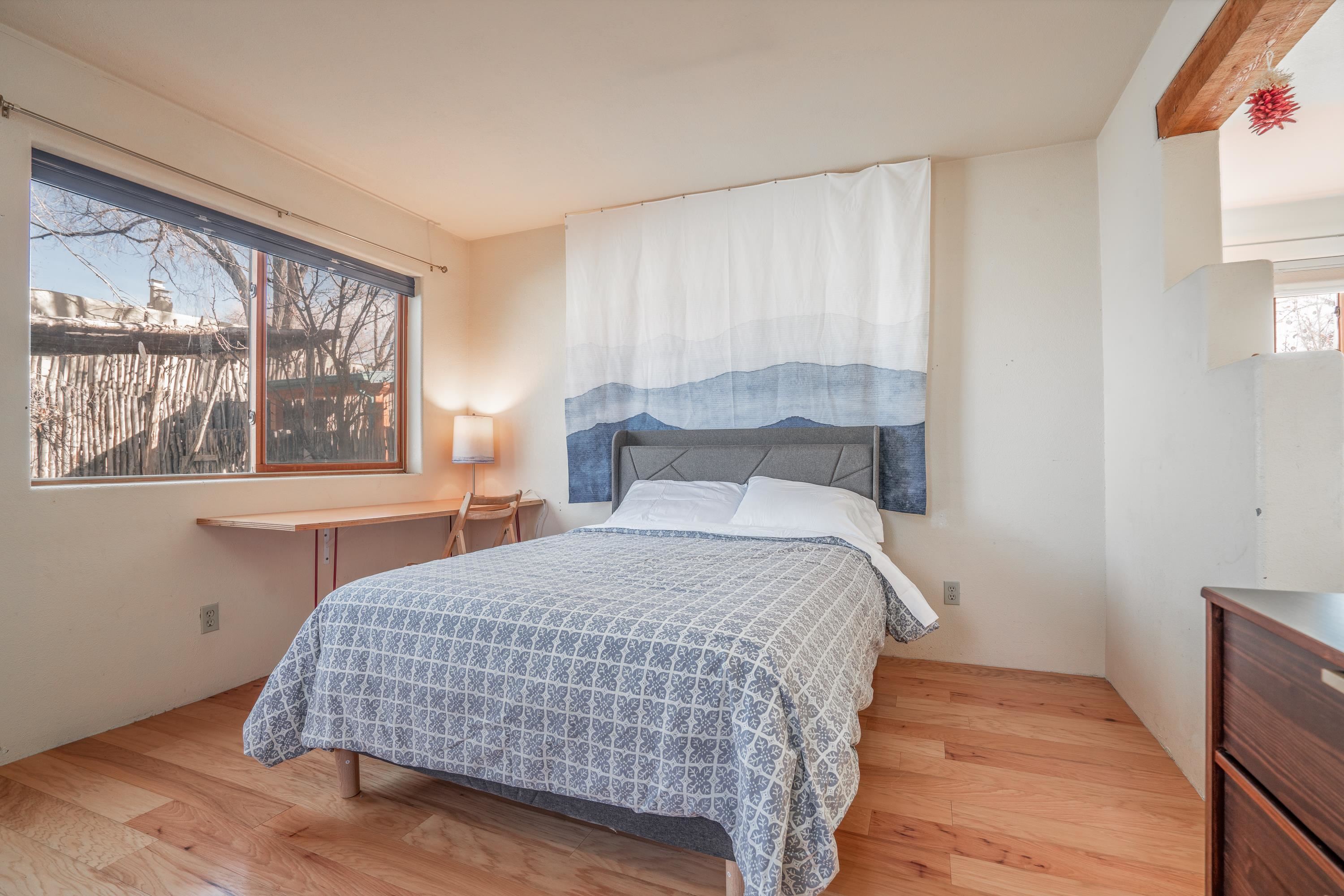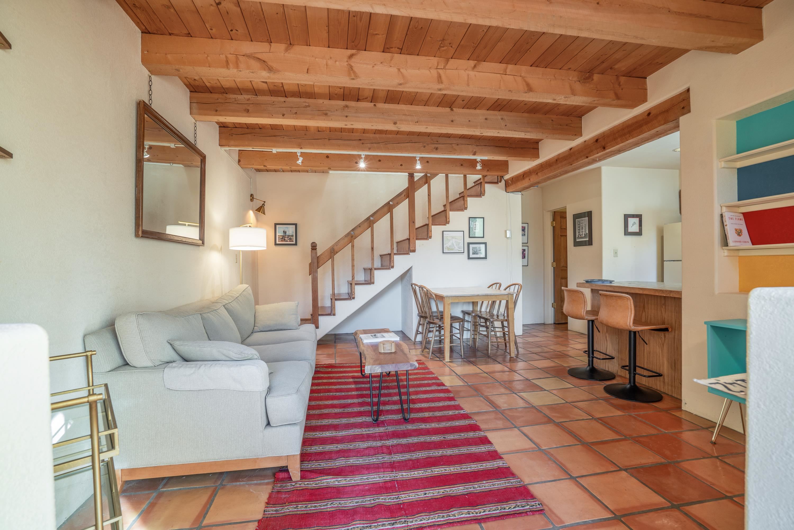 On desirable Las Cruces Street this charming, 2 bed, 1 and a half bath in-town condo at 1013 sq ft is the largest in the complex. Located in a shady quiet corner and yet within pleasant walking distance to Taos plaza, the shops, the eateries, the museums, and the galleries that surround and to nearby Kit Carson Park, this bright and cheery 1013 sq ft condo is easy to own as your pad, a pied a terre, or a vacation home. Enter through a sunny foyer into an open plan living/kitchen with powder room (half bath); upstairs are two bedrooms, a full bath, a bonus office or media room and a front and back deck plus a back yard awaiting your garden. The reasonable HOA (for 7 units) covers building maintenance, building insurance, water, sewer, trash, landscape maintenance and snow removal. A shared laundry and ample parking make for convenient in-town living.