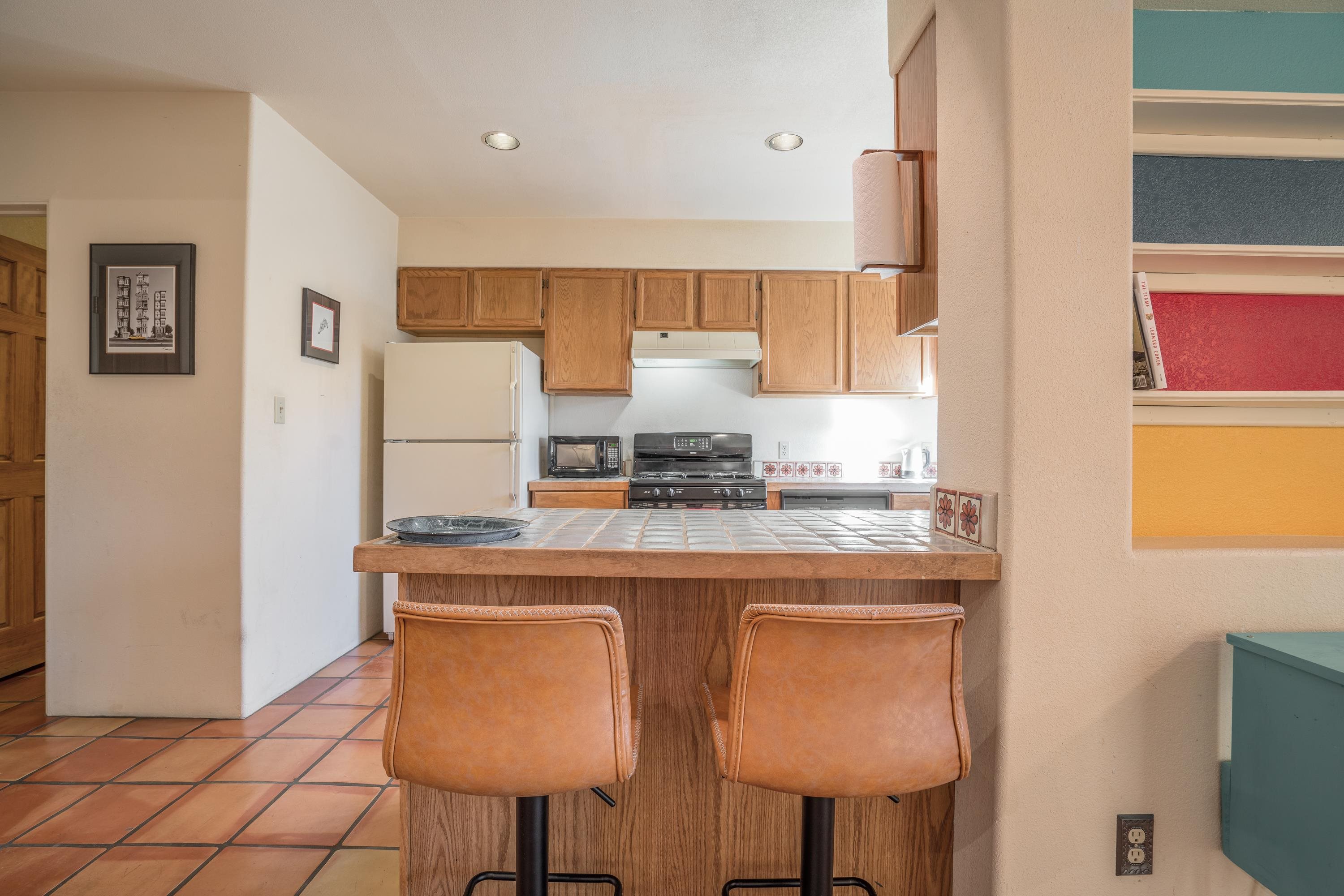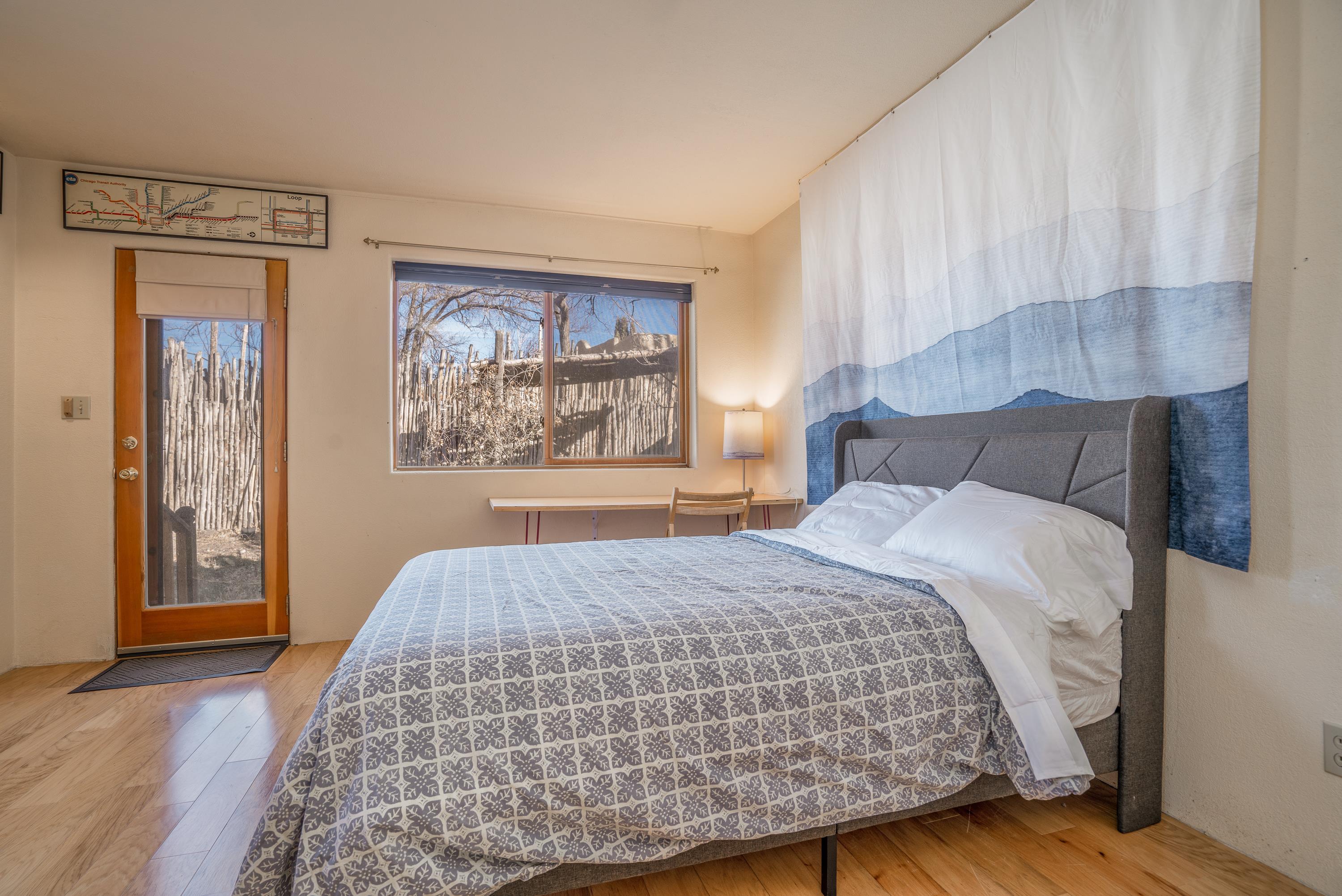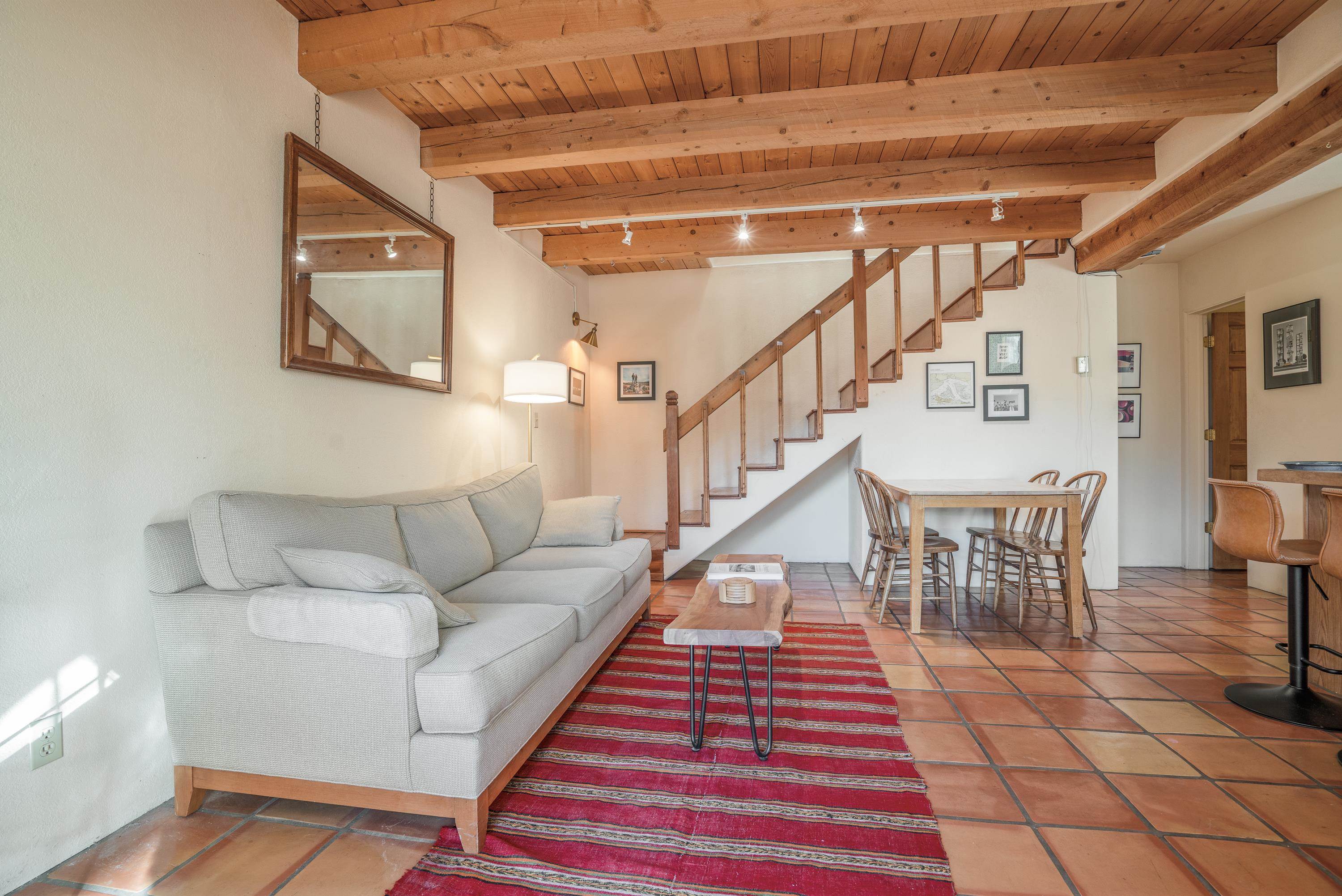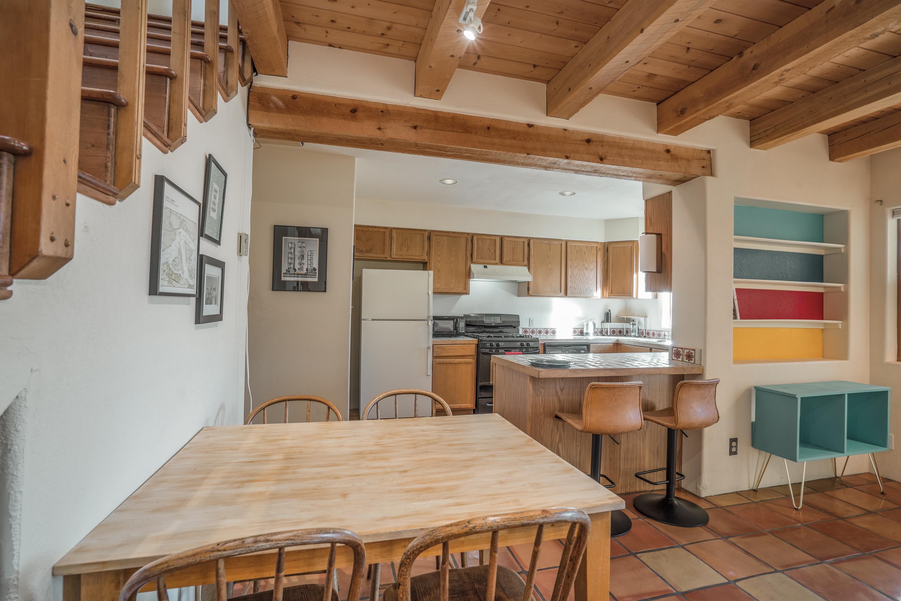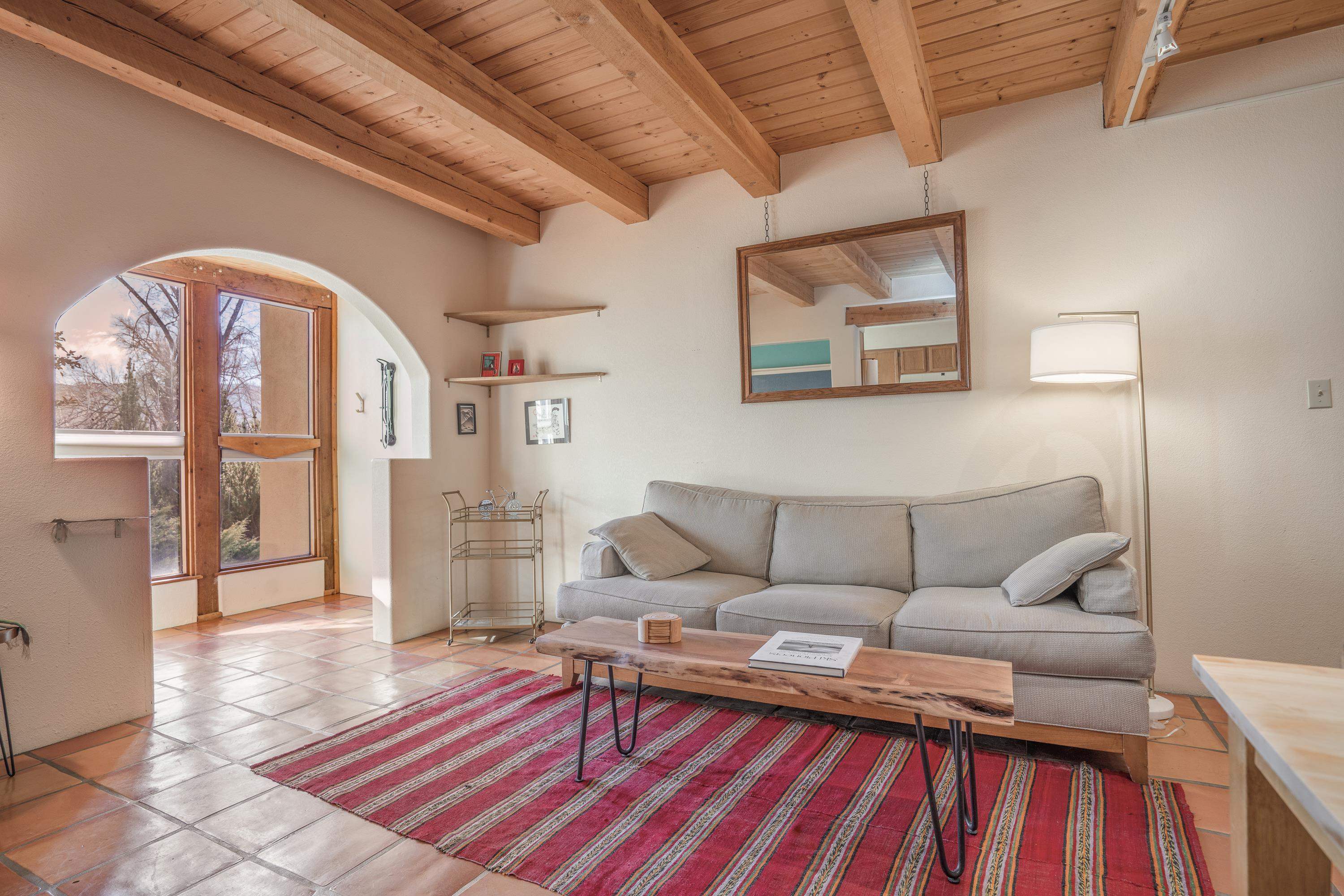 On desirable Las Cruces Street this charming, 2 bed, 1 and a half bath in-town condo at 1013 sq ft is the largest in the complex. Located in a shady quiet corner and yet within pleasant walking distance to Taos plaza, the shops, the eateries, the museums, and the galleries that surround and to nearby Kit Carson Park, this bright and cheery 1013 sq ft condo is easy to own as your pad, a pied a terre, or a vacation home. Enter through a sunny foyer into an open plan living/kitchen with powder room (half bath); upstairs are two bedrooms, a full bath, a bonus office or media room and a front and back deck plus a back yard awaiting your garden. The reasonable HOA (for 7 units) covers building maintenance, building insurance, water, sewer, trash, landscape maintenance and snow removal. A shared laundry and ample parking make for convenient in-town living.