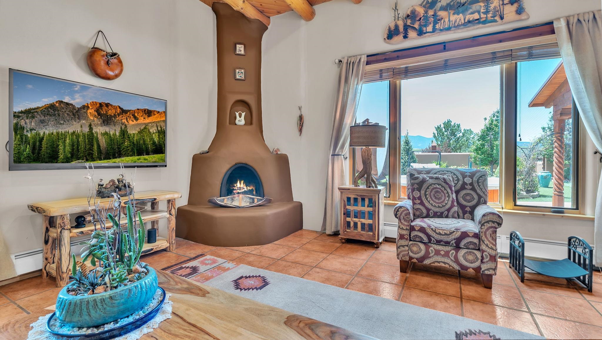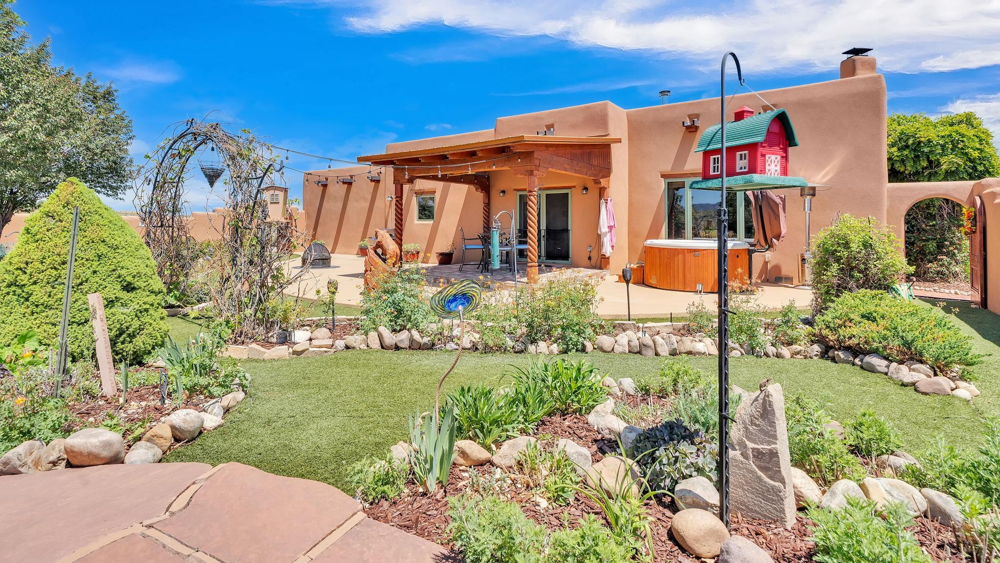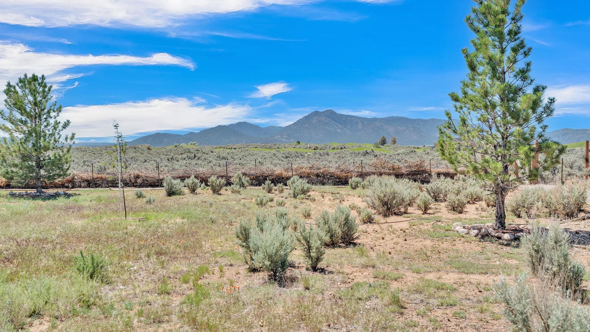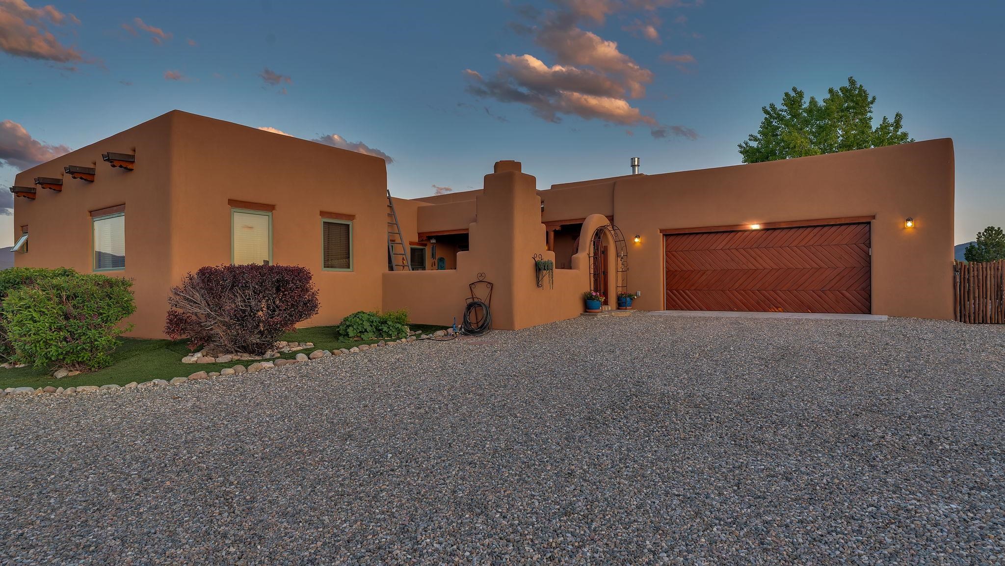 An Extraordinary High Desert Escape Bordering Taos Country Club ~ Turn onto a private and quiet Copper Moon Road, drive all the way to the very end, and feel the world melt away as you make your way into a hidden oaasis through the automatic gate. A charming front courtyard will embrace you and your guests with the crackling sounds of an outdoor traditional wood-burning fireplace and a serene fountain--the perfect prelude to the beauty within, and all around. Upon entering this masterfully crafted Southwestern style home where almost every window frames the majestic Sangre de Cristo Mountains, you immediately feel like you are exactly where you should be. This 1,988 square foot residence possesses a generous layout with three bedrooms, two and a half bathrooms, and an oversized two-car garage. The living room, dining room, and kitchen seamlessly merge to create an inviting open-space for connection and relaxation. The chef's kitchen is guaranteed to inspire culinary adventure on the daily with its stainless steel appliances, such as, a Miele Induction Stove, a double oven, and tons of thoughtful storage, including a turning pantry. Throughout the home, authentic Southwestern details captivate: vigas, tongue-and-groove ceilings, twisted beams, a second traditional fireplace, 17-inch tile throughout, and creative lighting fixtures--even within a striking lit display in the dining room. Soaring 12-foot ceilings in the common areas and 10-foot ceilings in the bedrooms amplify the sense of spaciousness. The freestanding Hearthstone wood burning fireplace in the living room is a major plus, and has the ability to keep the entire home warm by itself. Beyond the walls, this incredibly private home sits on 2 lush acres overlooking hole #3 at Taos Country Club. Immaculate landscaping thrives with drip irrigation, ensuring effortless beauty year-round, and especially so at this very Spring moment following abundant rainfall. Explore a labyrinth out back in the courtyard, kick back and relax on adirondack chairs during magical sunsets and sunrises, and cultivate your green thumb passions in the enclosed vegetable garden. The back courtyard is a true delight, boasting perennial flowers, a variety of deciduous and fruit trees, and a free-standing hot tub to relax in after a long day of working the yard, playing a round, or hitting the ski slopes. For all your projects and toys, a 20x30 foot electrified workshop and a 12x30 foot RV carport are ready to go at the corner of the property. This property is an easy outlet out of town to Santa Fe, an easy drive to town on the back-roads, and just down the road from hiking, fishing and mountain biking at the Slide Trailhead down CR-110. Properties with ALL of this are a rare find these days, and especially for this price. Come see for yourself!