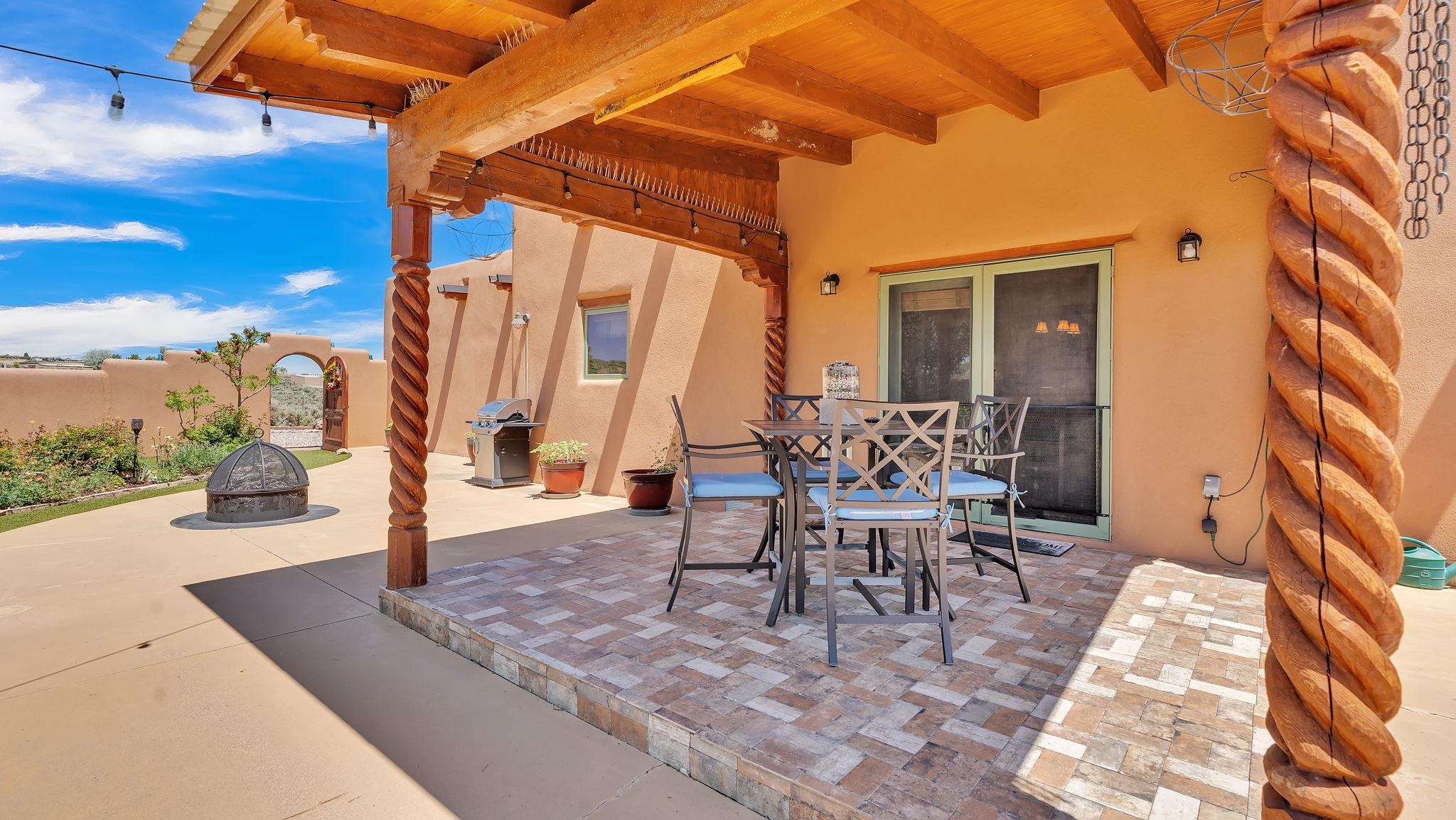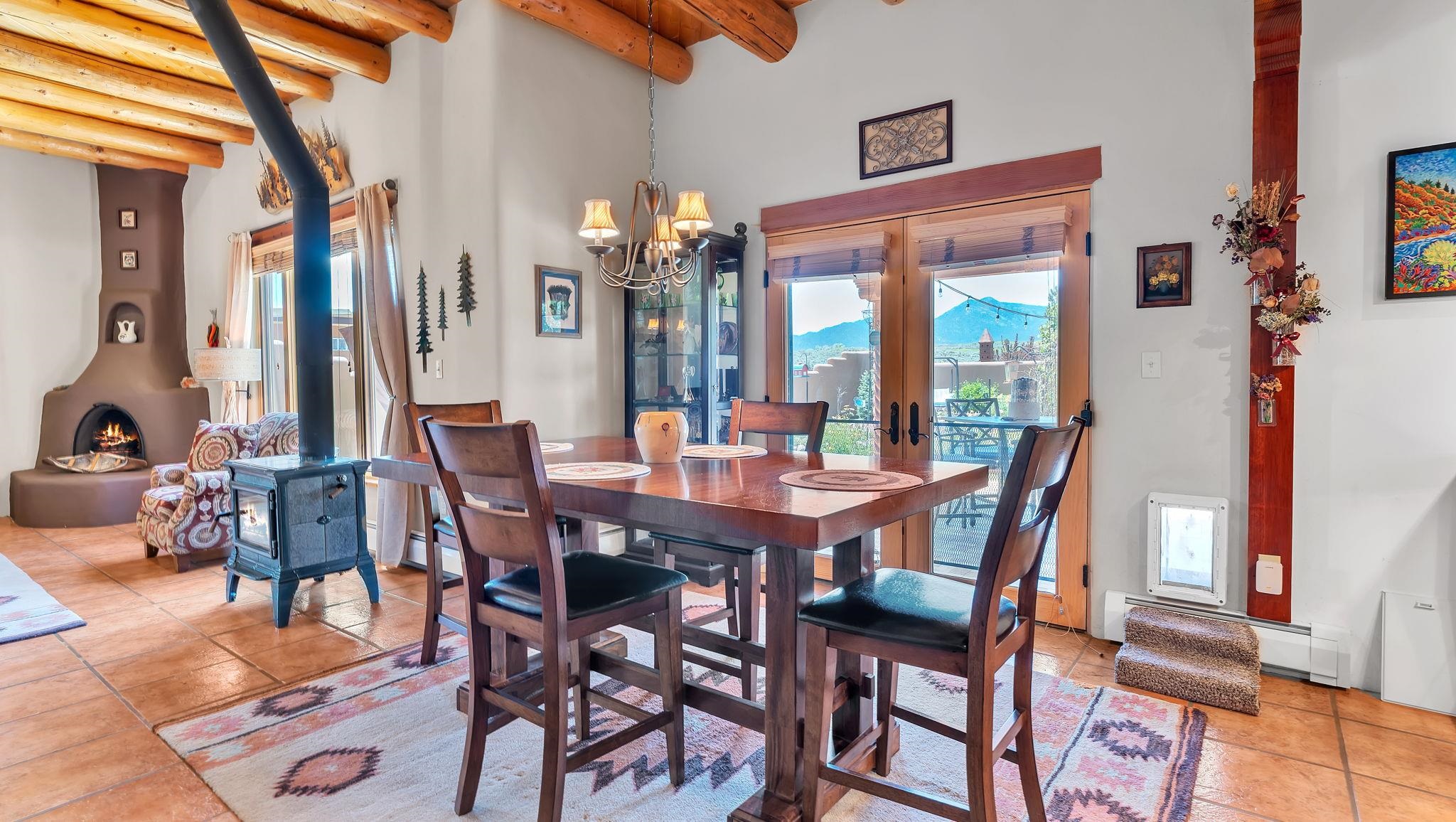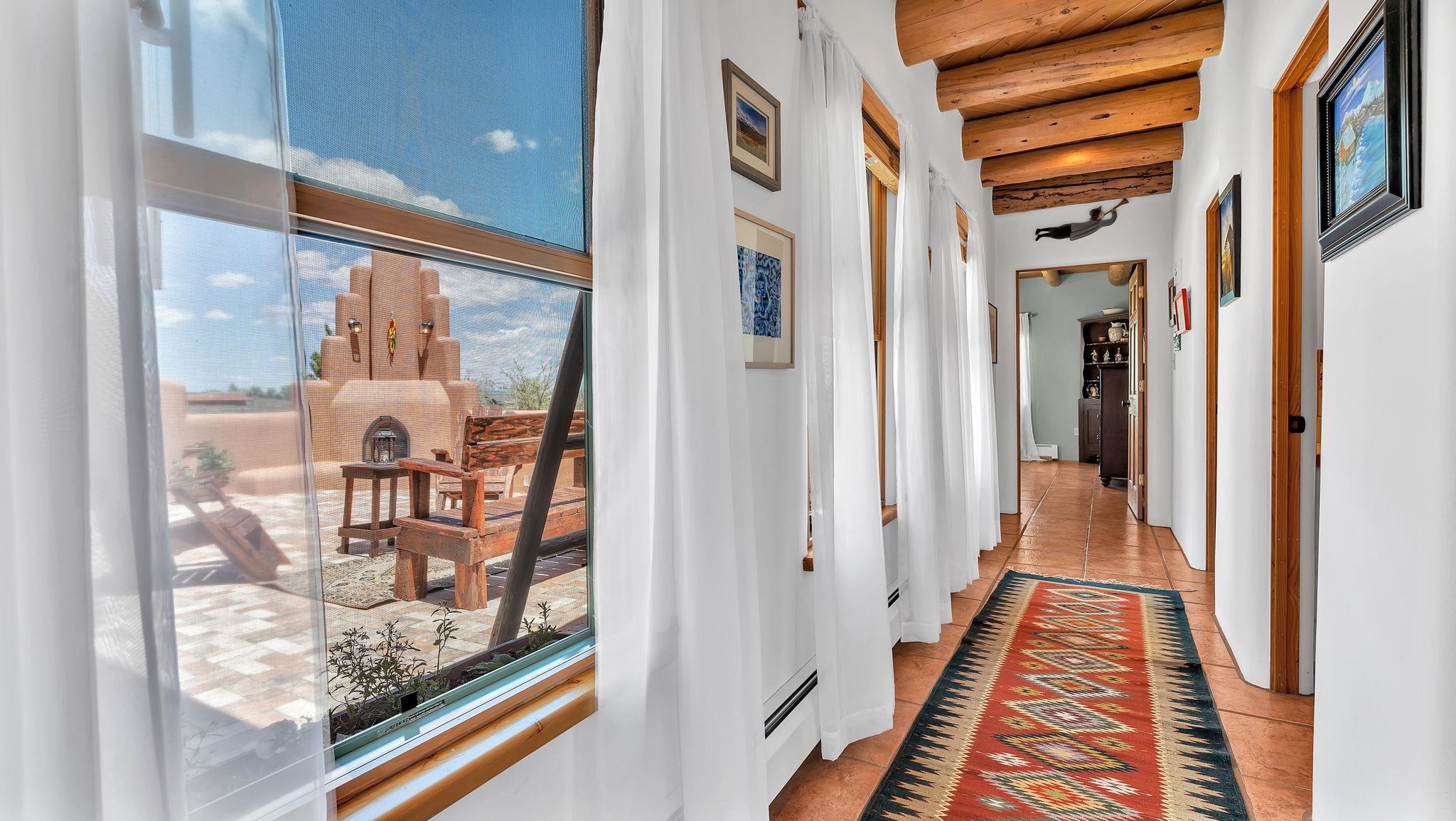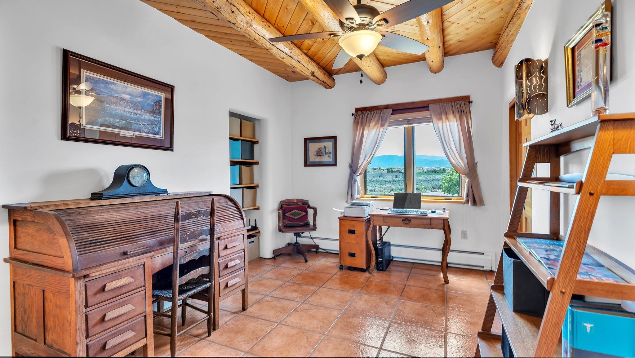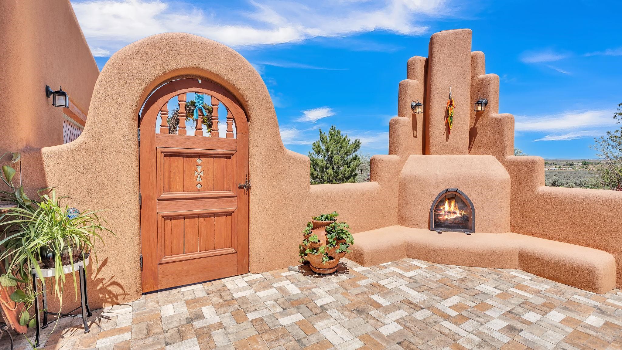 An Extraordinary High Desert Escape Bordering Taos Country Club ~ Turn onto a private and quiet Copper Moon Road, drive all the way to the very end, and feel the world melt away as you make your way into a hidden oaasis through the automatic gate. A charming front courtyard will embrace you and your guests with the crackling sounds of an outdoor traditional wood-burning fireplace and a serene fountain--the perfect prelude to the beauty within, and all around. Upon entering this masterfully crafted Southwestern style home where almost every window frames the majestic Sangre de Cristo Mountains, you immediately feel like you are exactly where you should be. This 1,988 square foot residence possesses a generous layout with three bedrooms, two and a half bathrooms, and an oversized two-car garage. The living room, dining room, and kitchen seamlessly merge to create an inviting open-space for connection and relaxation. The chef's kitchen is guaranteed to inspire culinary adventure on the daily with its stainless steel appliances, such as, a Miele Induction Stove, a double oven, and tons of thoughtful storage, including a turning pantry. Throughout the home, authentic Southwestern details captivate: vigas, tongue-and-groove ceilings, twisted beams, a second traditional fireplace, 17-inch tile throughout, and creative lighting fixtures--even within a striking lit display in the dining room. Soaring 12-foot ceilings in the common areas and 10-foot ceilings in the bedrooms amplify the sense of spaciousness. The freestanding Hearthstone wood burning fireplace in the living room is a major plus, and has the ability to keep the entire home warm by itself. Beyond the walls, this incredibly private home sits on 2 lush acres overlooking hole #3 at Taos Country Club. Immaculate landscaping thrives with drip irrigation, ensuring effortless beauty year-round, and especially so at this very Spring moment following abundant rainfall. Explore a labyrinth out back in the courtyard, kick back and relax on adirondack chairs during magical sunsets and sunrises, and cultivate your green thumb passions in the enclosed vegetable garden. The back courtyard is a true delight, boasting perennial flowers, a variety of deciduous and fruit trees, and a free-standing hot tub to relax in after a long day of working the yard, playing a round, or hitting the ski slopes. For all your projects and toys, a 20x30 foot electrified workshop and a 12x30 foot RV carport are ready to go at the corner of the property. This property is an easy outlet out of town to Santa Fe, an easy drive to town on the back-roads, and just down the road from hiking, fishing and mountain biking at the Slide Trailhead down CR-110. Properties with ALL of this are a rare find these days, and especially for this price. Come see for yourself!