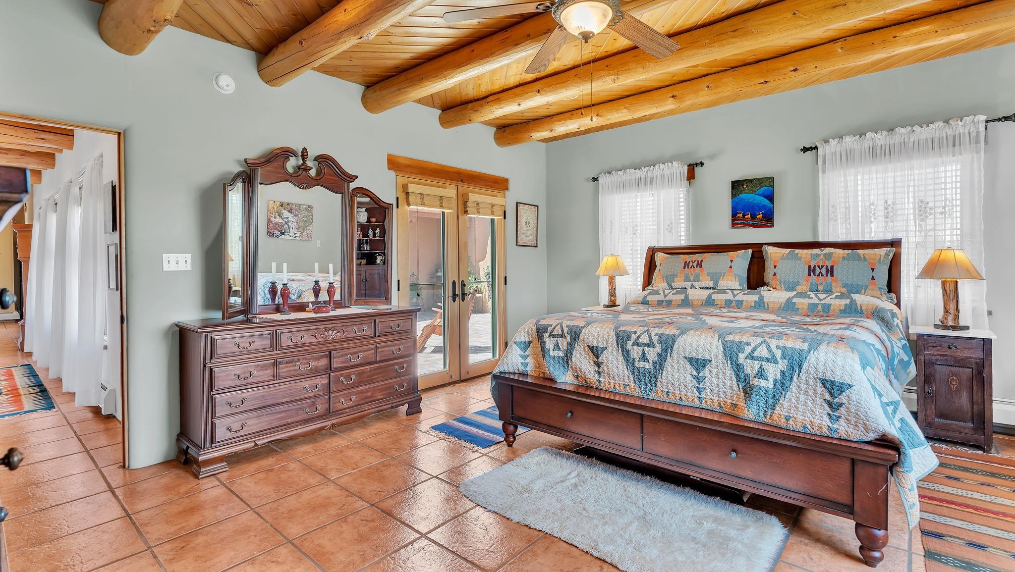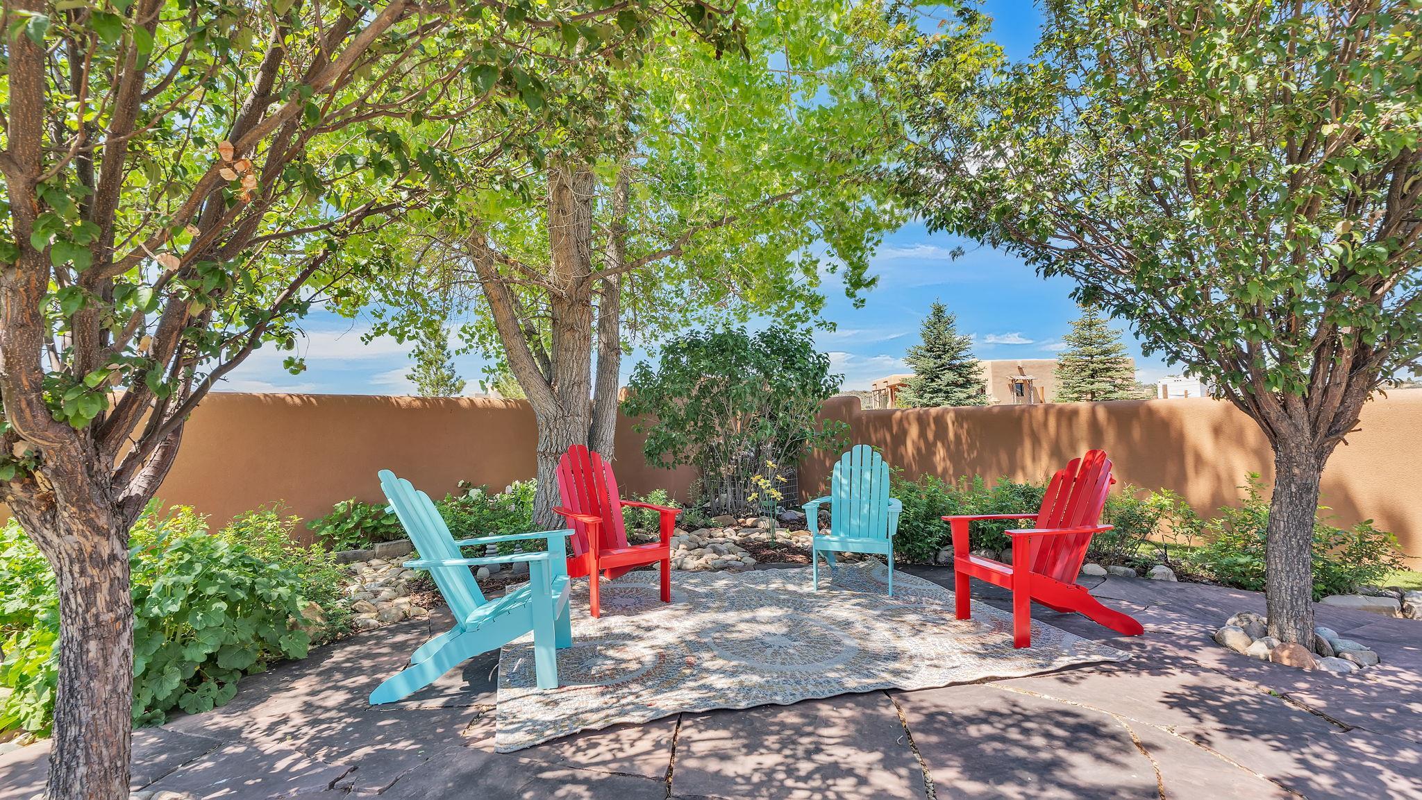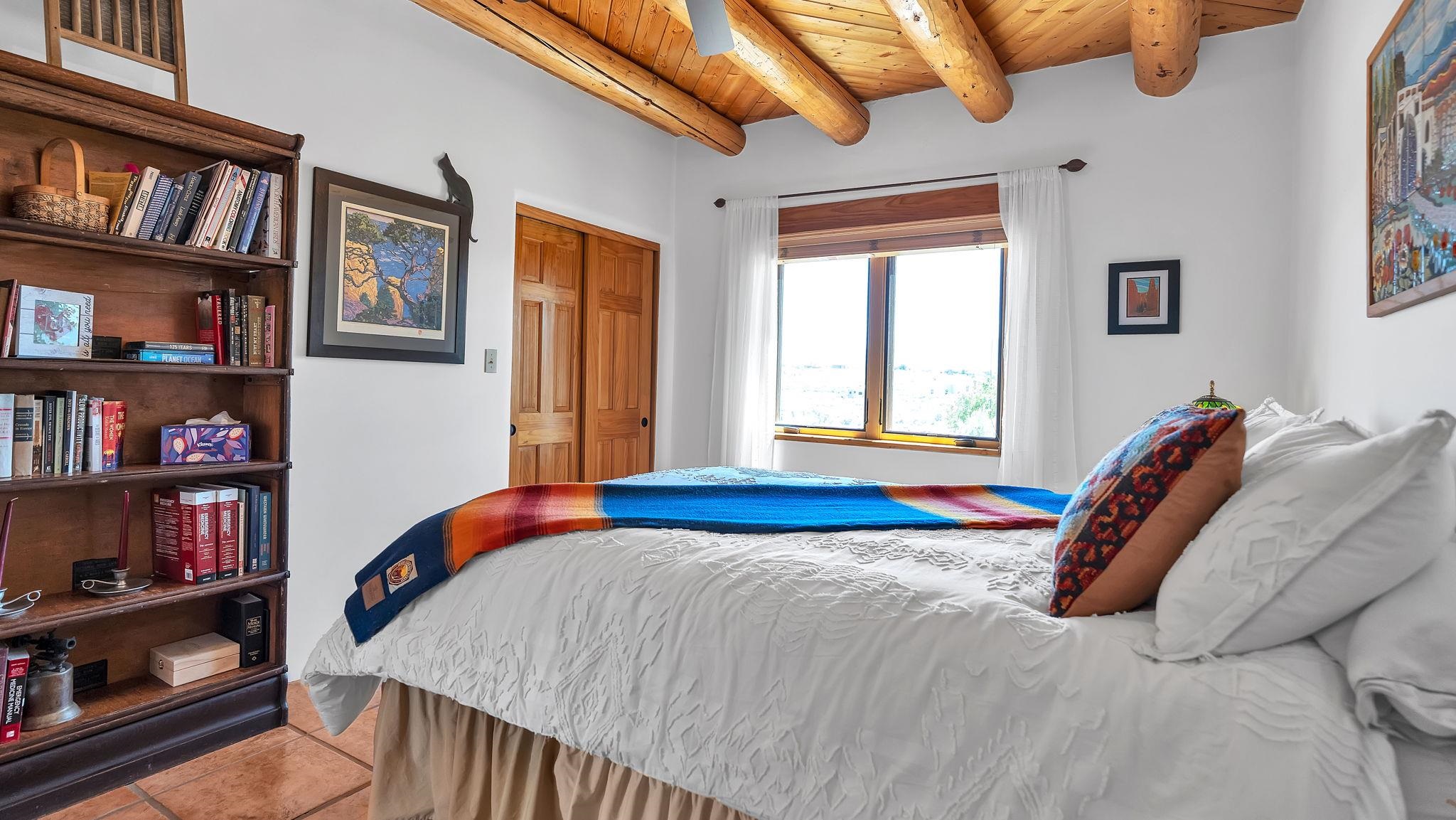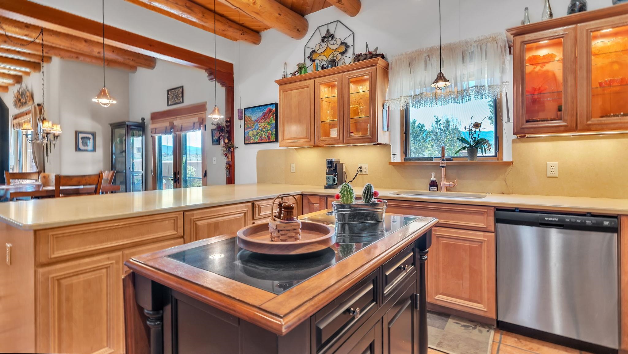 An Extraordinary High Desert Escape Bordering Taos Country Club ~ Turn onto a private and quiet Copper Moon Road, drive all the way to the very end, and feel the world melt away as you make your way into a hidden oaasis through the automatic gate. A charming front courtyard will embrace you and your guests with the crackling sounds of an outdoor traditional wood-burning fireplace and a serene fountain--the perfect prelude to the beauty within, and all around. Upon entering this masterfully crafted Southwestern style home where almost every window frames the majestic Sangre de Cristo Mountains, you immediately feel like you are exactly where you should be. This 1,988 square foot residence possesses a generous layout with three bedrooms, two and a half bathrooms, and an oversized two-car garage. The living room, dining room, and kitchen seamlessly merge to create an inviting open-space for connection and relaxation. The chef's kitchen is guaranteed to inspire culinary adventure on the daily with its stainless steel appliances, such as, a Miele Induction Stove, a double oven, and tons of thoughtful storage, including a turning pantry. Throughout the home, authentic Southwestern details captivate: vigas, tongue-and-groove ceilings, twisted beams, a second traditional fireplace, 17-inch tile throughout, and creative lighting fixtures--even within a striking lit display in the dining room. Soaring 12-foot ceilings in the common areas and 10-foot ceilings in the bedrooms amplify the sense of spaciousness. The freestanding Hearthstone wood burning fireplace in the living room is a major plus, and has the ability to keep the entire home warm by itself. Beyond the walls, this incredibly private home sits on 2 lush acres overlooking hole #3 at Taos Country Club. Immaculate landscaping thrives with drip irrigation, ensuring effortless beauty year-round, and especially so at this very Spring moment following abundant rainfall. Explore a labyrinth out back in the courtyard, kick back and relax on adirondack chairs during magical sunsets and sunrises, and cultivate your green thumb passions in the enclosed vegetable garden. The back courtyard is a true delight, boasting perennial flowers, a variety of deciduous and fruit trees, and a free-standing hot tub to relax in after a long day of working the yard, playing a round, or hitting the ski slopes. For all your projects and toys, a 20x30 foot electrified workshop and a 12x30 foot RV carport are ready to go at the corner of the property. This property is an easy outlet out of town to Santa Fe, an easy drive to town on the back-roads, and just down the road from hiking, fishing and mountain biking at the Slide Trailhead down CR-110. Properties with ALL of this are a rare find these days, and especially for this price. Come see for yourself!