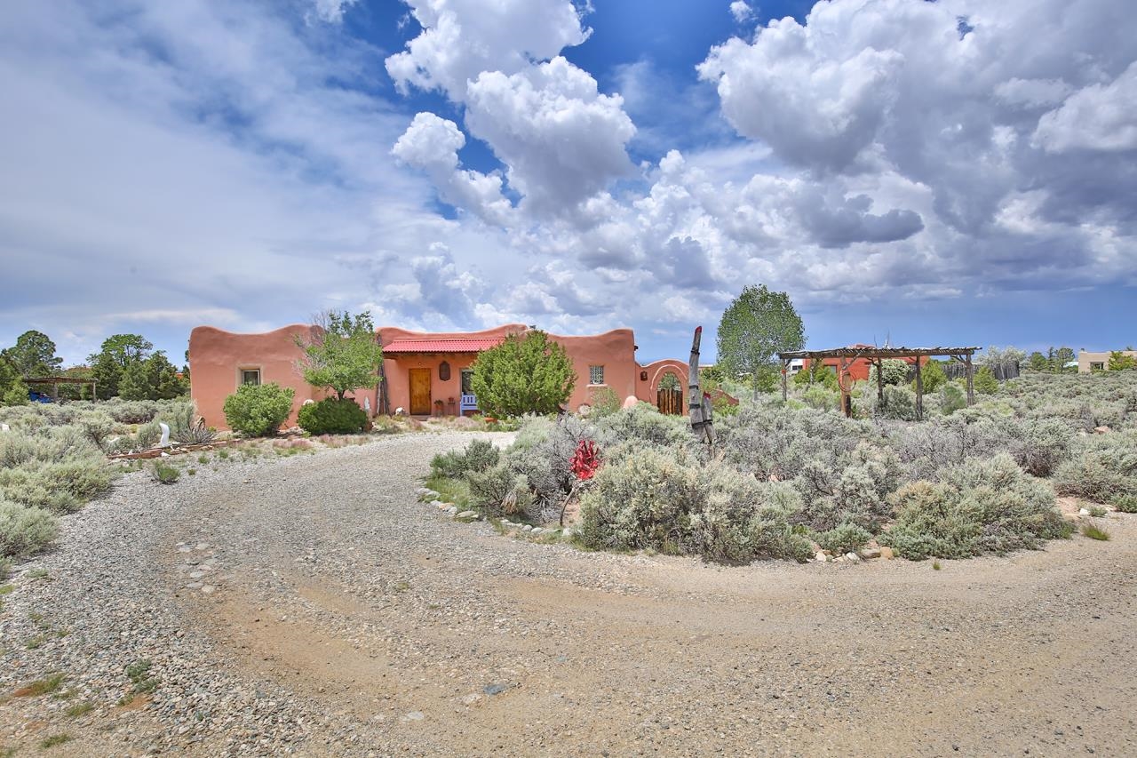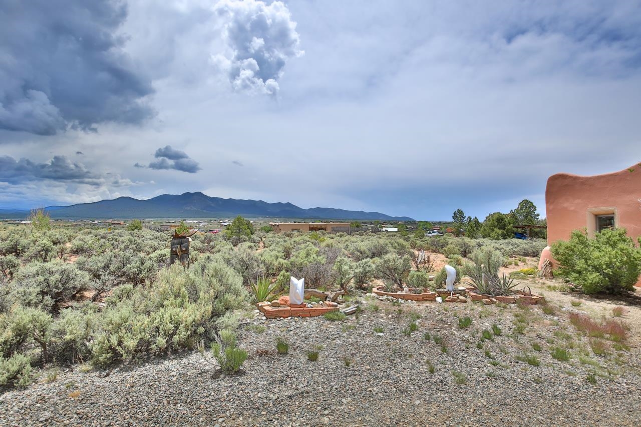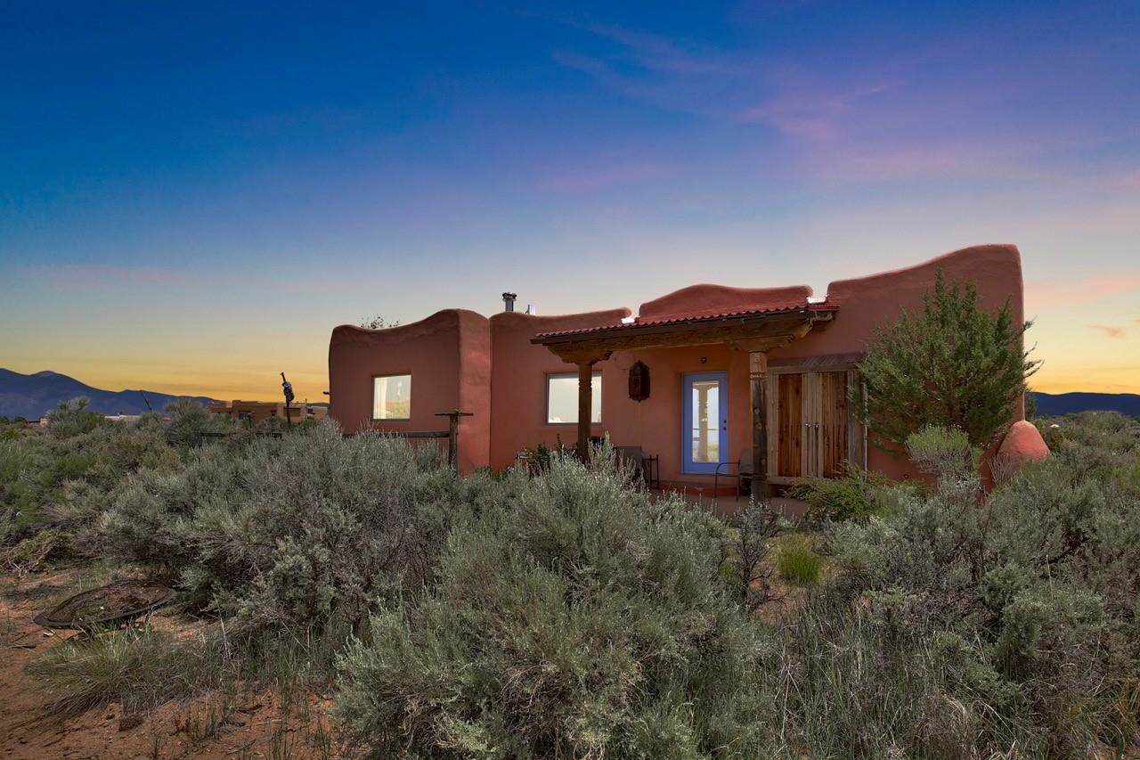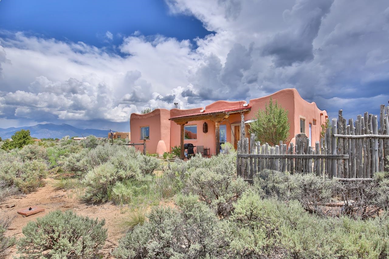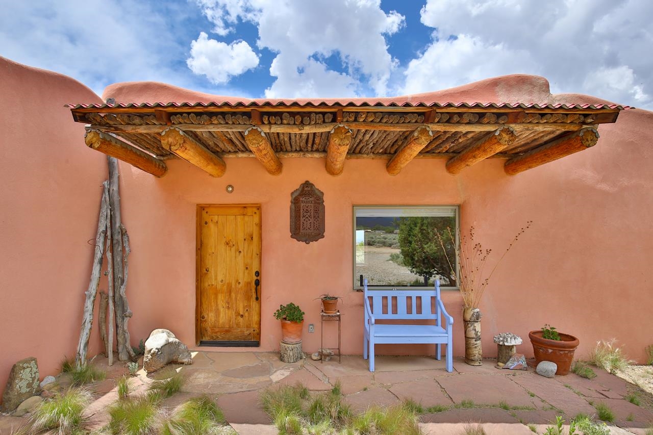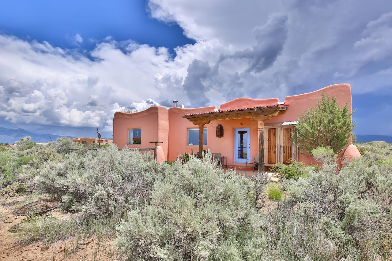 Authentic Adobe - Experience the charm and craftsmanship of true adobe construction in this thoughtfully designed 1,256 sq ft 2BR/2BA home on 1.145 acres in the desirable Vista Linda subdivision. Crafted with timeless Southwestern details, this home features coved viga ceilings, nichos, hand-painted accents, diamond finish plaster walls, and warm ceramic tile flooring throughout. The open-concept layout offers a spacious feel, enhanced by abundant natural light and a smart split-bedroom floor plan for added privacy. The talavera-tiled kitchen and bathrooms bring vibrant character and color, while modern comforts like in-floor radiant heating, an on-demand boiler, and a radon abatement system ensure year-round efficiency and peace of mind. A cozy woodstove adds warmth and ambiance during cooler months. Outdoors, soak in panoramic mountain views in every direction and enjoy breathtaking sunsets from your west-facing patio and portal--perfect for evening relaxation, dining outside, or entertaining under the expansive New Mexico sky. Mature landscaping with lilacs and aspens. Located near the end of a quiet dead-end road in nice subdivision with reasonable CC&R's and buried utilities. Detached 1-car carport and easy access to hiking, golf, and the vibrant Taos arts scene, this is traditional adobe living at its finest.