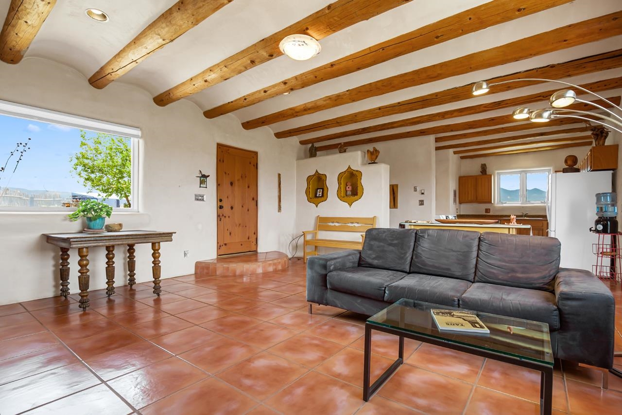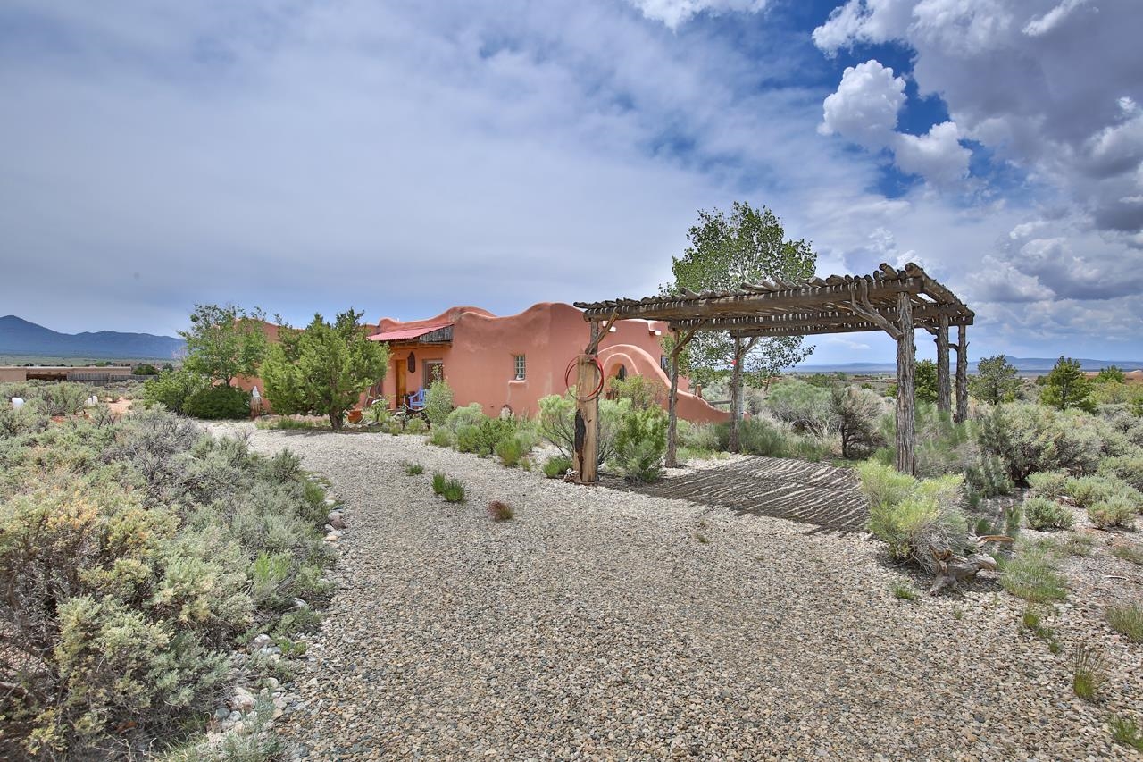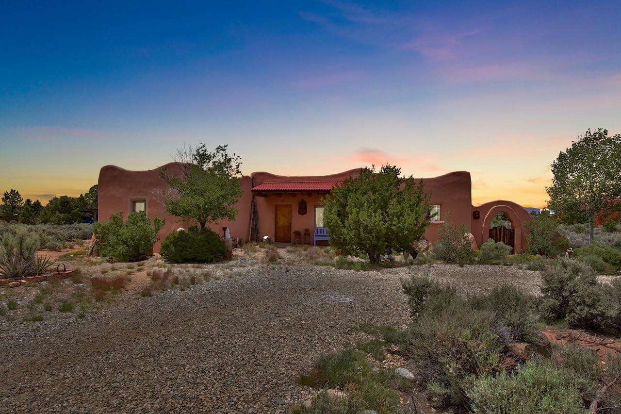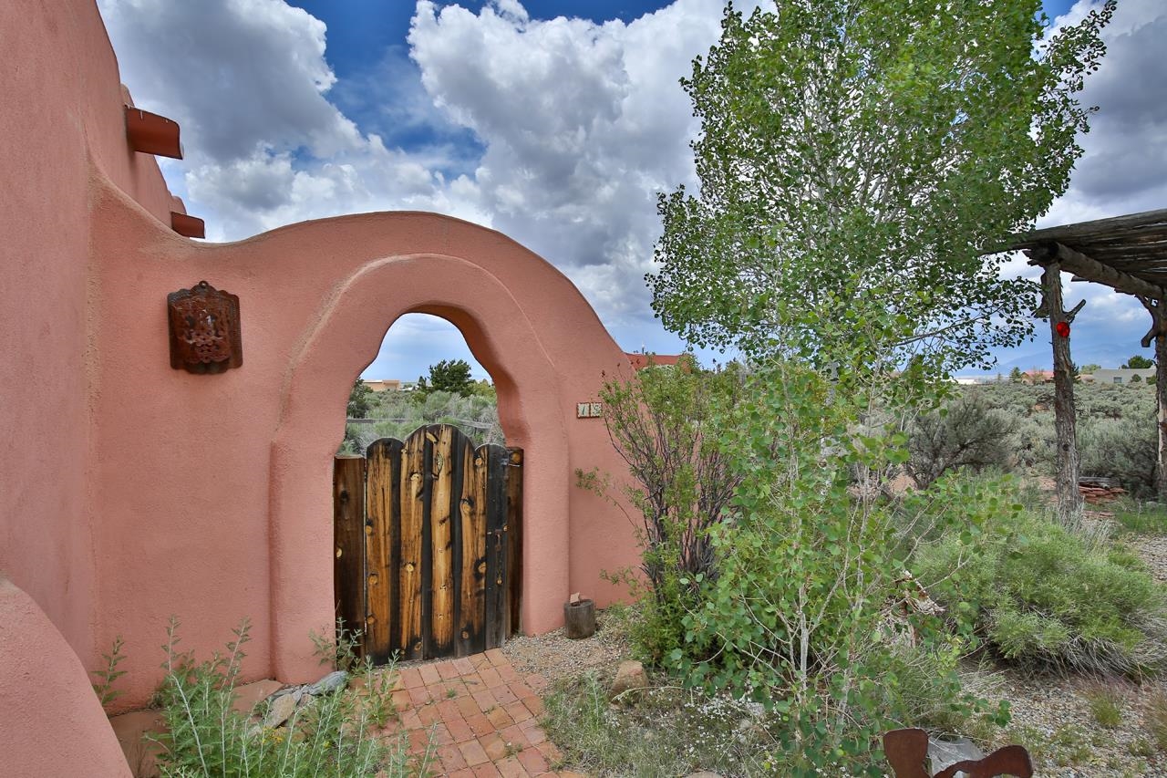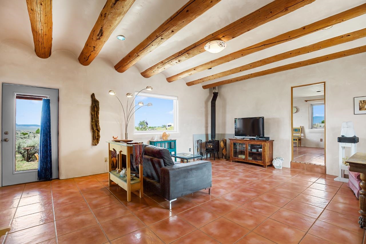 Authentic Adobe - Experience the charm and craftsmanship of true adobe construction in this thoughtfully designed 1,256 sq ft 2BR/2BA home on 1.145 acres in the desirable Vista Linda subdivision. Crafted with timeless Southwestern details, this home features coved viga ceilings, nichos, hand-painted accents, diamond finish plaster walls, and warm ceramic tile flooring throughout. The open-concept layout offers a spacious feel, enhanced by abundant natural light and a smart split-bedroom floor plan for added privacy. The talavera-tiled kitchen and bathrooms bring vibrant character and color, while modern comforts like in-floor radiant heating, an on-demand boiler, and a radon abatement system ensure year-round efficiency and peace of mind. A cozy woodstove adds warmth and ambiance during cooler months. Outdoors, soak in panoramic mountain views in every direction and enjoy breathtaking sunsets from your west-facing patio and portal--perfect for evening relaxation, dining outside, or entertaining under the expansive New Mexico sky. Mature landscaping with lilacs and aspens. Located near the end of a quiet dead-end road in nice subdivision with reasonable CC&R's and buried utilities. Detached 1-car carport and easy access to hiking, golf, and the vibrant Taos arts scene, this is traditional adobe living at its finest.