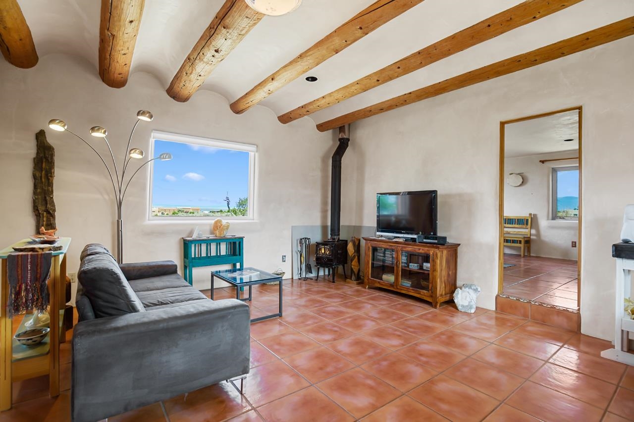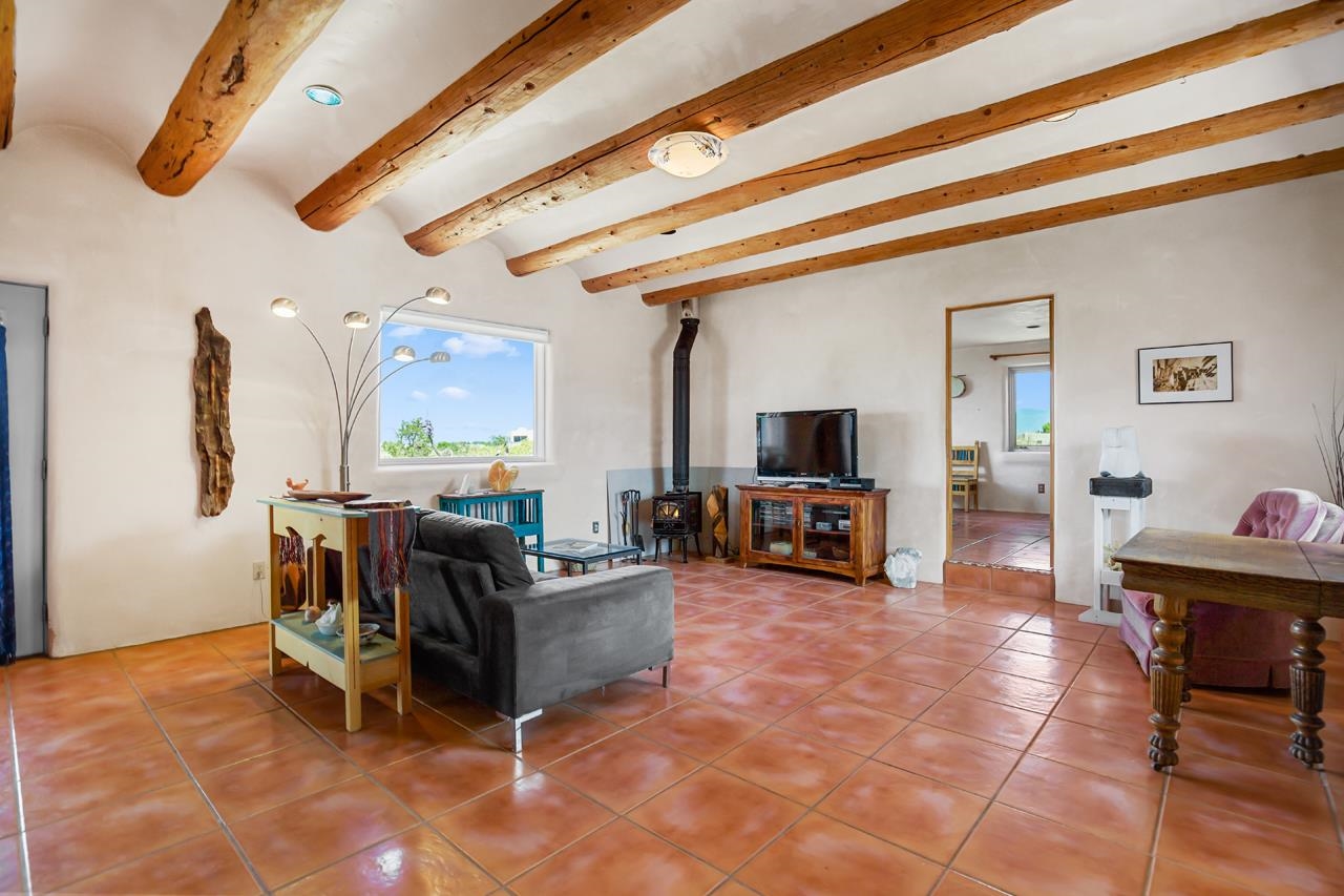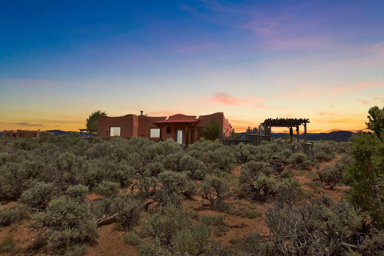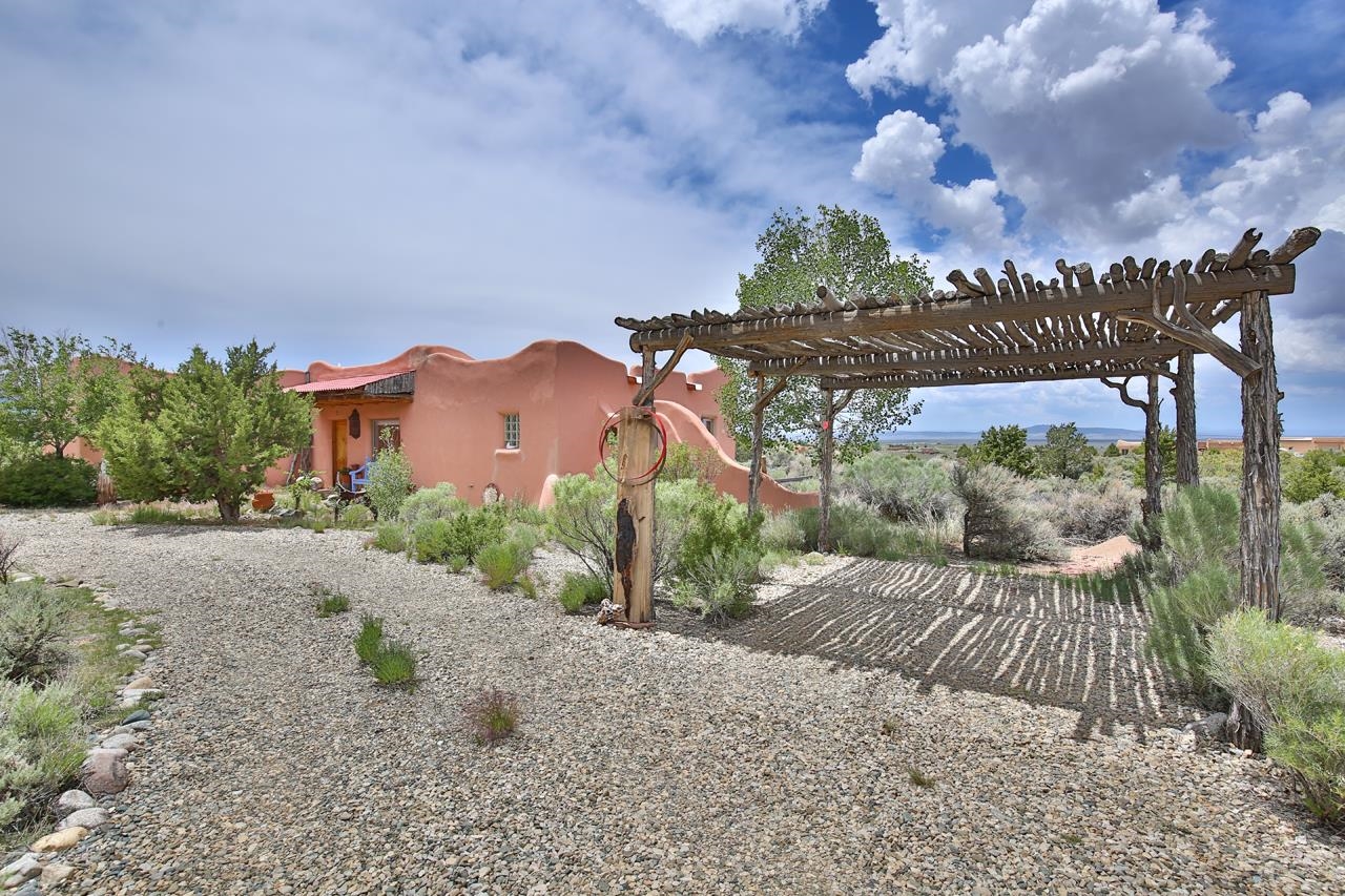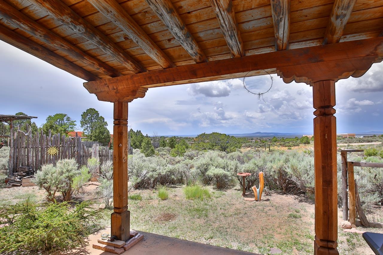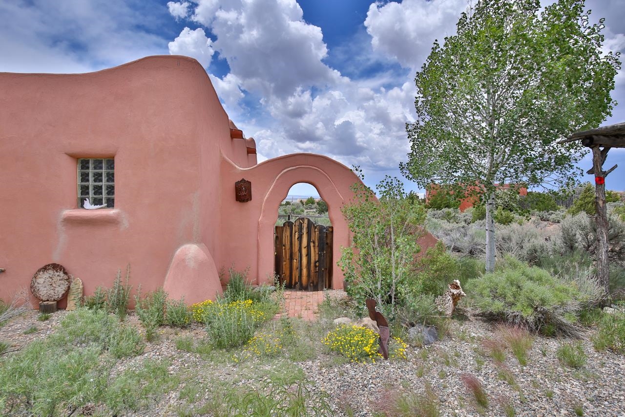Authentic Adobe - Experience the charm and craftsmanship of true adobe construction in this thoughtfully designed 1,256 sq ft 2BR/2BA home on 1.145 acres in the desirable Vista Linda subdivision. Crafted with timeless Southwestern details, this home features coved viga ceilings, nichos, hand-painted accents, diamond finish plaster walls, and warm ceramic tile flooring throughout. The open-concept layout offers a spacious feel, enhanced by abundant natural light and a smart split-bedroom floor plan for added privacy. The talavera-tiled kitchen and bathrooms bring vibrant character and color, while modern comforts like in-floor radiant heating, an on-demand boiler, and a radon abatement system ensure year-round efficiency and peace of mind. A cozy woodstove adds warmth and ambiance during cooler months. Outdoors, soak in panoramic mountain views in every direction and enjoy breathtaking sunsets from your west-facing patio and portal--perfect for evening relaxation, dining outside, or entertaining under the expansive New Mexico sky. Mature landscaping with lilacs and aspens. Located near the end of a quiet dead-end road in nice subdivision with reasonable CC&R's and buried utilities. Detached 1-car carport and easy access to hiking, golf, and the vibrant Taos arts scene, this is traditional adobe living at its finest.